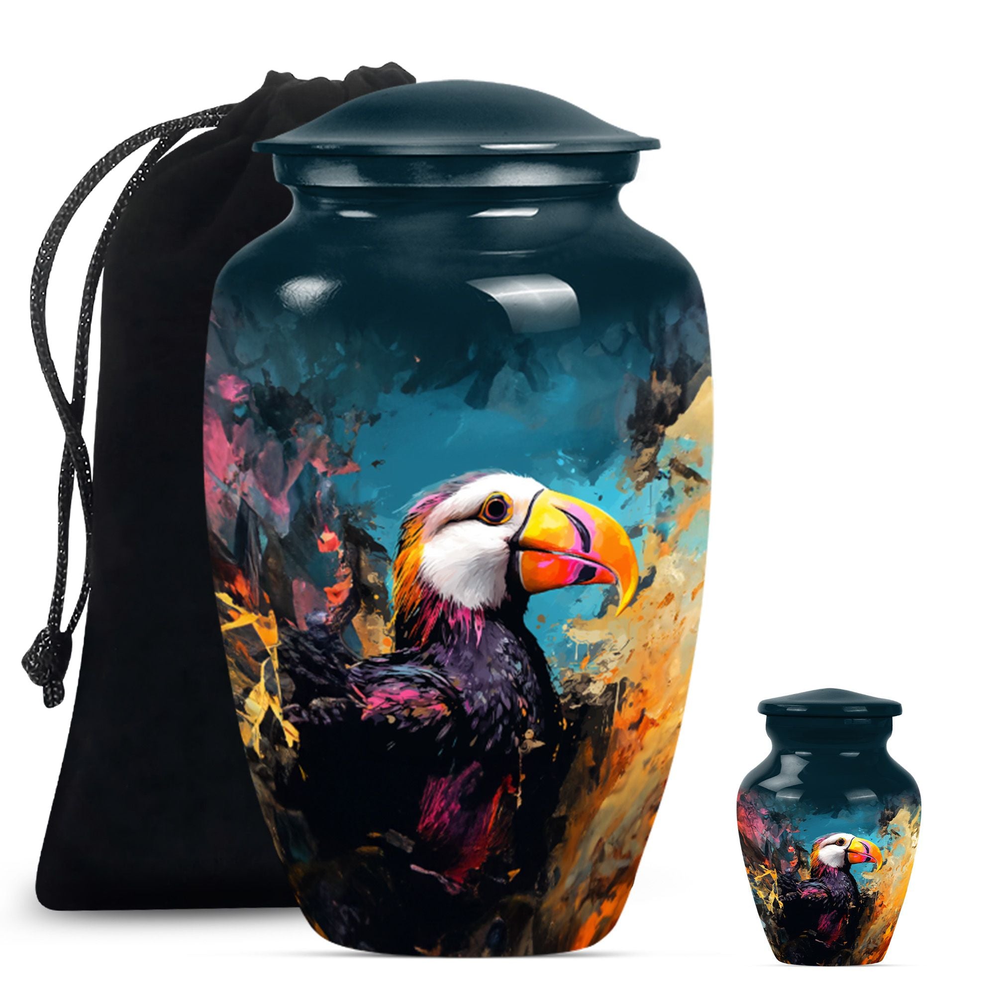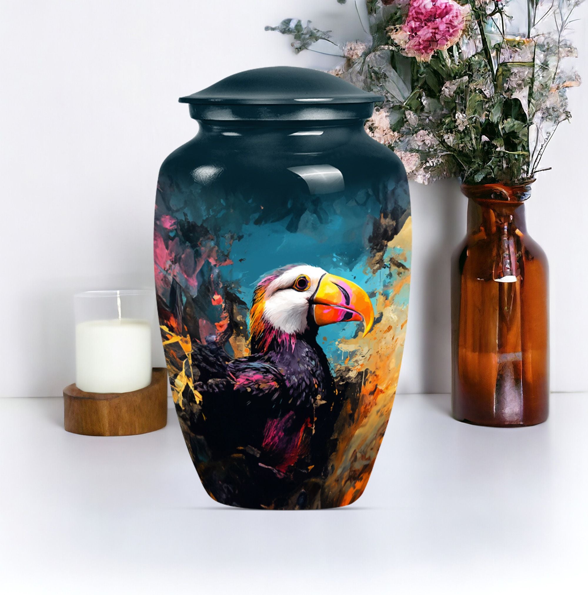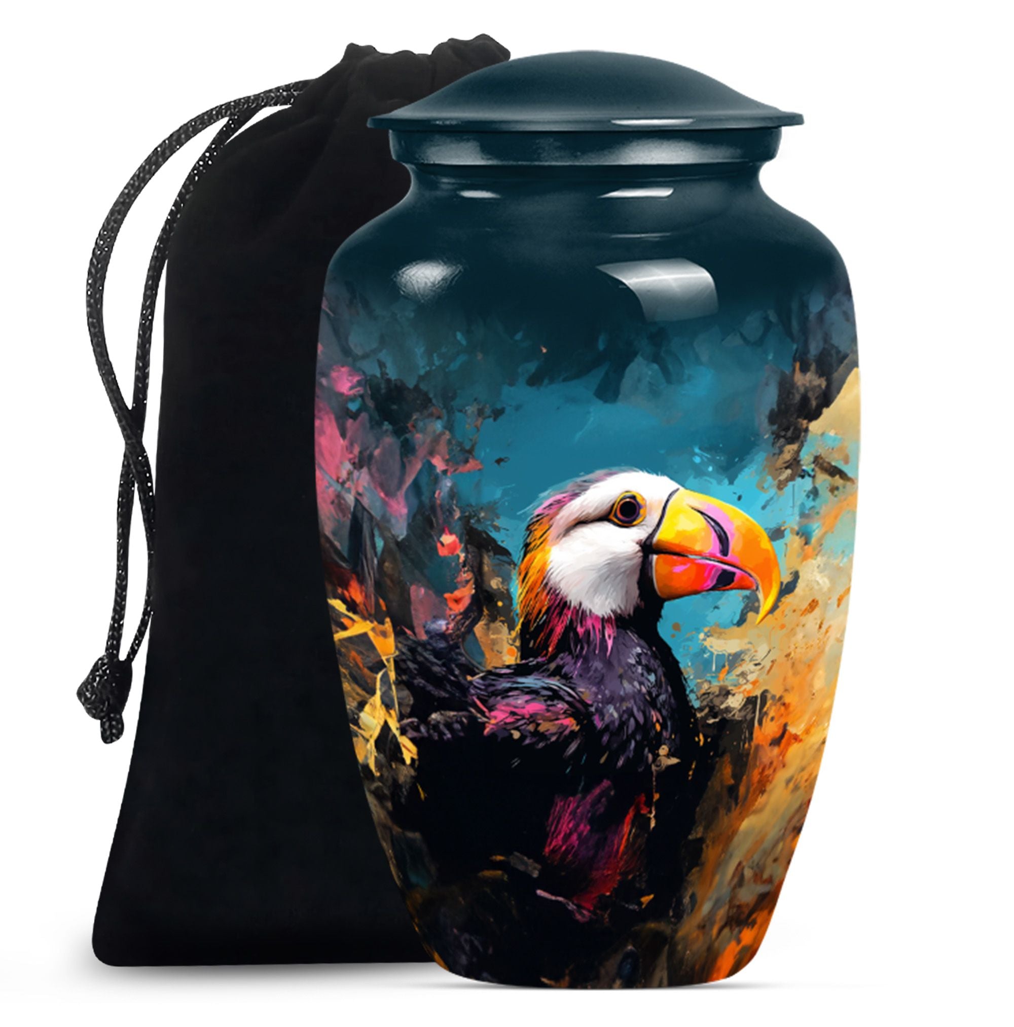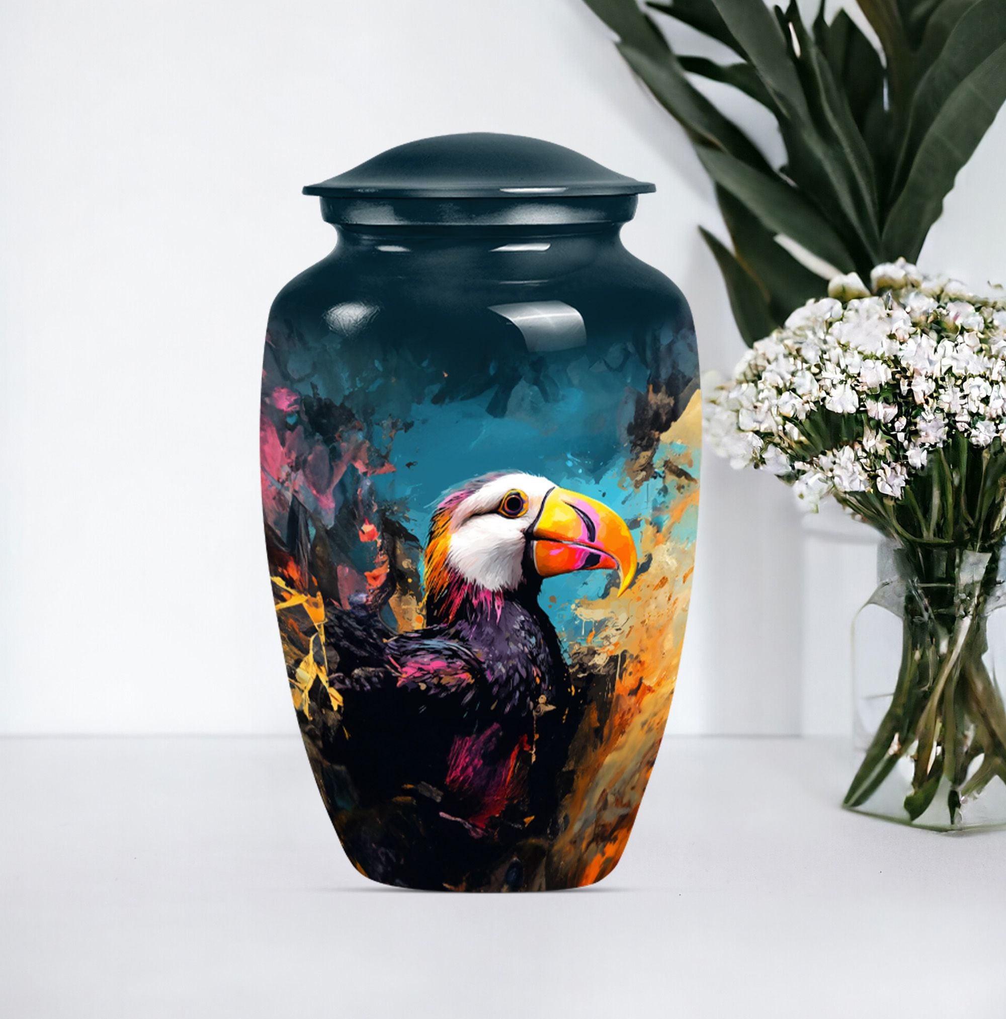 Find solace and comfort with our Puffin Bird Cremation Large Urn, an abstract yet dignified approach to memorial ceremony supplies. This 10-inch cremation urn seamlessly combines function and form, providing a peaceful resting place for your loved ones. Constructed from top-quality aluminium, this large urn is both robust and lightweight, weighing around 3.3 pounds. It can serve as a timeless keepsake with its capacity to contain up to 200 cubic inches of ashes. Our Puffin Bird Urn comes along with a plush velvet pouch, offering a secure containment for the ashes. The standout feature enables you to personalize this urn with engraved names, ensuring that the essence of your loved ones carries on. This cremation urn elevates its utilitarian purpose with aesthetic elegance, making it an ideal choice for burial ashes urn or funeral ceremonies. Carrying an inspiring theme of abstract art, our Puffin Bird urn adds a gentle touch to your grieving process while honoring your beloved. Savor this tribute to everlasting bonds. Note: This urn is not merely a ceremonial object but a sentimental touchpoint that connects you with your precious memories.