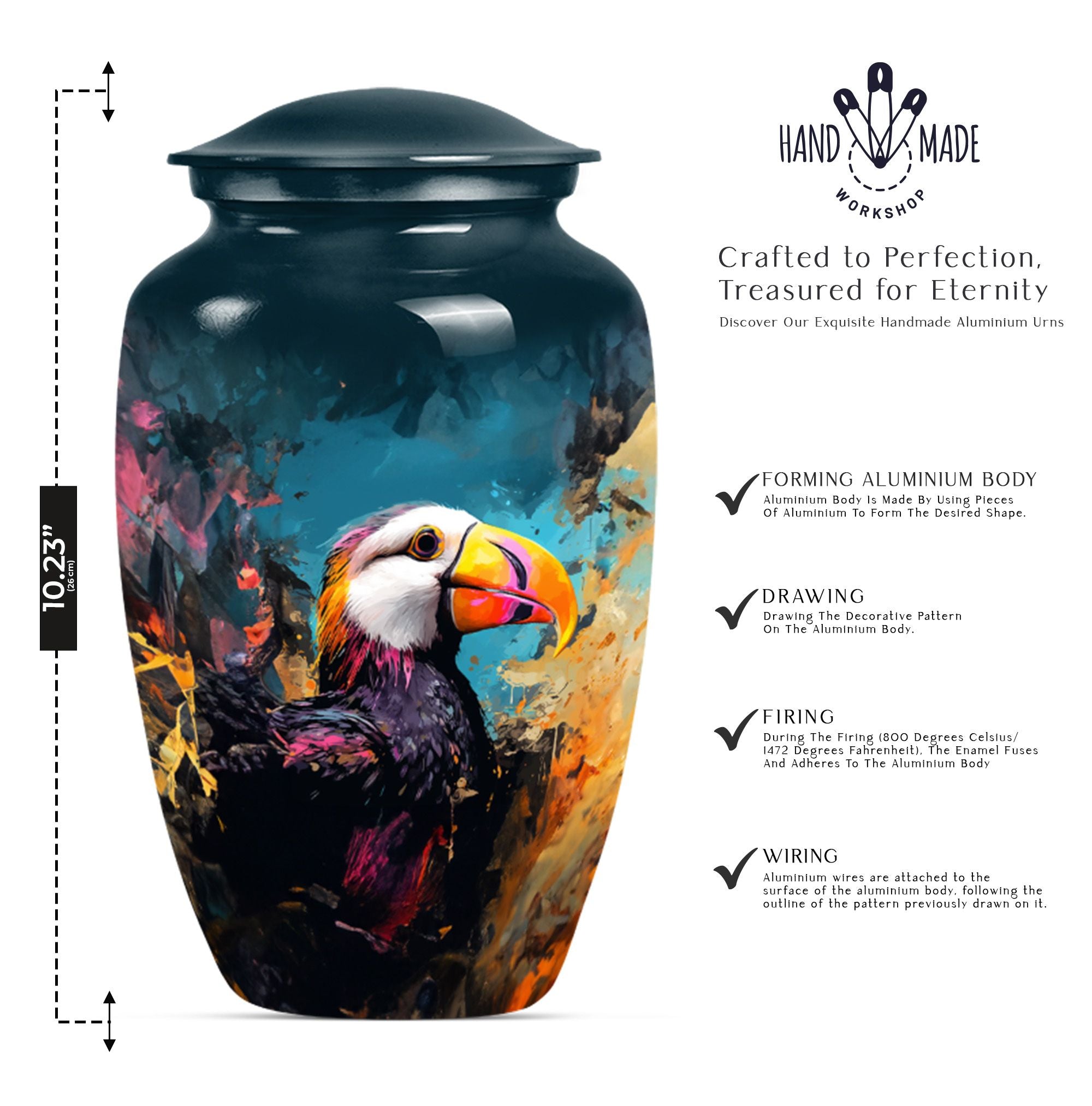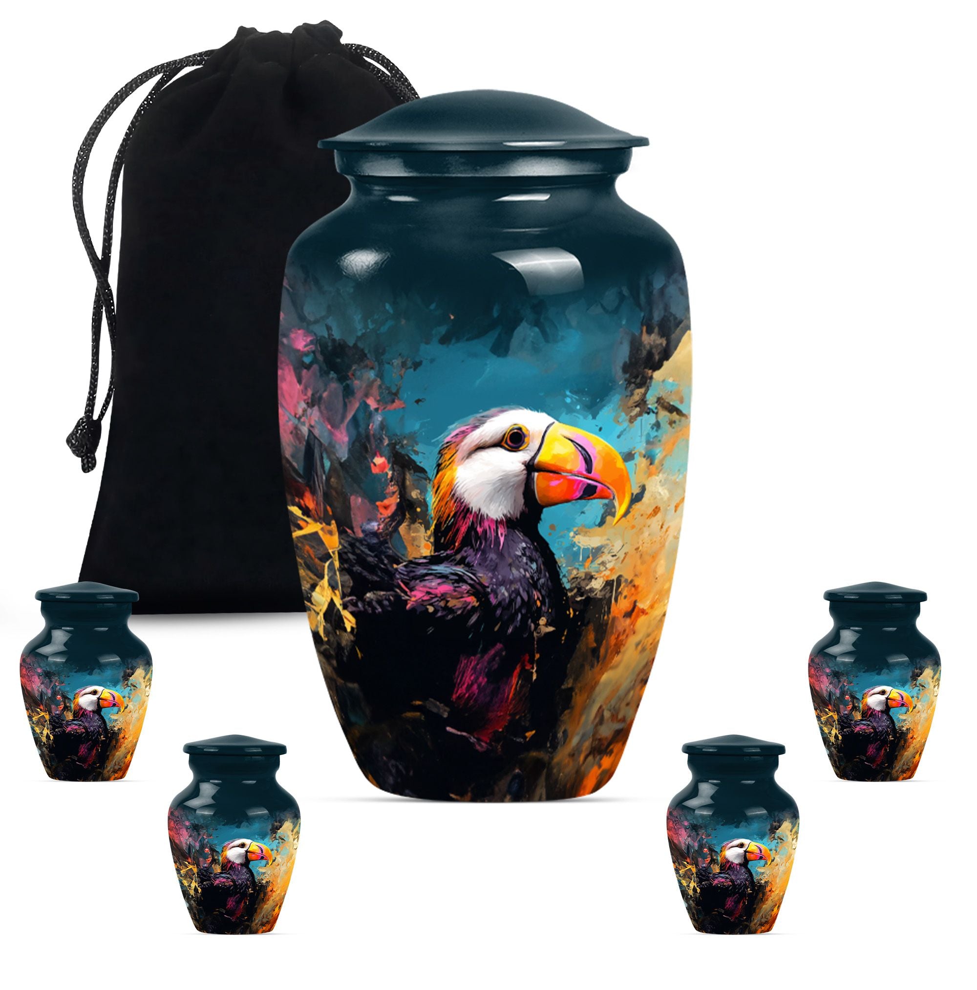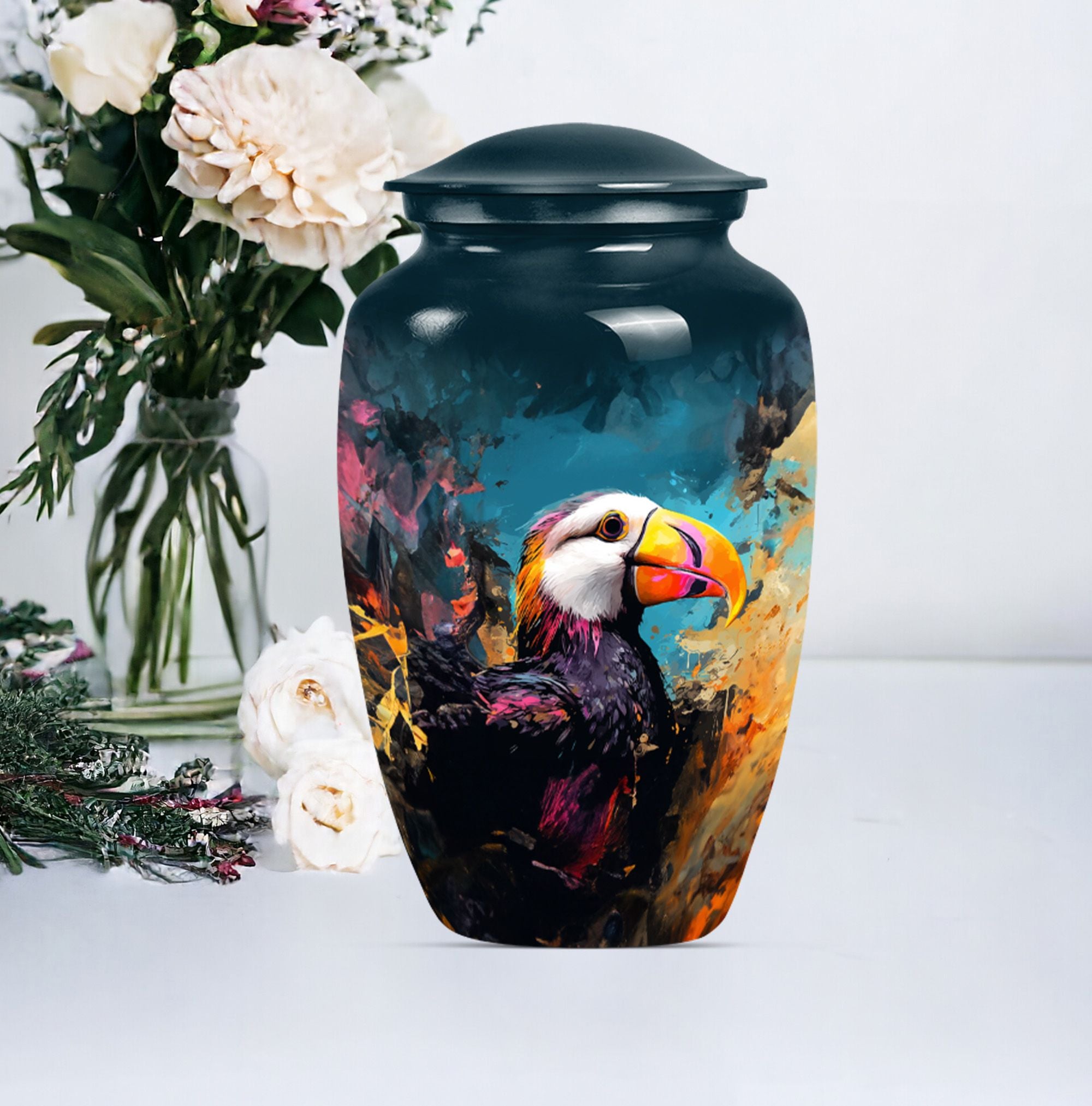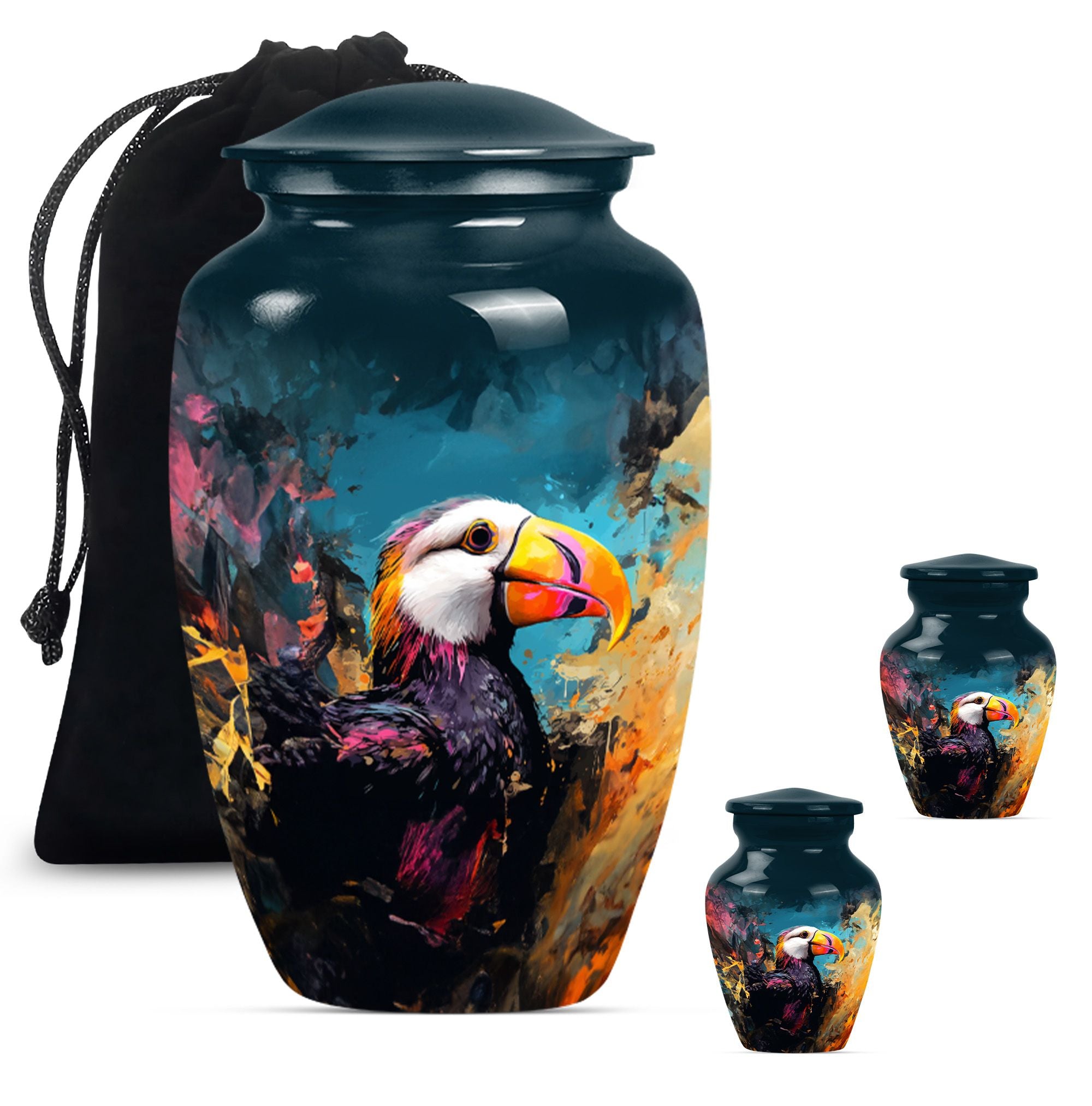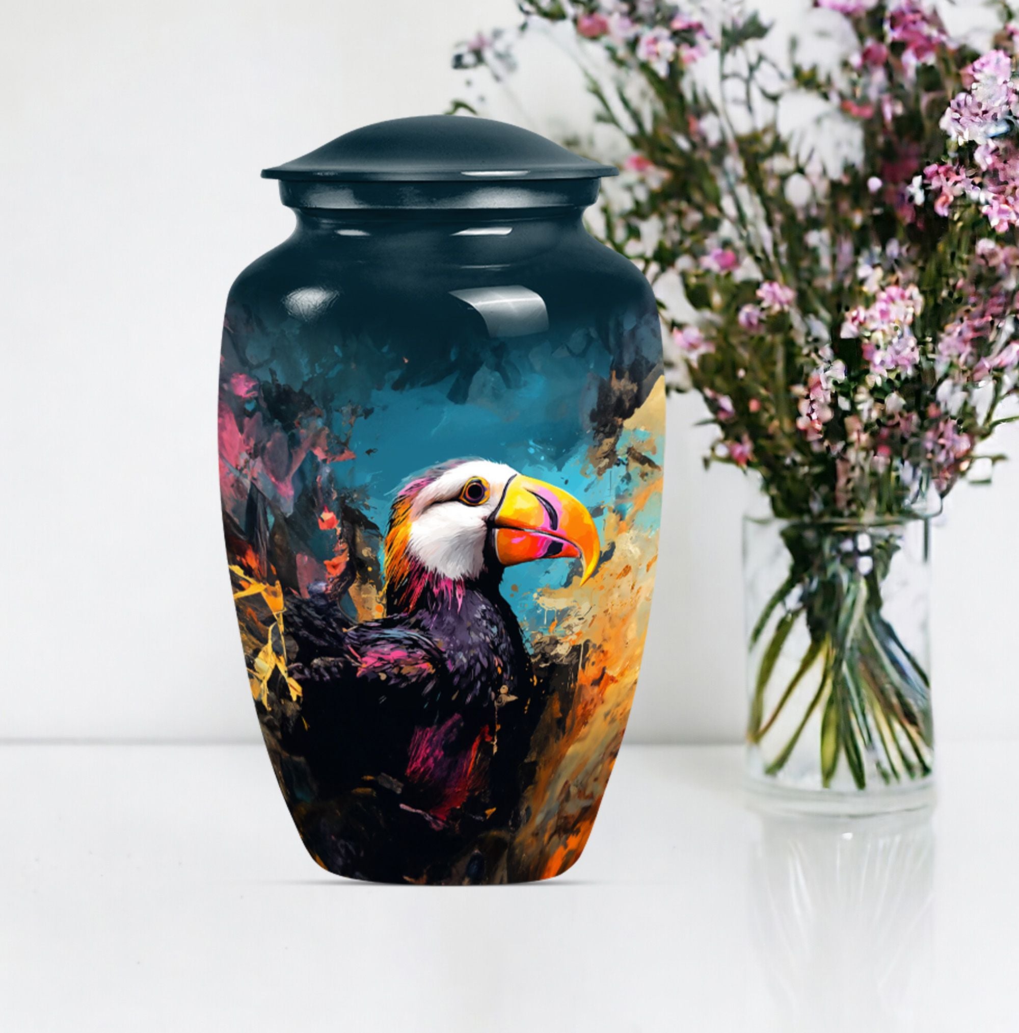 Find solace and comfort with our Puffin Bird Cremation Large Urn, an abstract yet dignified approach to memorial ceremony supplies. This 10-inch cremation urn seamlessly combines function and form, providing a peaceful resting place for your loved ones. Constructed from top-quality aluminium, this large urn is both robust and lightweight, weighing around 3.3 pounds. It can serve as a timeless keepsake with its capacity to contain up to 200 cubic inches of ashes. Our Puffin Bird Urn comes along with a plush velvet pouch, offering a secure containment for the ashes. The standout feature enables you to personalize this urn with engraved names, ensuring that the essence of your loved ones carries on. This cremation urn elevates its utilitarian purpose with aesthetic elegance, making it an ideal choice for burial ashes urn or funeral ceremonies. Carrying an inspiring theme of abstract art, our Puffin Bird urn adds a gentle touch to your grieving process while honoring your beloved. Savor this tribute to everlasting bonds. Note: This urn is not merely a ceremonial object but a sentimental touchpoint that connects you with your precious memories.