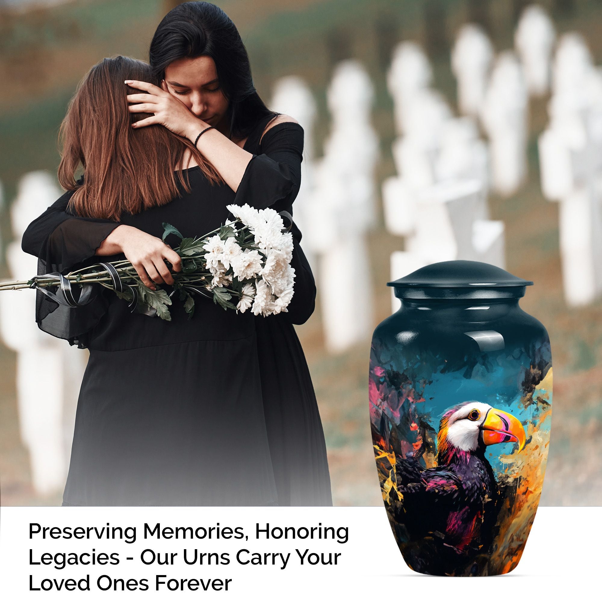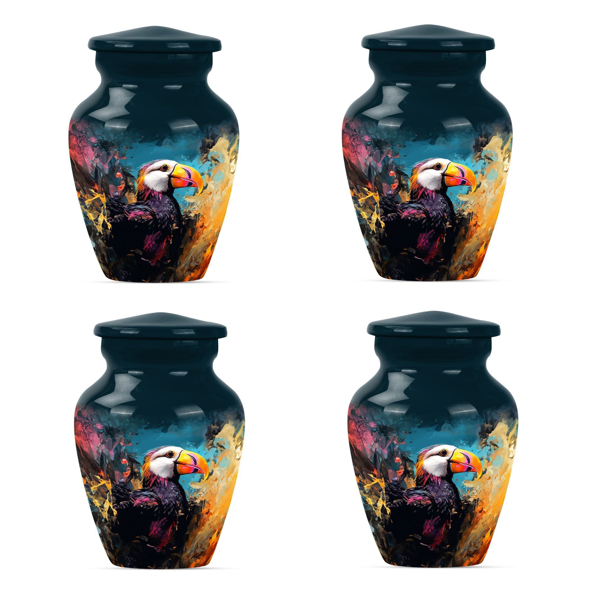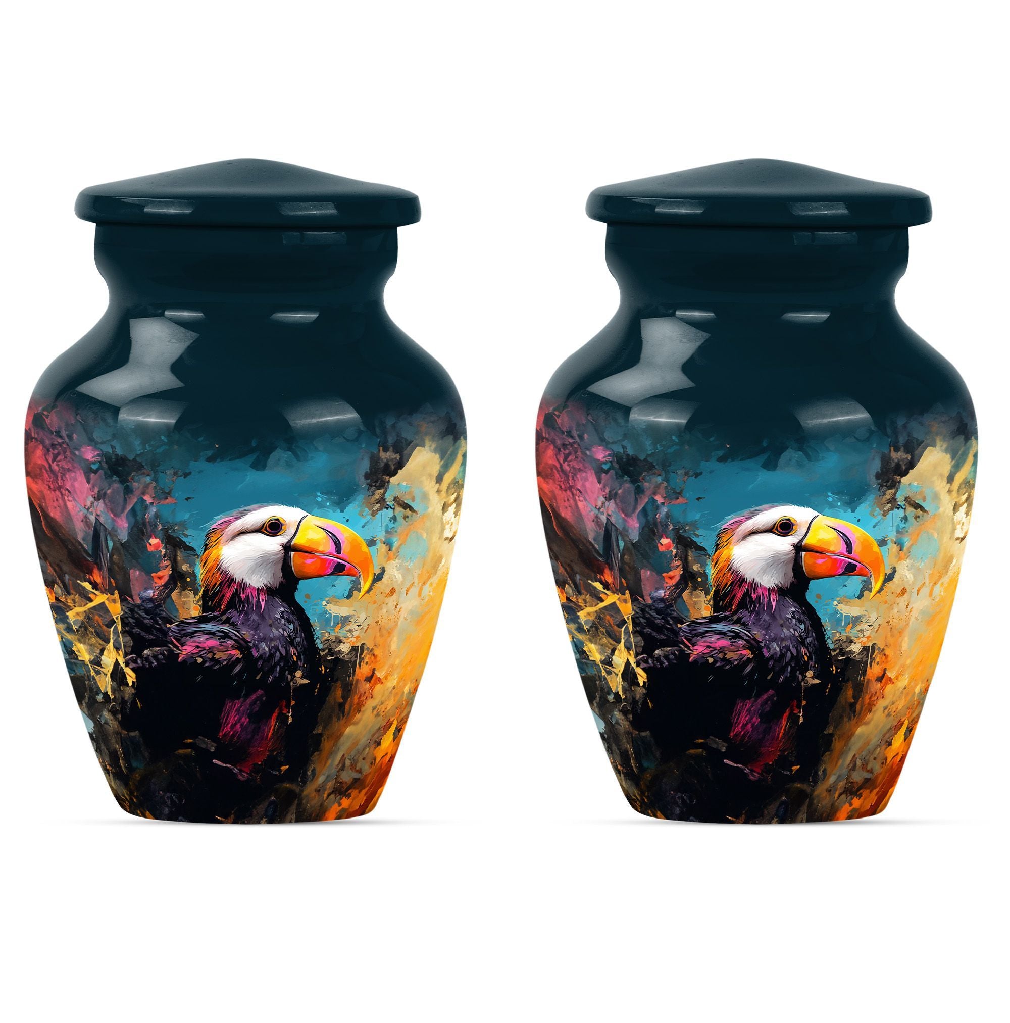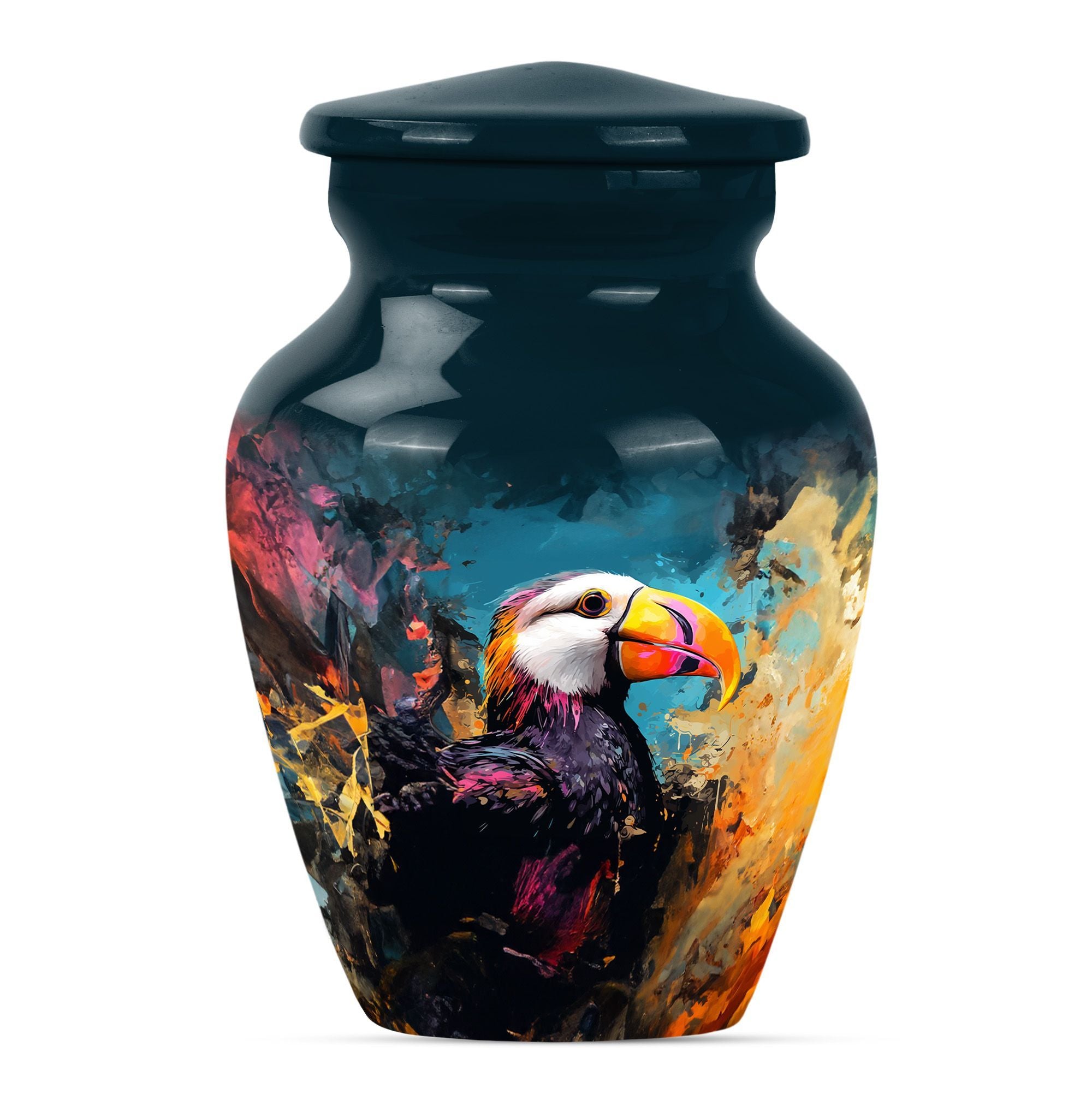 Find solace and comfort with our Puffin Bird Cremation Large Urn, an abstract yet dignified approach to memorial ceremony supplies. This 10-inch cremation urn seamlessly combines function and form, providing a peaceful resting place for your loved ones. Constructed from top-quality aluminium, this large urn is both robust and lightweight, weighing around 3.3 pounds. It can serve as a timeless keepsake with its capacity to contain up to 200 cubic inches of ashes. Our Puffin Bird Urn comes along with a plush velvet pouch, offering a secure containment for the ashes. The standout feature enables you to personalize this urn with engraved names, ensuring that the essence of your loved ones carries on. This cremation urn elevates its utilitarian purpose with aesthetic elegance, making it an ideal choice for burial ashes urn or funeral ceremonies. Carrying an inspiring theme of abstract art, our Puffin Bird urn adds a gentle touch to your grieving process while honoring your beloved. Savor this tribute to everlasting bonds. Note: This urn is not merely a ceremonial object but a sentimental touchpoint that connects you with your precious memories.