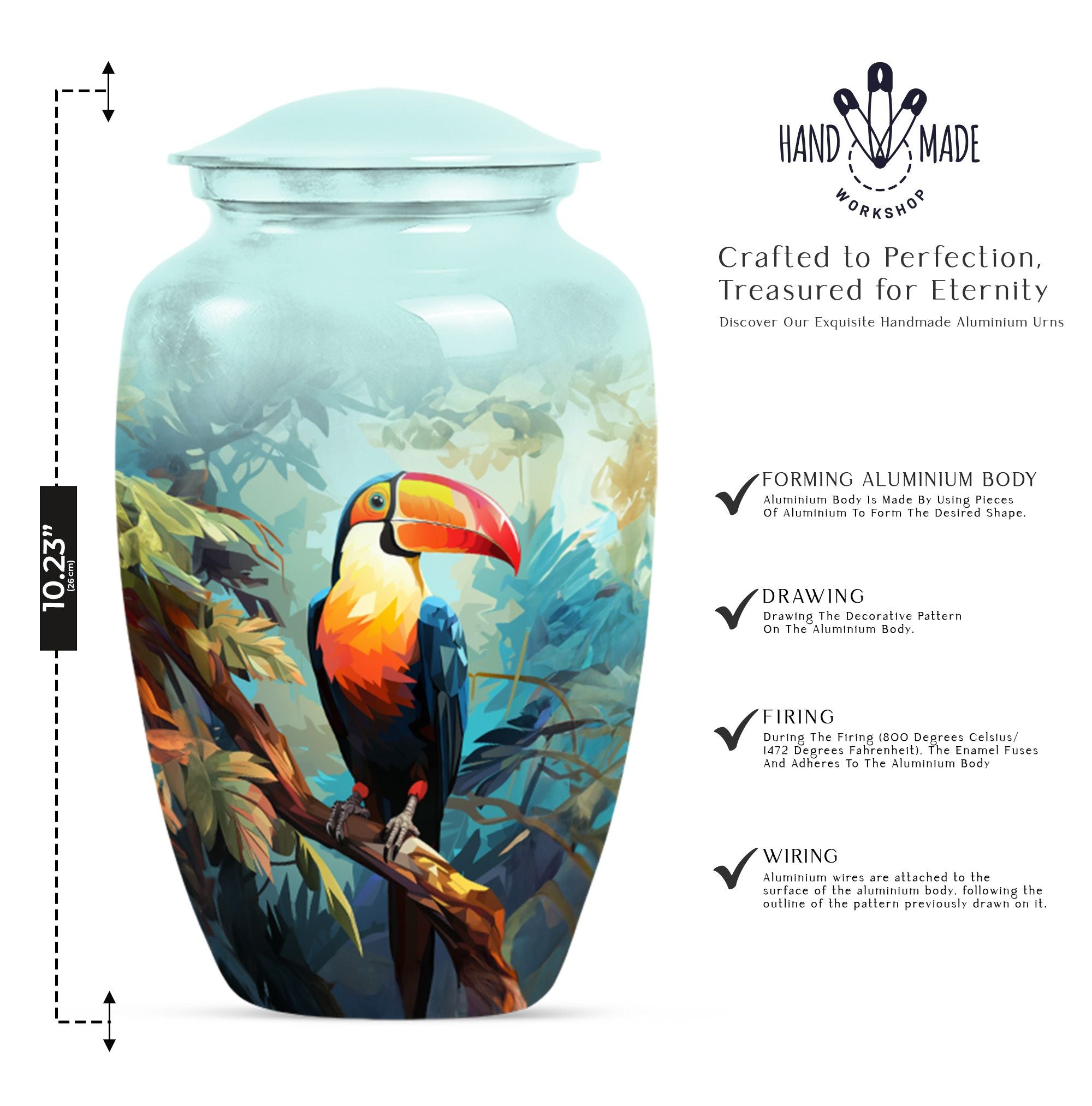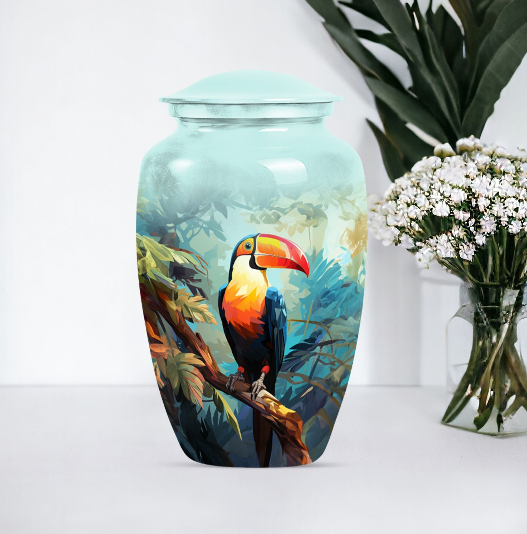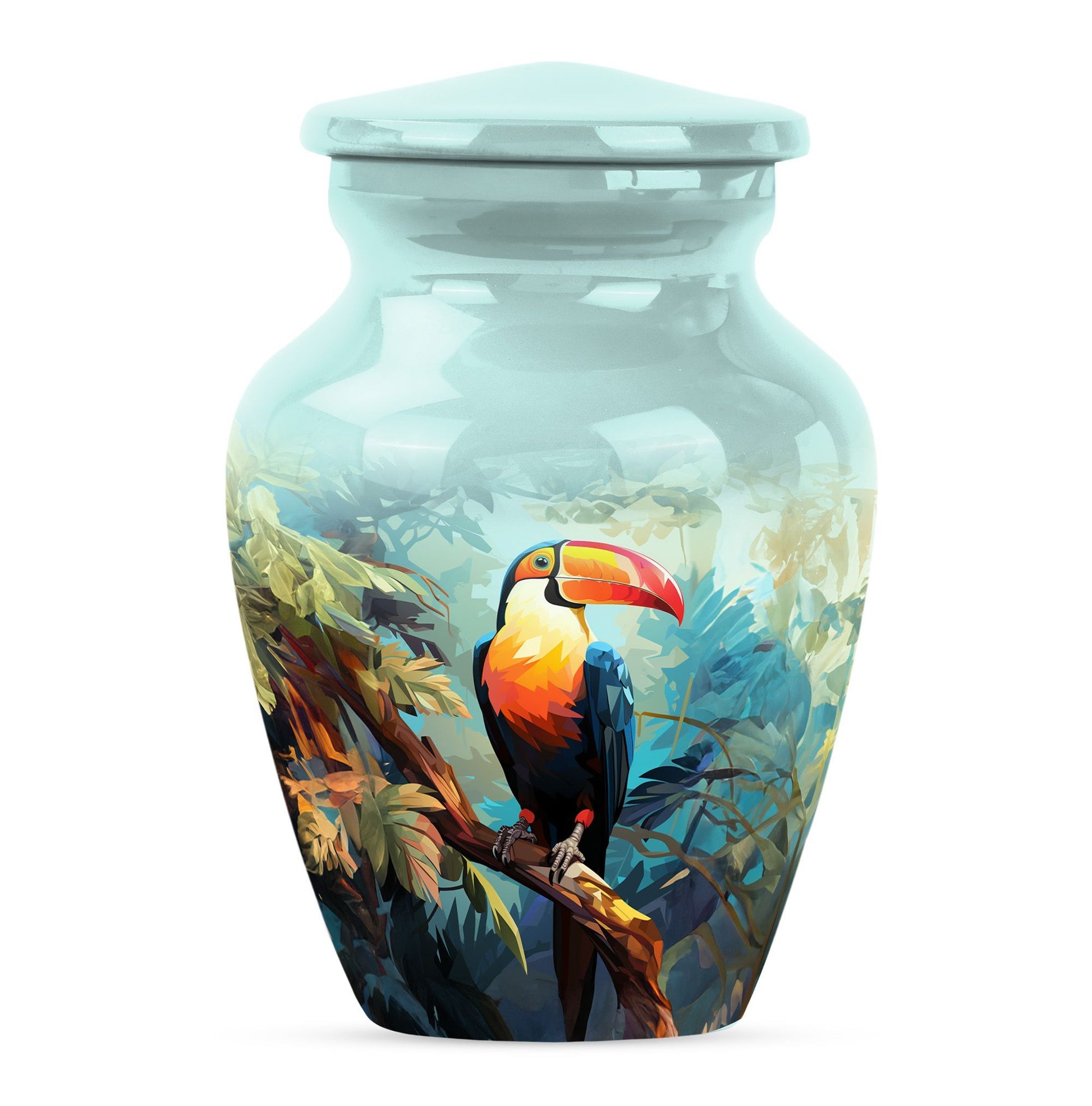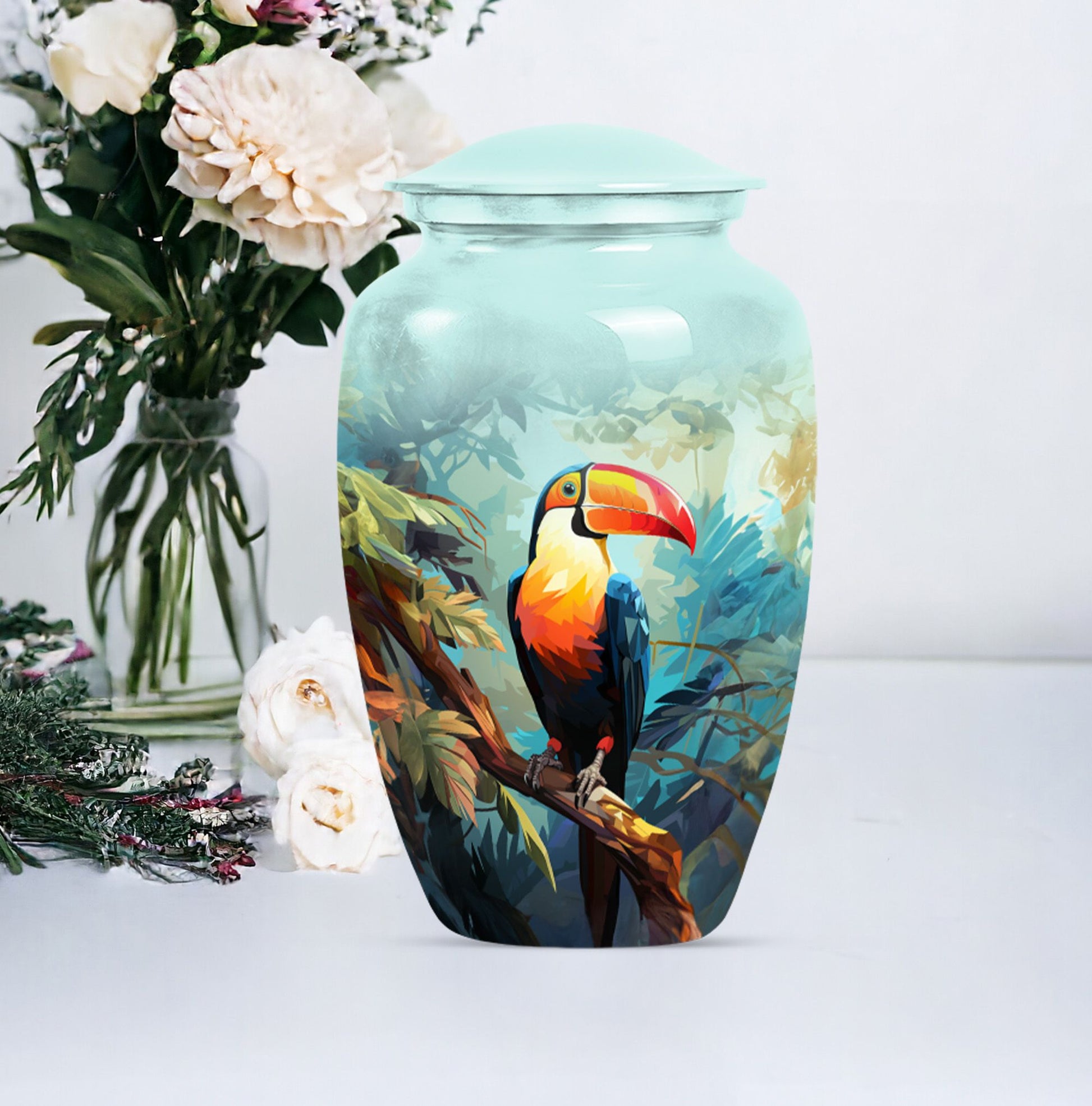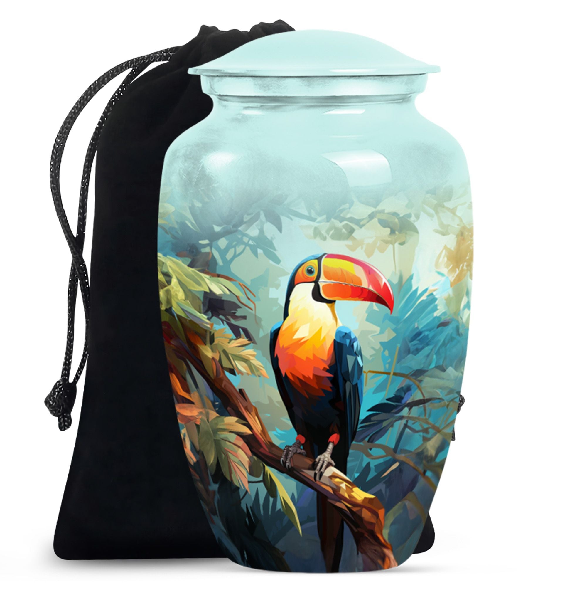 Honor your loved one's memory with the 'Puffin Bird Urn', a unique memorial adult urn fashioned from enduring aluminium. This funeral urn for mom, standing 10 inch tall, showcases a classic urn style, bathed in an abstract theme that echoes both elegance and resonance. With a capacity of 200 cubic inches, this cremation urn comfortably holds the ashes securely, with 3.3 pounds in weight, signifying its sturdy construction. Adding a touch of personal meaning, the urn allows for the engraving of names, creating a lasting homage for your loved one. Included with the large urn is a soft velvet pouch, designed for safe containment of ashes. From 'human urn ash adult' to 'custom cremation urns', its unique terminology reflects its distinct specialty. For those searching in the 'Memorial Ceremony Supplies' category, the 'Puffin Bird Urn' represents an enduring symbol of remembrance.