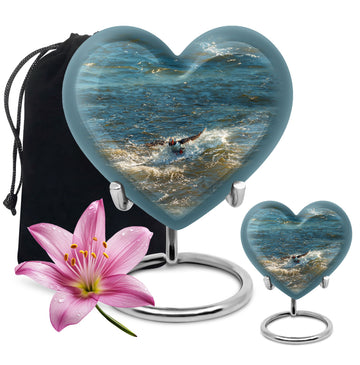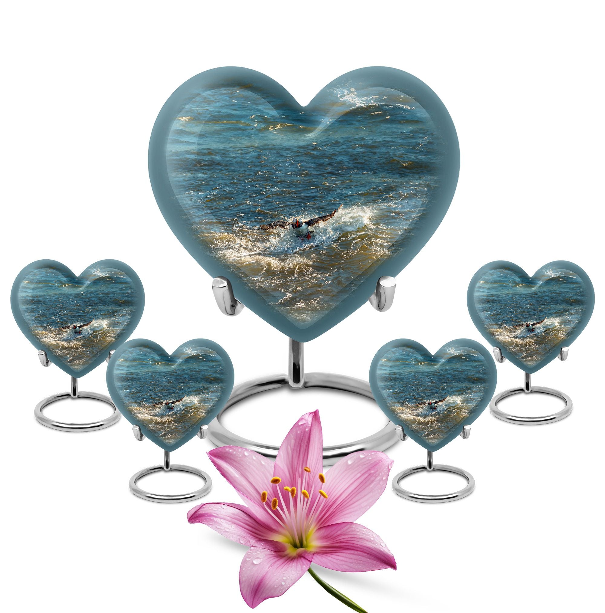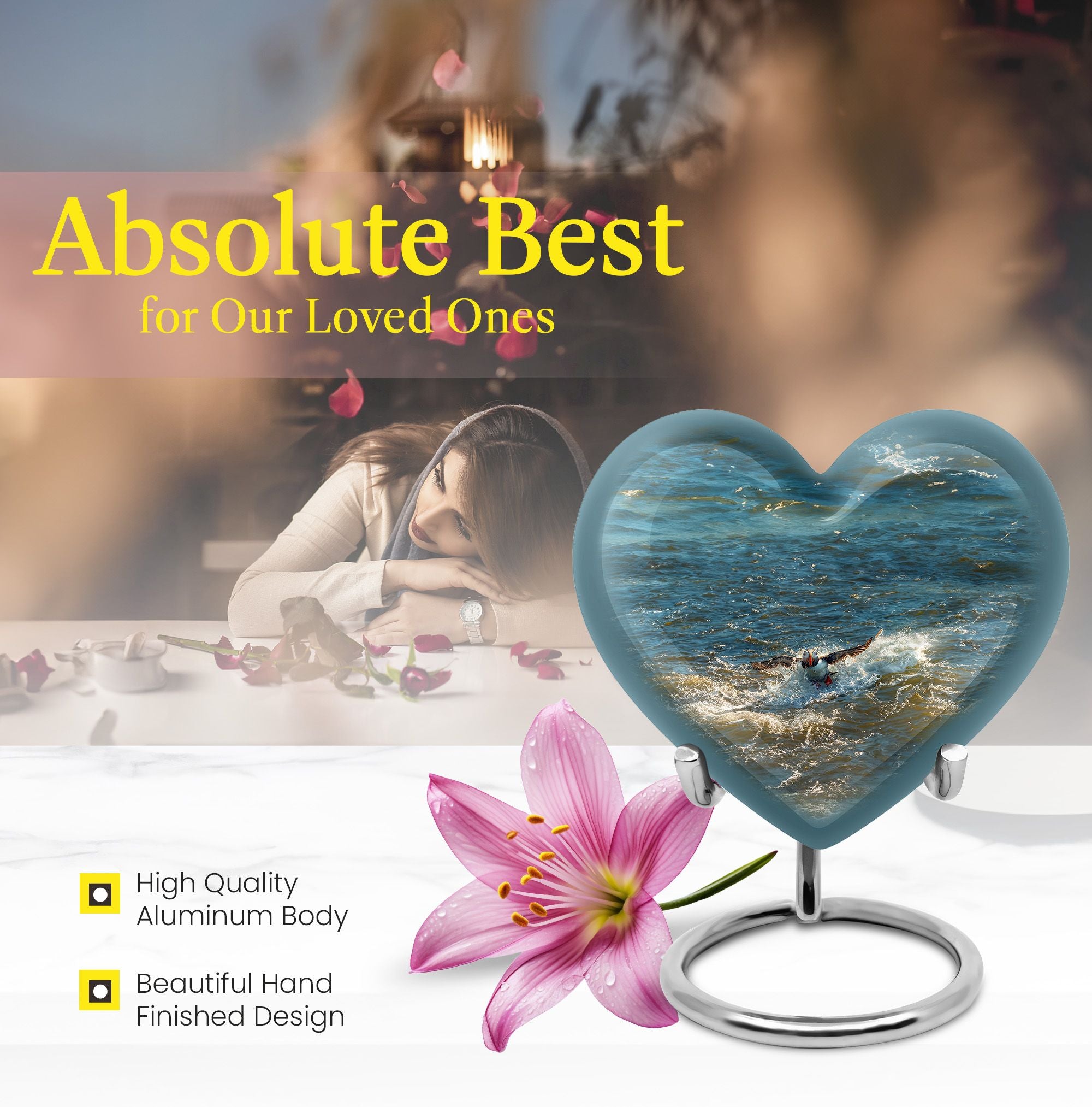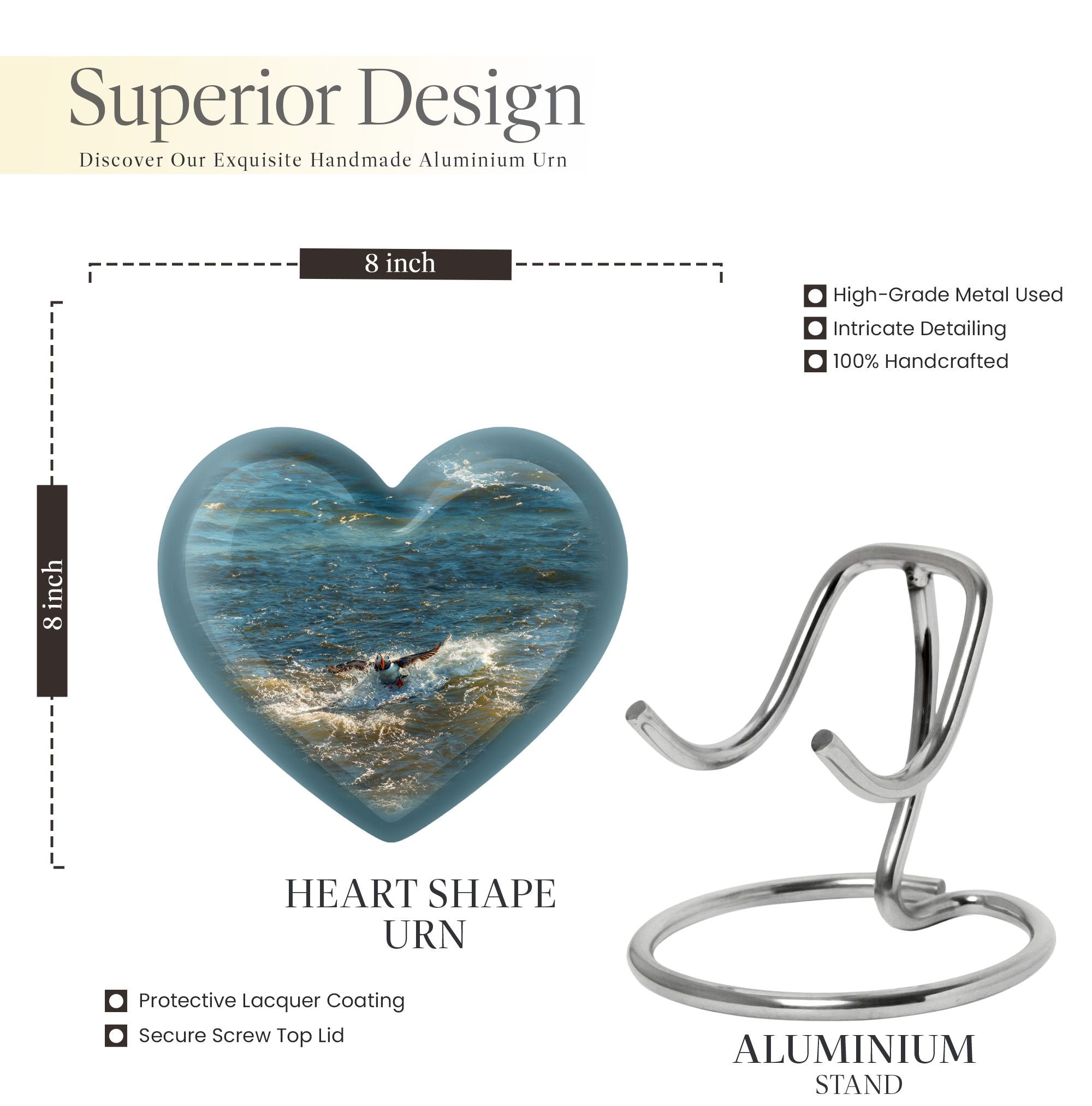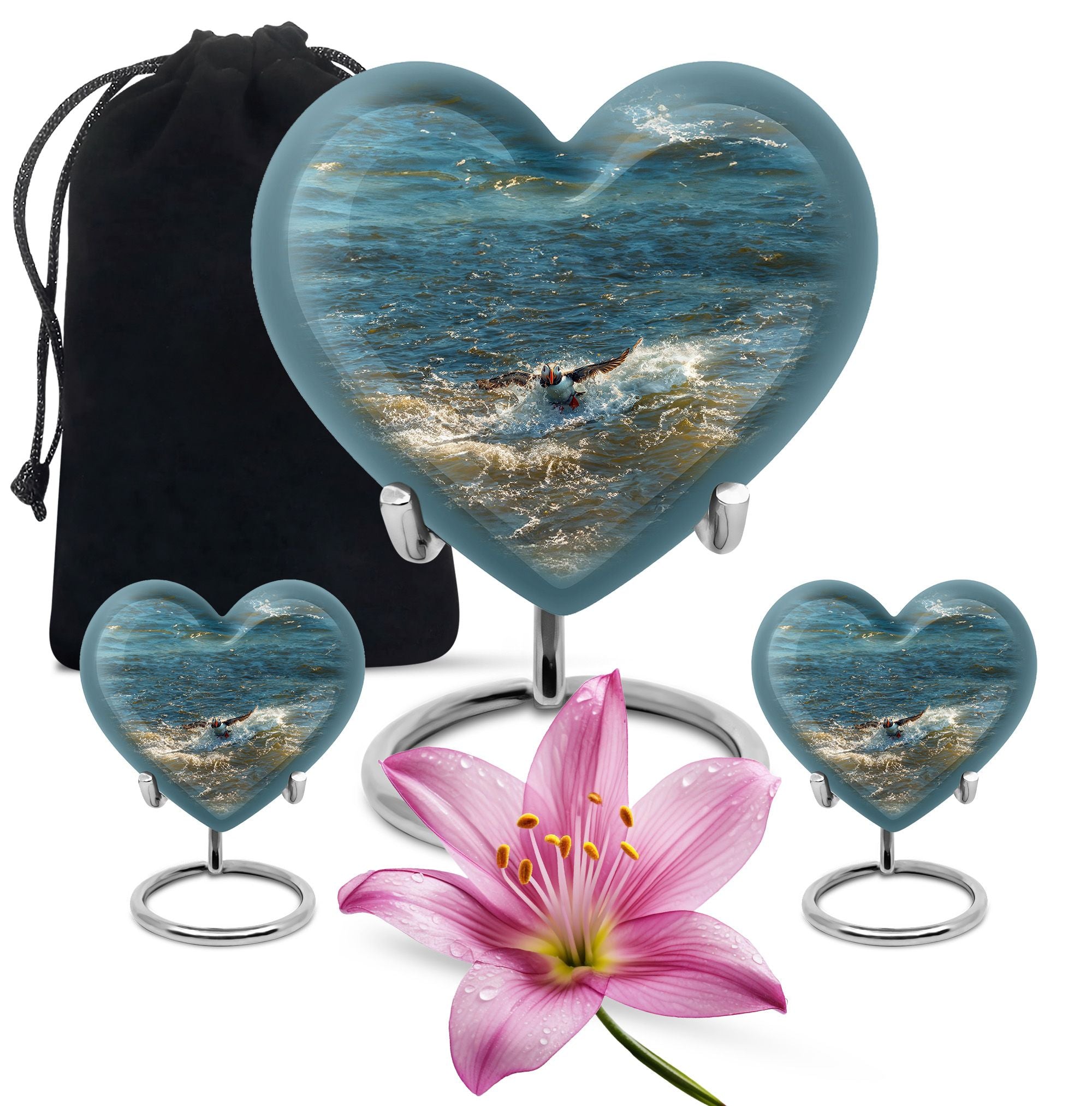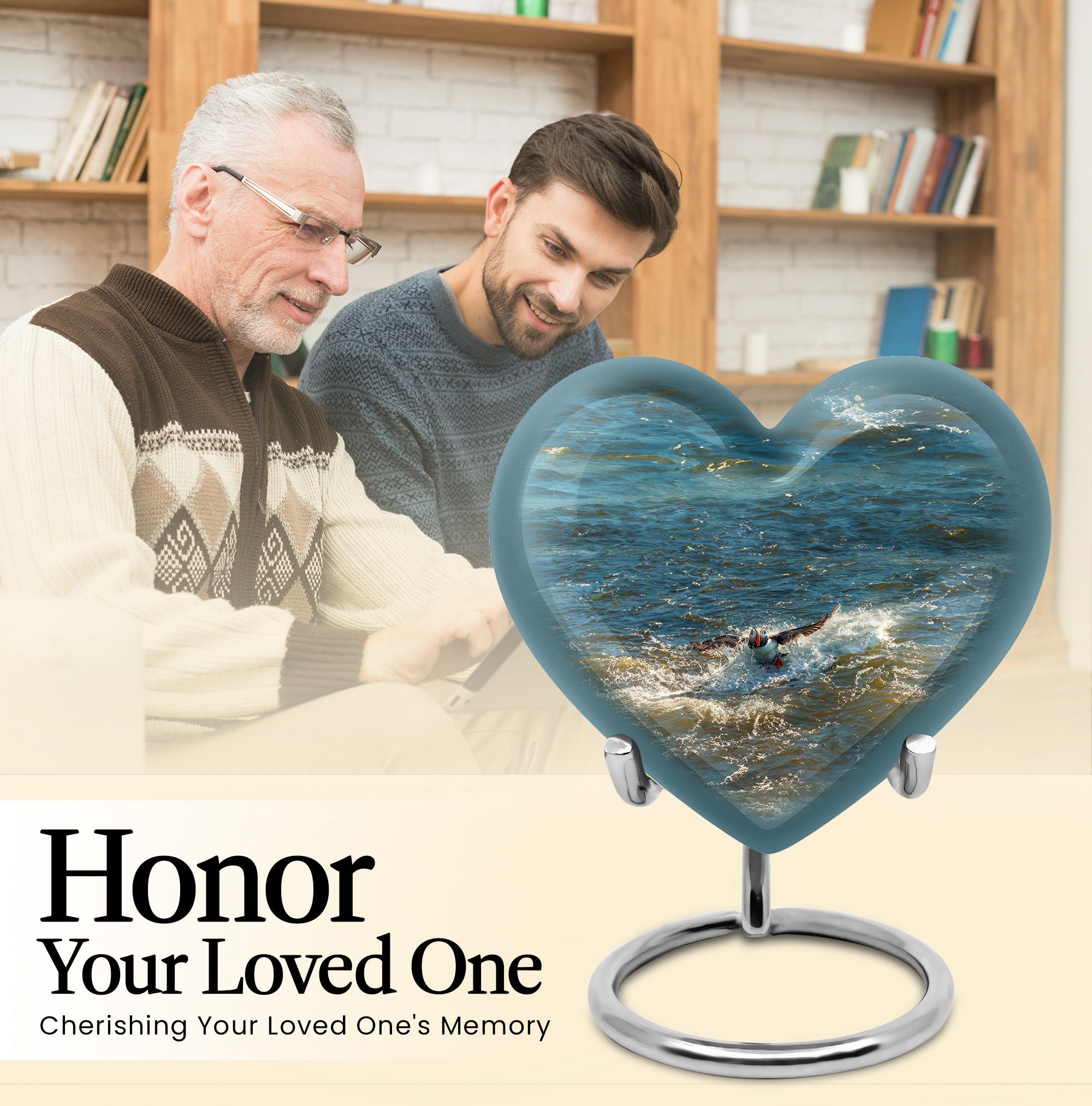 Ensure a peacefully everlasting rest for your dearly departed with our Puffin Bird Urn. This unique burial ash urn is tailored exclusively for humans. Crafted with precision, this urn transcends the ordinary, symbolized by the universally adored Puffin Bird, signifying freedom and eternal peace. The fine Aluminium construction gives a stately heaviness, weighing 3.3 pounds and standing 10 inches tall. It easily accommodates 200 cubic inches of loved one's ashes. The urn arrives with a soft velvet pouch, ensuring secure containment of the ashes. The figure exhibits a heart-shaped appearance, allowing customers to personalize it with engraved names. Built to last, these large urns provide a dignified home for cremation ashes, suitable for both men and women. Our memorial urns strikes the perfect balance between elegance and durability, ensuring your loved one's memory continues to warm hearts for generations to come.
