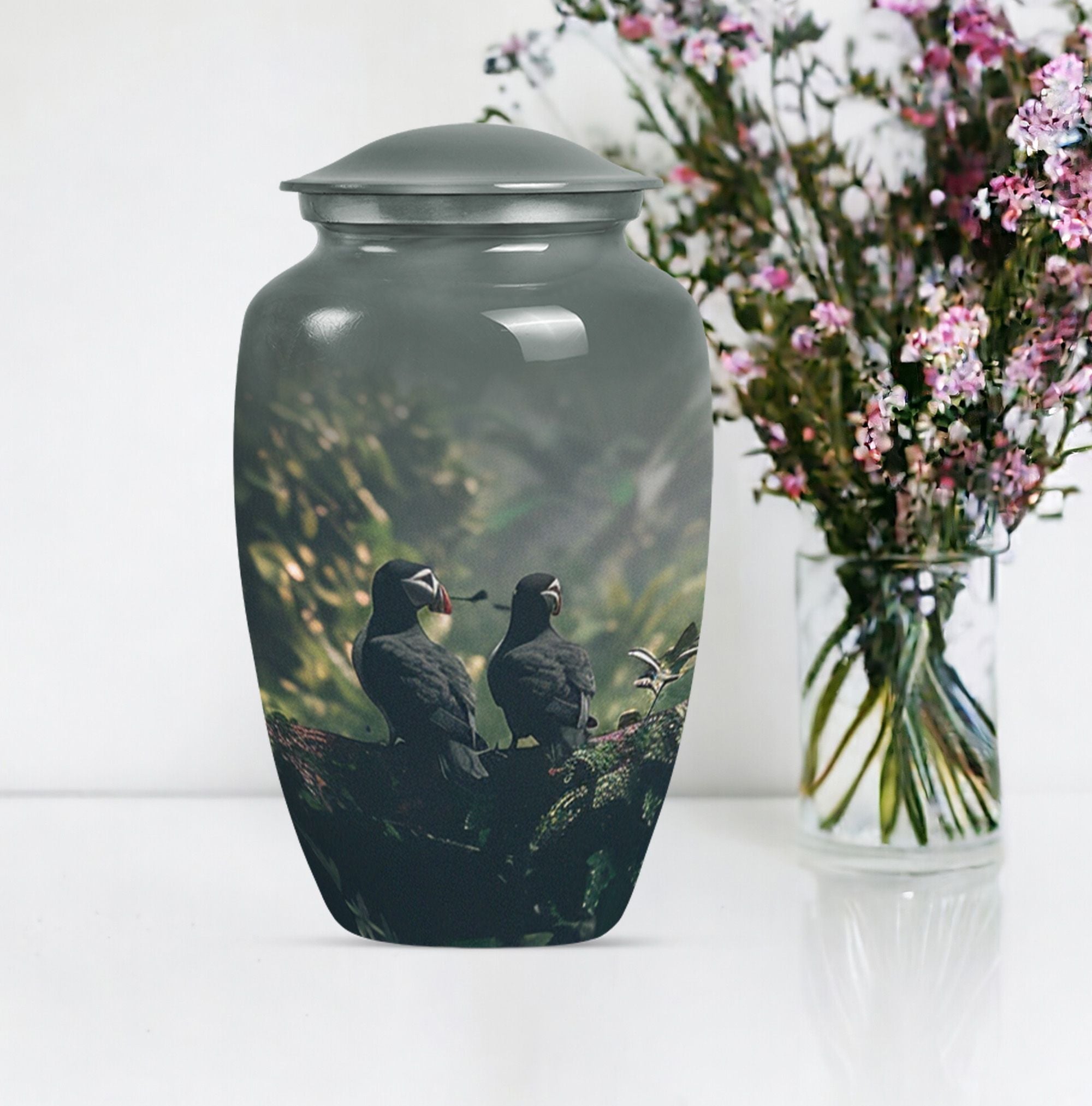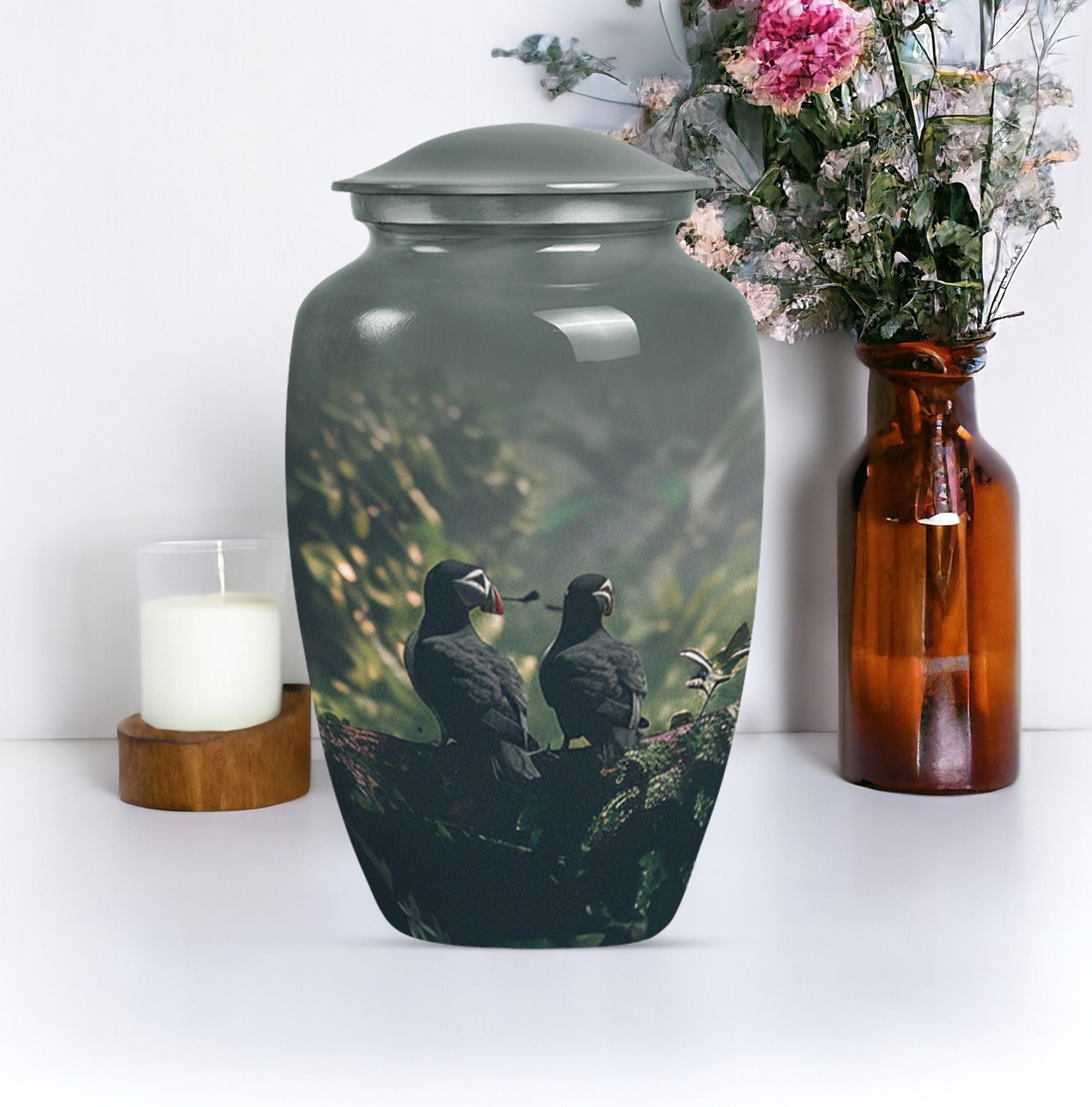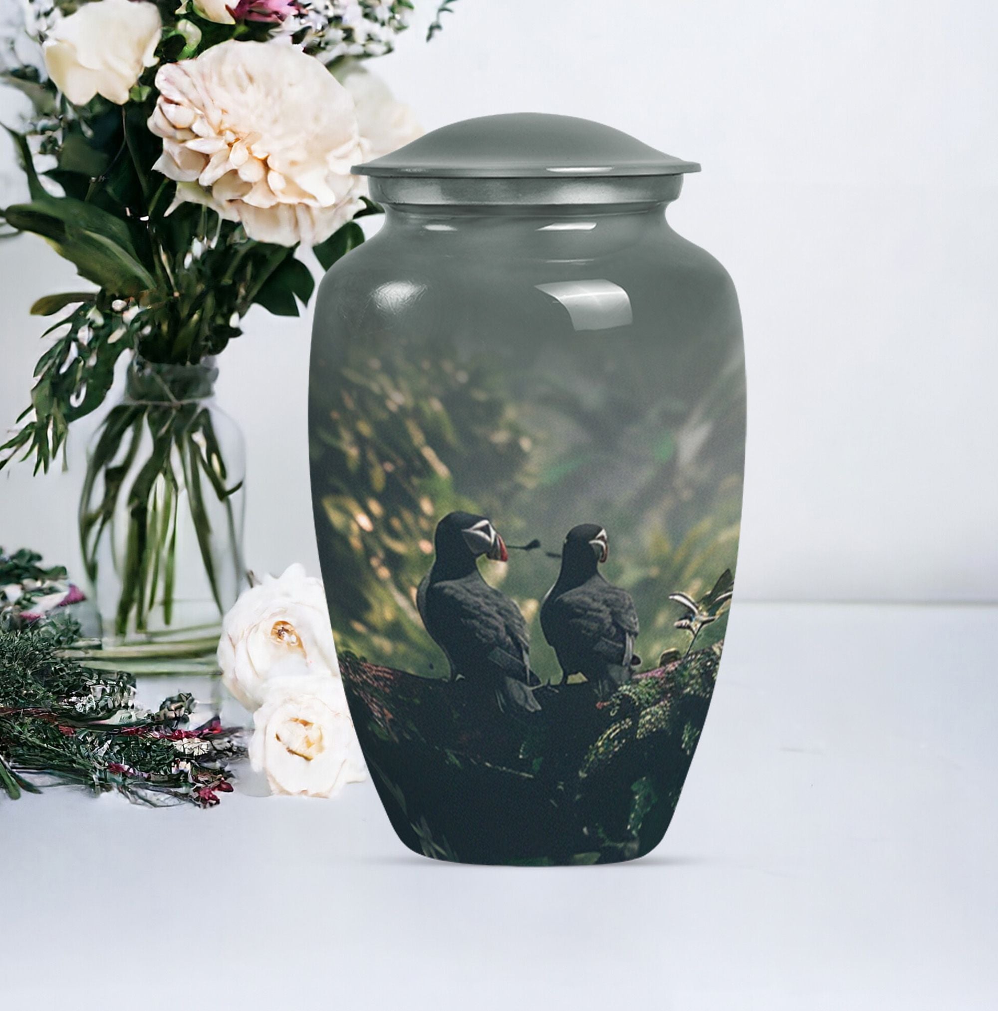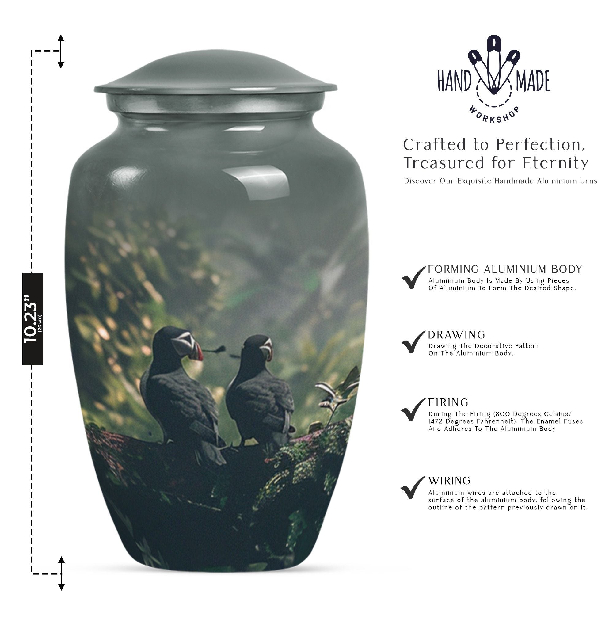 Discover serenity in remembrance with our Puffin Bird Cremation Urn. This large urn, standing 10-inches tall and weighing 3.3 pounds, is meticulously crafted from aluminium, presenting a robust commemoration of your late loved one. The Abstract-theme brings out a striking visual appeal that does not compromise the urn's classical aura. With a capacity of 200 cubic inches, this urn is designed to securely hold the ashes of your departed. To make this experience more personal, we allow you to engrave names on the urn, in honor of the person it symbolizes. The package is thoughtfully complemented with a velvet pouch, intended for containing the ashes before their final settling. The Puffin Bird Urn is more than just a cremation urn - it is a tribute to a lifetime of memories. Whether you're seeking cremation urns for dad or human urns for burial, our offering stands out in its unique blend of quality, design, and sentiment. Note: Design excluded in description as per instructions.