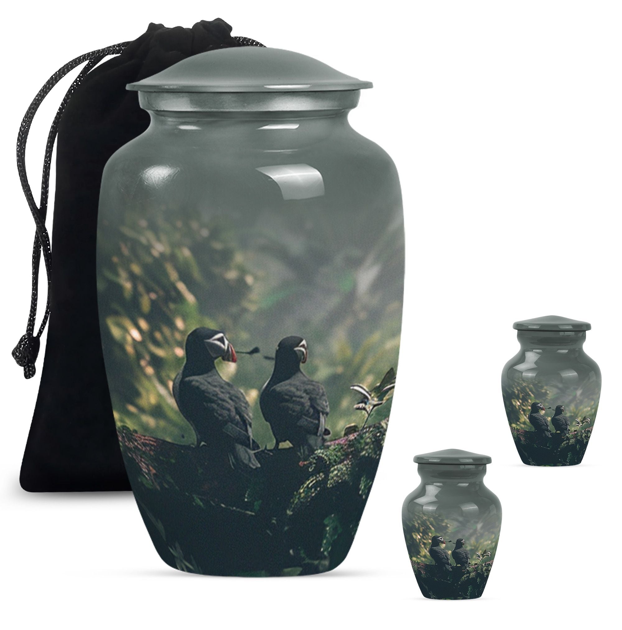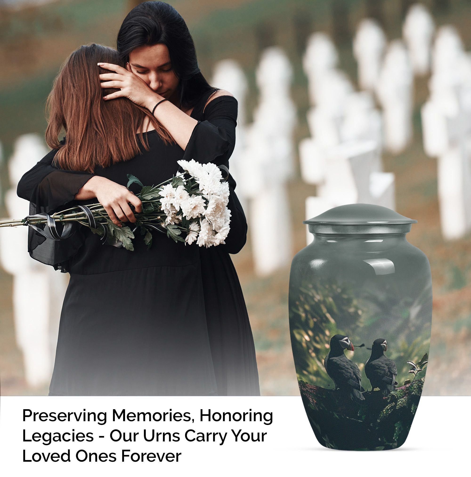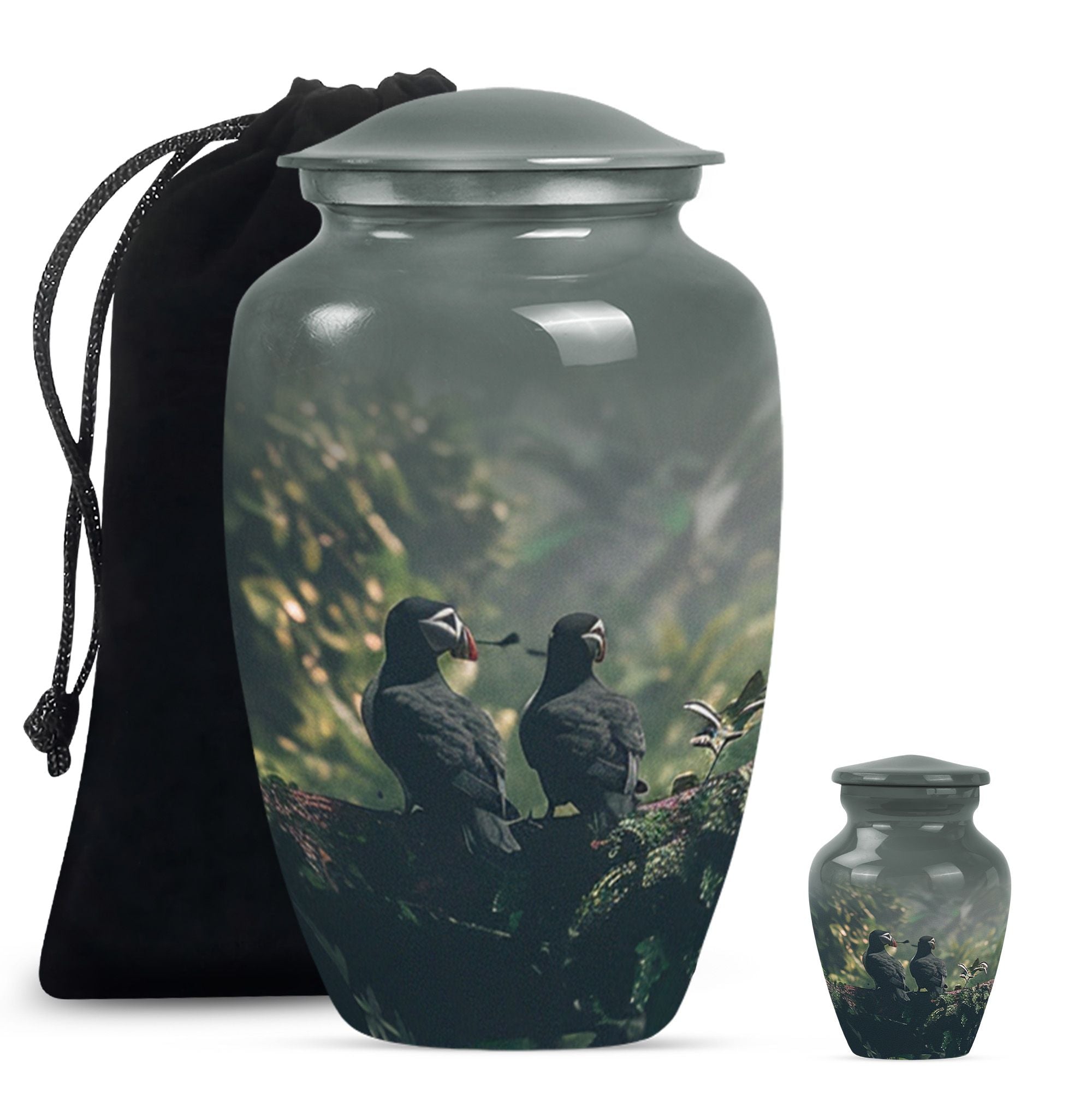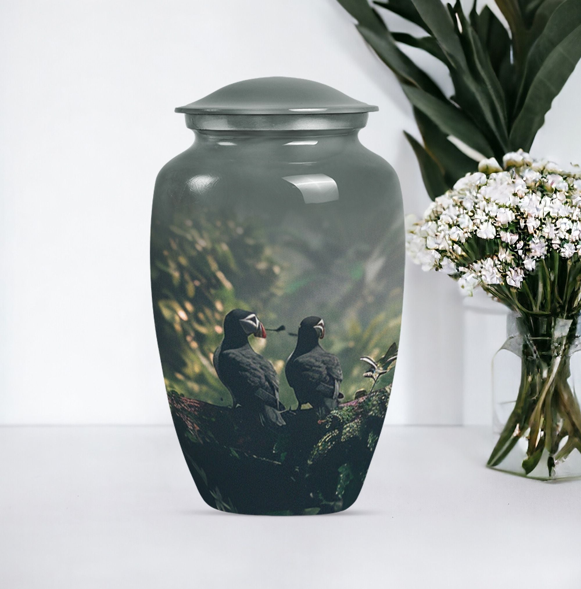 Discover serenity in remembrance with our Puffin Bird Cremation Urn. This large urn, standing 10-inches tall and weighing 3.3 pounds, is meticulously crafted from aluminium, presenting a robust commemoration of your late loved one. The Abstract-theme brings out a striking visual appeal that does not compromise the urn's classical aura. With a capacity of 200 cubic inches, this urn is designed to securely hold the ashes of your departed. To make this experience more personal, we allow you to engrave names on the urn, in honor of the person it symbolizes. The package is thoughtfully complemented with a velvet pouch, intended for containing the ashes before their final settling. The Puffin Bird Urn is more than just a cremation urn - it is a tribute to a lifetime of memories. Whether you're seeking cremation urns for dad or human urns for burial, our offering stands out in its unique blend of quality, design, and sentiment. Note: Design excluded in description as per instructions.