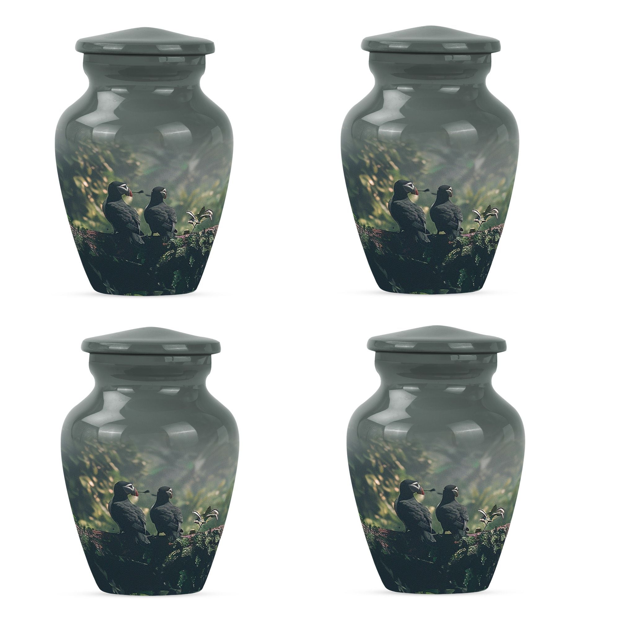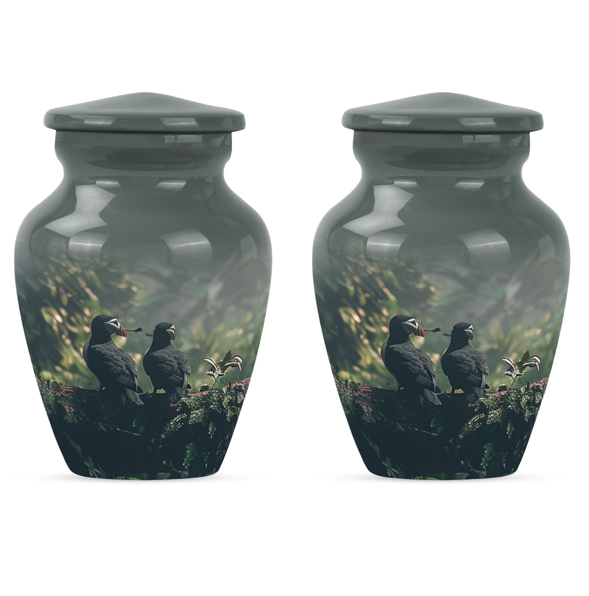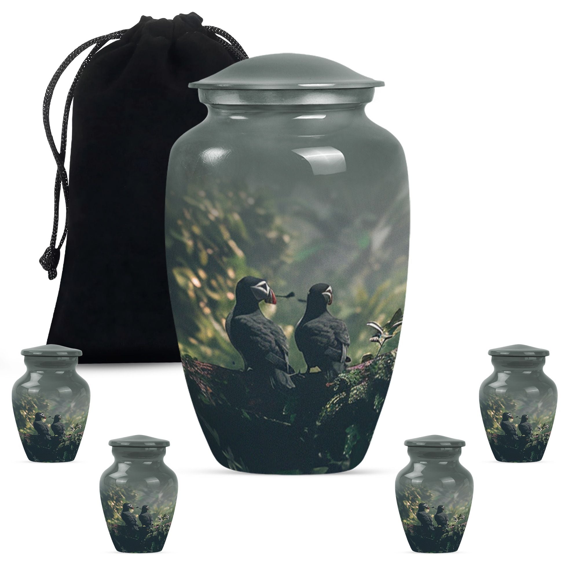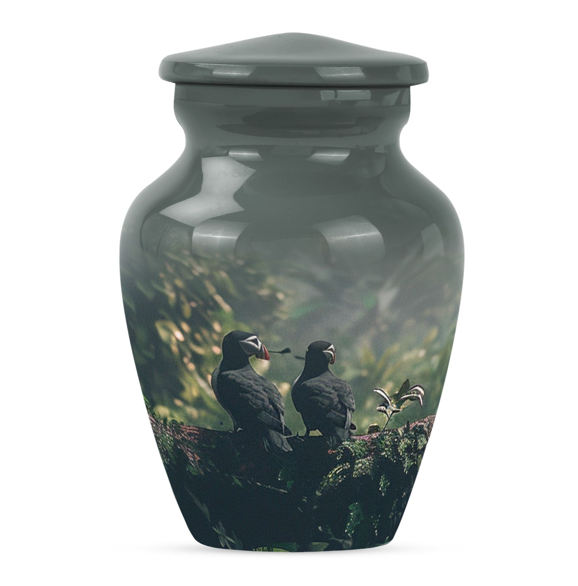 Discover serenity in remembrance with our Puffin Bird Cremation Urn. This large urn, standing 10-inches tall and weighing 3.3 pounds, is meticulously crafted from aluminium, presenting a robust commemoration of your late loved one. The Abstract-theme brings out a striking visual appeal that does not compromise the urn's classical aura. With a capacity of 200 cubic inches, this urn is designed to securely hold the ashes of your departed. To make this experience more personal, we allow you to engrave names on the urn, in honor of the person it symbolizes. The package is thoughtfully complemented with a velvet pouch, intended for containing the ashes before their final settling. The Puffin Bird Urn is more than just a cremation urn - it is a tribute to a lifetime of memories. Whether you're seeking cremation urns for dad or human urns for burial, our offering stands out in its unique blend of quality, design, and sentiment. Note: Design excluded in description as per instructions.