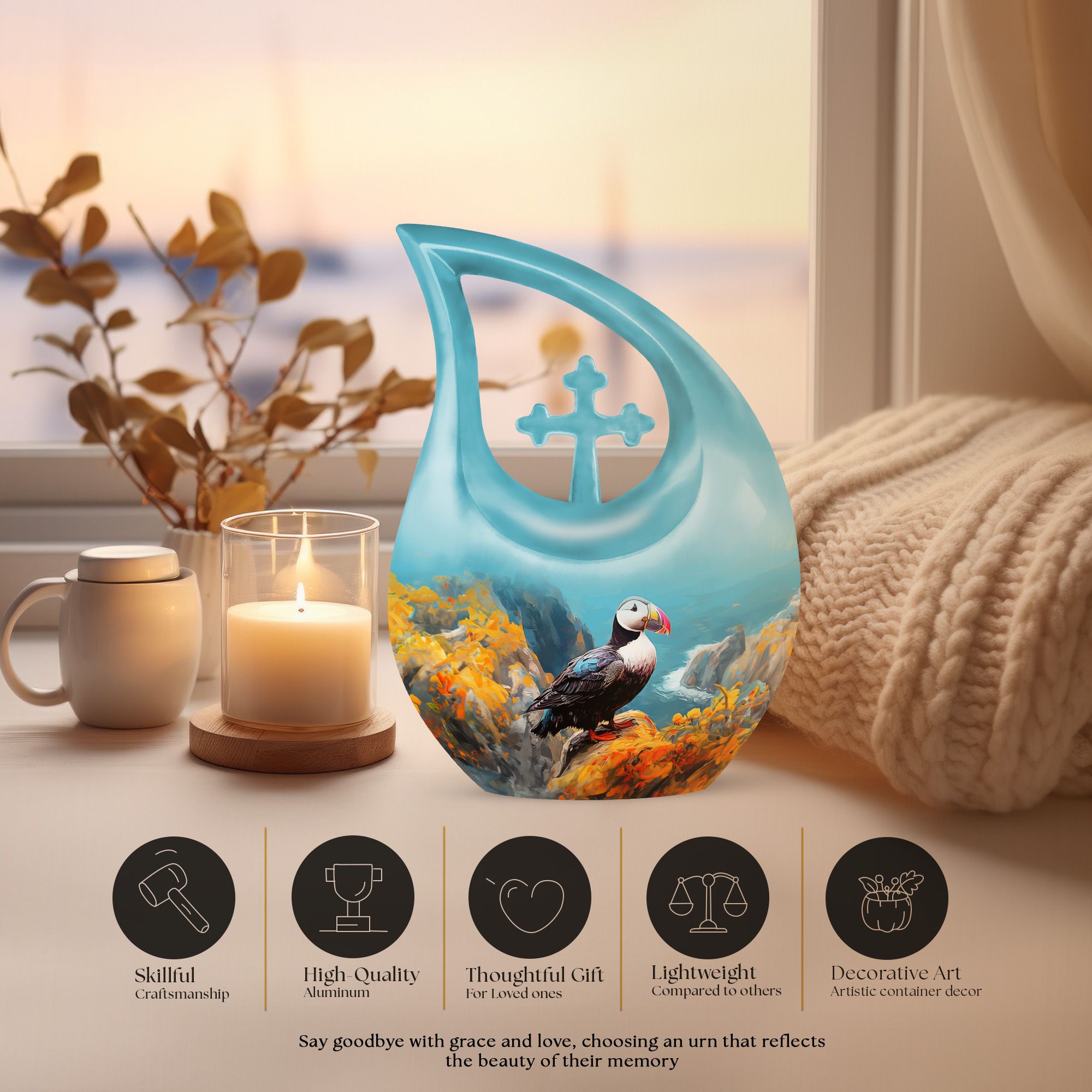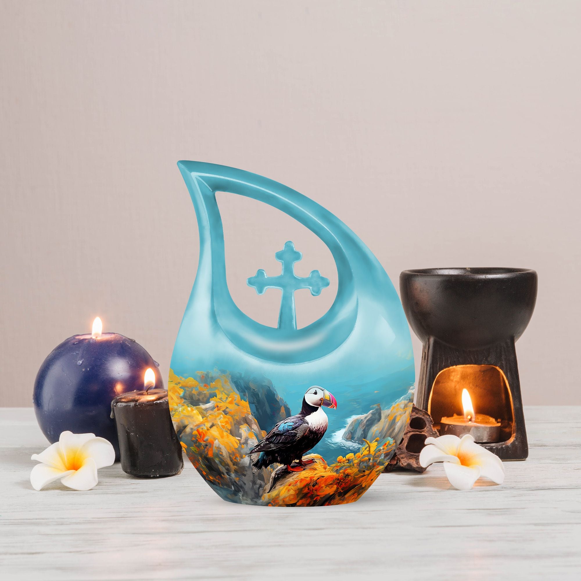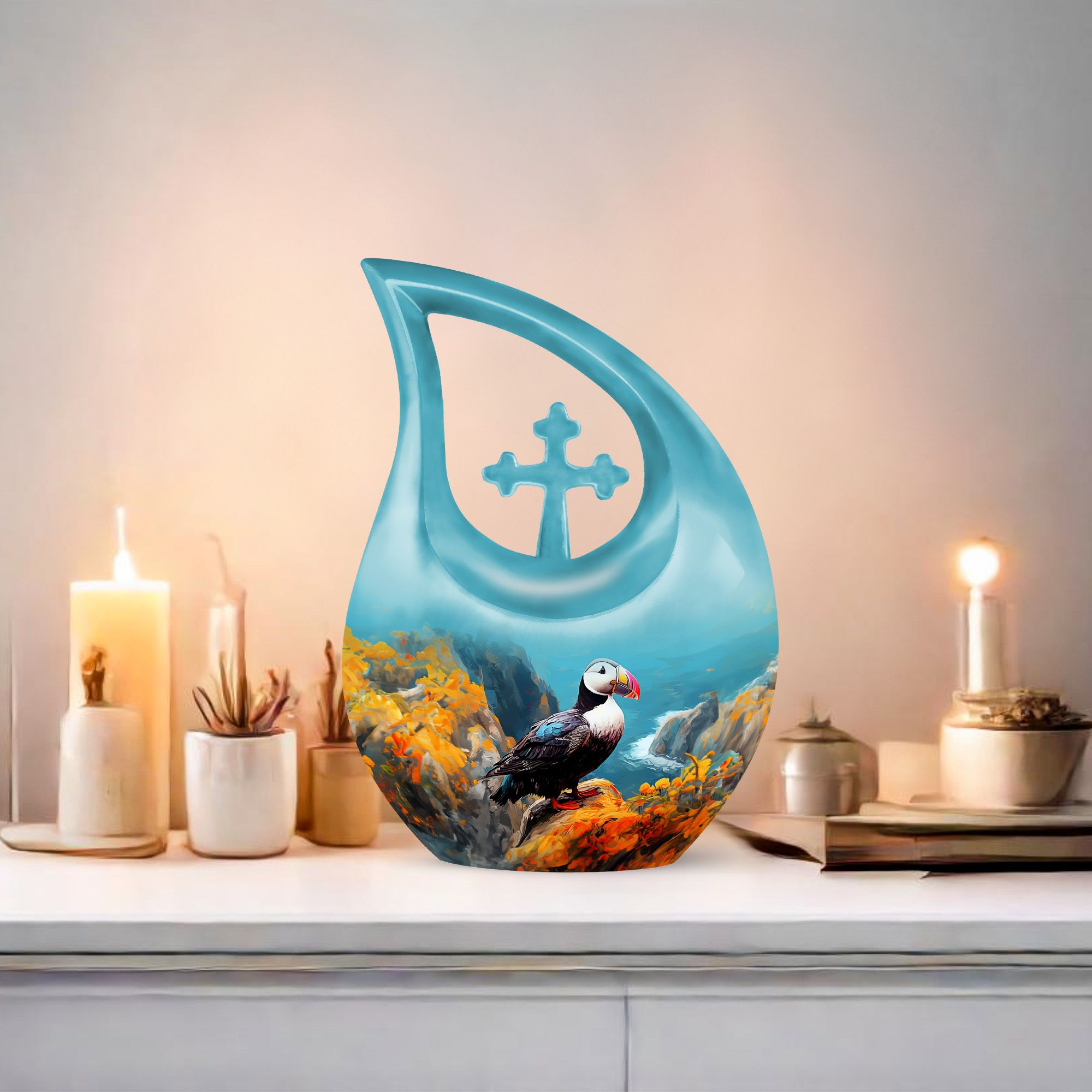 Expertly constructed from durable materials, this large human ashes urn features a detailed puffin bird motif symbolizing resilience, peace, and enduring love. Its elegant design makes it one of the finest large cremation urns for displaying at home or for use during services. With its generous capacity, it serves as an ideal choice for urns for ashes adult male large, large urns for human ashes adult female, and other adult large urns needing both beauty and security.