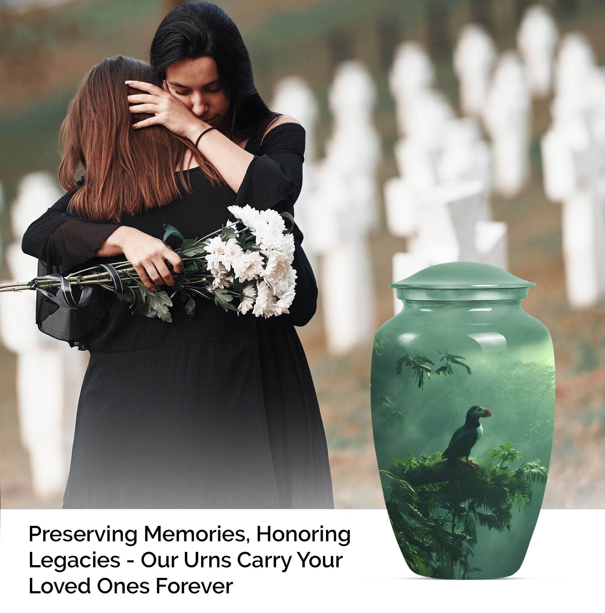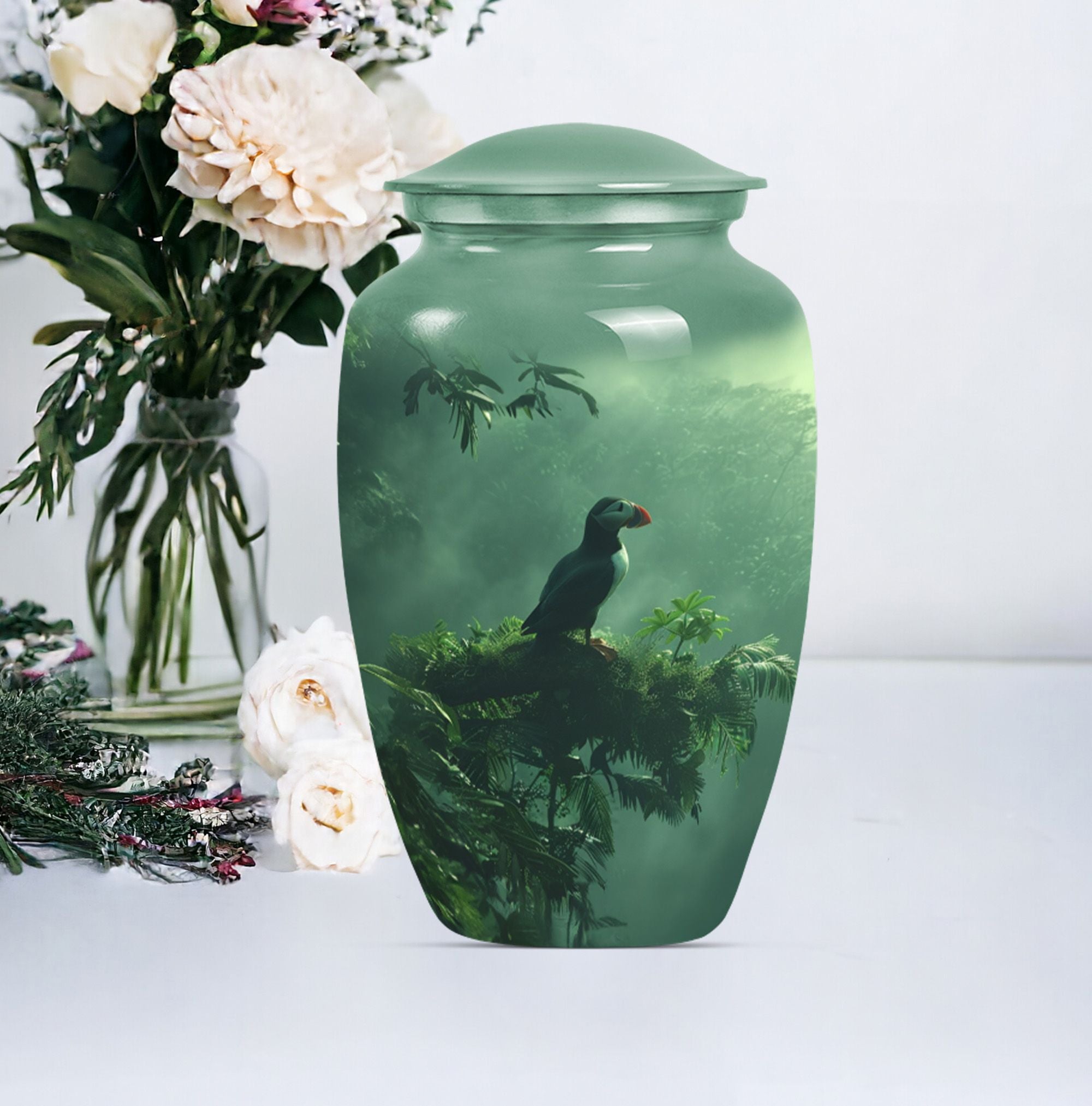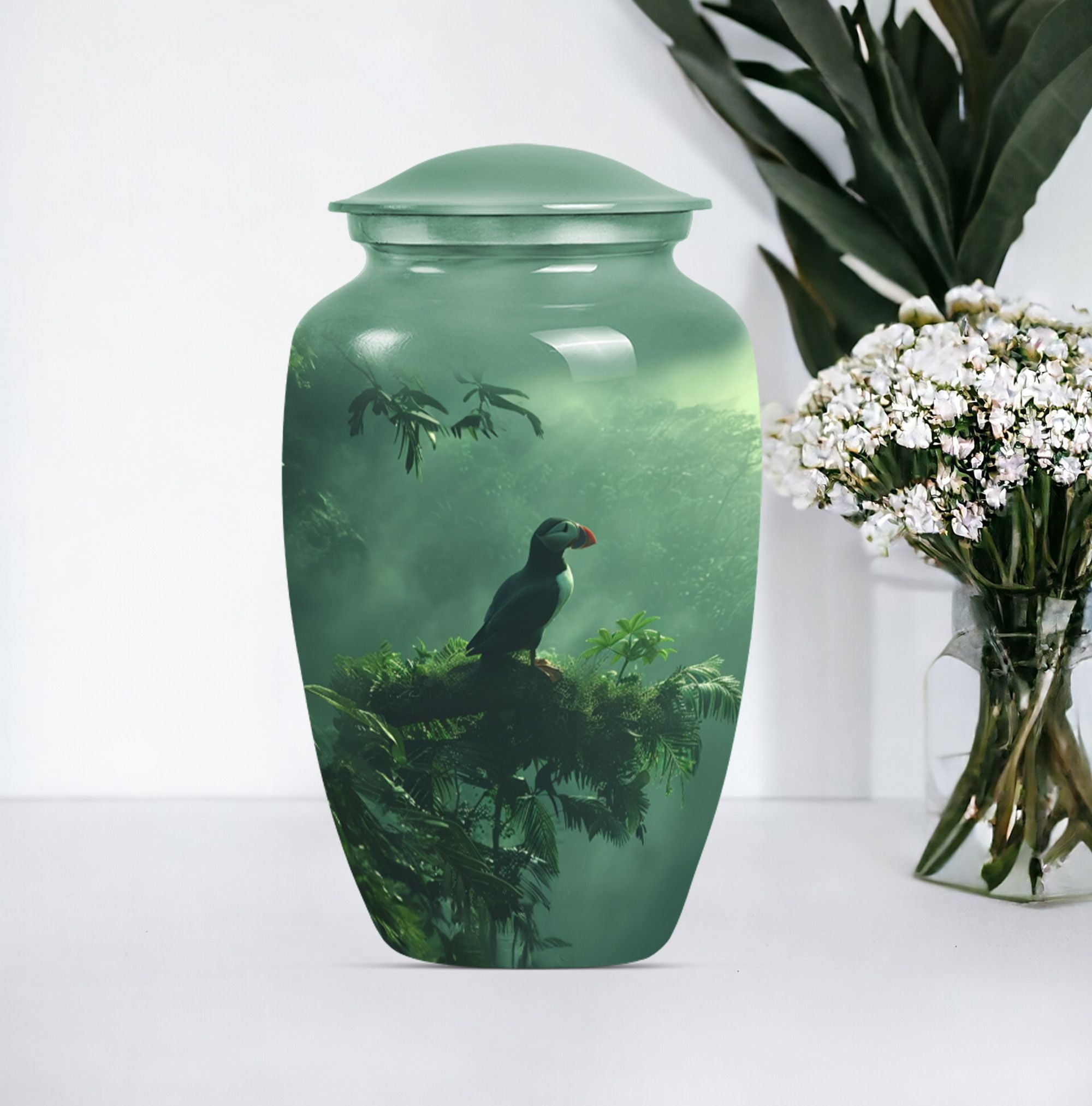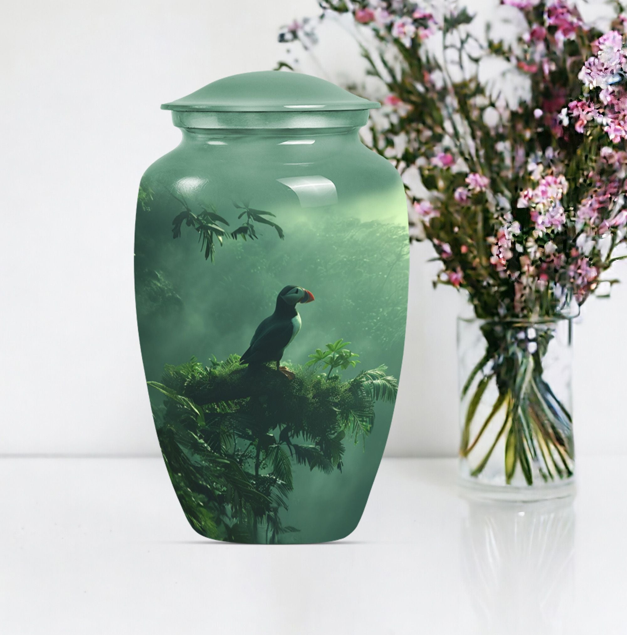 Find solace and honor your dear departed with the Puffin Bird Urn, a thoughtfully crafted large memorial urn with an abstract theme. Uniquely designed for an individual with a penchant for puffin birds, this burial urn for human ashes serves as a keepsake of fond memories. Weighting 3.3 pounds, and measuring 10 inches in height, this urn has a substantial capacity of 200 cubic inches, ensuring ample space for adult human ashes. It is markedly built with reliable aluminium material, guaranteeing sturdiness and longevity. Along with the urn, you'll receive a delicate velvet pouch for tasteful and secure containment of ashes. Customize this urn by engraving names, adding a personal touch to this precious memorial piece. Remember and cherish your loved one with this lasting symbol of homage and love. Don't forget to search funeral urn for mom or urn ash ashes adult for similar items.