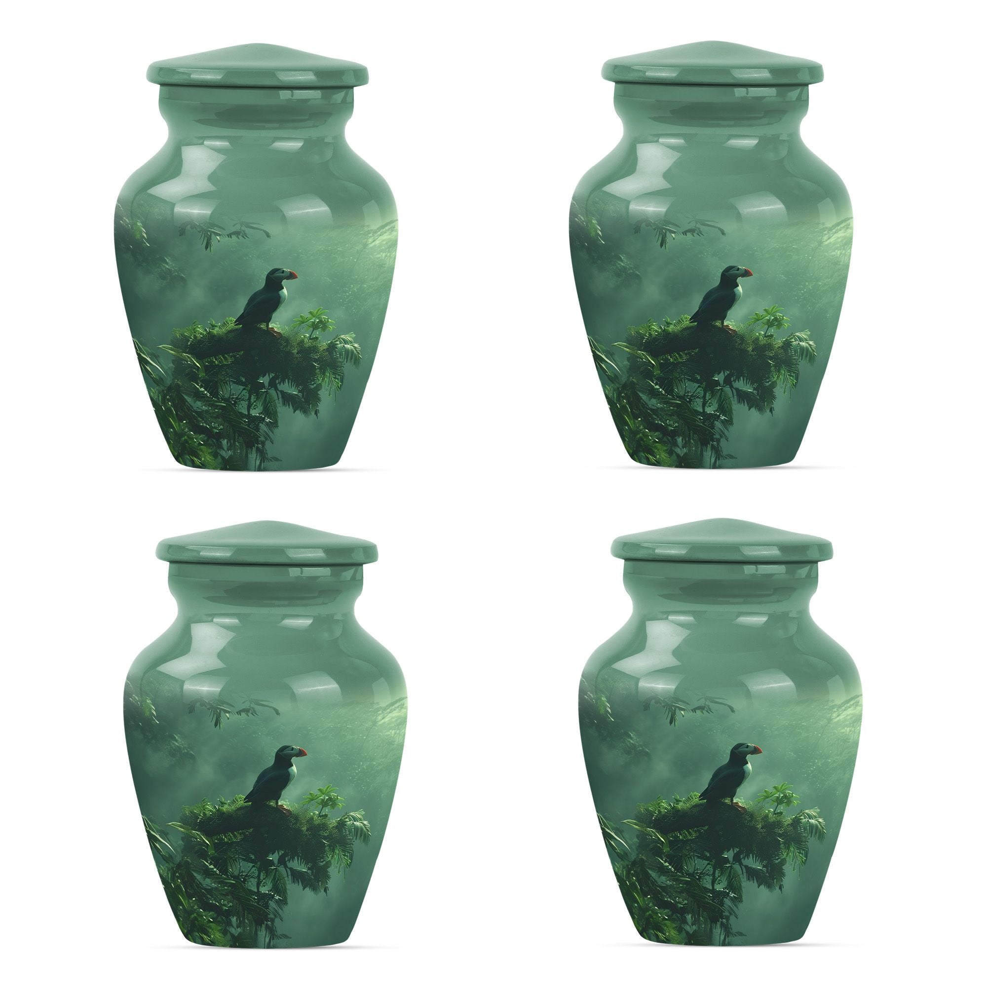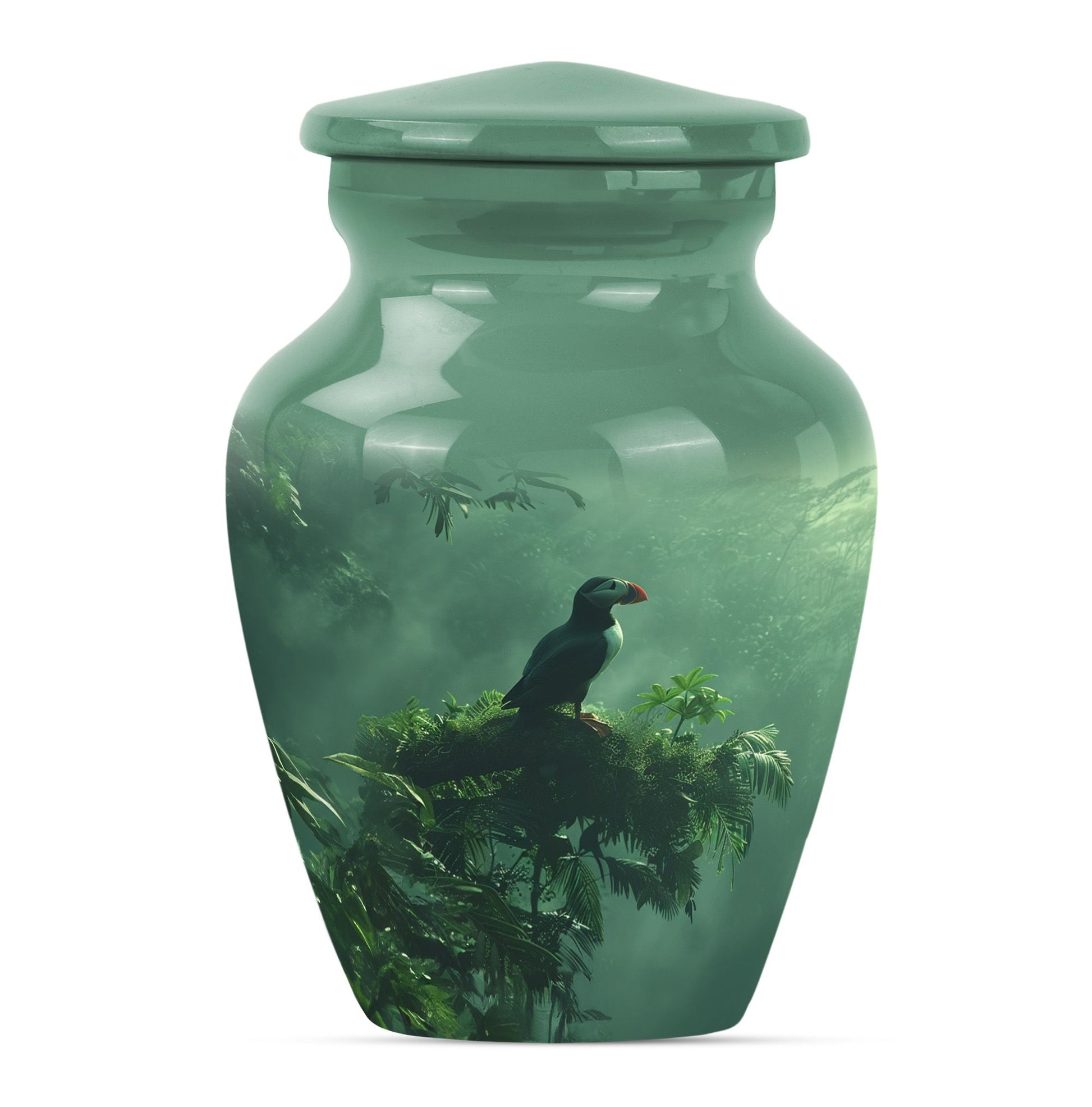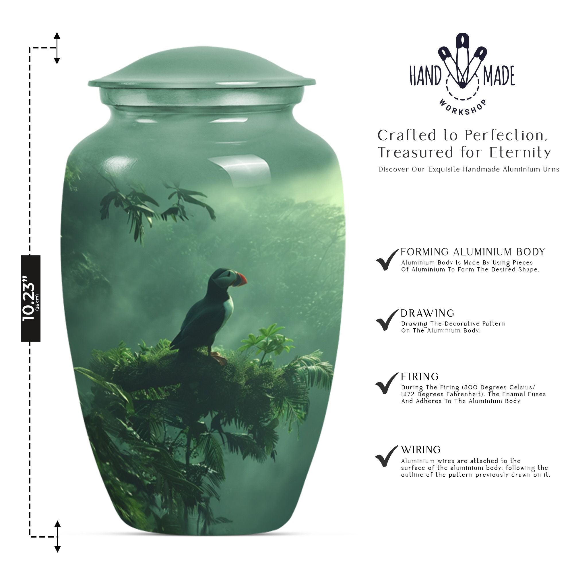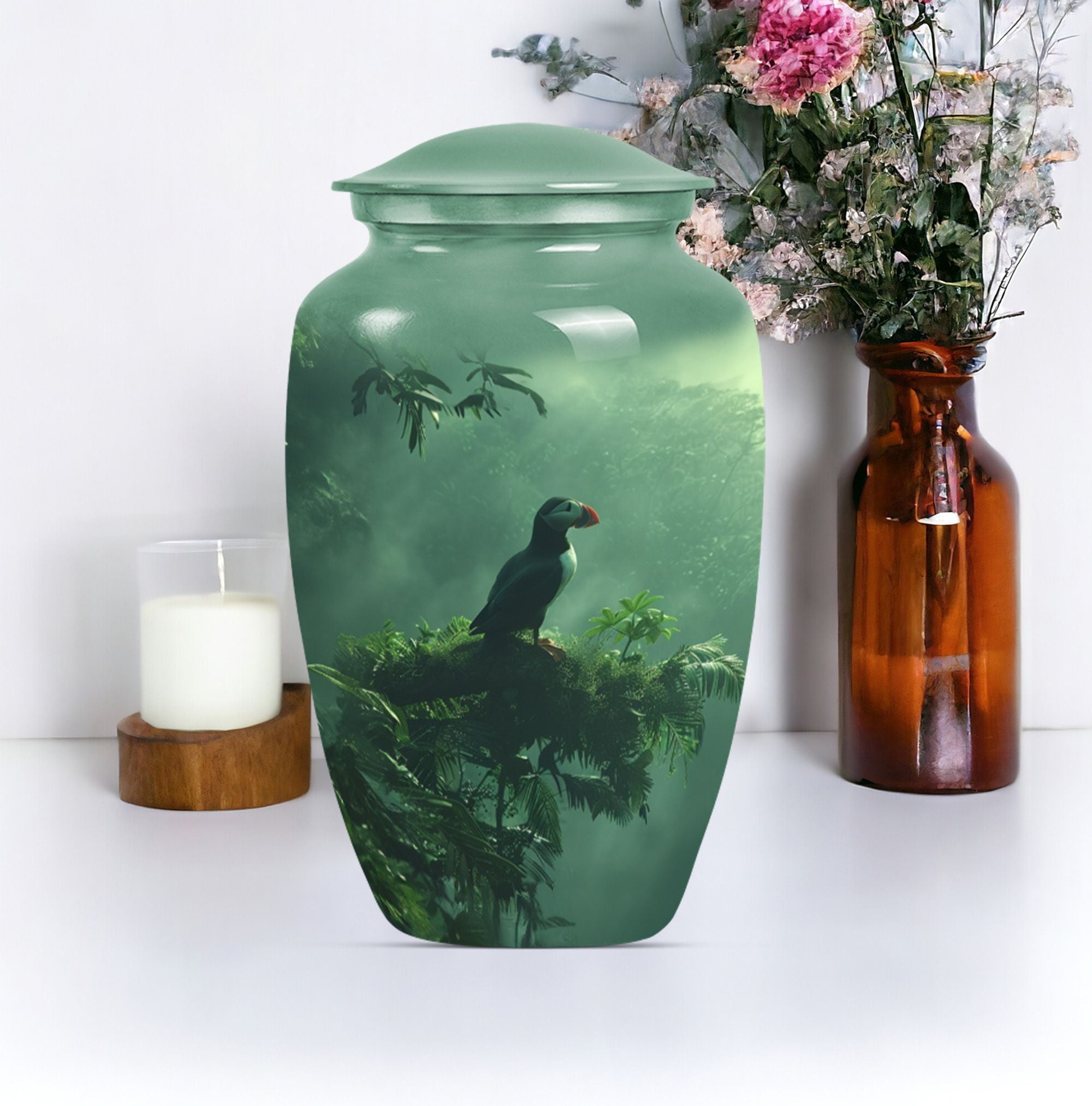 Find solace and honor your dear departed with the Puffin Bird Urn, a thoughtfully crafted large memorial urn with an abstract theme. Uniquely designed for an individual with a penchant for puffin birds, this burial urn for human ashes serves as a keepsake of fond memories. Weighting 3.3 pounds, and measuring 10 inches in height, this urn has a substantial capacity of 200 cubic inches, ensuring ample space for adult human ashes. It is markedly built with reliable aluminium material, guaranteeing sturdiness and longevity. Along with the urn, you'll receive a delicate velvet pouch for tasteful and secure containment of ashes. Customize this urn by engraving names, adding a personal touch to this precious memorial piece. Remember and cherish your loved one with this lasting symbol of homage and love. Don't forget to search funeral urn for mom or urn ash ashes adult for similar items.