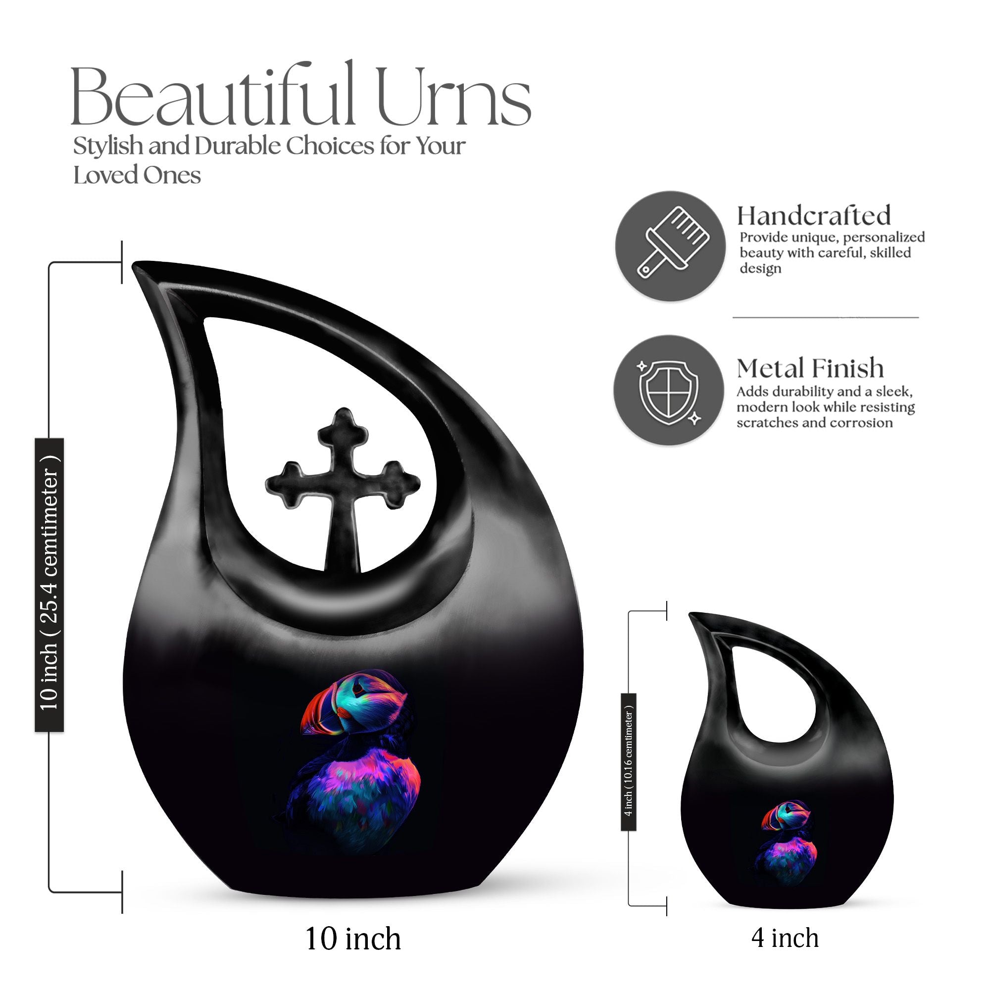Crafted from premium aluminium, the urn features a serene puffin bird perched against a peaceful coastal backdrop—symbolizing freedom, resilience, and eternal peace. Its secure screw-top lid ensures ashes stay protected, while its compact 10-inch size makes it perfect for those looking for urns for cremation, cremation keepsakes urns, or urns for cremation ashes small. The elegant finish provides a comforting display for home memorials or columbarium placement.