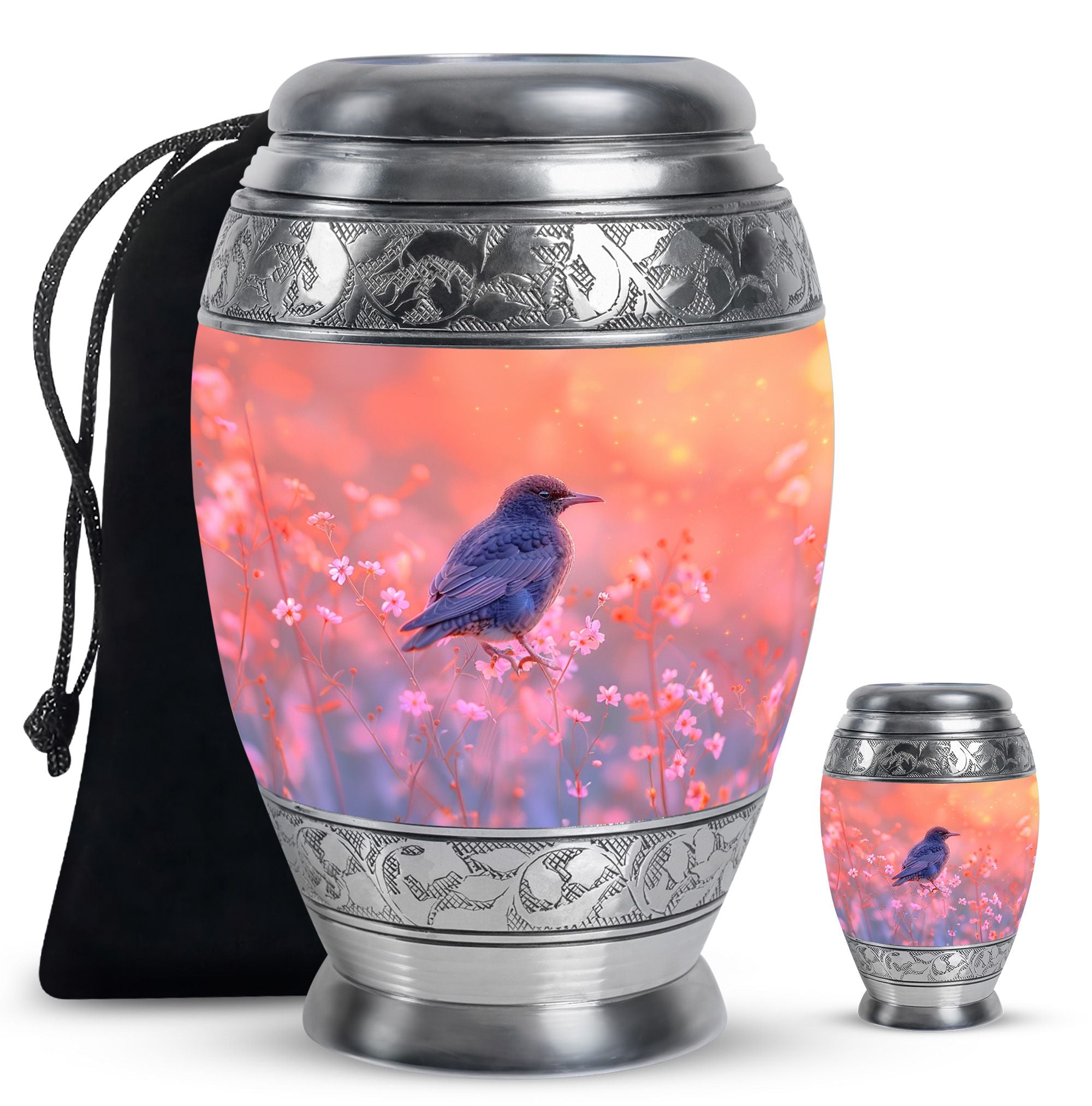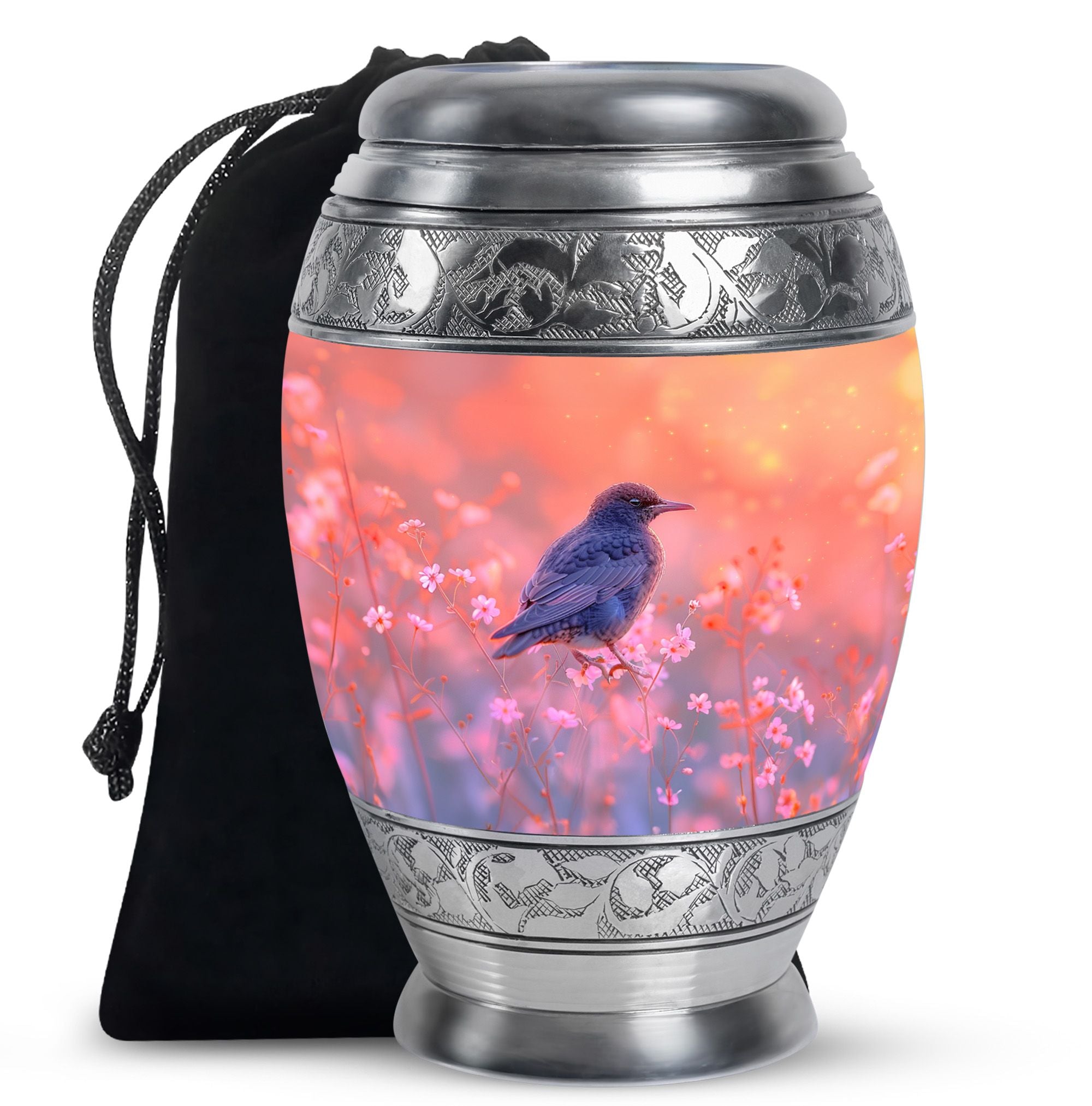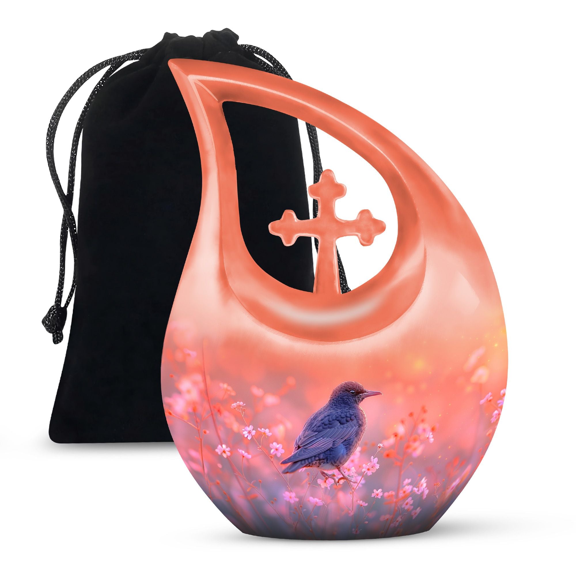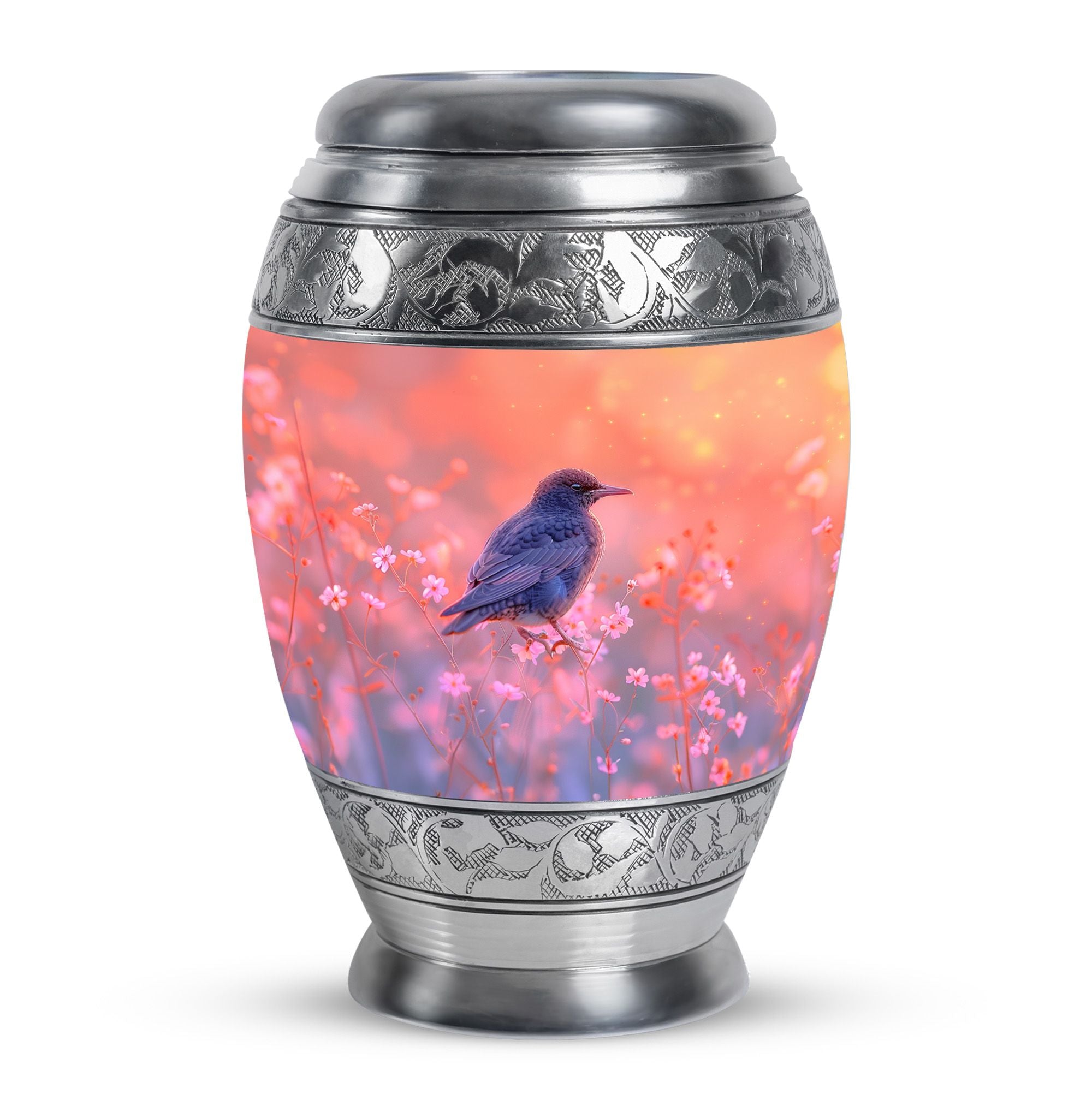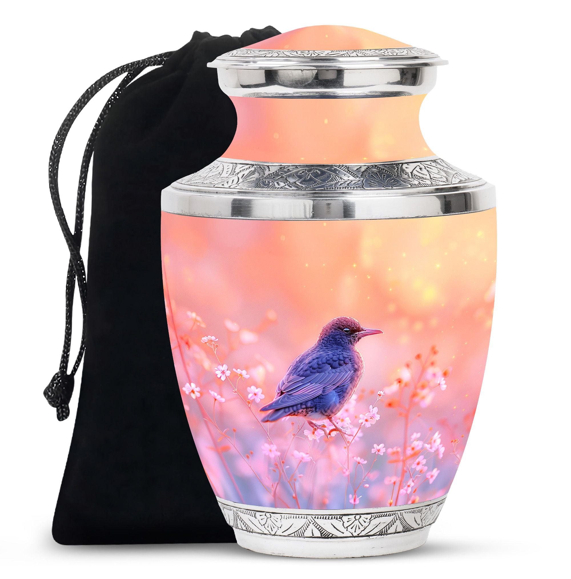 Crafted from durable aluminium, this urn combines delicate artistry with long-lasting strength. Its secure screw-top lid ensures the ashes are safely stored, while the 10-inch height and 200-cubic-inch capacity make it suitable as a funeral urns for human ashes small, small funeral urns, or even a mini keepsake funeral urn. The soft pink design and elegant solitary bird motif reflect serenity and grace, making it perfect for funeral adult urn or funeral urn use.
