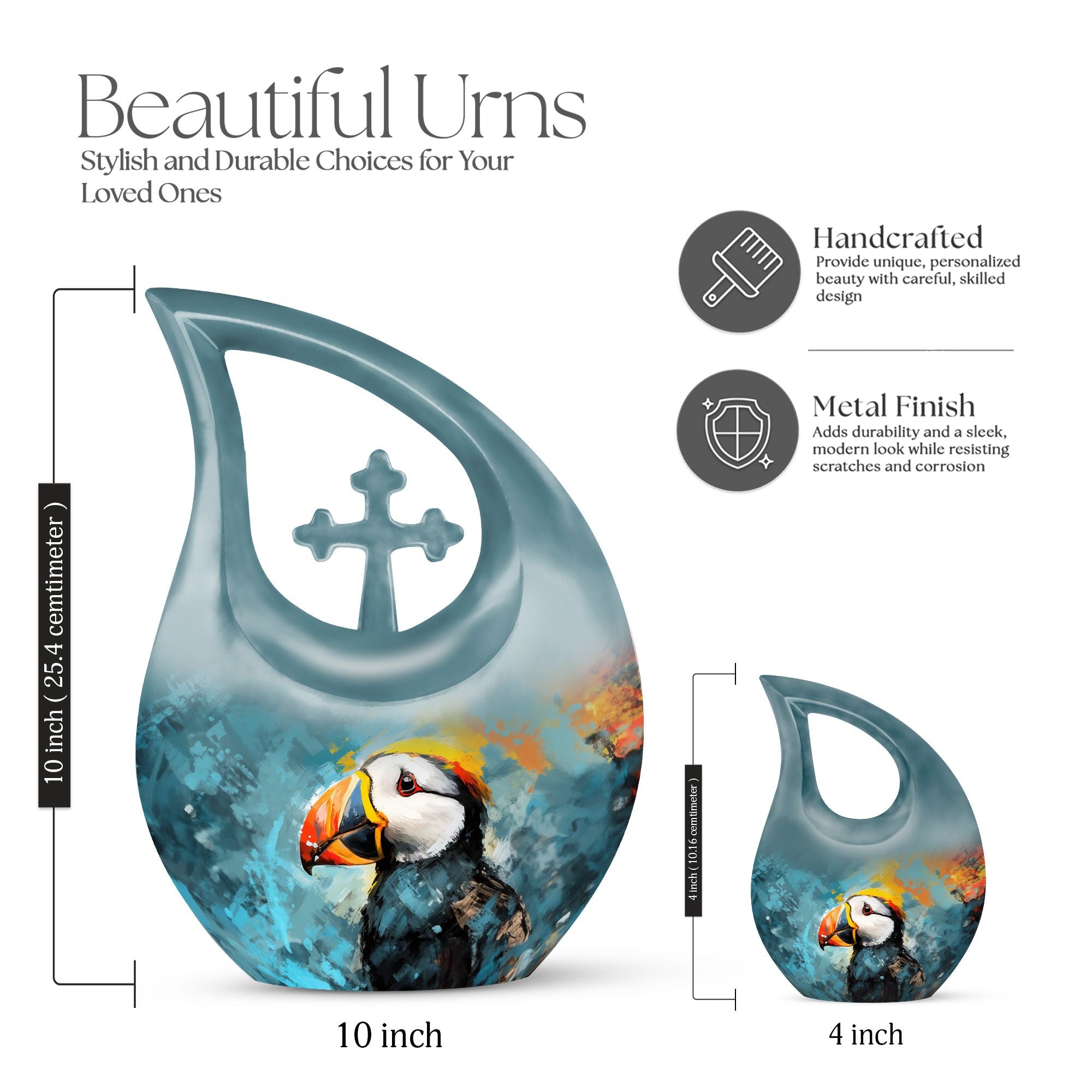 Crafted from high-quality aluminium, this urn features a beautifully detailed puffin bird motif, representing comfort and safe passage. With its durable construction and secure screw-top lid, it is an excellent choice for families needing an Urn for Burial in Ground, Burial Urns for Ground, or long-lasting Cremation Urns for Burial. Its 10-inch height and 200-cubic-inch capacity make it perfect for safe and dignified memorial placement whether kept at home or used as part of Urns for Burial in Ground, Burial Urns for Ashes, or traditional remembrance rituals.