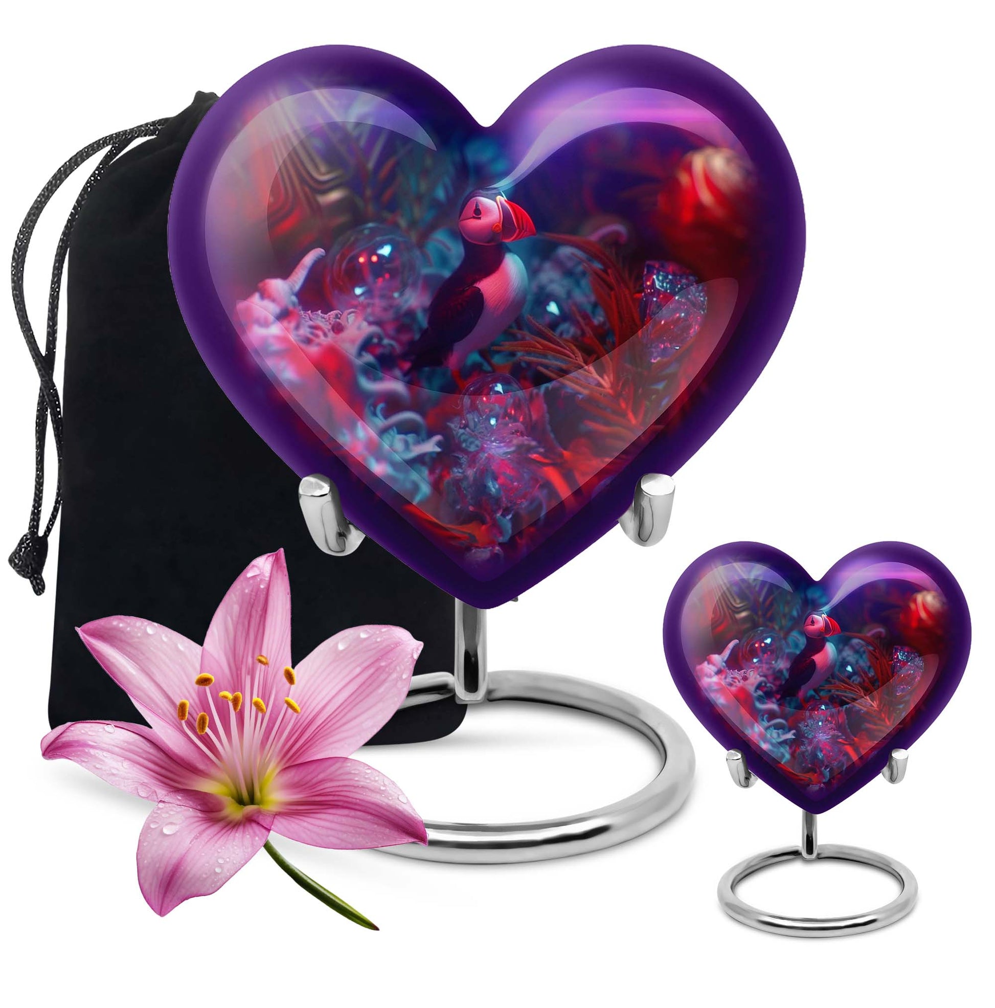 Presenting our 10-inch Puffin Bird Urn, a majestic and touching way to commemorate a cherished life. This beautifully crafted burial urn elegantly combines functionality and art with an abstract theme. Its design is inspired by the poignant presence of a heart, symbolizing unending love and remembrance. Made from high-quality aluminium, this large urn offers durability and a substantial weight of 3.3 pounds, manifesting a profound sense of permanence. Its 200 cubic inch capacity ensures ample space to securely hold the ashes. Personalizing the urn with engraved names adds an intimate touch to this memorial item, making it that much more exceptional. Our package includes a velvet pouch to provide additional containment for ashes, adding an extra layer of protection and respect. Whether you're seeking urns for men, dual urns for adult male and female, or metal urns for in-ground burial, our Puffin Bird Urn is a dignified choice that leaves a lasting remembrance. Honour your loved ones with this epitome of enduring affection.