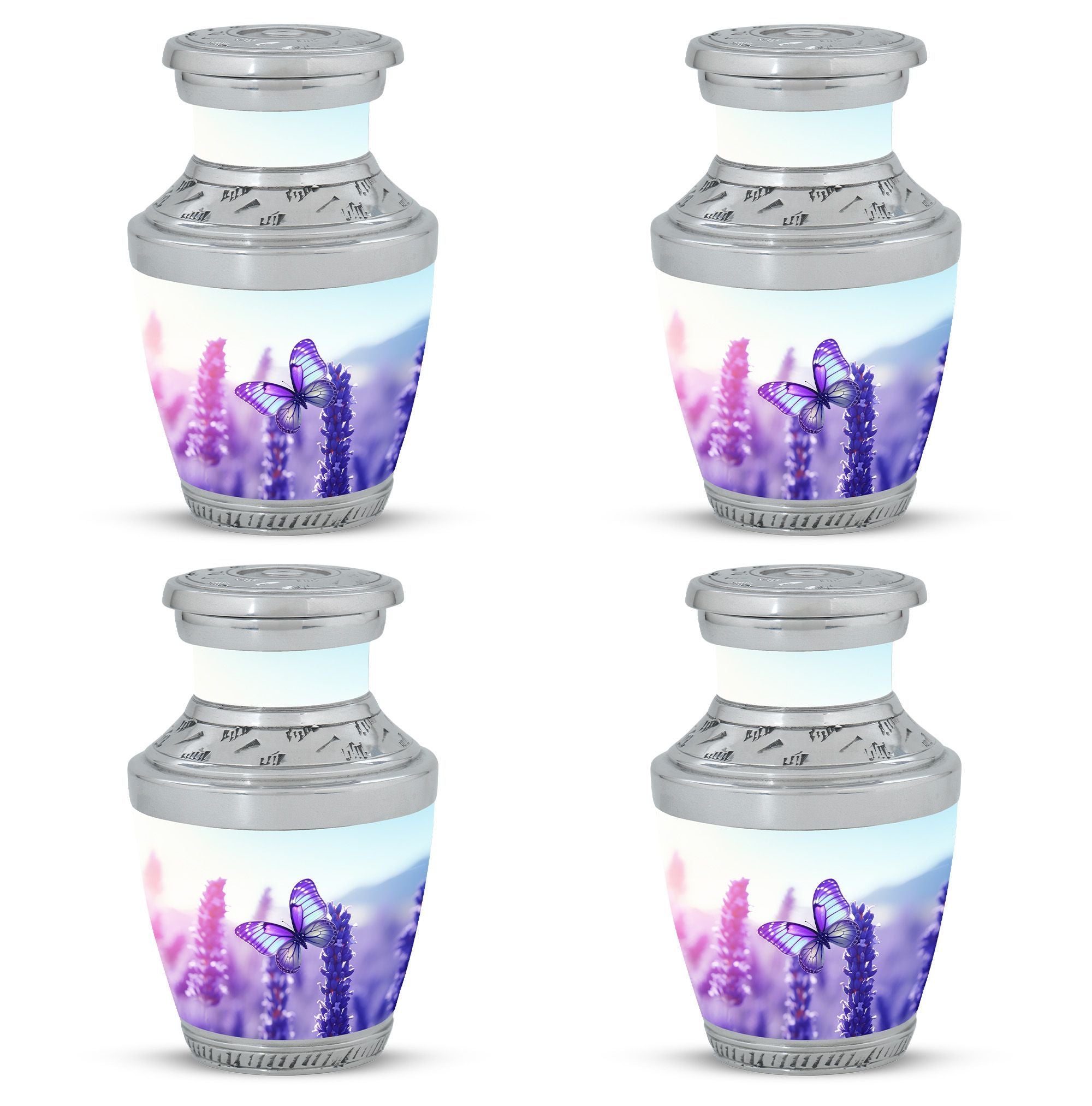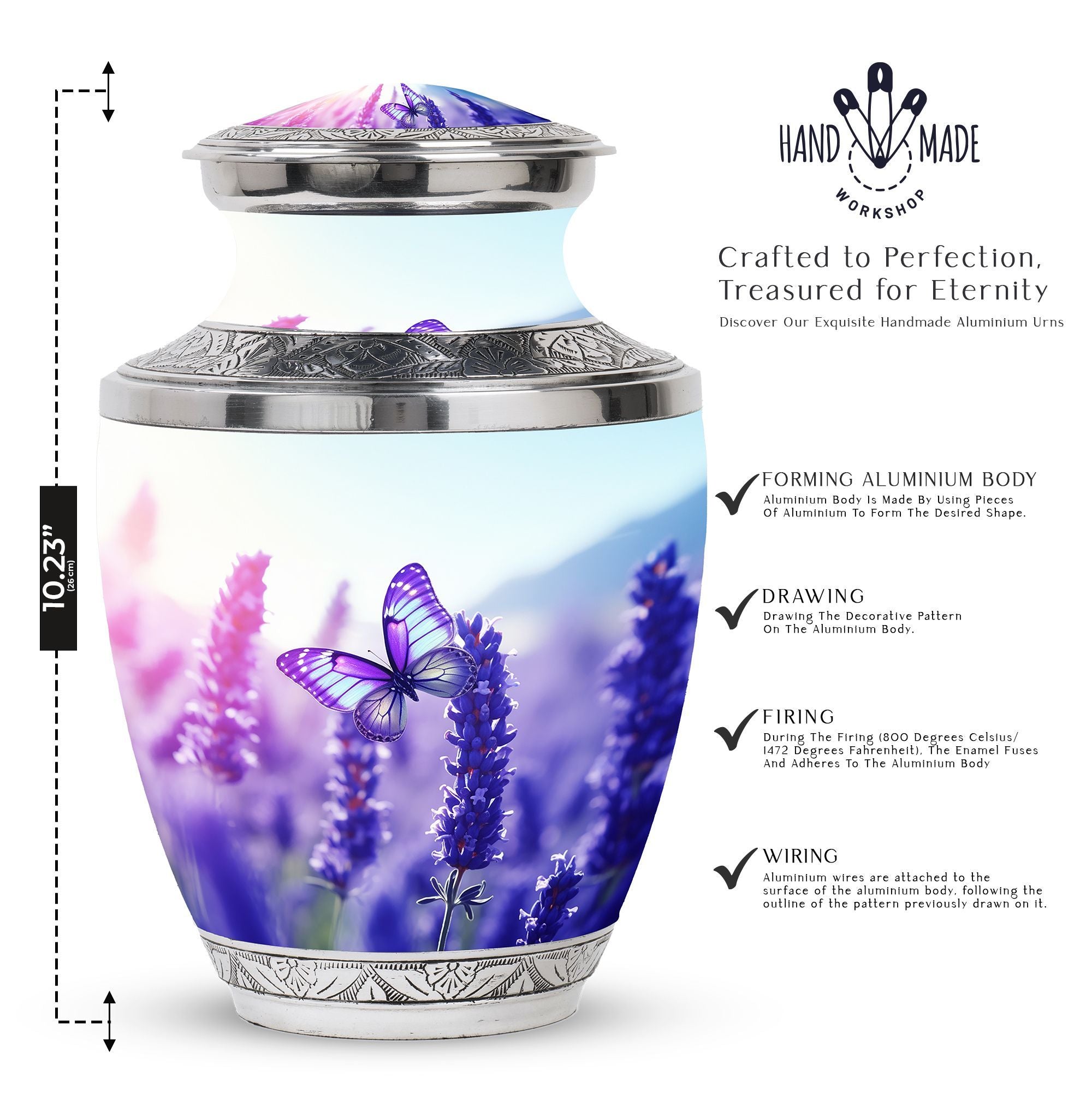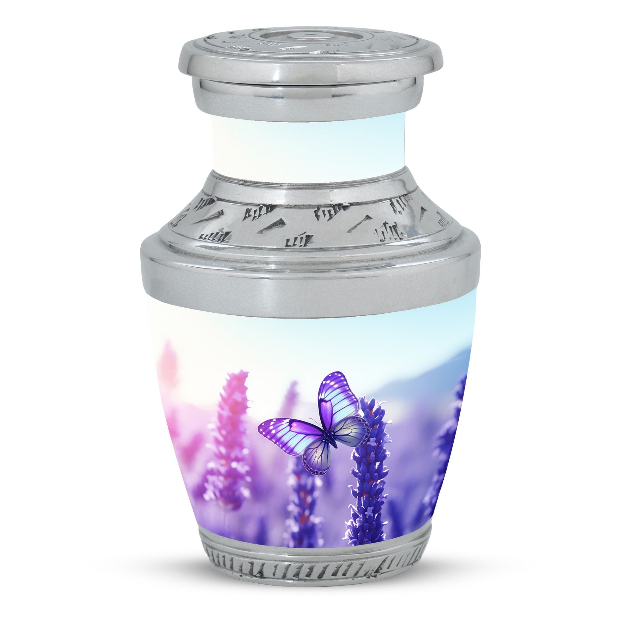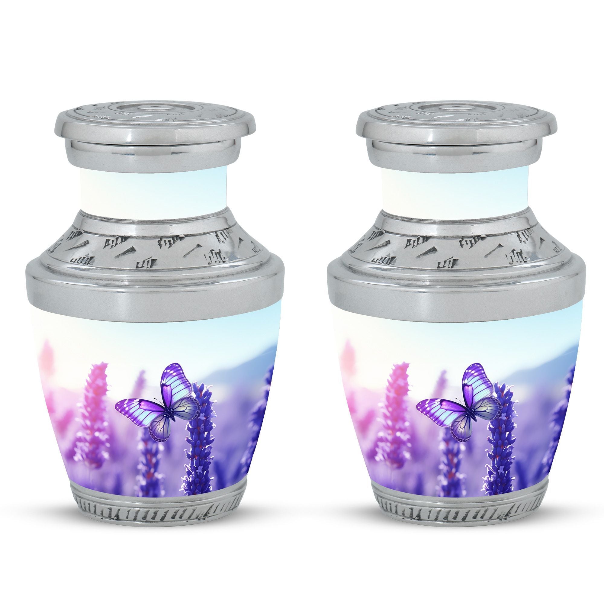Embrace the elegance of remembrance with our enchantingly beautiful 'Purple Butterflies Urns for Ashes'. These artistically crafted Funeral Urns were lovingly created with impressive aluminium to provide a resilient, yet stunningly sophisticated final resting place. Sized at a generous 3 inches, these captivating Cremation Urns weigh a solid 3.3 pounds, standing an imposing 10 inches in height. With a capacity of 200 cubic inches, they are fitting for a significant volume of a cherished loved one's ashes. A complementary velvet pouch ensures careful containment of the precious contents. For that extra special touch, personalization options are available; engraved names can sensitively adorn each urn. Suitably designed for the adult audience, these Large Urns superbly capture the sentiment of memorial.