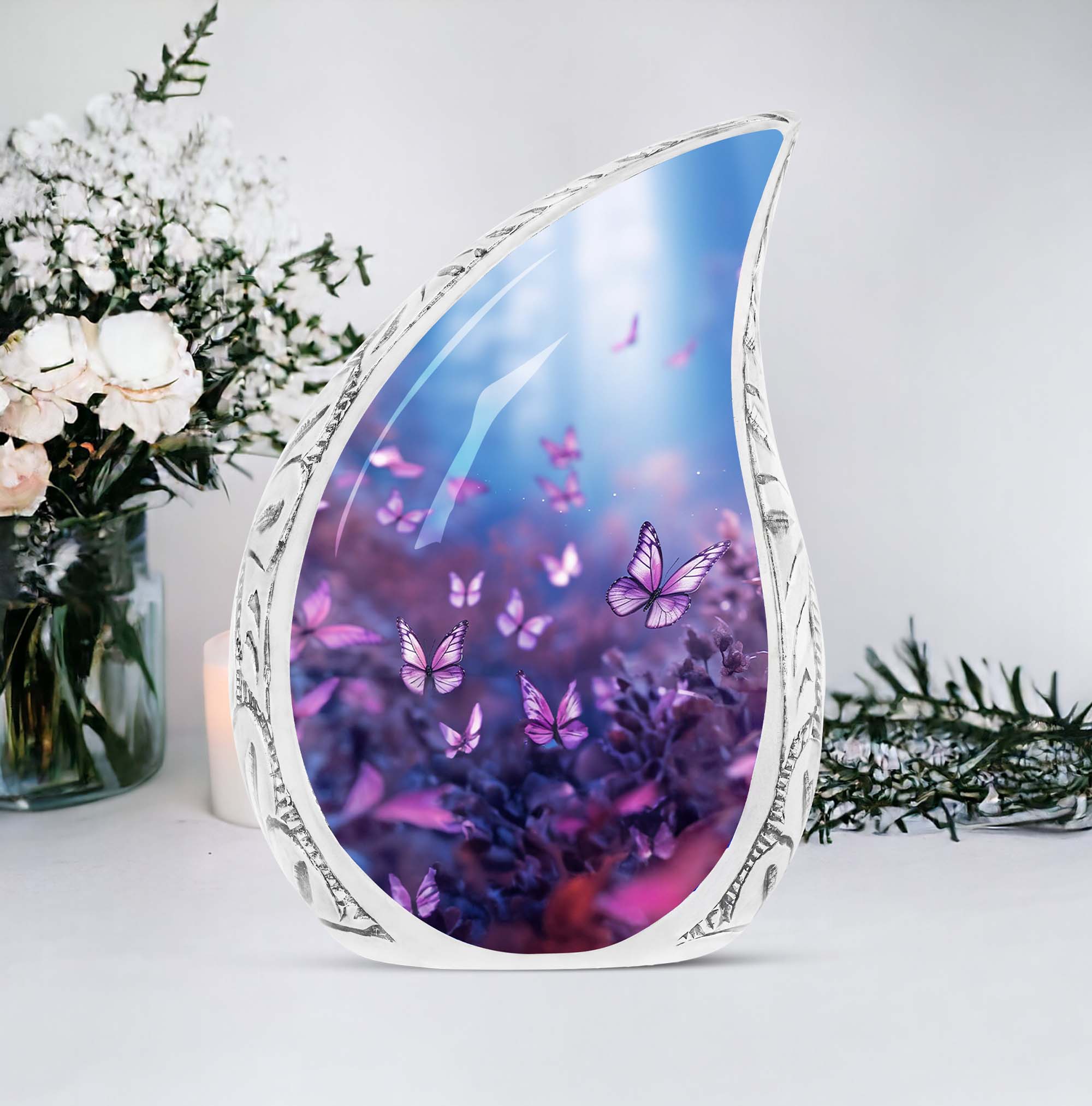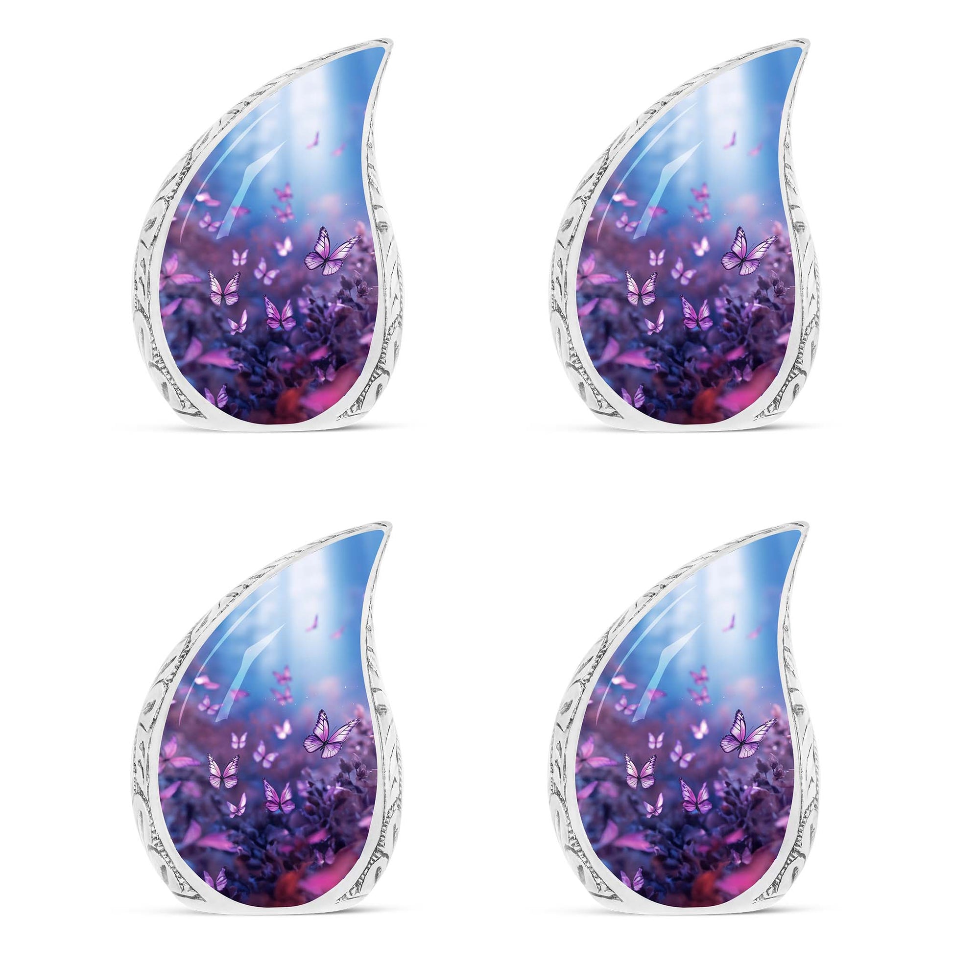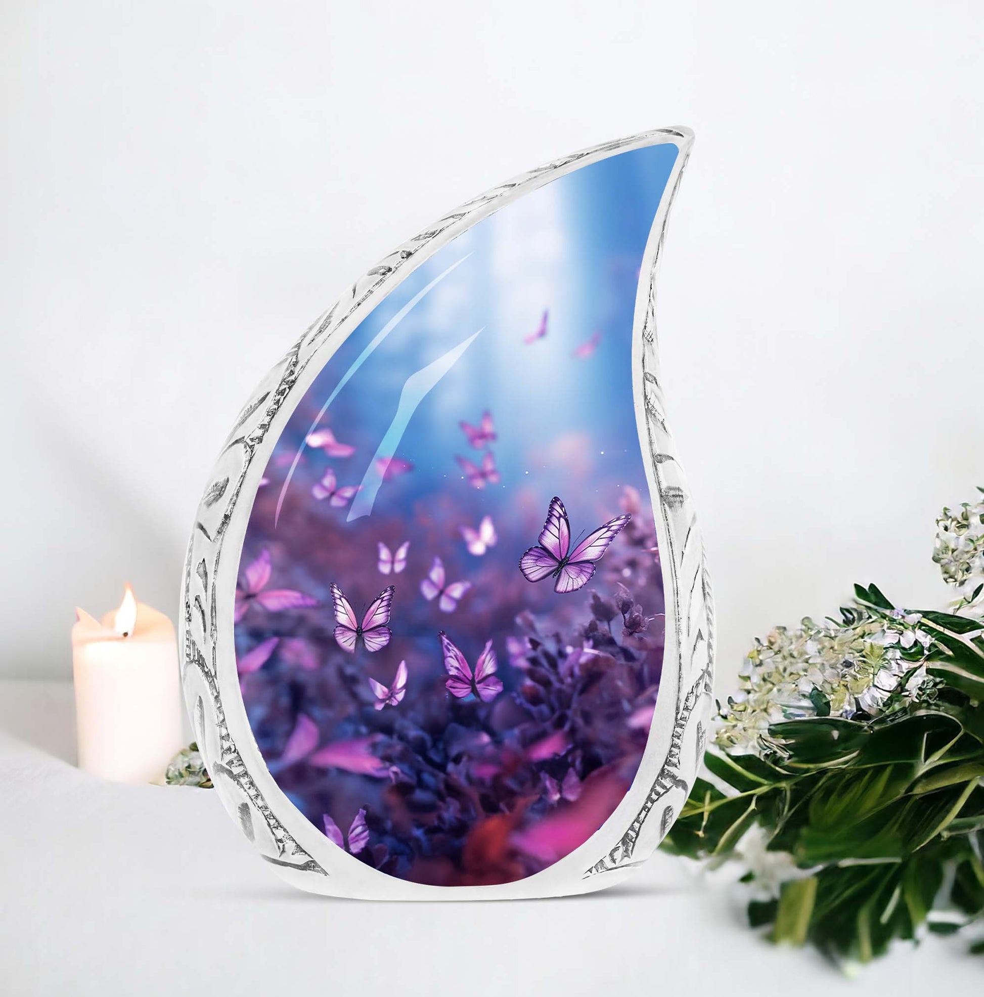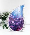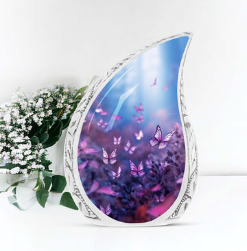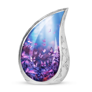 Elevate your memorial traditions with our Purple Butterflies Urn, an exquisite choice for preserving the remnants of your loved ones. Crafted from high-quality aluminium, this one-of-a-kind urn is notable for its robustness and enduring nature. Measuring 10 inches in height and three inches in size, it can securely accommodate up to 200 cubic inches of ashes. The urn's hefty weight of 3.3 pounds substantiates its resilience, ensuring it withstands time while keeping the precious remains intact. Our Purple Butterflies Urn carries a classic urn design and may feature an engraved name for personalization, redefining the concept of memorial keepsakes. This package includes a velvet pouch, providing a dignified containment for ashes. The phrases 'Large Urns', 'Custom Cremation Urn', and 'Unique Urns for Ashes' describe this product best; aligning with your search for a memorial urn. Choose this Large Urn today to establish an everlasting tribute.
