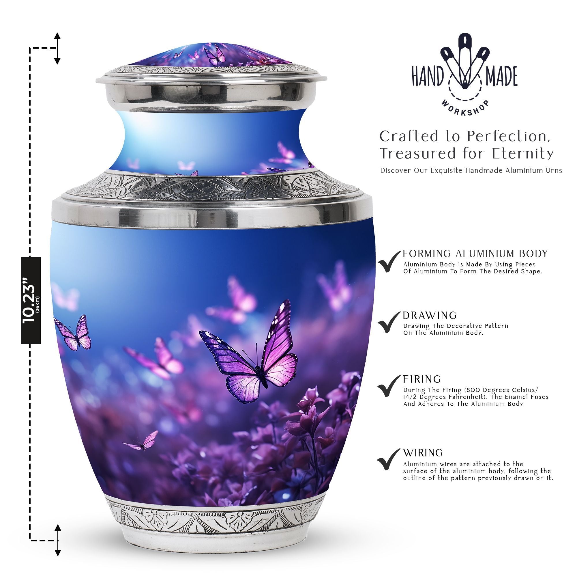 Crafted from durable aluminium, this blue decorative urn features a secure screw-top lid and intricate purple and blue butterfly details. Ideal as a butterfly urn for human ashes, medium urn, or unique urns for ashes, it combines beauty and practicality for a meaningful memorial.