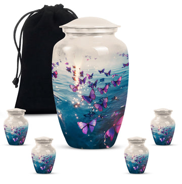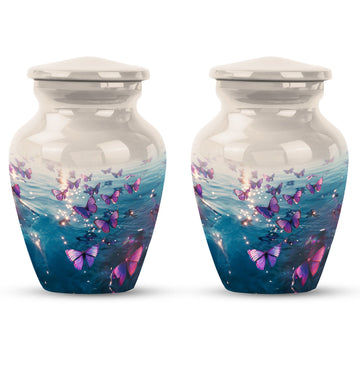 At 10 inches tall, our Purple Butterfly Urn serves as an elegant and cherished way to remember our loved ones, providing an enduring memorabilia that boasts a capacity of 200 cubic inches, perfect for adult human ashes. This funeral burial urn's aluminium build ensures it's a robust and long-lasting memorial. Its 3.3 pounds weight gives it a comforting heft, symbolising the solidity of our affection for those no longer with us. Our cremation urn comes complete with a velvet pouch, perfect for securely containing ashes until deposited into the urn. For a more personal touch, we provide the option to etch your urn with engraved names, adding a layer of homage that transcends time. Our Large Urns are not just storage for ashes but serve as beautiful memorabilia. Delight in our Purple Butterfly Urn, where memories of your loved ones flutter brightly just like the butterfly theme it portrays. Note: The product does not come with a design. The urn's design showcases the elegance of simplicity, focusing on the functionality and feelings it's meant to capture.