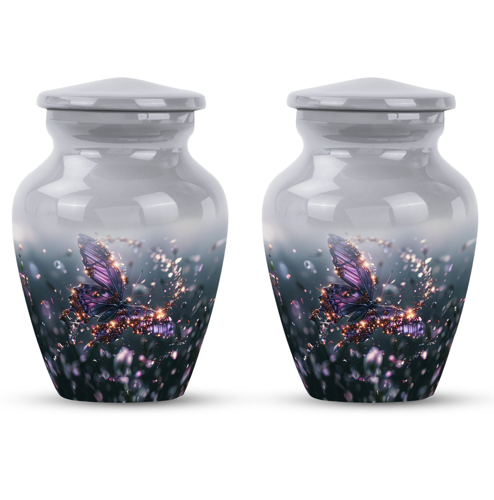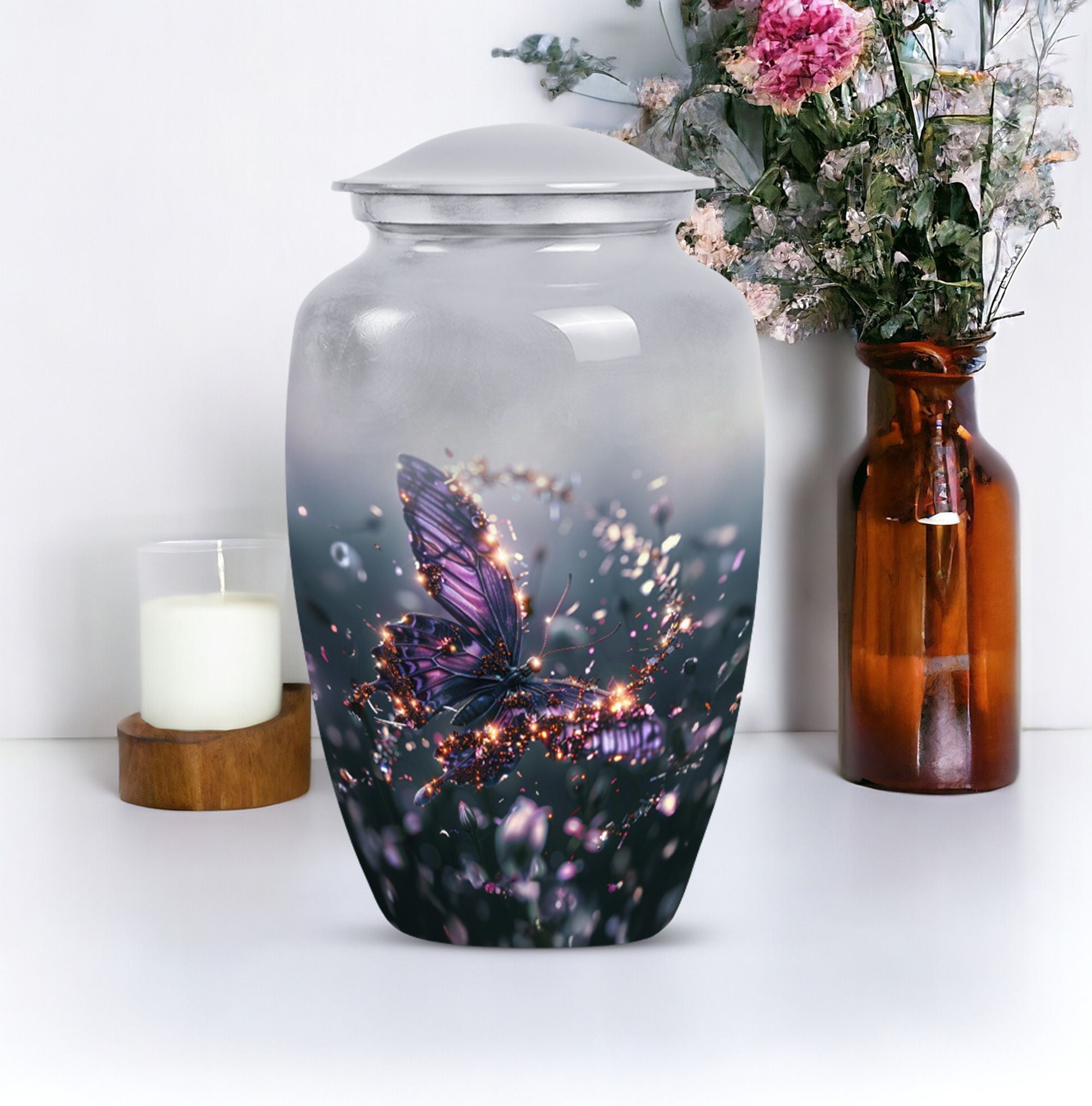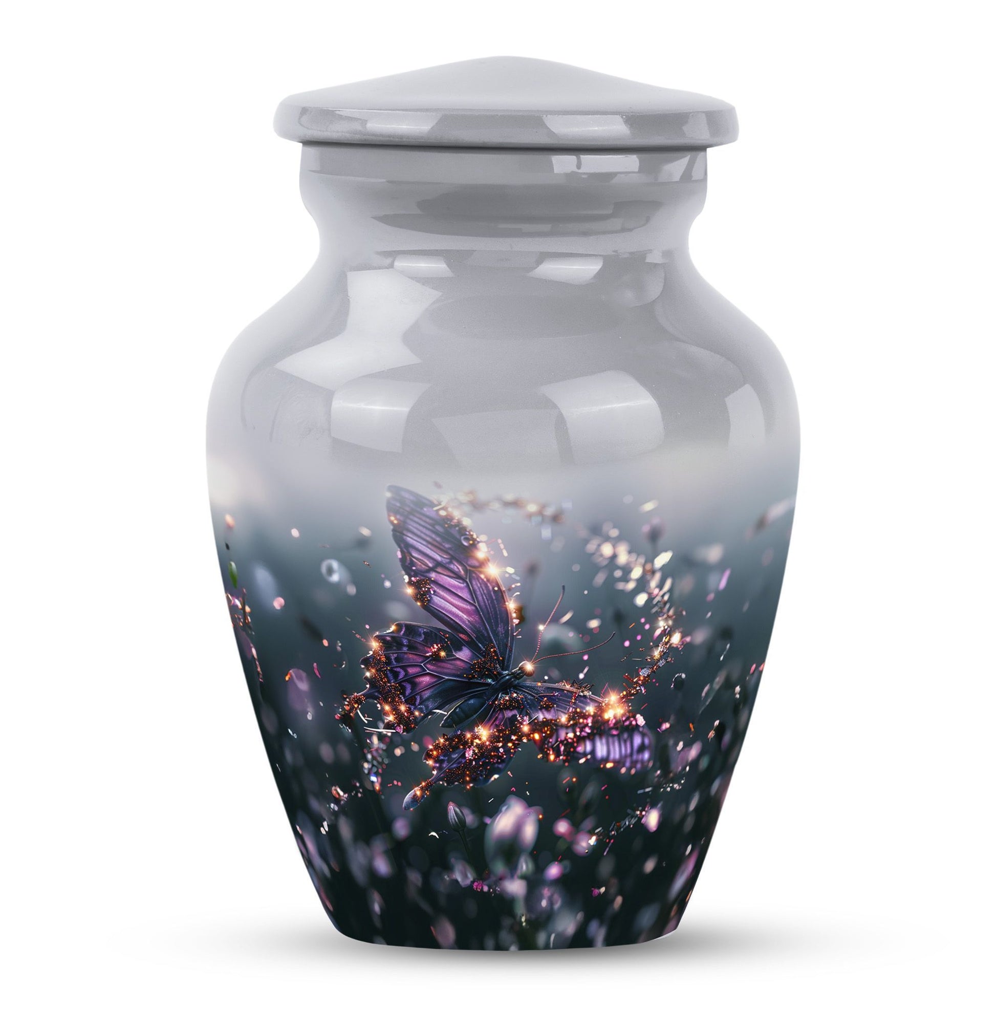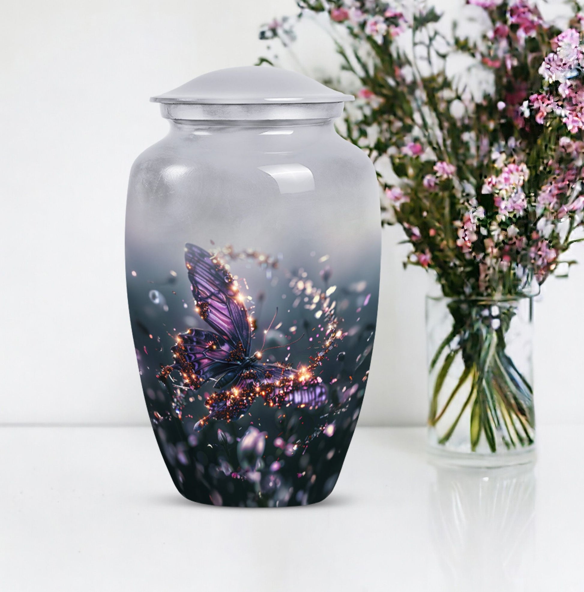 Crafted from premium aluminium, this urn blends artistry with durability. Its vivid purple butterfly design set against a soft, elegant background captures both peace and beauty. As one of our butterfly urns for human ashes, it offers security with its screw-top lid while remaining a timeless memorial piece. Perfectly sized as an adult size cremation urn, it ensures dignity and safety for your loved one’s ashes.