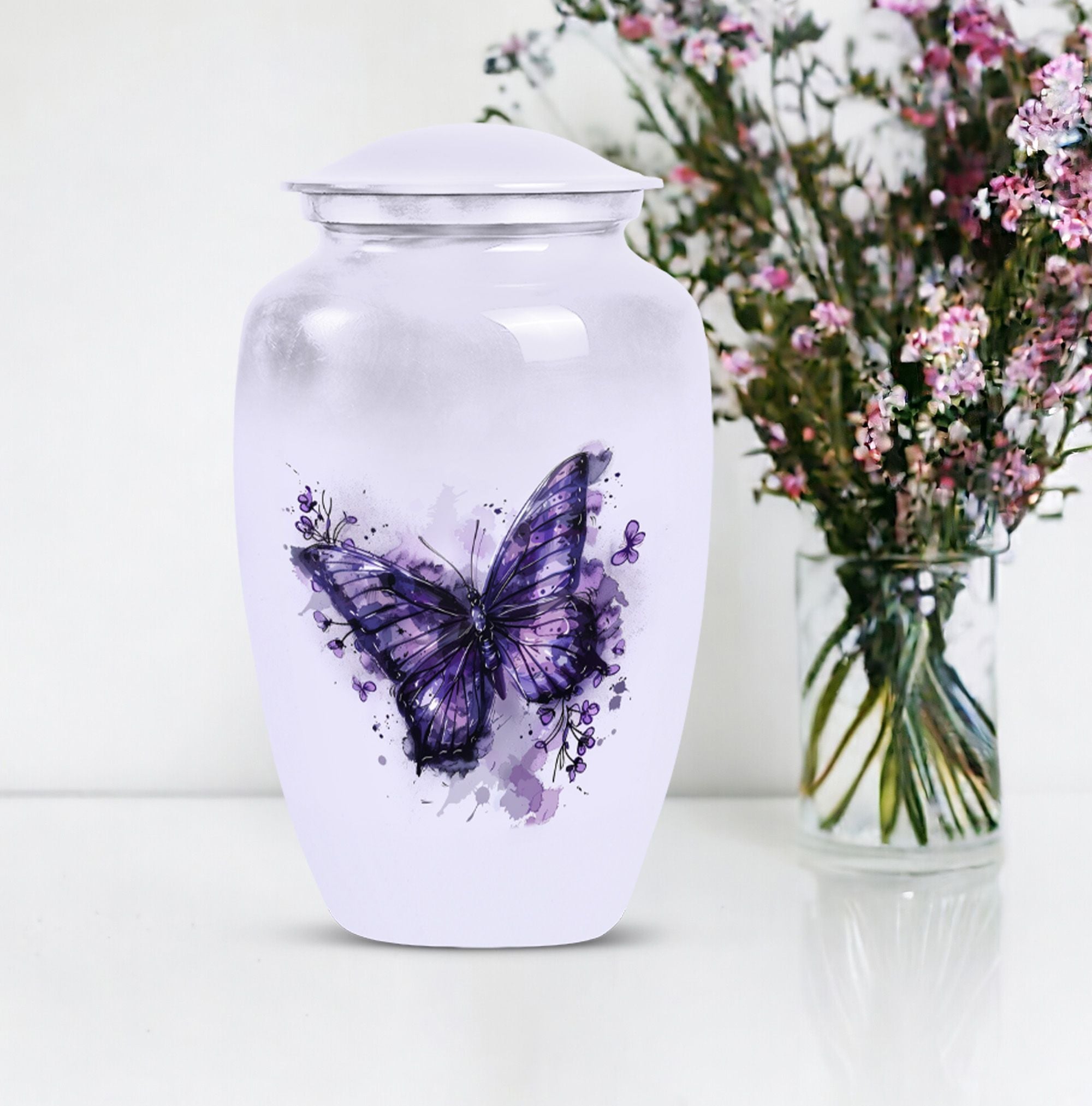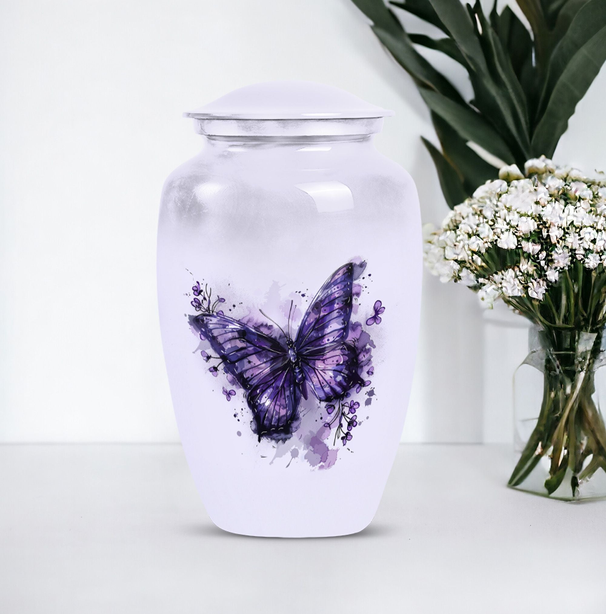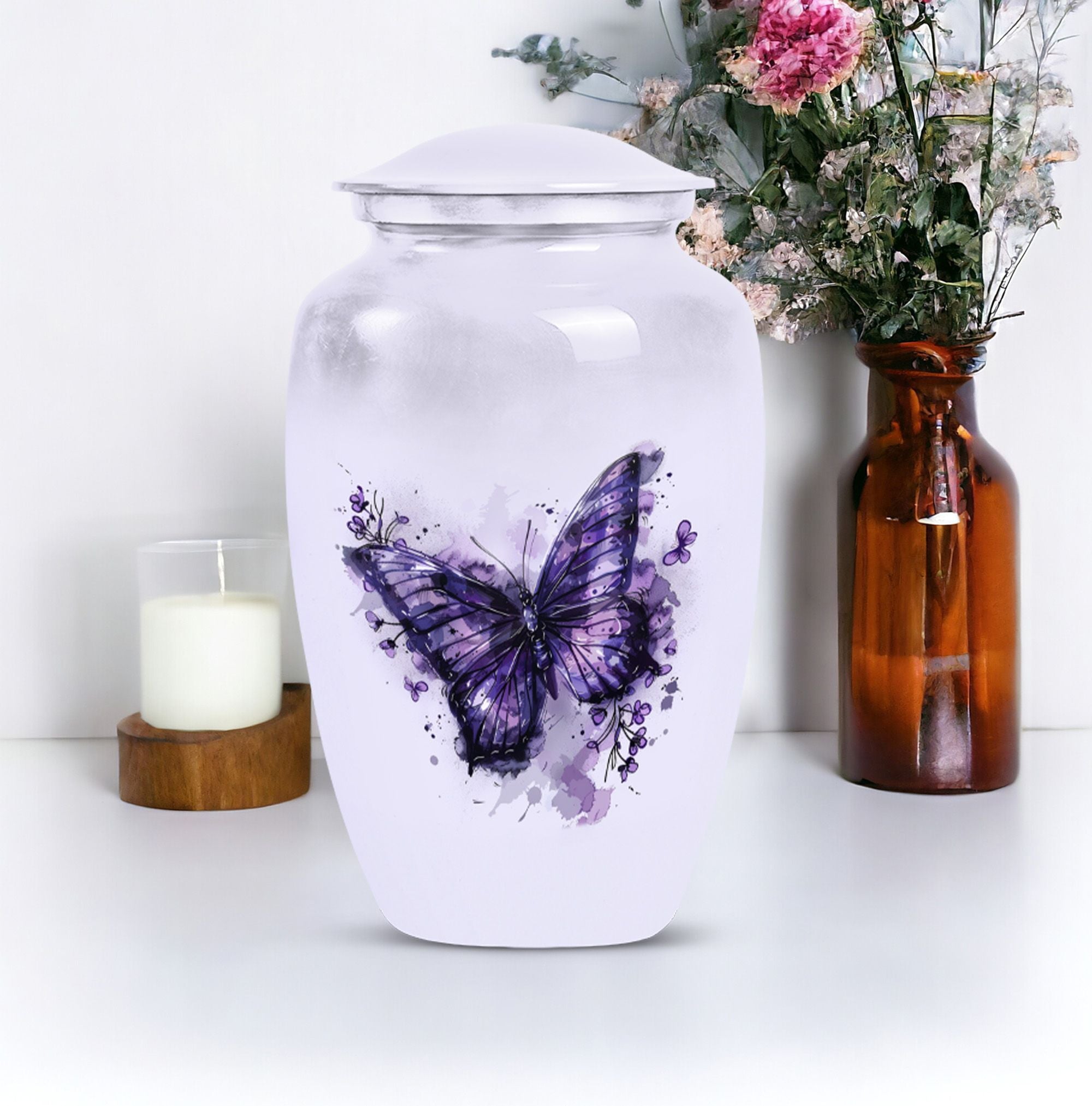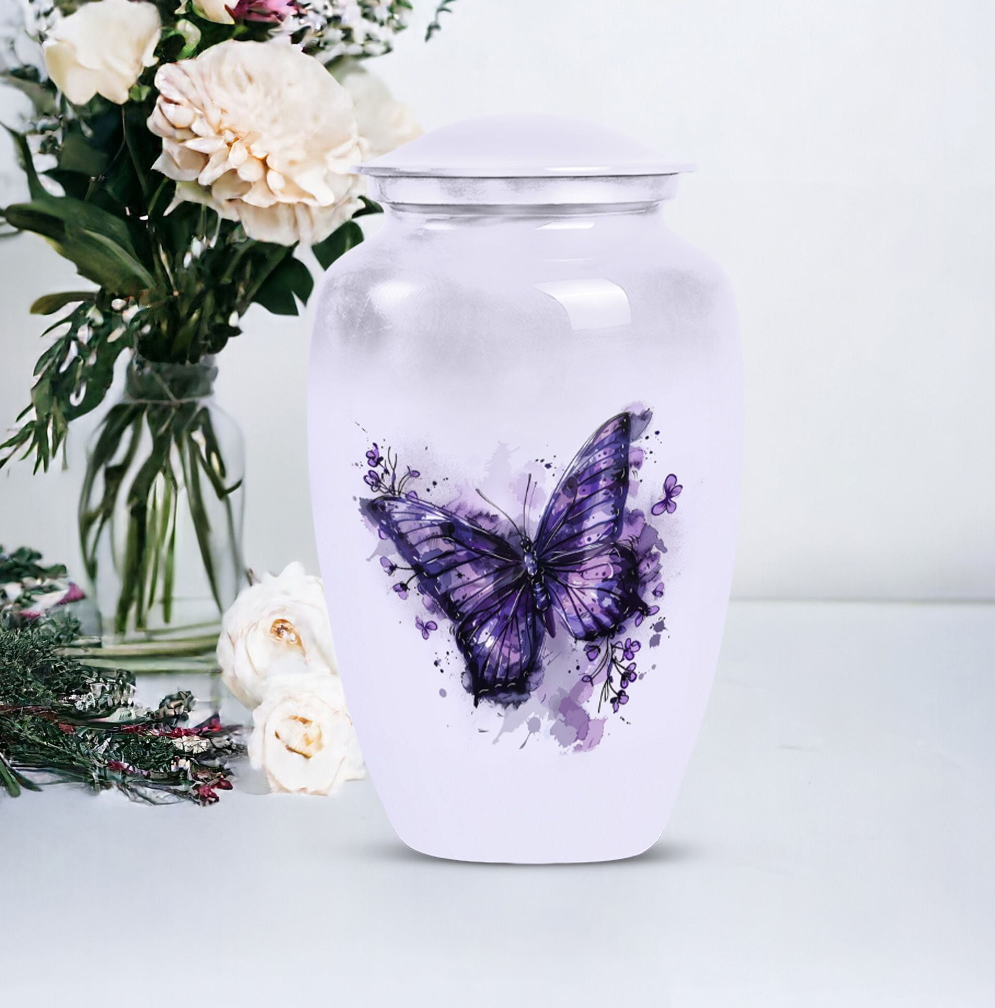 Honor the memory of a loved one with this Purple Butterfly White Memorial Urn, combining serenity and elegance. Its delicate purple butterfly design on a pristine white base offers a peaceful, dignified tribute.
