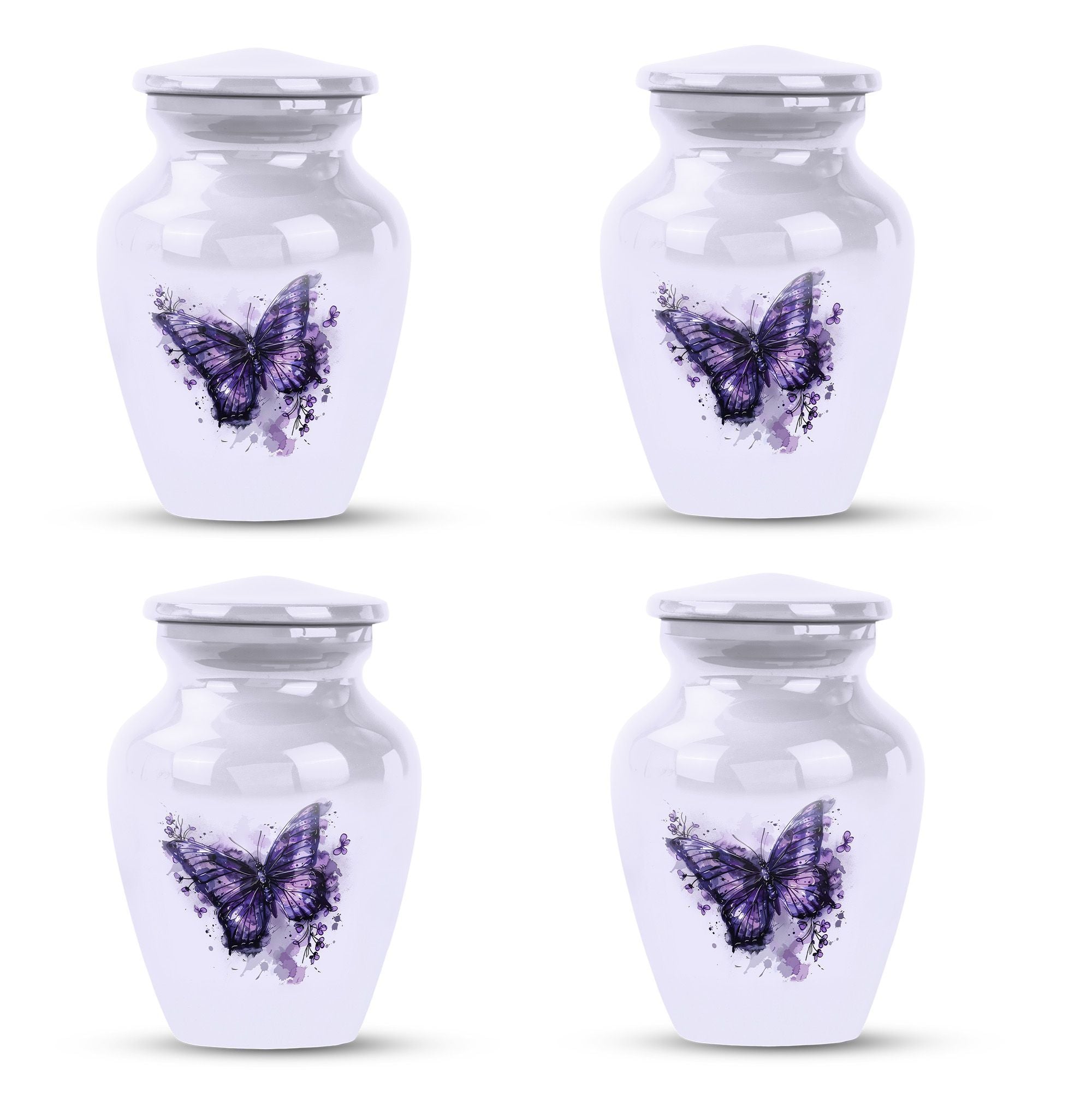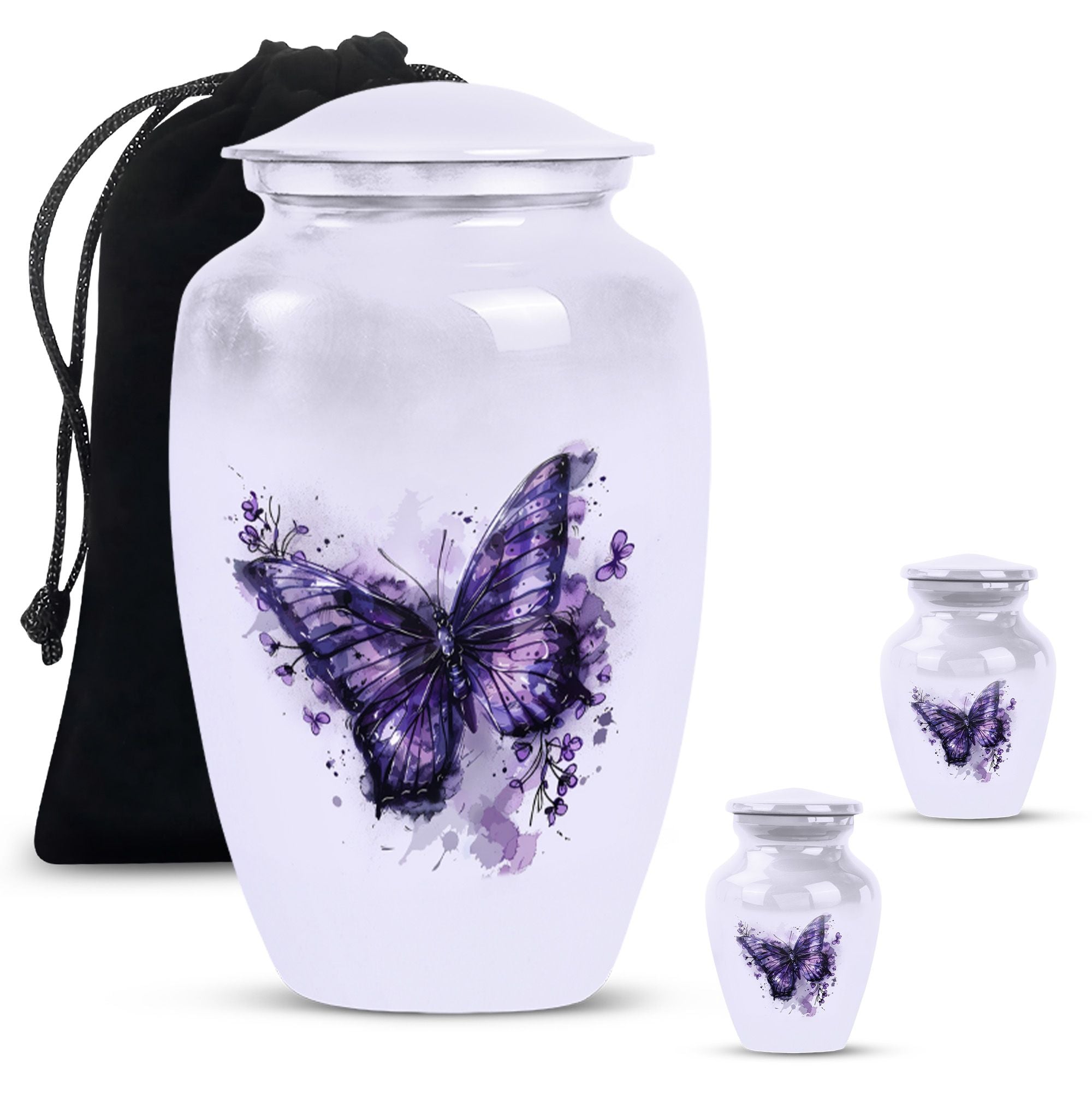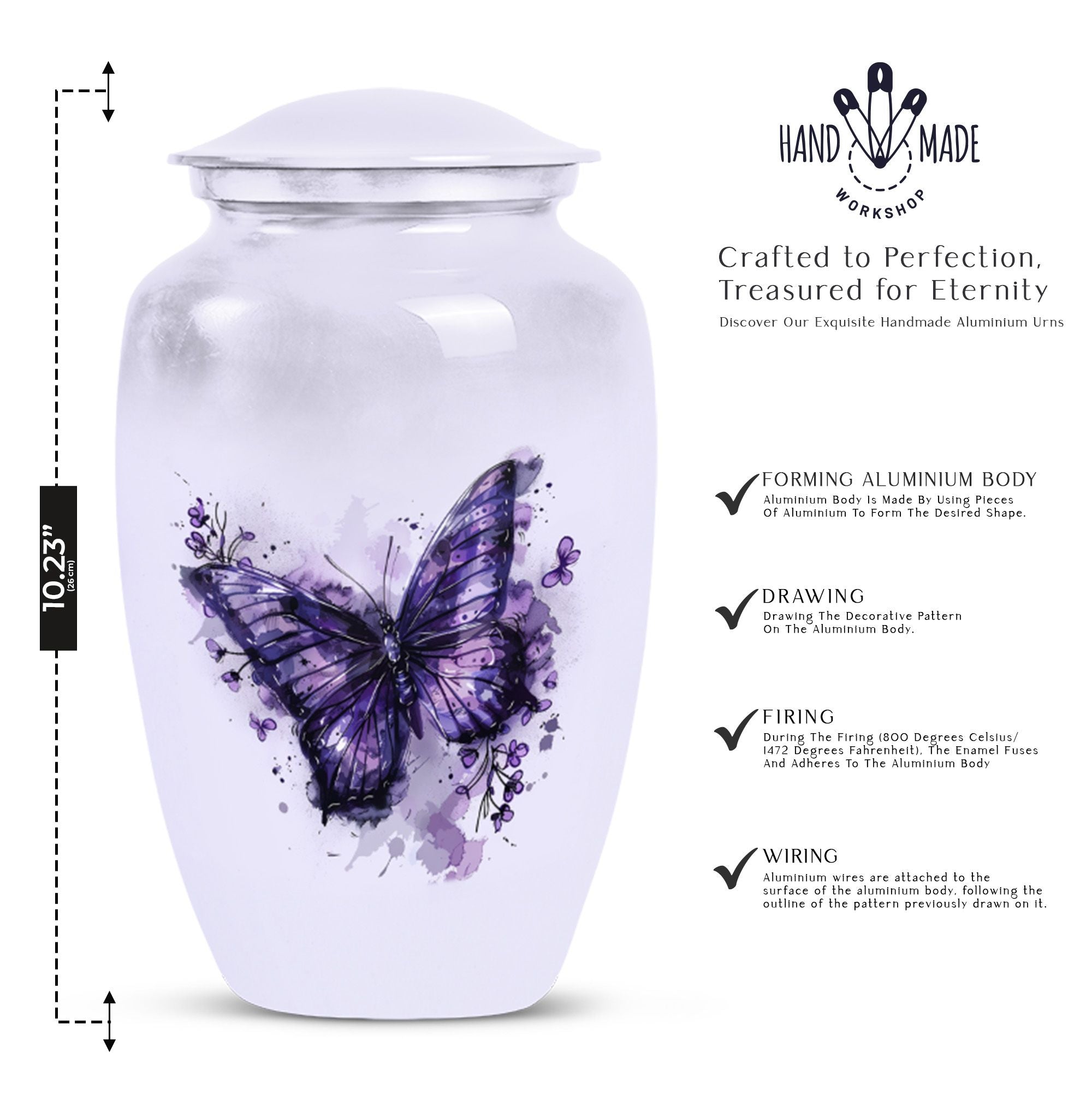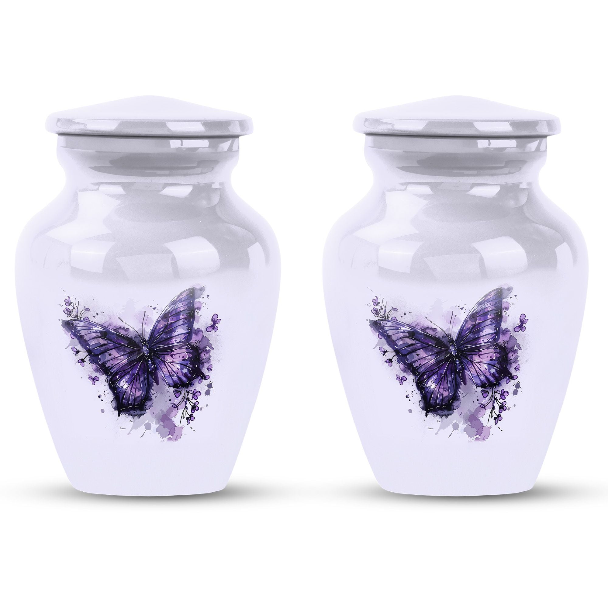 Honor the memory of a loved one with this Purple Butterfly White Memorial Urn, combining serenity and elegance. Its delicate purple butterfly design on a pristine white base offers a peaceful, dignified tribute.