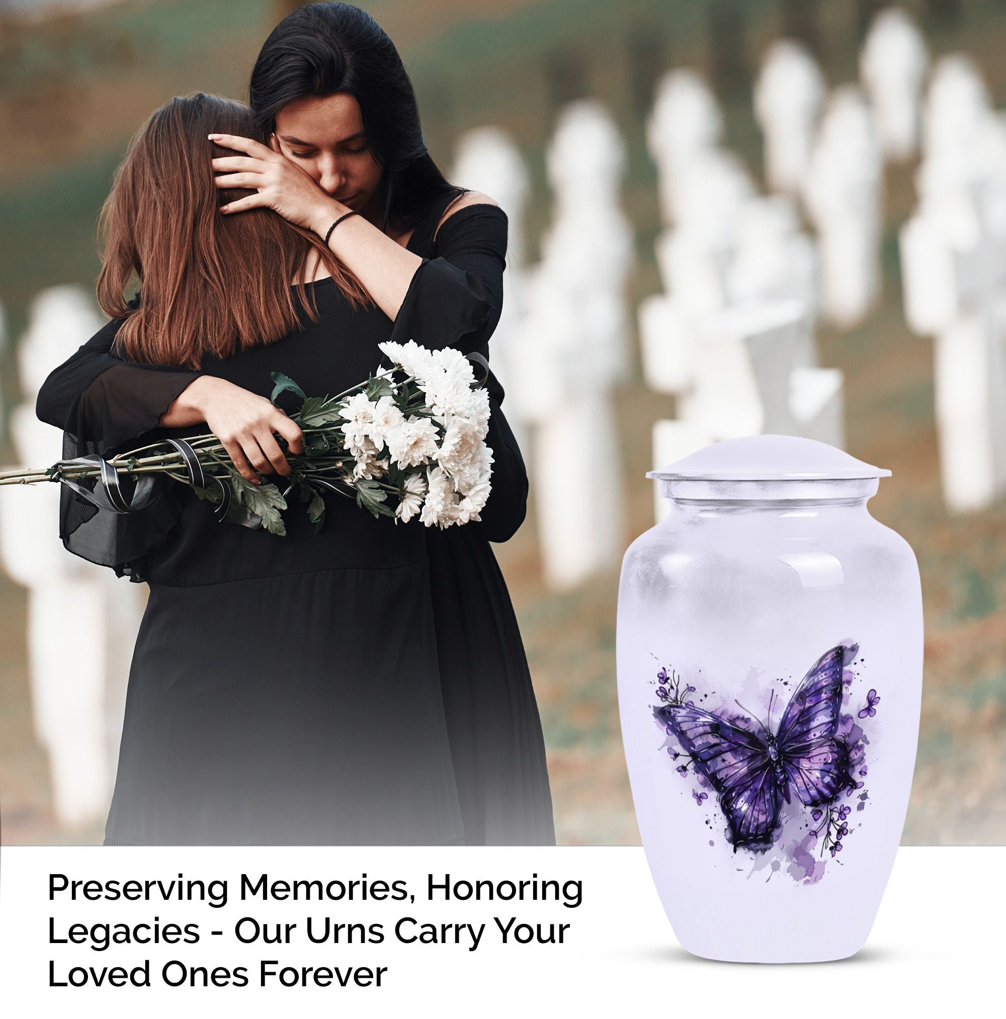 Crafted from durable aluminum, this purple butterfly urn ensures lasting preservation. The secure screw lid keeps ashes safely stored, making it ideal as large cremation urns, cremation urns for women, or an urn for ashes for men.