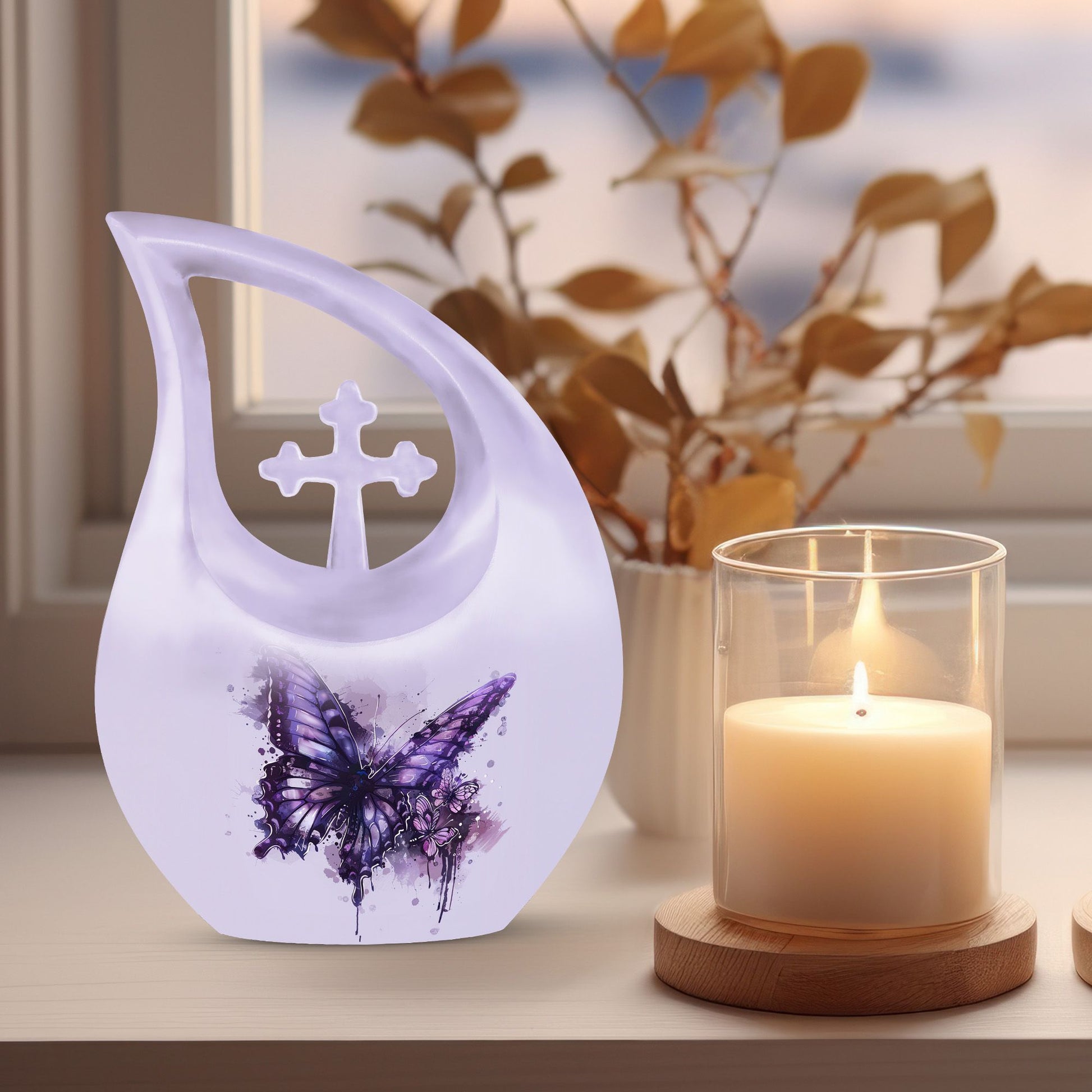 The Purple Butterfly Memorial Urn – Cremation Urn for Ashes for Woman is a beautifully handcrafted urn designed to honor a loved woman’s memory. Featuring graceful purple butterflies on a matching background, this urn symbolizes transformation, eternal love, and serenity. It serves as a dignified cremation urn for ashes, perfect for memorial services or home display.