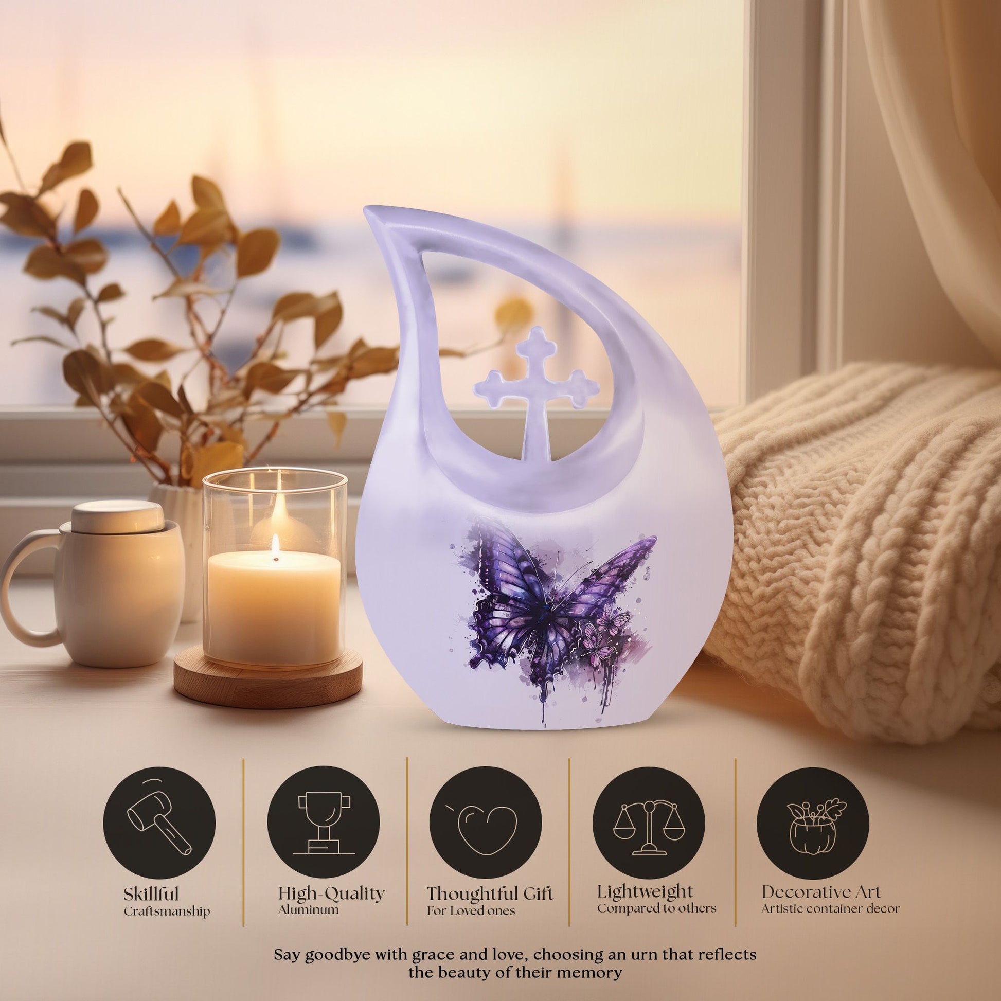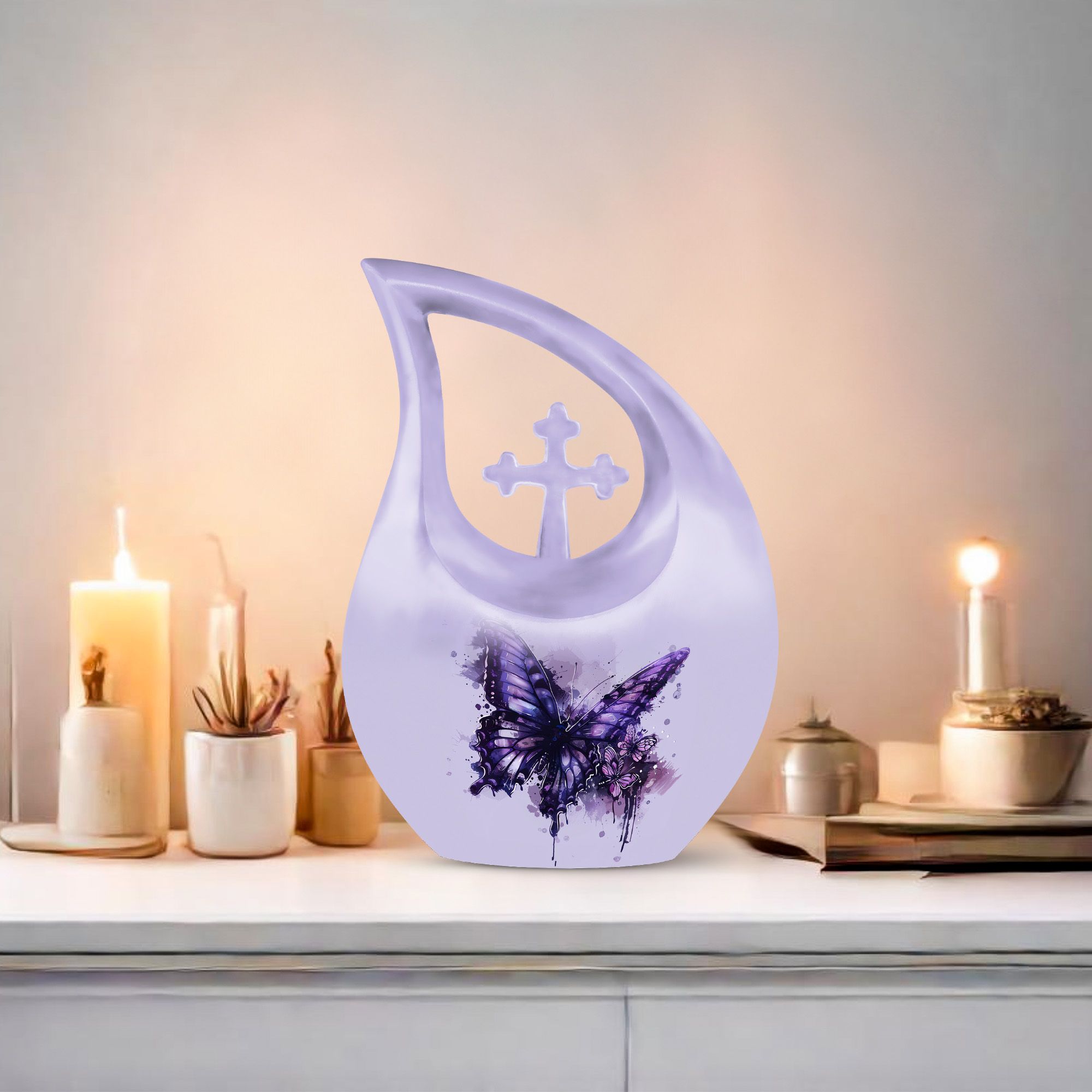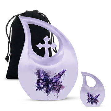 This purple butterfly cremation urn is more than a resting place—it is a heartfelt symbol of love, remembrance, and serenity. Its graceful design creates a timeless and comforting tribute to honor a cherished woman.