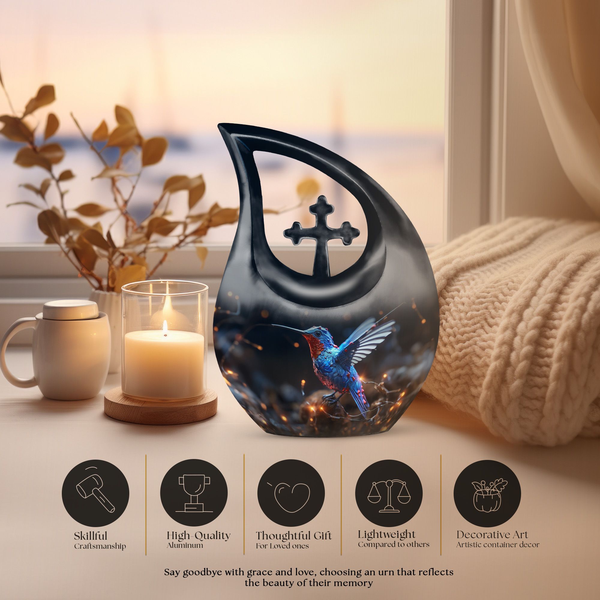 Expertly crafted from durable aluminium, this urn features elegant purple hummingbird artwork symbolizing love, hope, and the soul’s eternal journey. Its refined finish and balanced form make it a beautiful choice among large cremation urns for home display or burial. Designed as a large urn for human ashes, it includes a secure screw-top lid to protect remains with care. This memorial works seamlessly as a large urn for ashes adult male or a large urn for ashes for women, fitting naturally within urns for ashes adult male large and large urns for human ashes adult female selections.