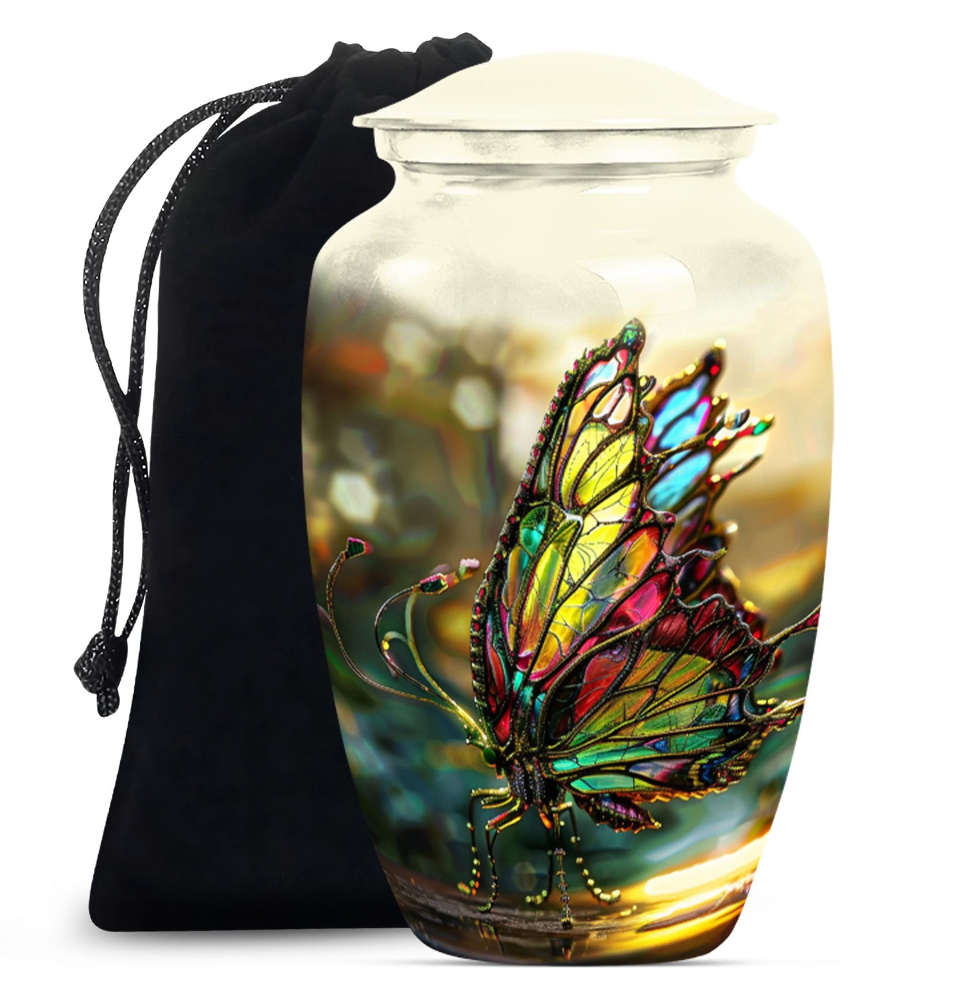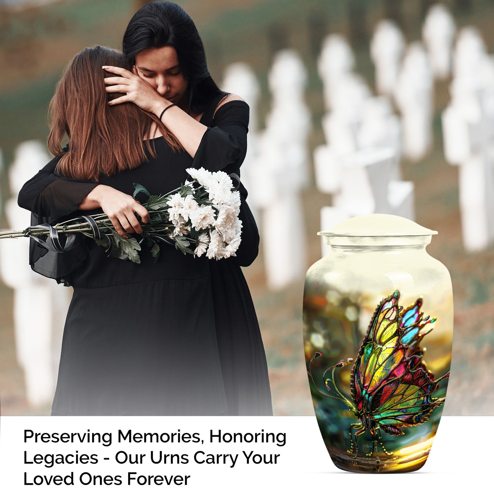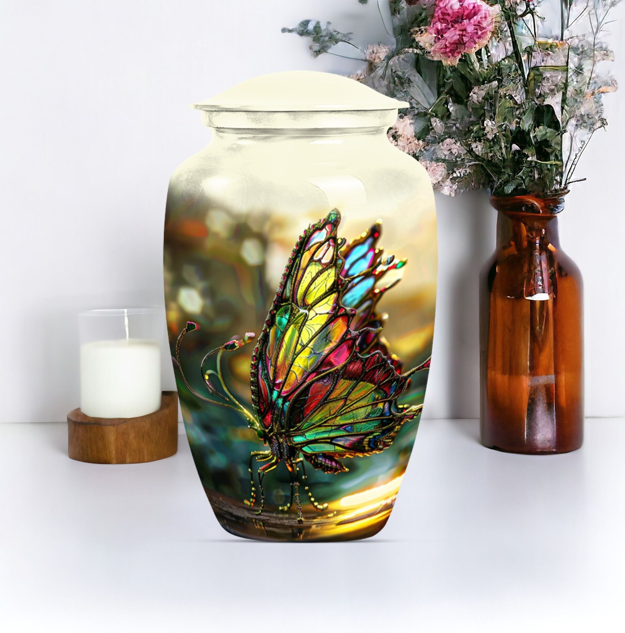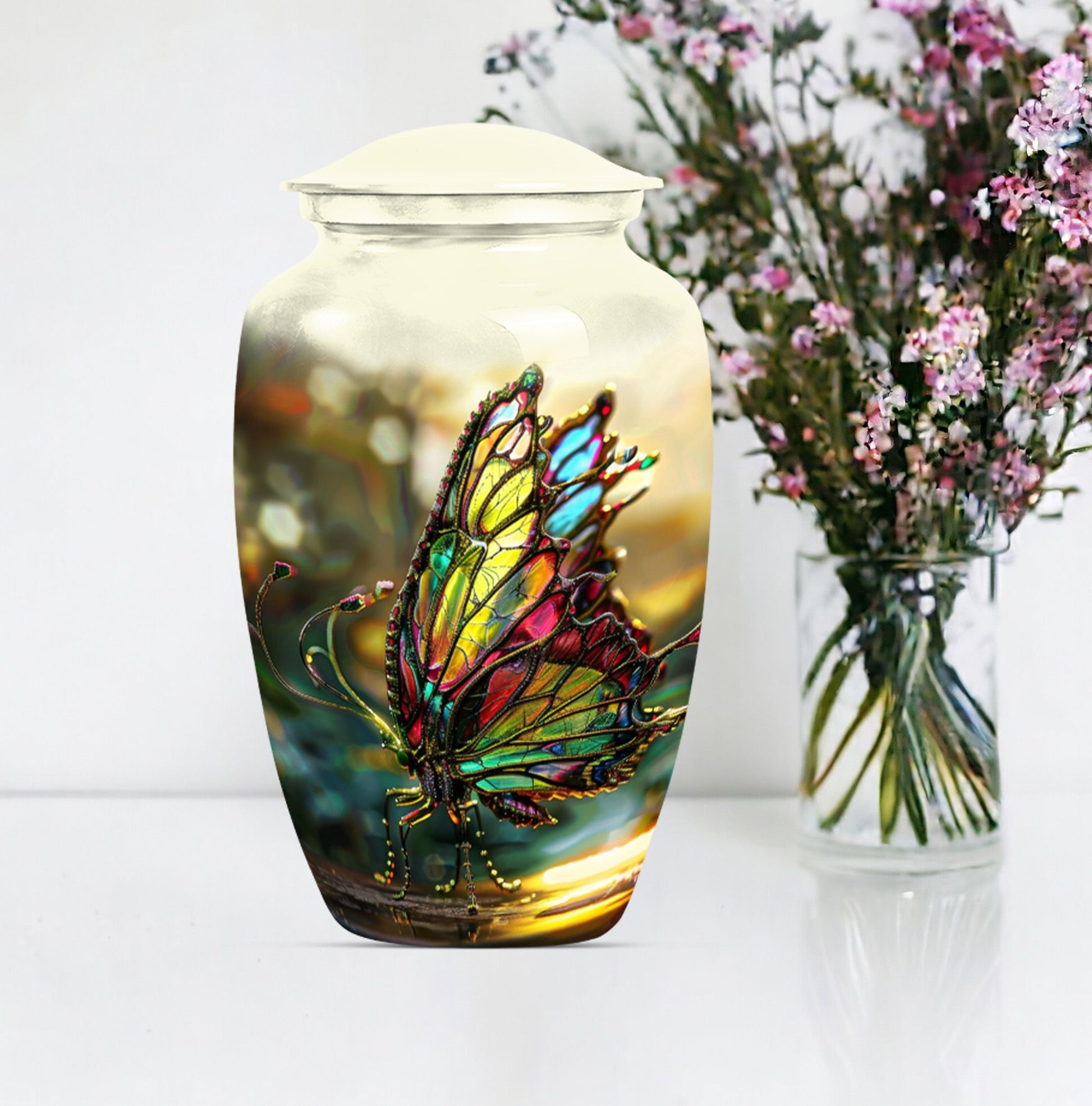 Pay respect to your dearly beloved with this elegant 'Purple Meadow' butterfly urn. The 10-inch large urn is fashioned from robust aluminium, a testament to its durability. Your cherished one’s memory is preserved within this cremation urn, which safely houses up to 200 cubic inches of ashes. This refined memorial urn for human ashes is easy to handle, weighing just 3.3 pounds and includes a velvet pouch for secure containment of ashes. Beyond both its practicality and aesthetic appeal, this urn provides a personalized touch. You can engrave names onto this classic urn to make it uniquely your own. Browse for 'funeral urns for ashes adult male' or 'cremation urn' to find us. This elegant urn doesn’t just hold ashes; it maintains your loved one’s spirit in an emblem of perpetual remembrance.