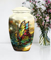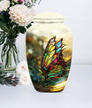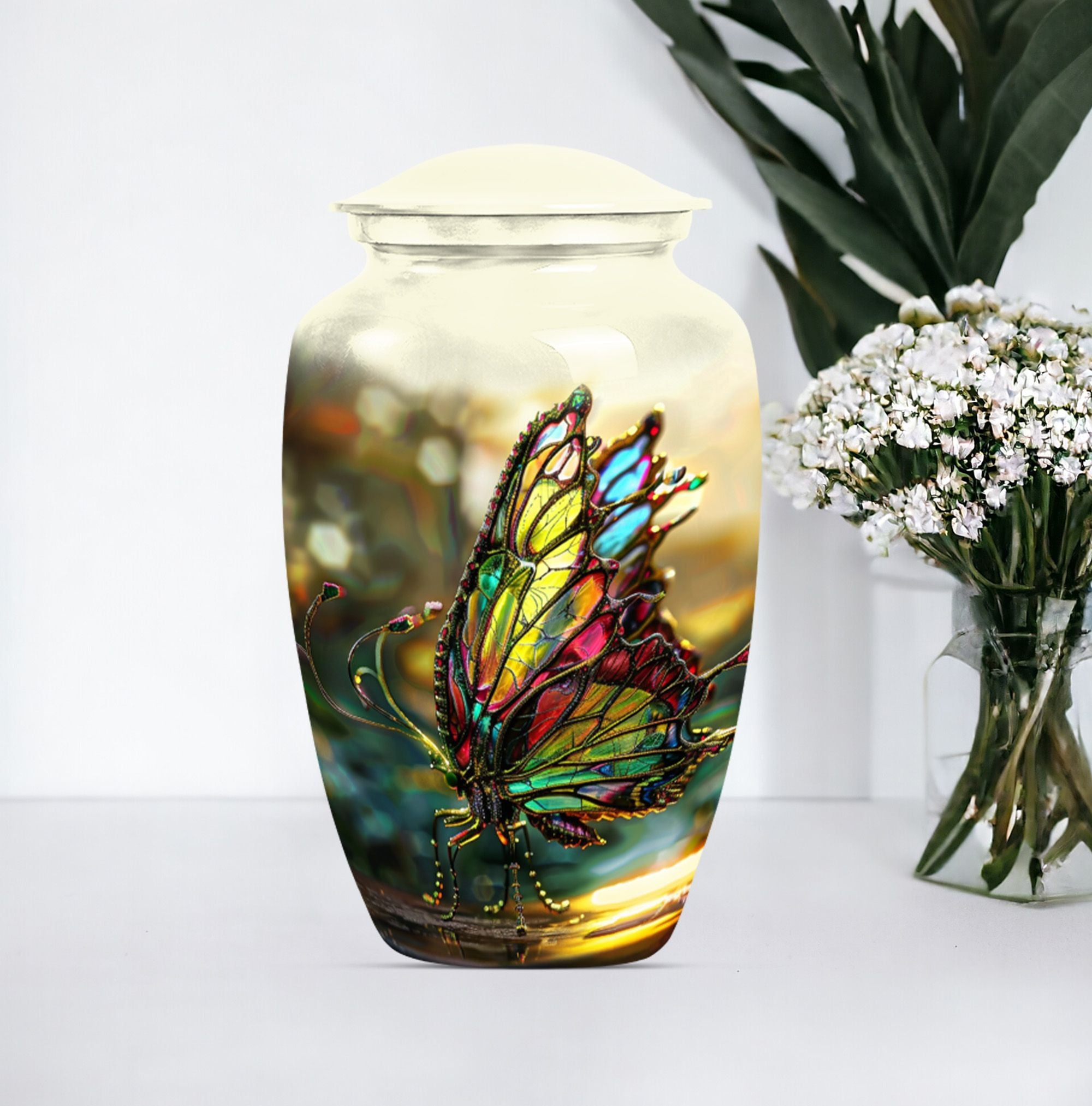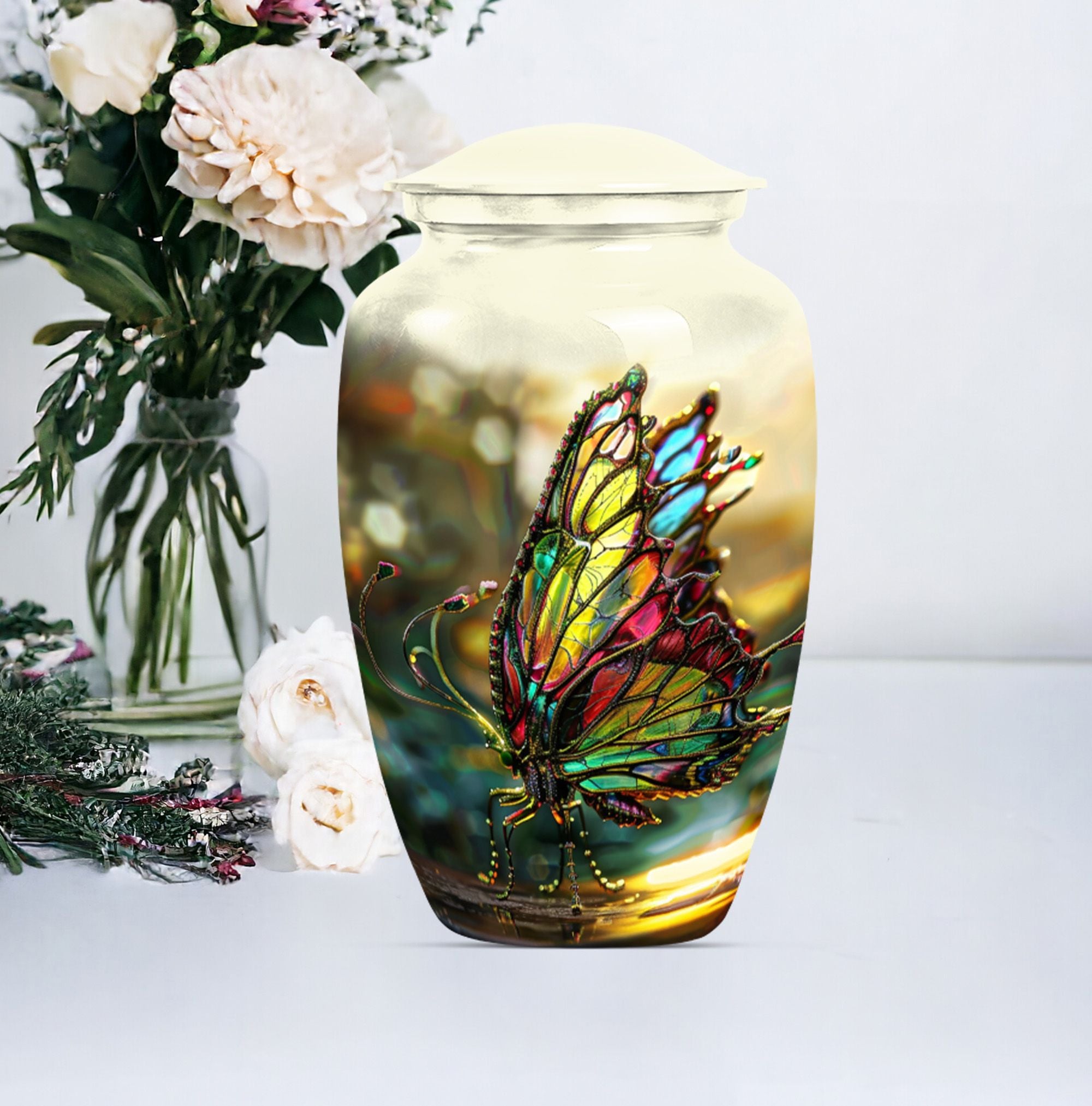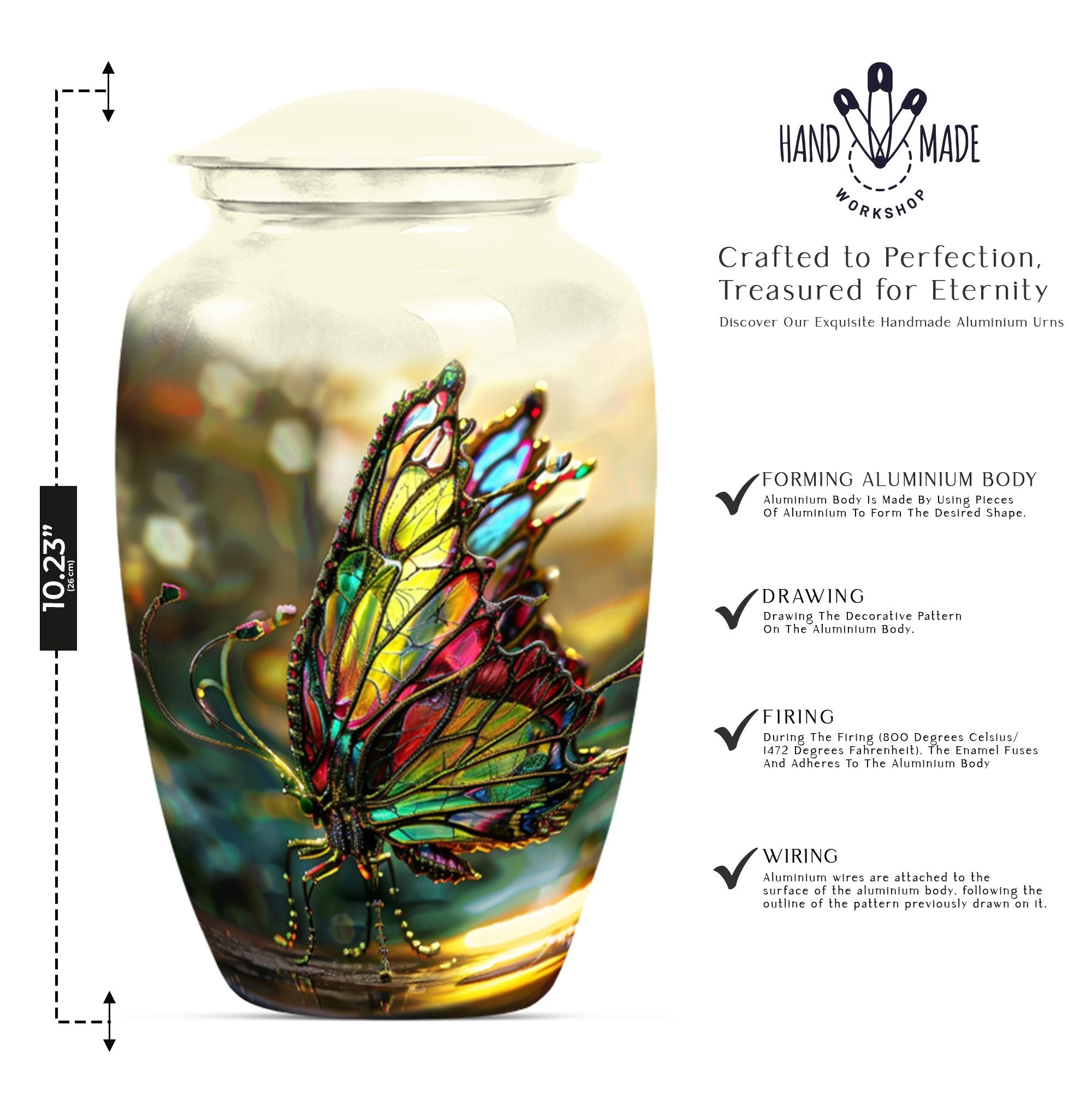 Pay respect to your dearly beloved with this elegant 'Purple Meadow' butterfly urn. The 10-inch large urn is fashioned from robust aluminium, a testament to its durability. Your cherished one’s memory is preserved within this cremation urn, which safely houses up to 200 cubic inches of ashes. This refined memorial urn for human ashes is easy to handle, weighing just 3.3 pounds and includes a velvet pouch for secure containment of ashes. Beyond both its practicality and aesthetic appeal, this urn provides a personalized touch. You can engrave names onto this classic urn to make it uniquely your own. Browse for 'funeral urns for ashes adult male' or 'cremation urn' to find us. This elegant urn doesn’t just hold ashes; it maintains your loved one’s spirit in an emblem of perpetual remembrance.