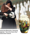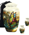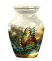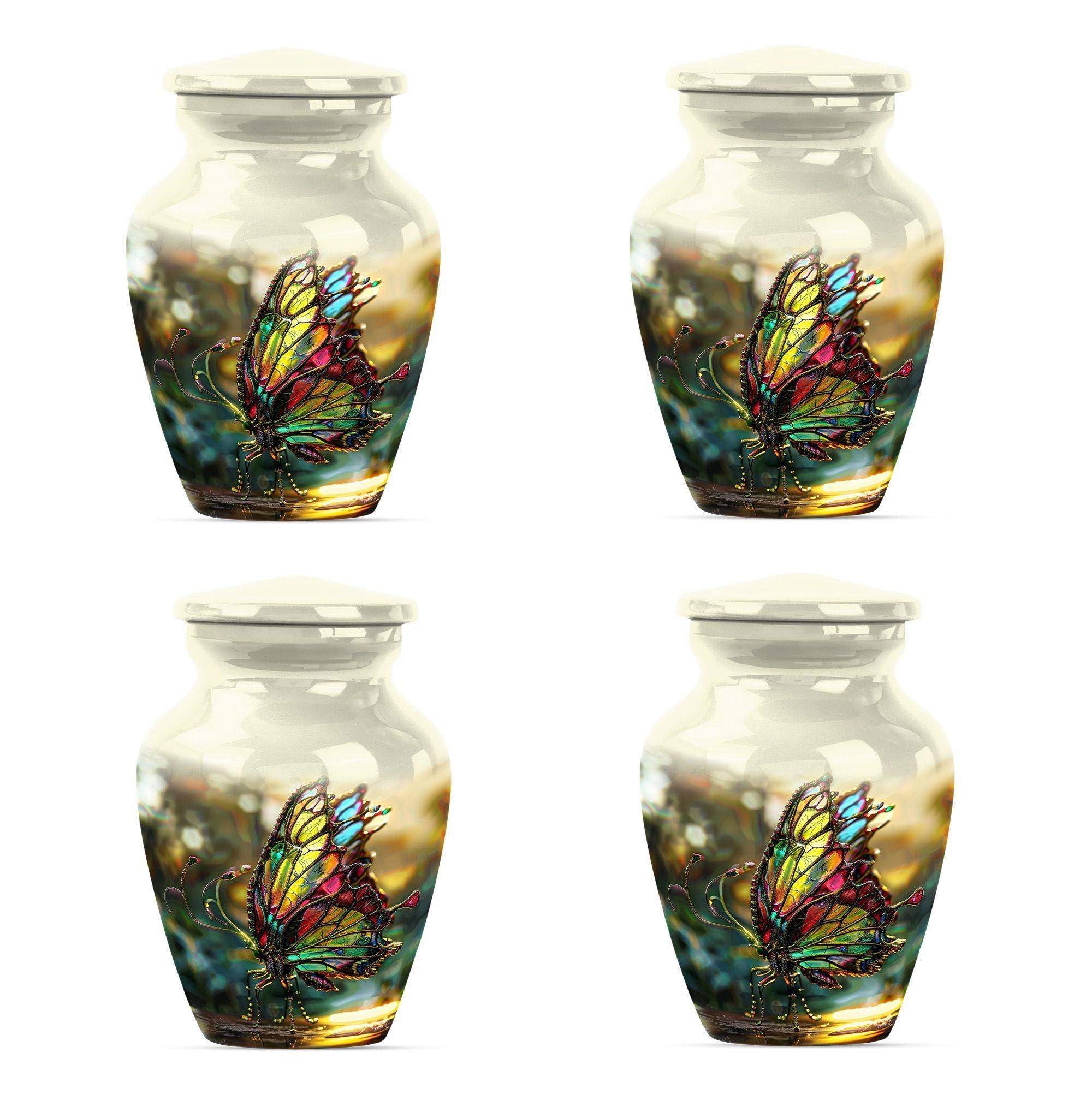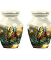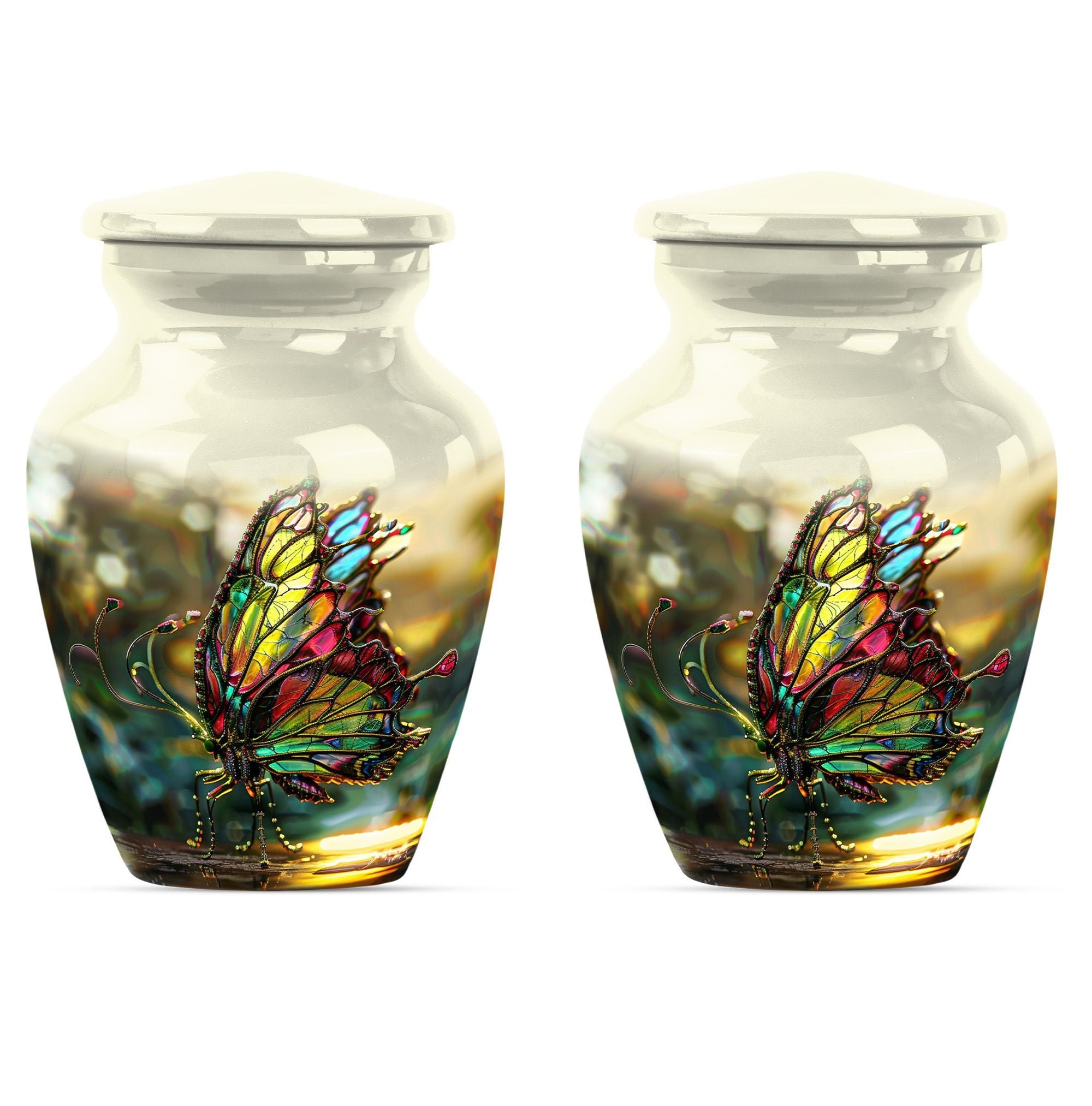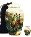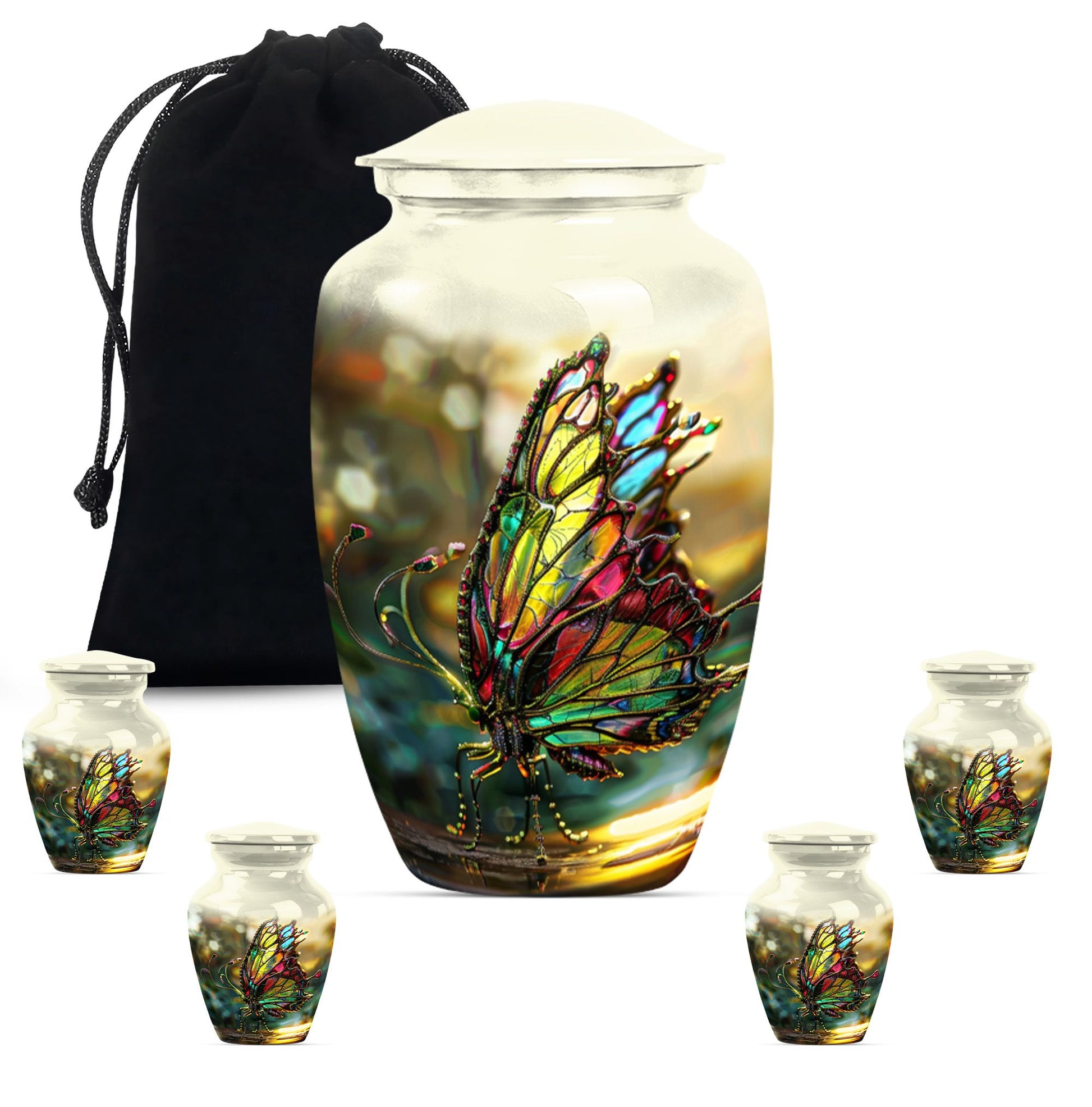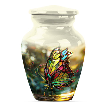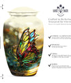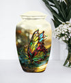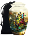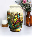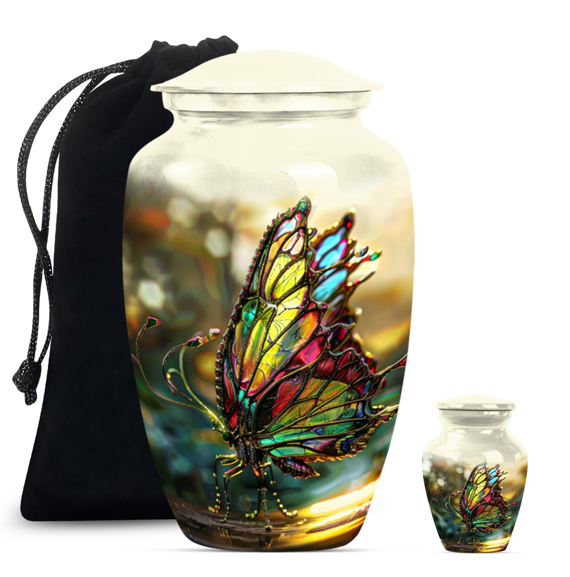 Pay respect to your dearly beloved with this elegant 'Purple Meadow' butterfly urn. The 10-inch large urn is fashioned from robust aluminium, a testament to its durability. Your cherished one’s memory is preserved within this cremation urn, which safely houses up to 200 cubic inches of ashes. This refined memorial urn for human ashes is easy to handle, weighing just 3.3 pounds and includes a velvet pouch for secure containment of ashes. Beyond both its practicality and aesthetic appeal, this urn provides a personalized touch. You can engrave names onto this classic urn to make it uniquely your own. Browse for 'funeral urns for ashes adult male' or 'cremation urn' to find us. This elegant urn doesn’t just hold ashes; it maintains your loved one’s spirit in an emblem of perpetual remembrance.