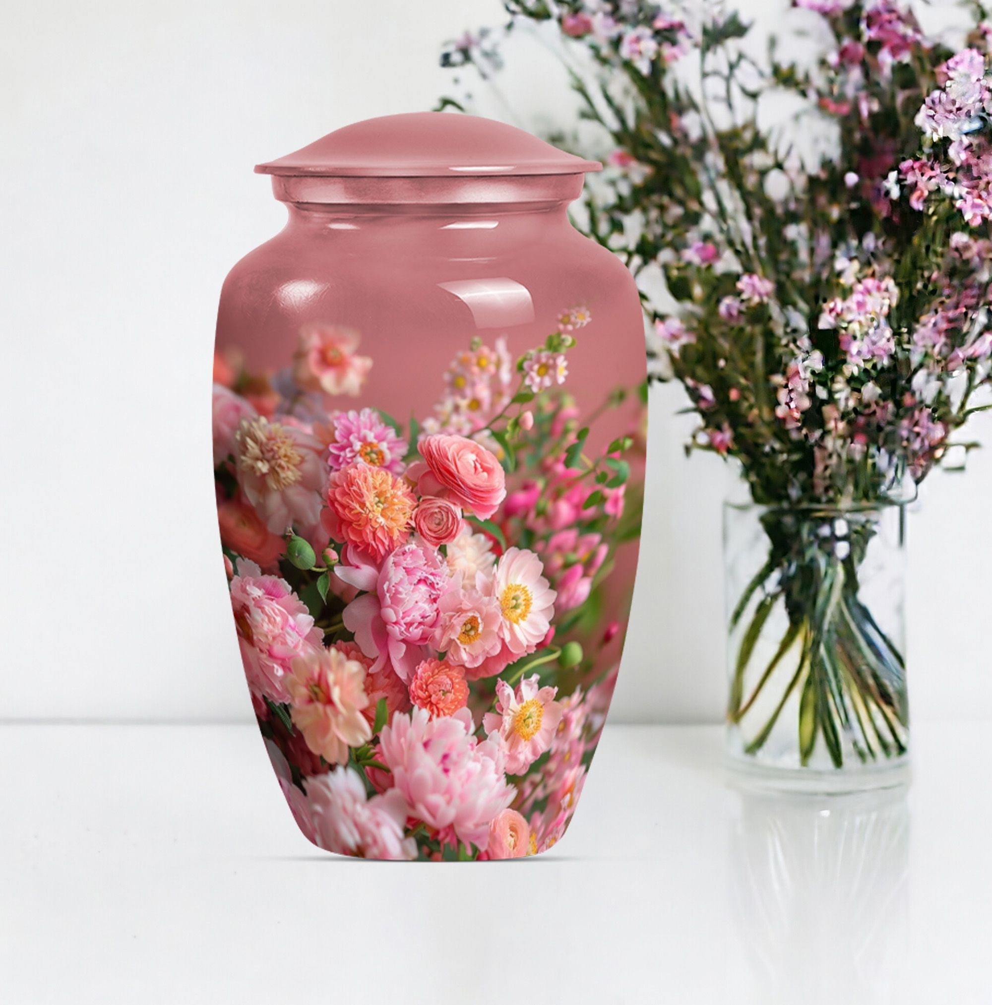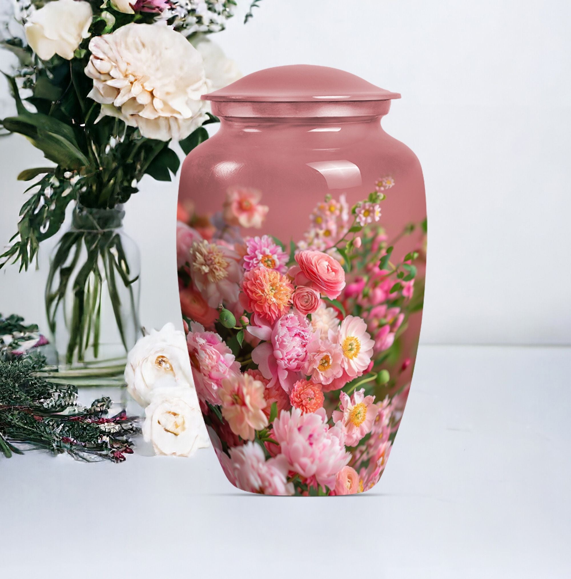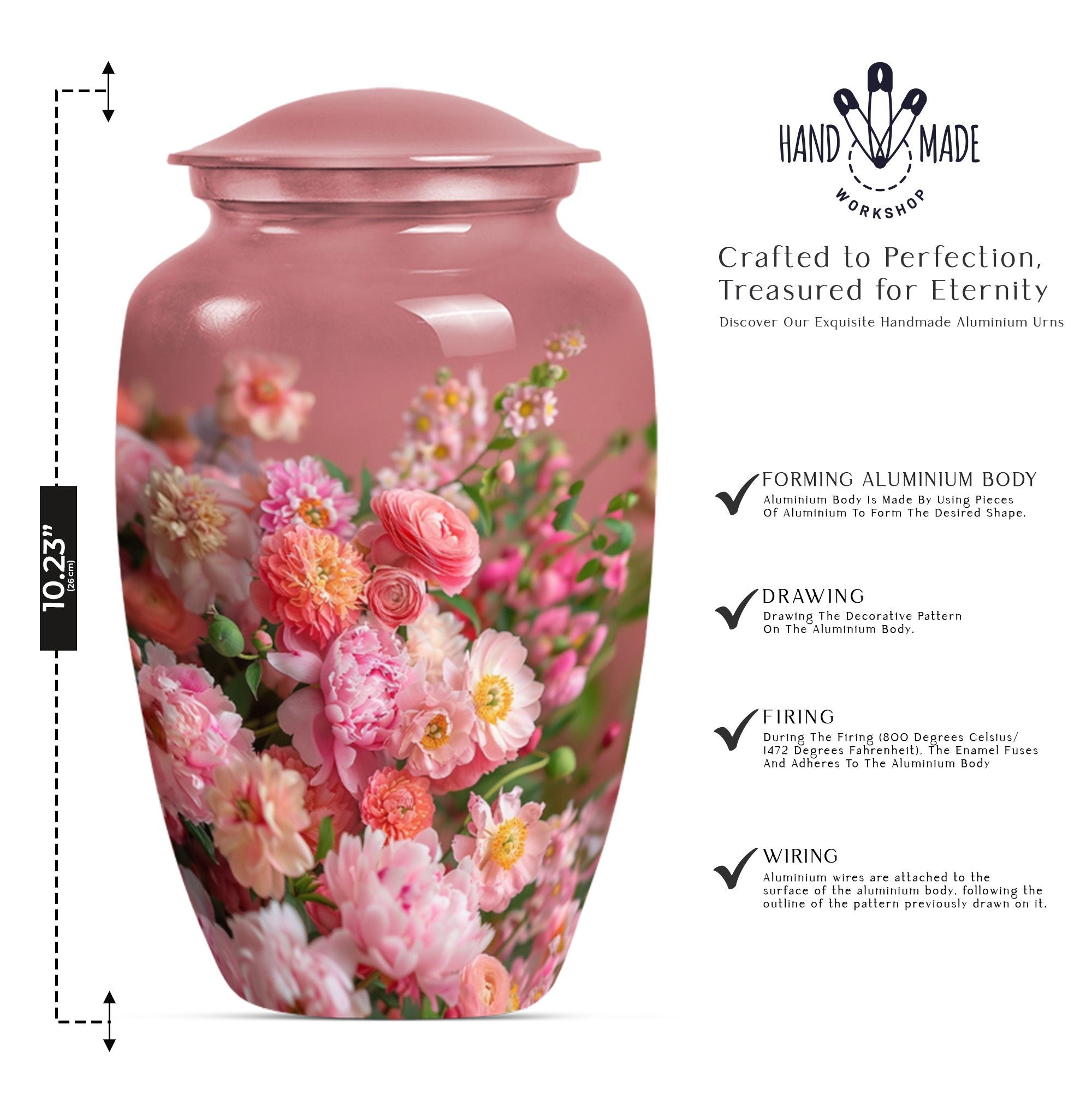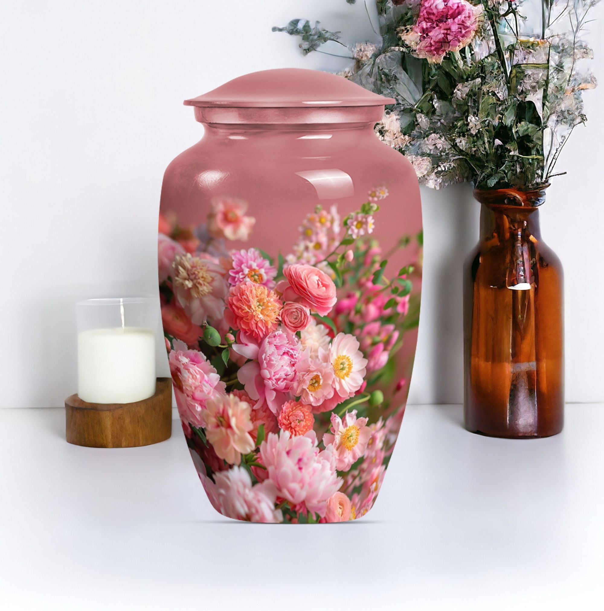 With respect for your cherished memories, we present this majestic and thoughtfully designed cremation urn for ashes. Perfect for an adult's remains, this 10-inch, 'Purple Meadow' themed large urn, complemented with a classic aluminum construction, offers a dignified memory of your loved one. A handcrafted object of finesse, this urn weighs only 3.3 pounds and possesses an impressive capacity of 200 cubic inches. Our flower urn allows you to keep your beloved close even after their final journey and ensures their spirit pervades in your surroundings always. We've also included a plush velvet pouch for careful containment of ashes, providing a gentle touch of class. In addition to the urn's striking elegance, it affords a chance of personalization. Embroider your loved one's name and create an enduring homage to their life. Whether looking for human ash adult urns or burial urns for cremation ashes, our offering encapsulates a sanctity that transcends mundane realities.