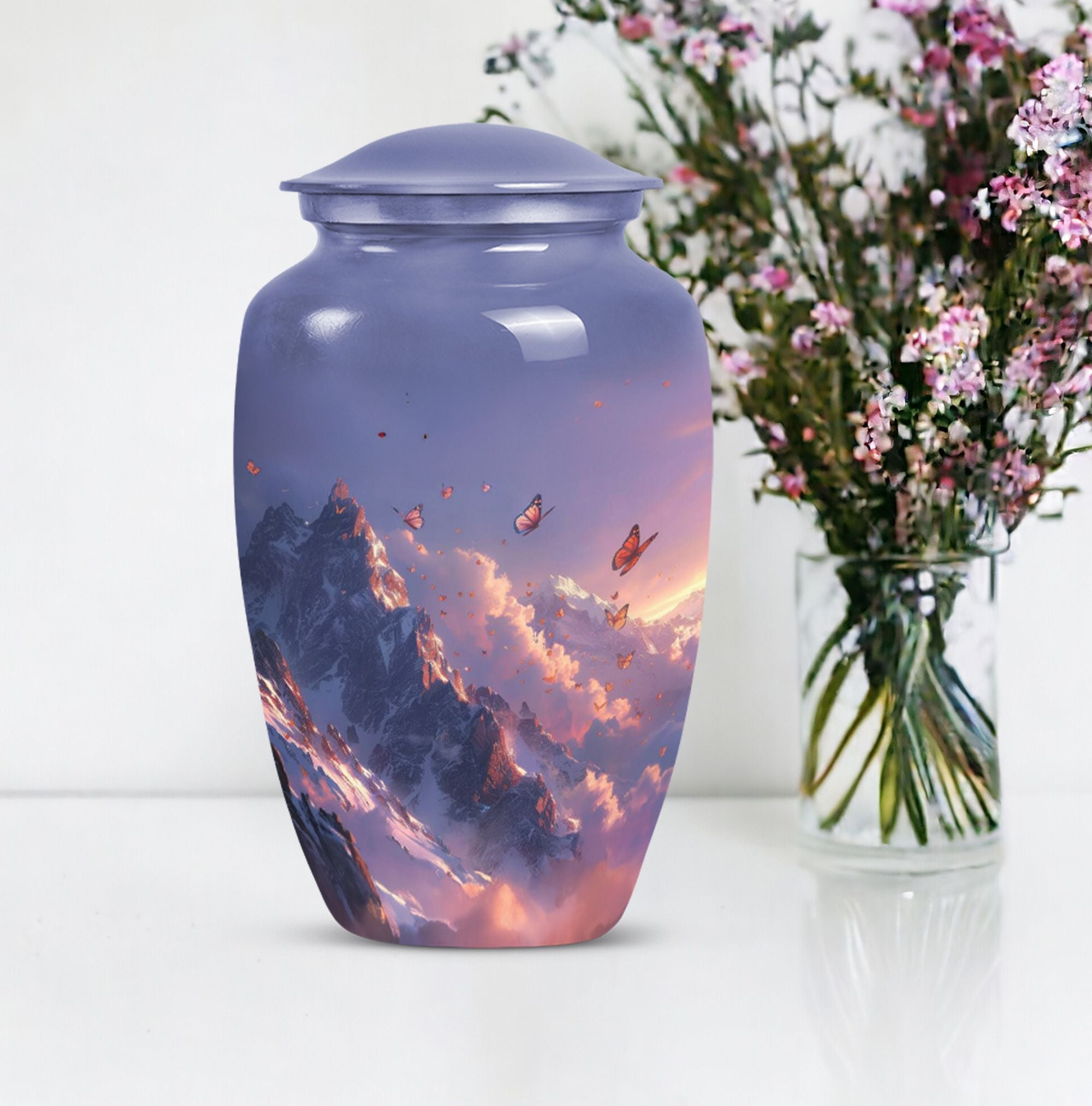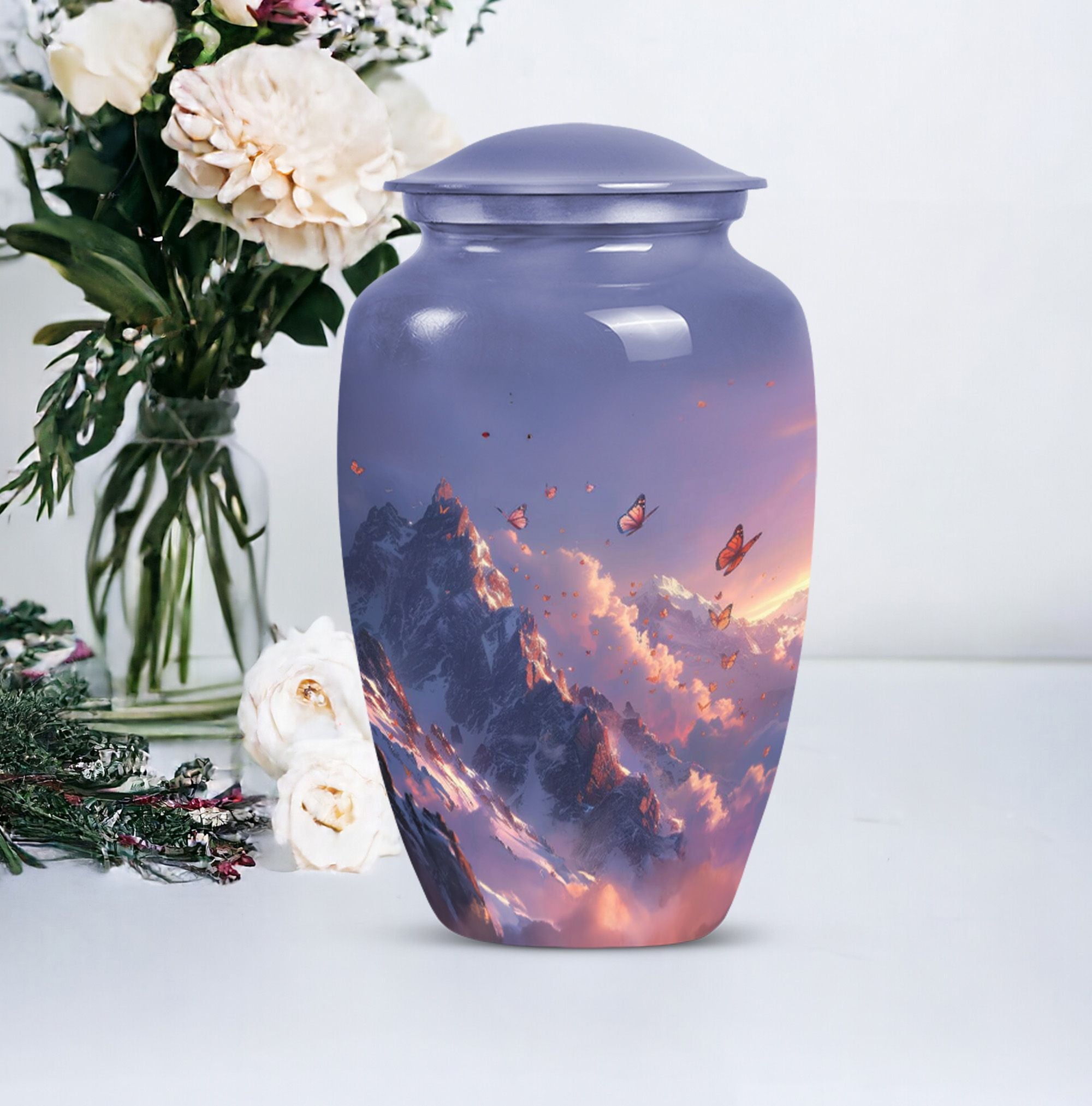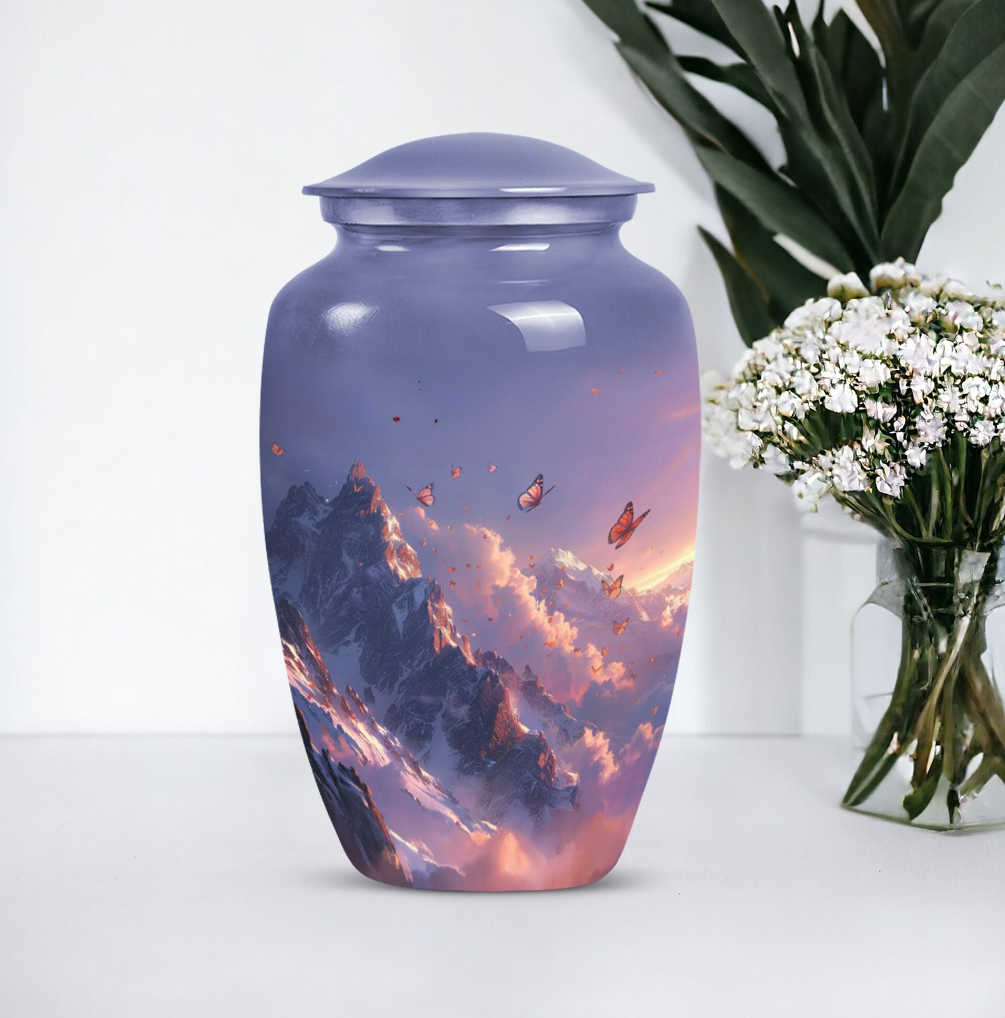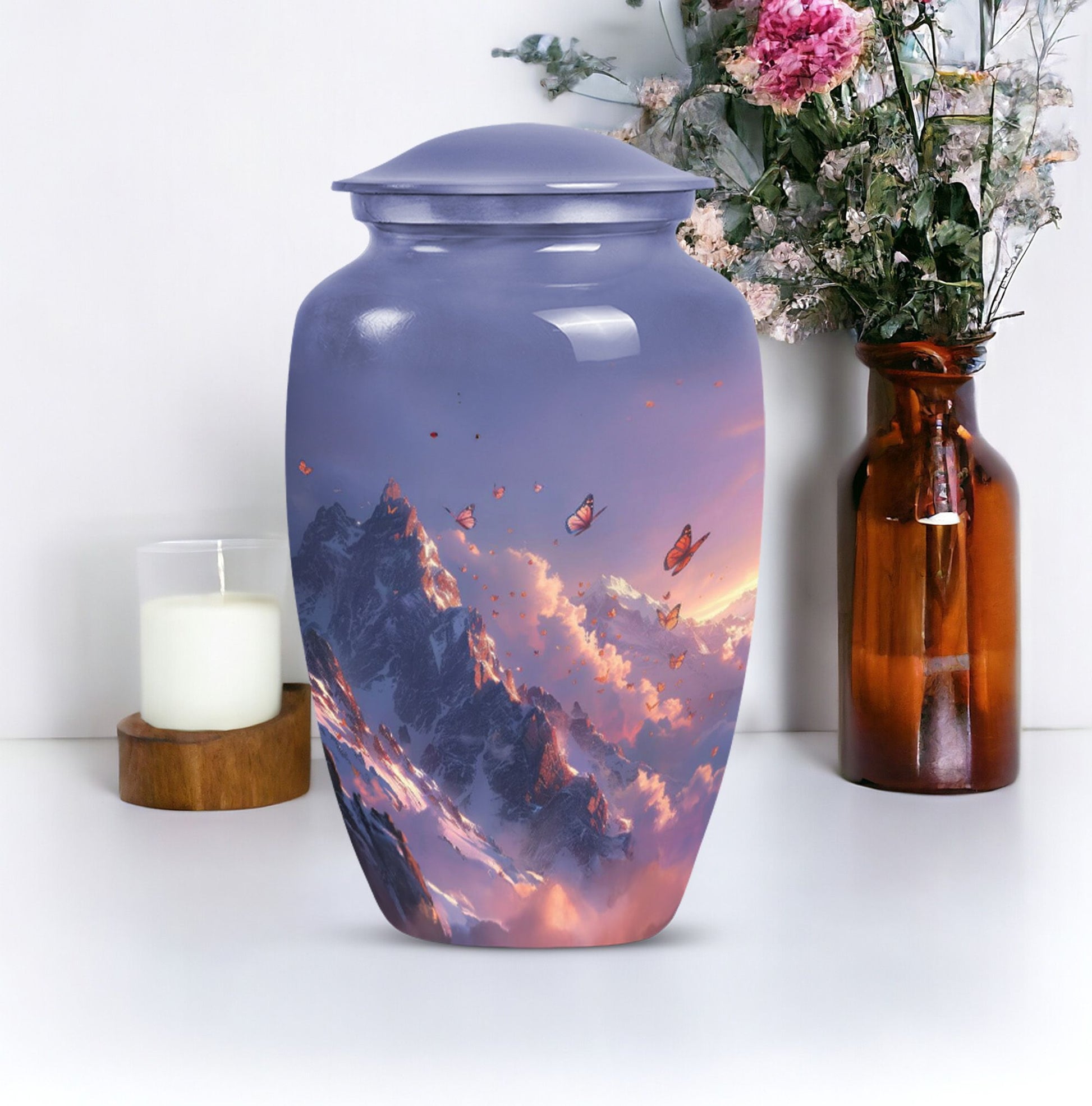 Discover the classic beauty of our 10 Inch Purple Meadow Urn in Aluminium. It's a sublime choice for Large Urns, leading the way in funeral urns for burial, and captures the magnificence of the 'Purple Meadow' theme. Weighing just 3.3 pounds yet boasting a significant 200-cubic inch capacity, this urn offers an ample home for your loved one's remains. Its refined Aluminium construction ensures it is resilient and dignifying. Adding a personal touch, you can engrave names to honor and remember your departed. With each purchase, we present a velvet pouch for a respectful and secure containment of the ashes. Our Purple Meadow Urn is more than a cremation urn - it is a celebration of life, commemorating your loved one in an intimate and enduring manner. Not just as a cremation urn for dad, this urn serves as a dignified resting place for any departed adult loved ones. This urn encapsulates both grandeur and serenity in its design, serving as a befitting homage to those we hold dear.