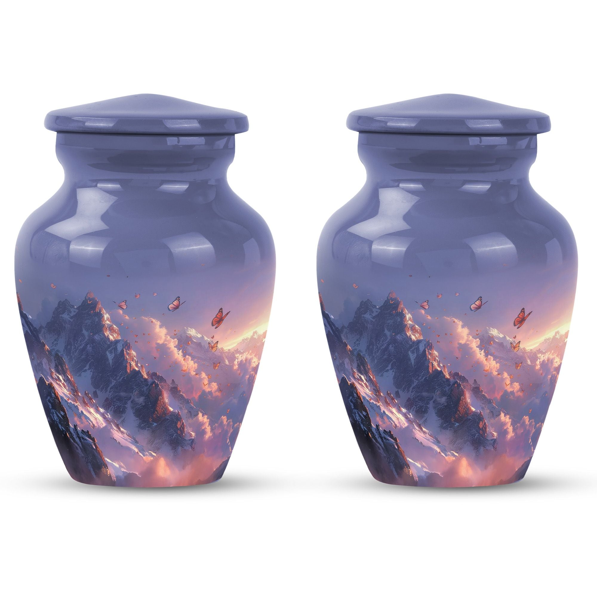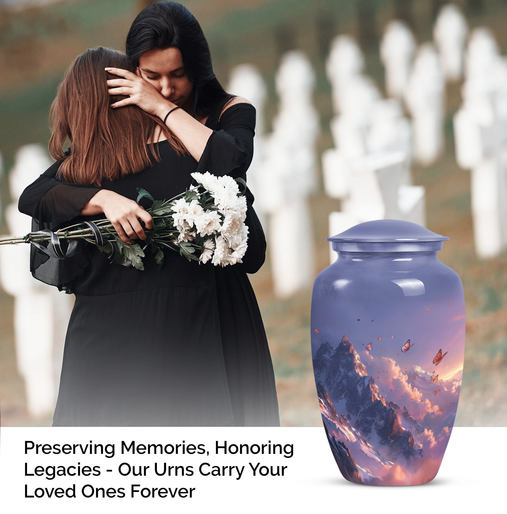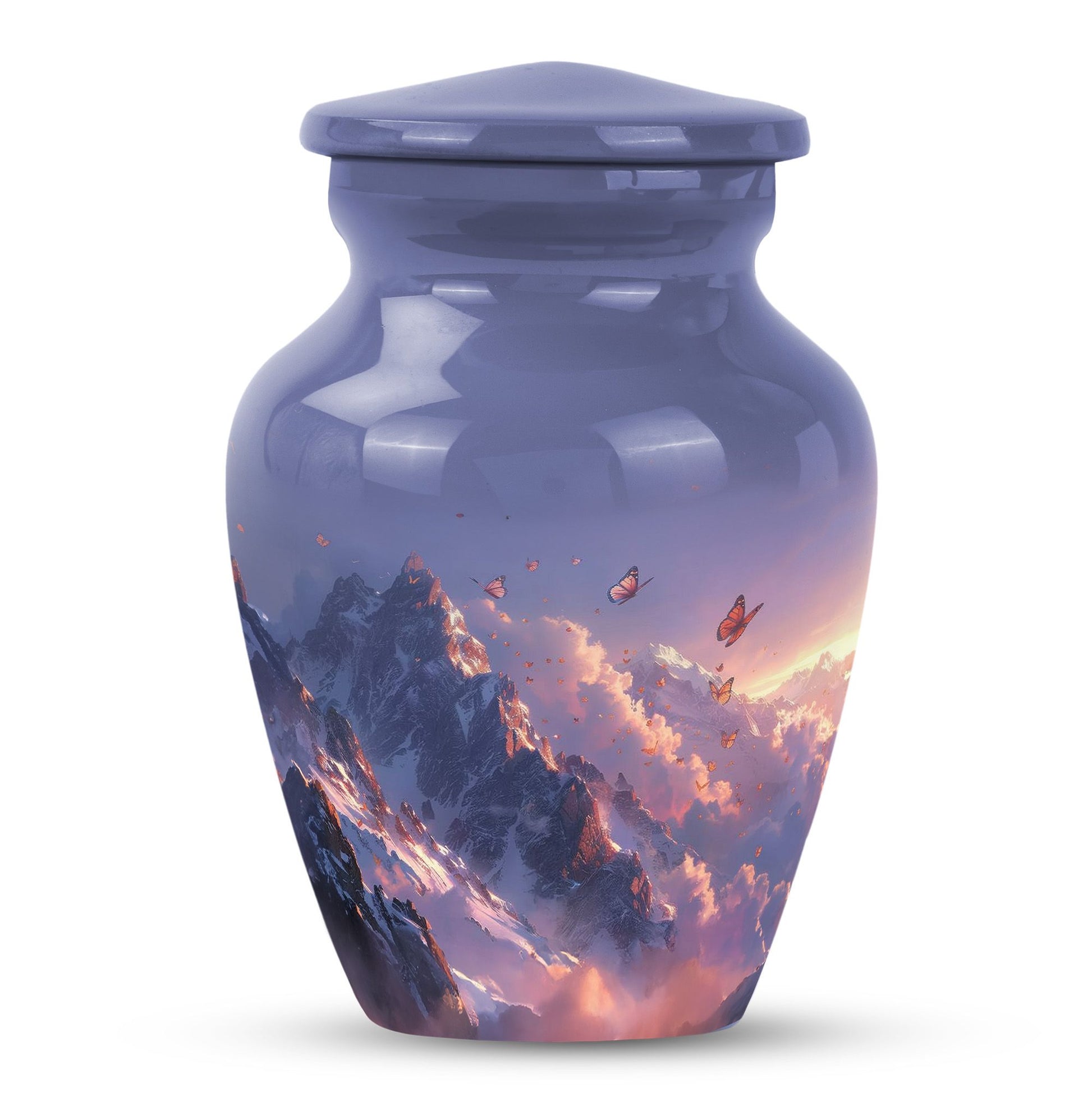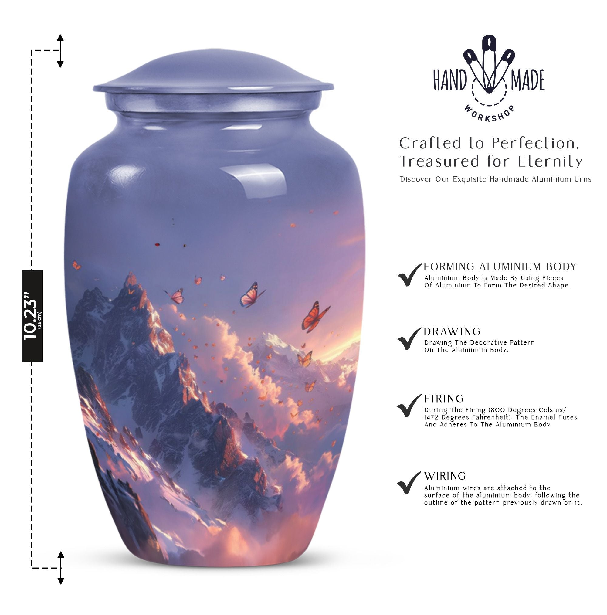 Discover the classic beauty of our 10 Inch Purple Meadow Urn in Aluminium. It's a sublime choice for Large Urns, leading the way in funeral urns for burial, and captures the magnificence of the 'Purple Meadow' theme. Weighing just 3.3 pounds yet boasting a significant 200-cubic inch capacity, this urn offers an ample home for your loved one's remains. Its refined Aluminium construction ensures it is resilient and dignifying. Adding a personal touch, you can engrave names to honor and remember your departed. With each purchase, we present a velvet pouch for a respectful and secure containment of the ashes. Our Purple Meadow Urn is more than a cremation urn - it is a celebration of life, commemorating your loved one in an intimate and enduring manner. Not just as a cremation urn for dad, this urn serves as a dignified resting place for any departed adult loved ones. This urn encapsulates both grandeur and serenity in its design, serving as a befitting homage to those we hold dear.