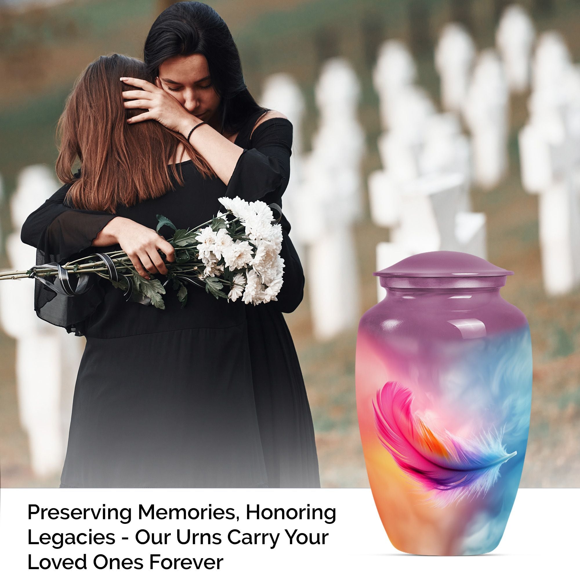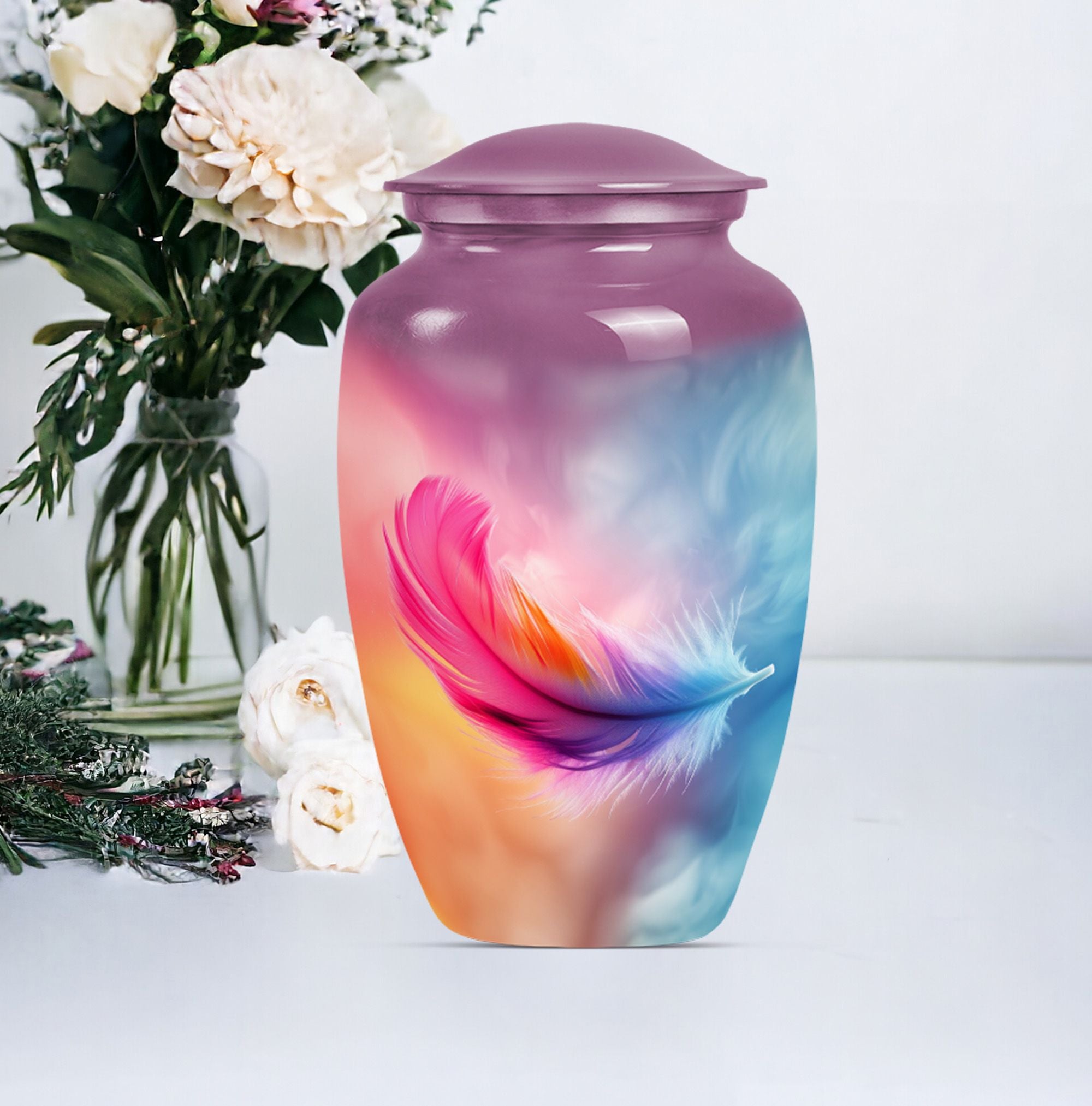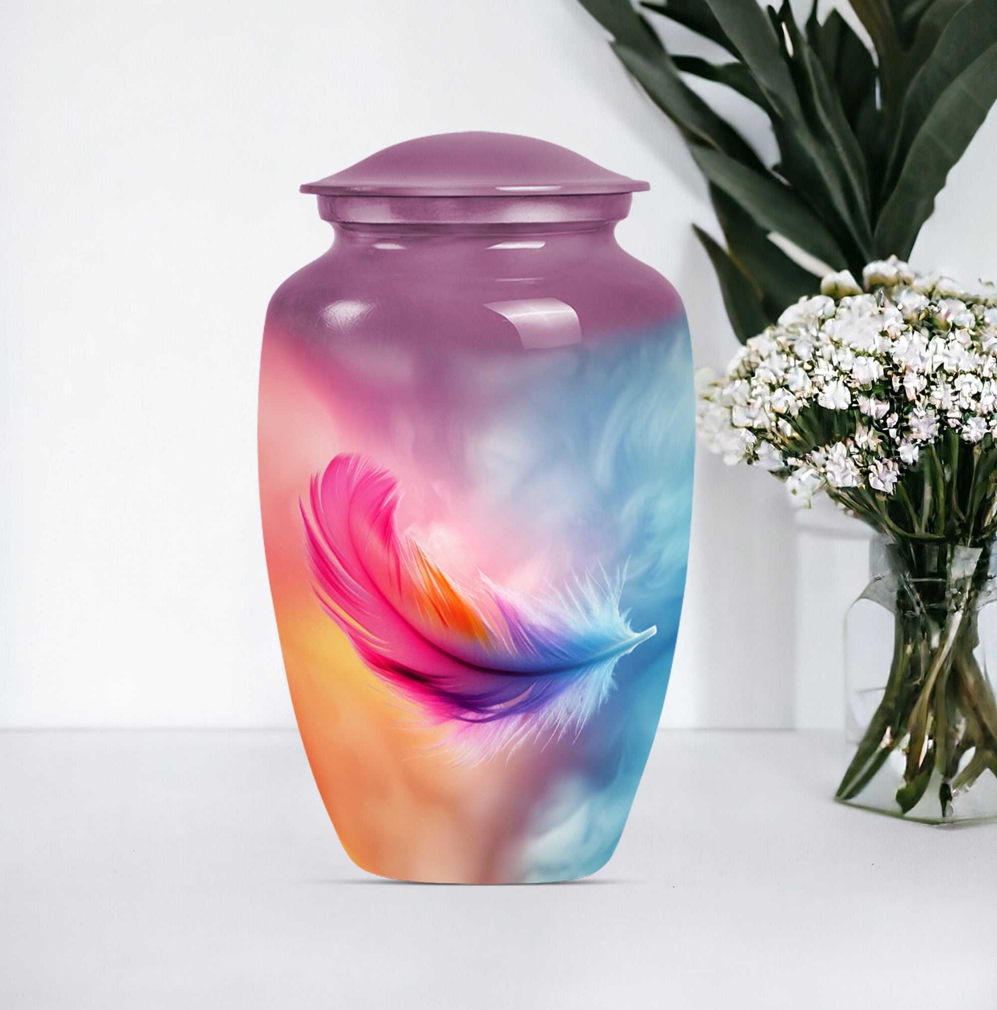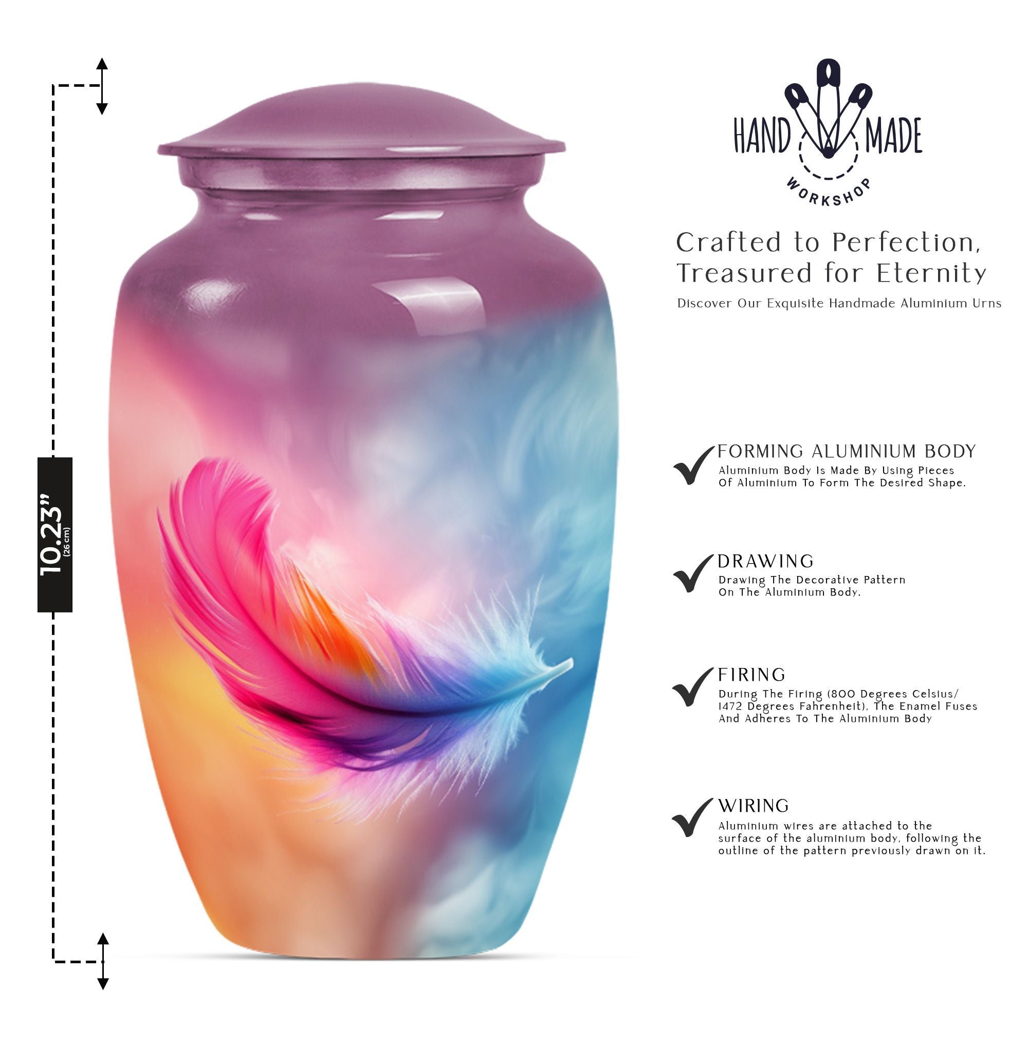Feather your memories into our meticulously made feather urn, an ideal large burial urn for ashes designed specifically for women. Accentuated in the soothing theme of a Purple Meadow, this 10-inch large urn is fabricated with aluminum reflecting the superior craftsmanship. Its considerable capacity of 200 cubic inches ensures a substantial amount of ashes can be securely stored. This cremation urn is a perfect blend of durability and elegance, with a weight of only 3.3 pounds. It comes along with a velvet pouch, ensuring graceful containment of ashes. Pioneering the market, our cremation urns offer a unique opportunity for personalization. You can engrave the names, adding an emotional touch to memorial gifts. Such burial cremation urns for adult women are a rare find. This large double urn for two adults resonates with the sentiments of many. Looking for cremation urns? Look no further, and make lasting memories with our original designed urn. Note: Design not explicitly mentioned to uphold the surprise element.