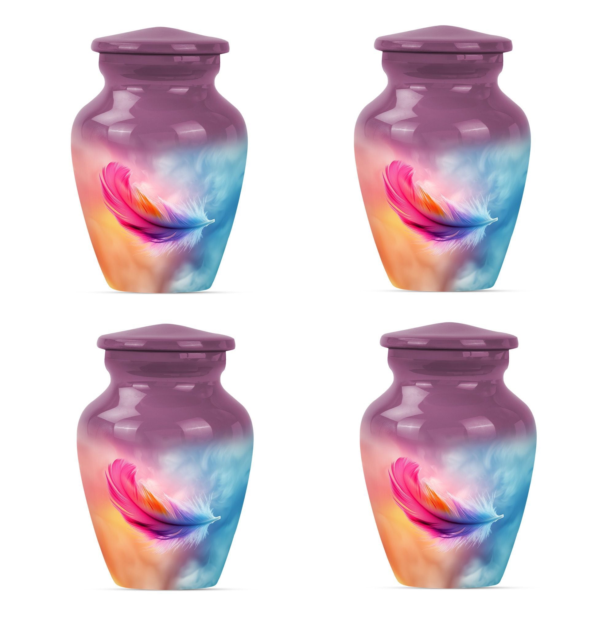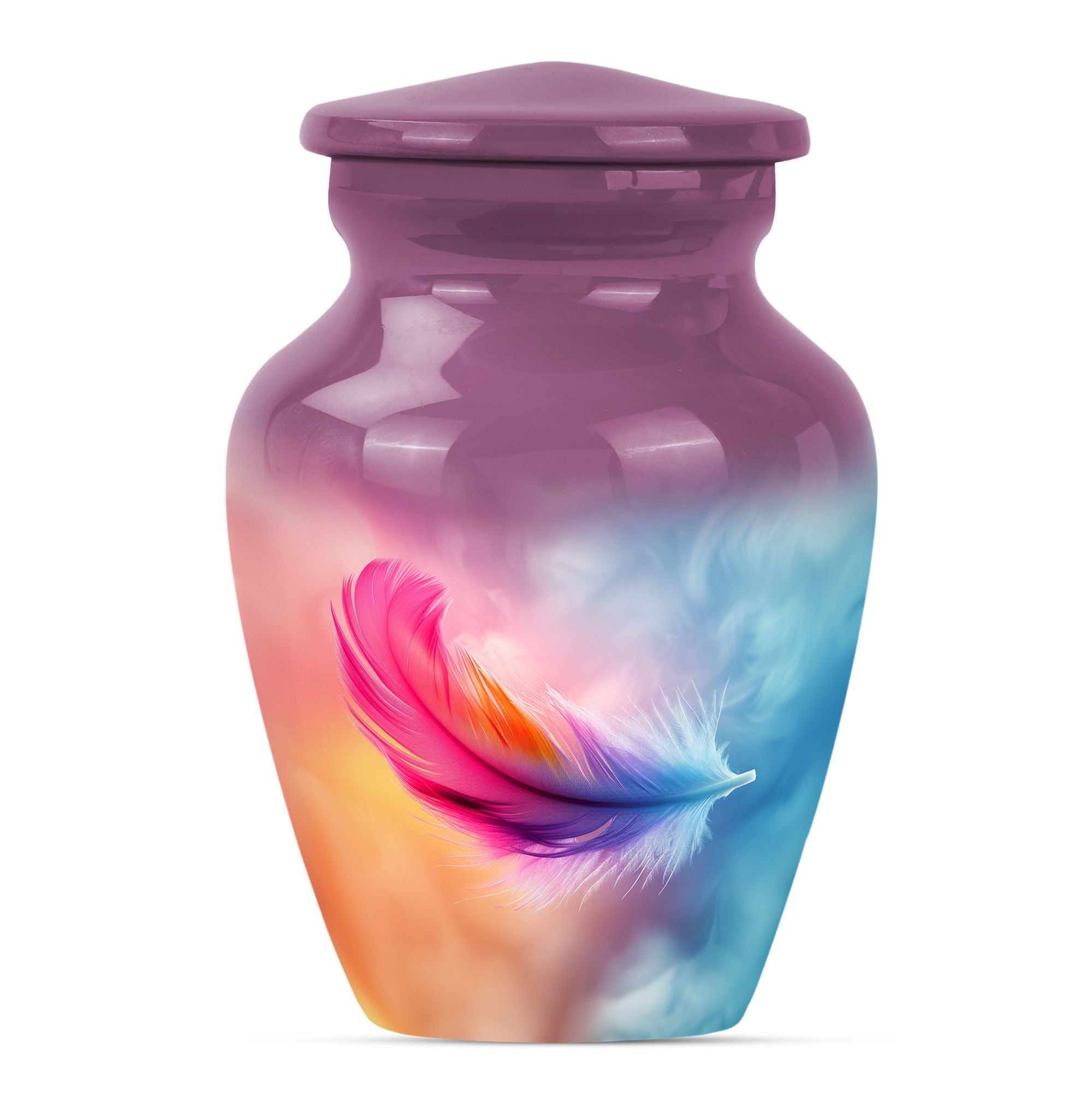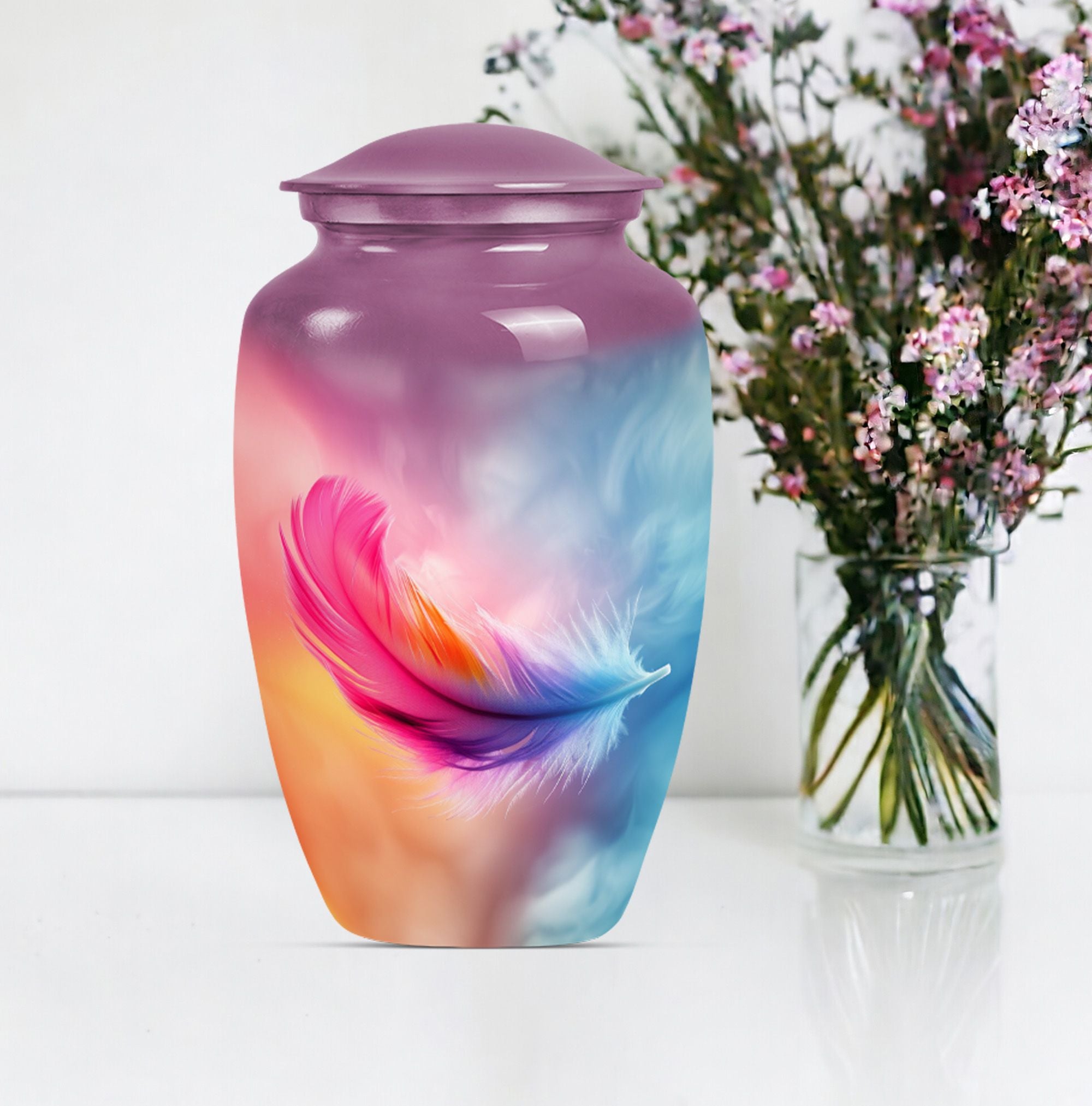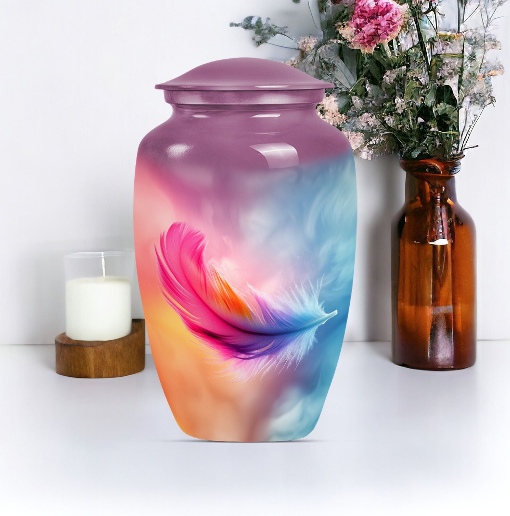 Feather your memories into our meticulously made feather urn, an ideal large burial urn for ashes designed specifically for women. Accentuated in the soothing theme of a Purple Meadow, this 10-inch large urn is fabricated with aluminum reflecting the superior craftsmanship. Its considerable capacity of 200 cubic inches ensures a substantial amount of ashes can be securely stored. This cremation urn is a perfect blend of durability and elegance, with a weight of only 3.3 pounds. It comes along with a velvet pouch, ensuring graceful containment of ashes. Pioneering the market, our cremation urns offer a unique opportunity for personalization. You can engrave the names, adding an emotional touch to memorial gifts. Such burial cremation urns for adult women are a rare find. This large double urn for two adults resonates with the sentiments of many. Looking for cremation urns? Look no further, and make lasting memories with our original designed urn. Note: Design not explicitly mentioned to uphold the surprise element.