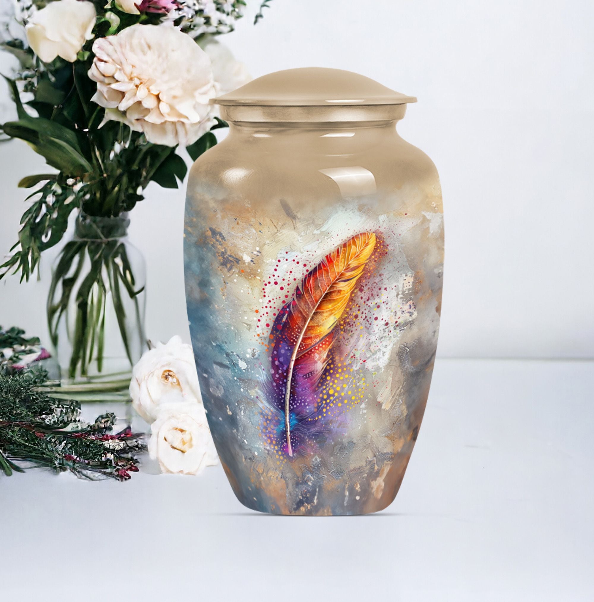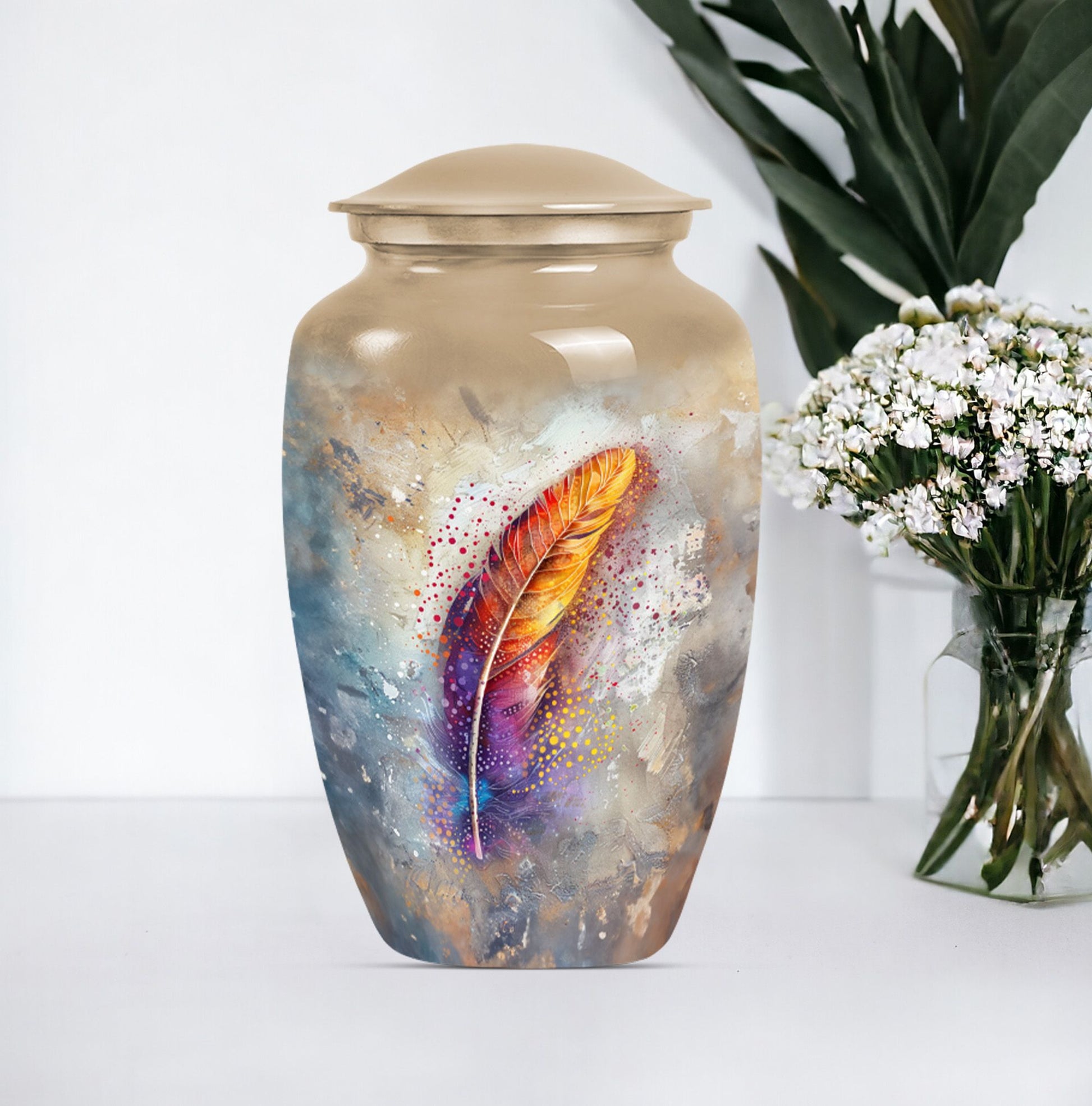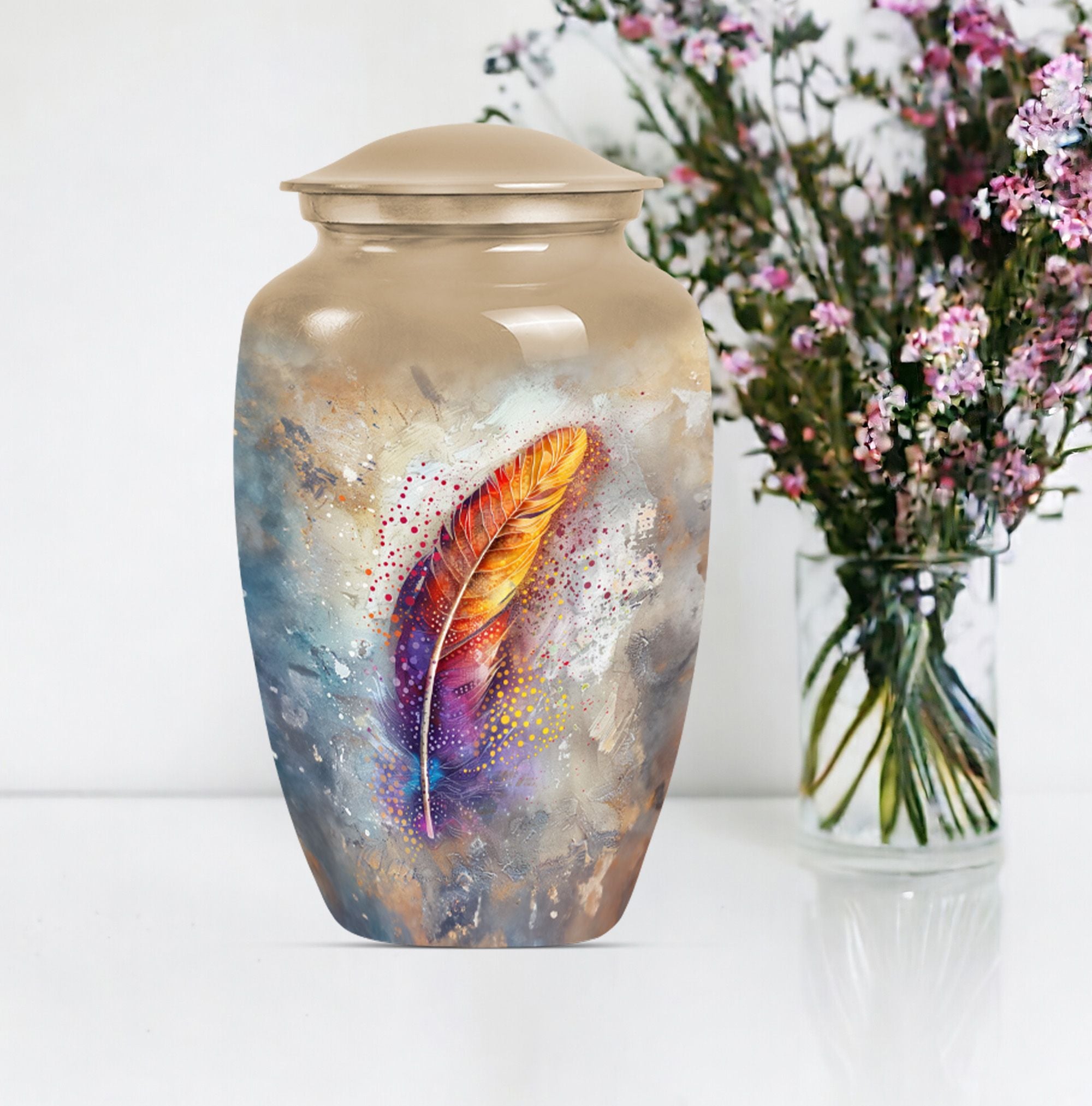 Immortalize your loved ones with our Purple Meadow Classic Urn, an elegant feather urn designed for adults. Our large funeral urns measure 10 inches, with a weight of 3.3 pounds - perfectly sized to hold up to 200 cubic inches of ashes. This lovingly crafted memorial urn, fashioned from durable aluminium, offers a truly unique way to remember and memorialize your dearly departed. The funeral urn for ashes provides personalization; you can engrave names to keep memories alive. For those seeking funeral urns for adult males or dads, this purple meadow-themed vessel is an ideal option, offering a harmonious mix of love, respect, and dignity. We've also included a velvet pouch for containment of ashes, adding a touch of luxurious care to this beautiful keepsake. This product strikes the right balance between ceremony and artistry, making it a soulful addition to any memorial display.