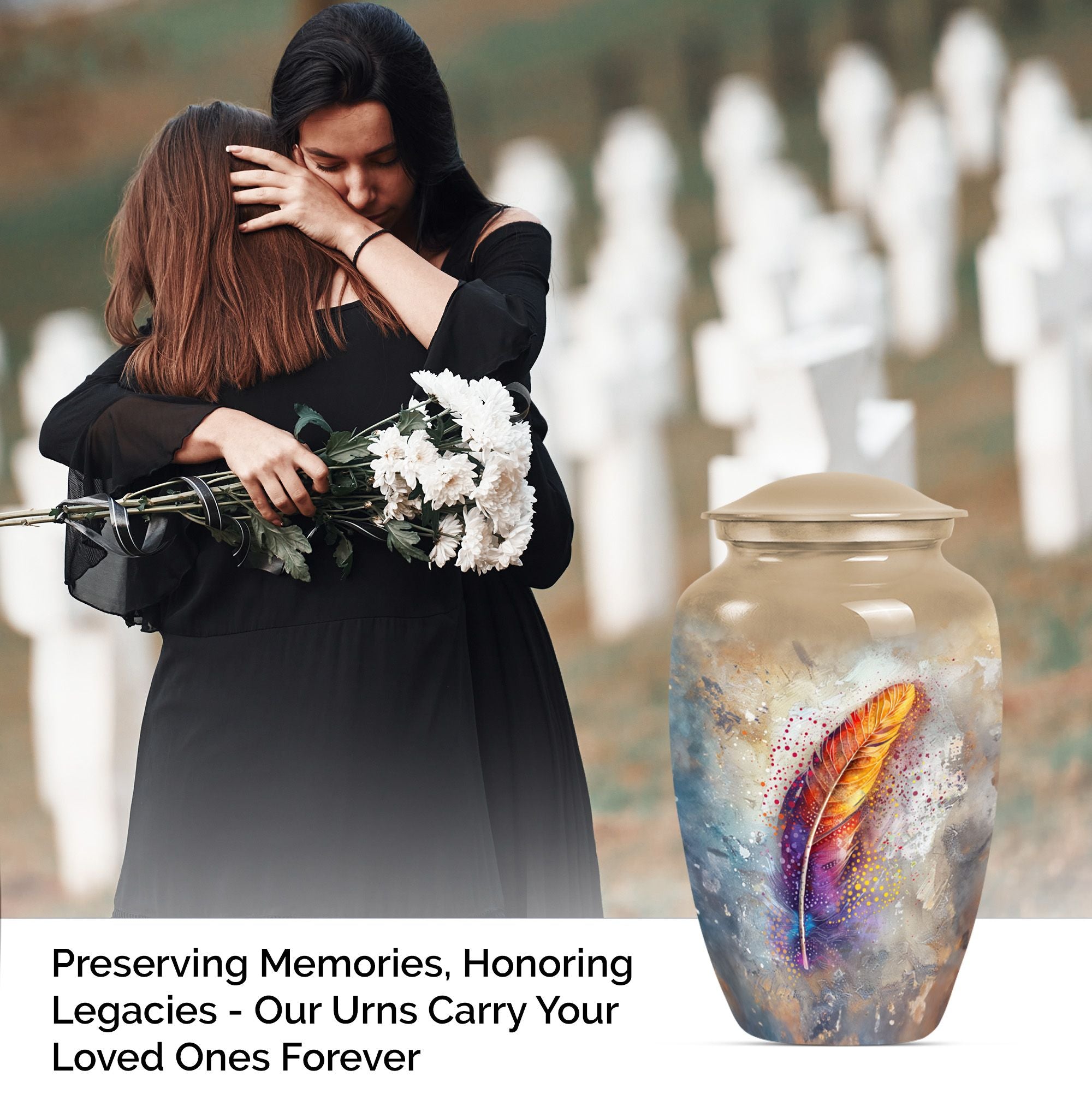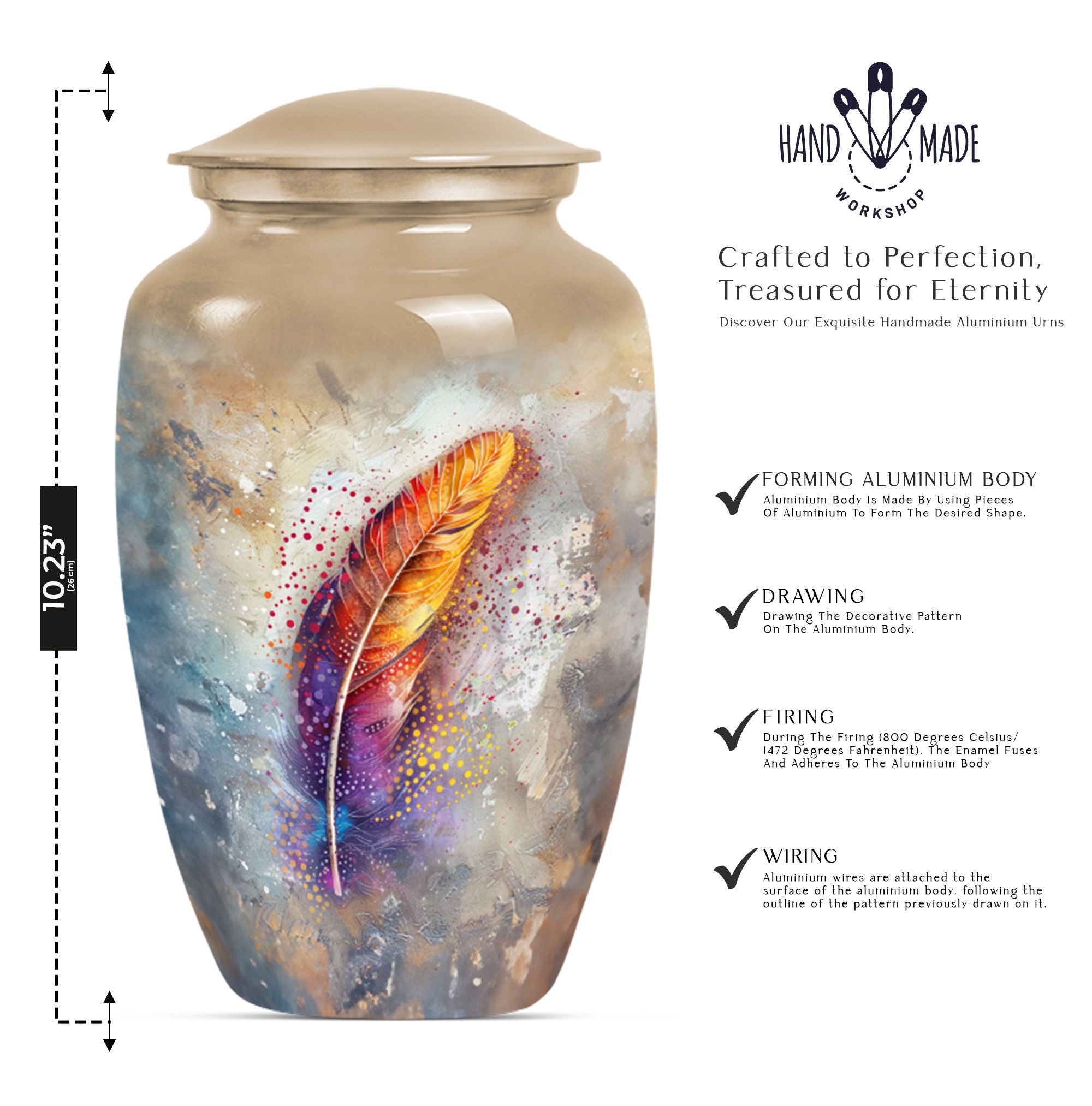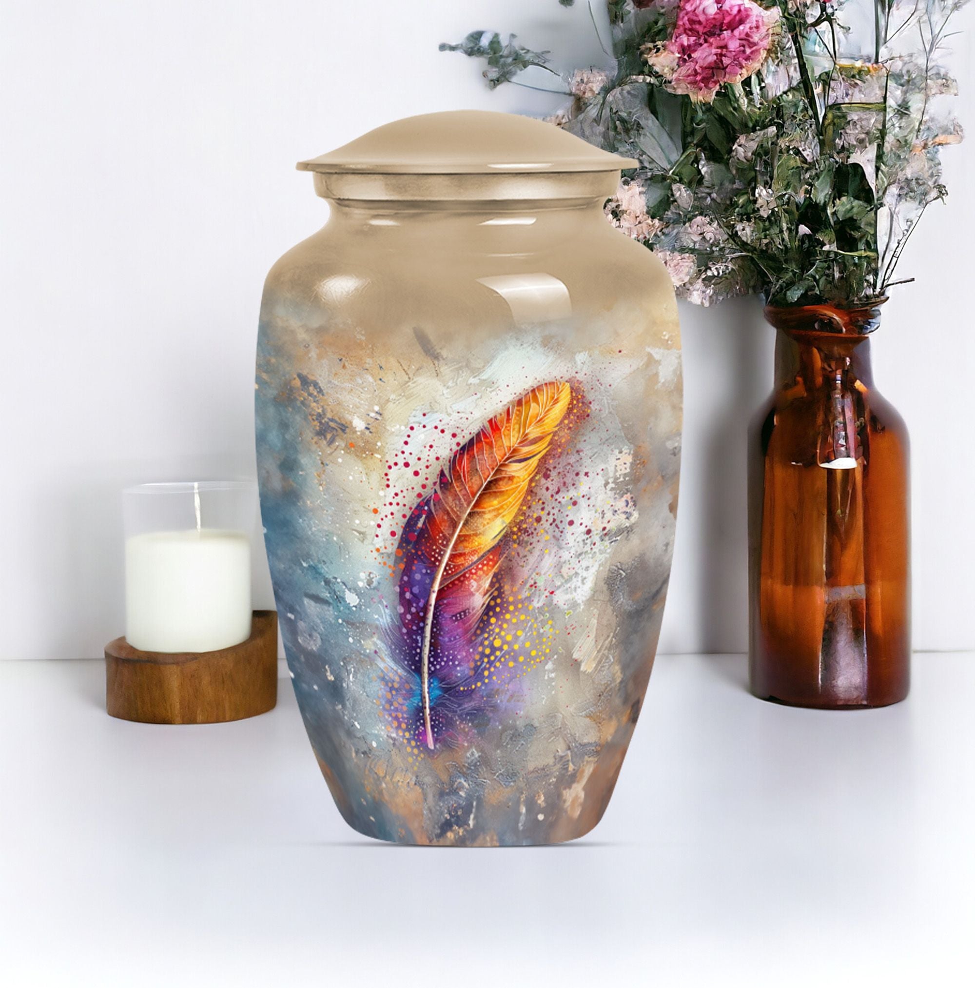 Immortalize your loved ones with our Purple Meadow Classic Urn, an elegant feather urn designed for adults. Our large funeral urns measure 10 inches, with a weight of 3.3 pounds - perfectly sized to hold up to 200 cubic inches of ashes. This lovingly crafted memorial urn, fashioned from durable aluminium, offers a truly unique way to remember and memorialize your dearly departed. The funeral urn for ashes provides personalization; you can engrave names to keep memories alive. For those seeking funeral urns for adult males or dads, this purple meadow-themed vessel is an ideal option, offering a harmonious mix of love, respect, and dignity. We've also included a velvet pouch for containment of ashes, adding a touch of luxurious care to this beautiful keepsake. This product strikes the right balance between ceremony and artistry, making it a soulful addition to any memorial display.