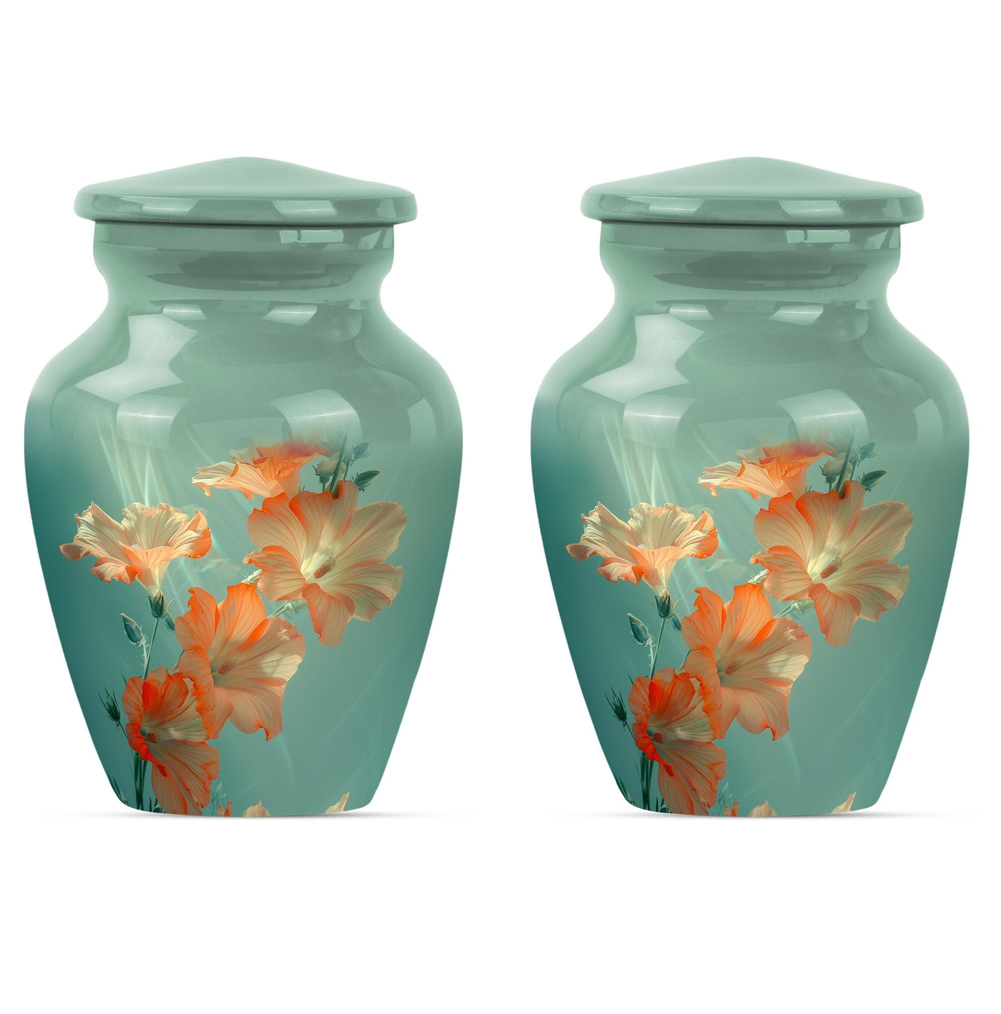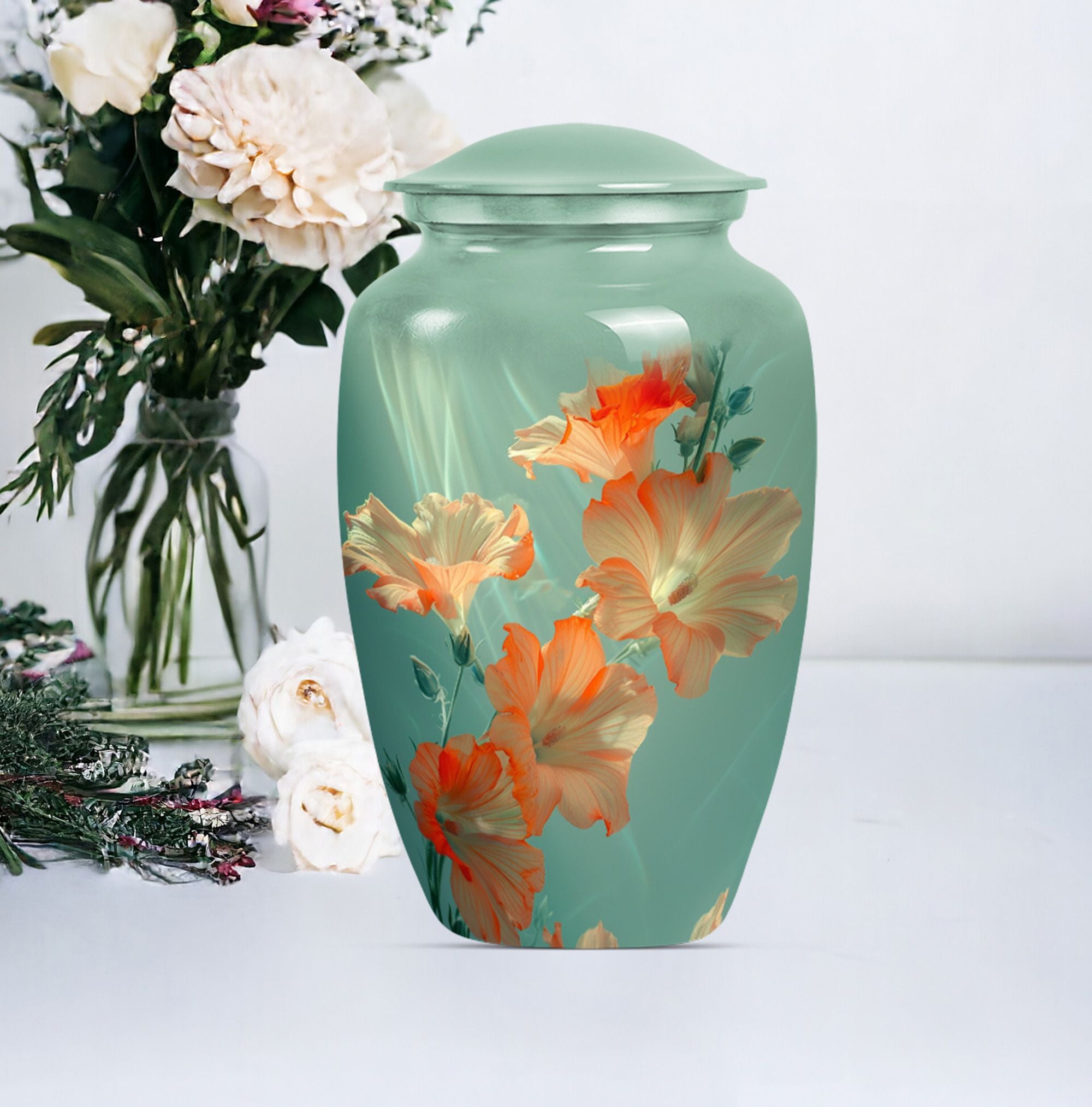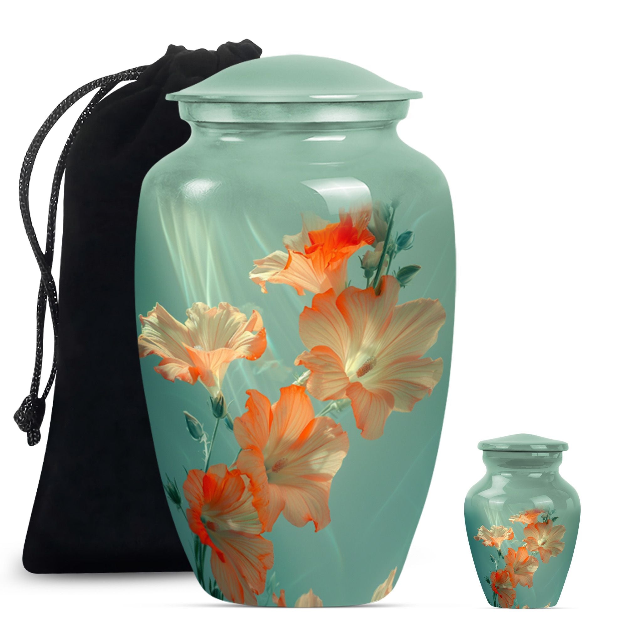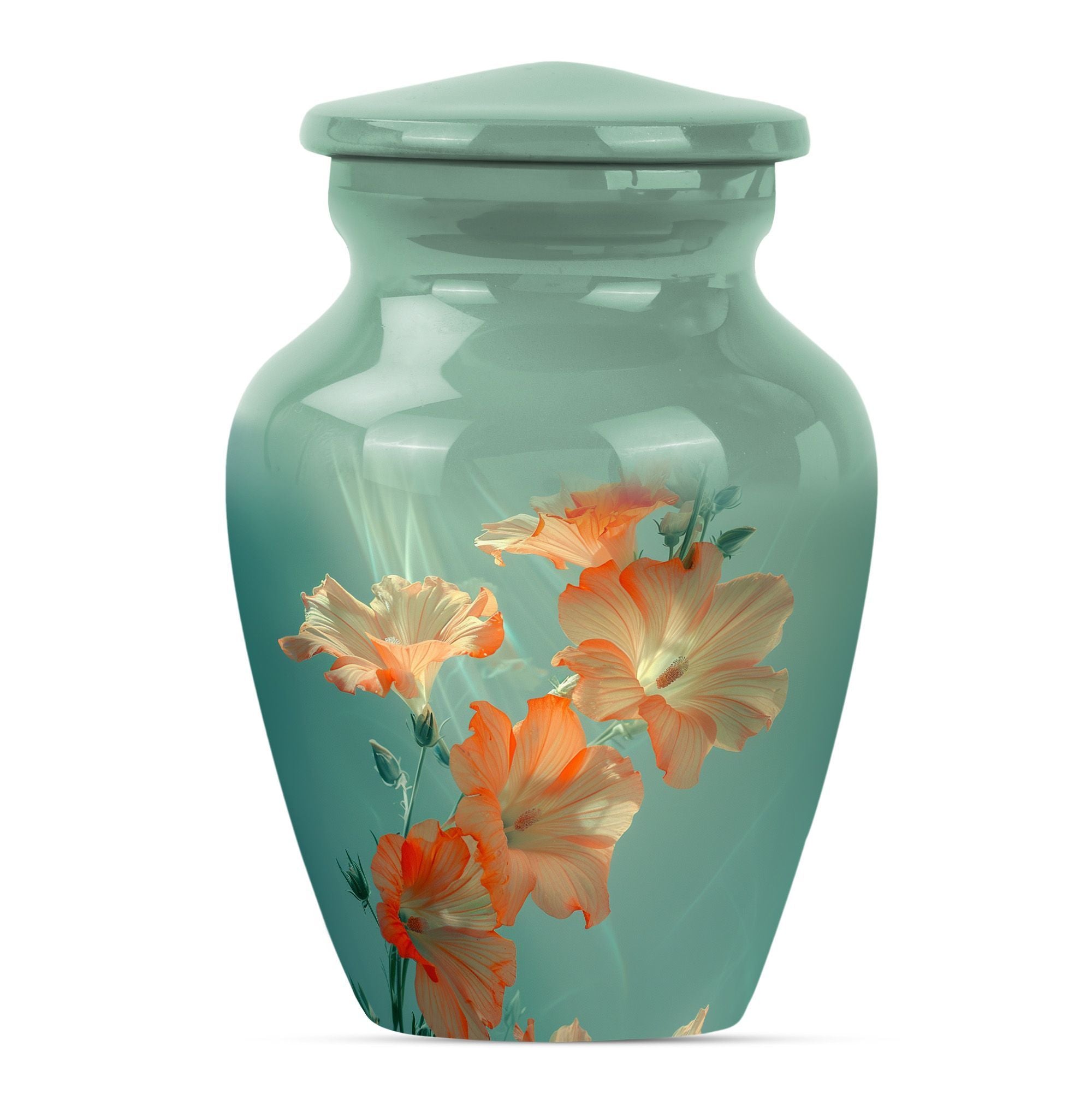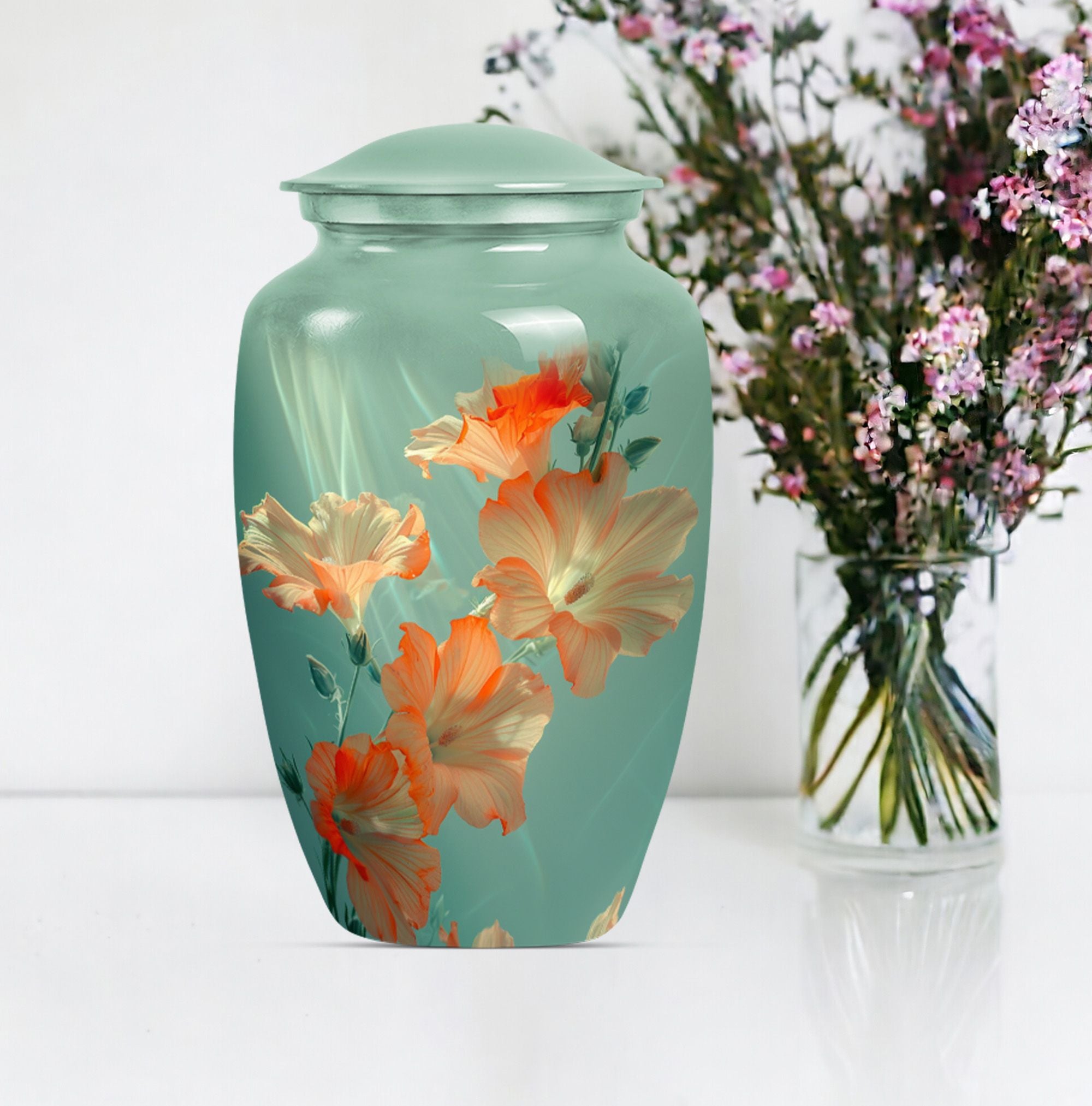 Cherish your loved one's memory with our Purple Meadow Large Urn, a radiant tribute to honor and remember. Skillfully crafted from superior aluminium material, this 3.3 pounds urn stands proudly at a height of 10 inches, and can securely hold up to 200 cubic inches of ashes, making it an ideal memorial adult urn for human ashes for women or men. The stunning Purple Meadow theme encapsulates a vibrant symbol of an everlasting bond, whilst its size and weight ensure stability and profundity. Our package also includes a soft, velvet pouch, ideal for safeguarding precious contents. Add a personal touch to this timeless piece by engraving names for an intimate reminder. Our flower Urn is more than a keepsake; it's a heartfelt way to keep your dearly departed close. Ditch the ubiquity of Classic urn designs; instead, opt for our unique, large urns that are as distinct as the soul they hold. Perfect for those searching for cremation urns for women or funeral large urns for human ashes adult male, and extends to a broad assortment of adult urns for cremation ashes.