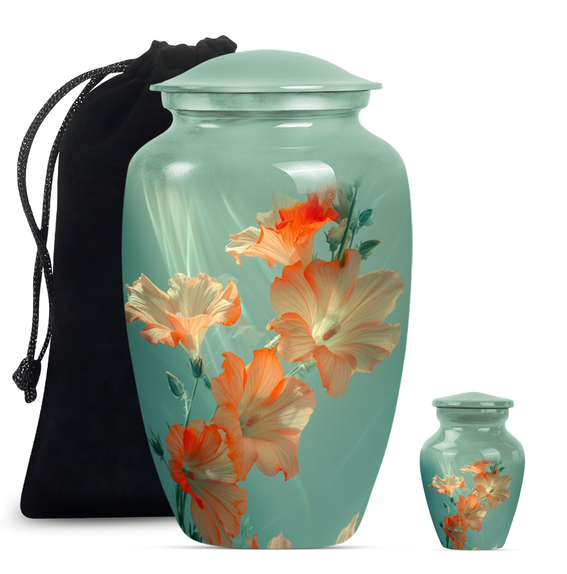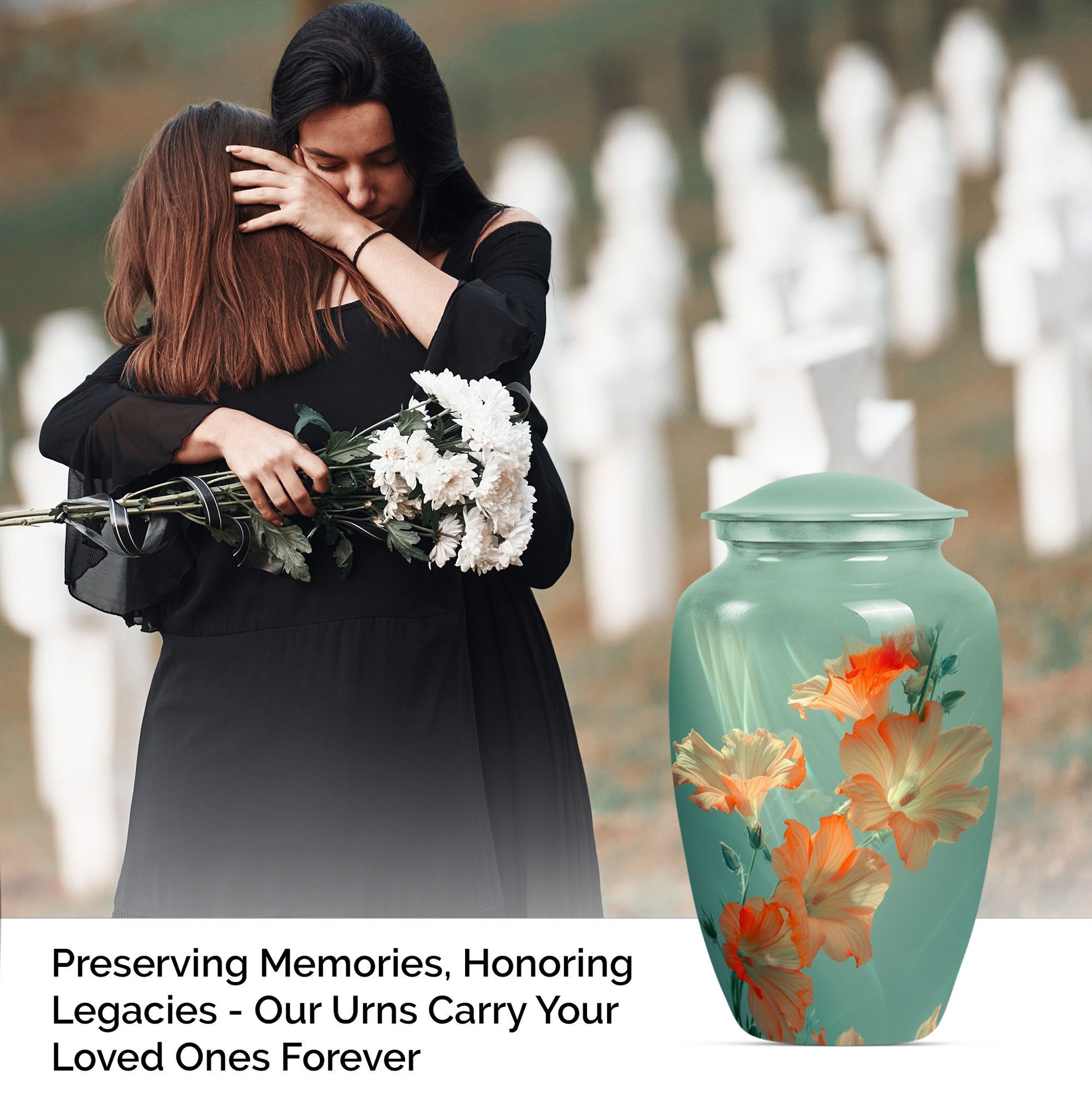 Cherish your loved one's memory with our Purple Meadow Large Urn, a radiant tribute to honor and remember. Skillfully crafted from superior aluminium material, this 3.3 pounds urn stands proudly at a height of 10 inches, and can securely hold up to 200 cubic inches of ashes, making it an ideal memorial adult urn for human ashes for women or men. The stunning Purple Meadow theme encapsulates a vibrant symbol of an everlasting bond, whilst its size and weight ensure stability and profundity. Our package also includes a soft, velvet pouch, ideal for safeguarding precious contents. Add a personal touch to this timeless piece by engraving names for an intimate reminder. Our flower Urn is more than a keepsake; it's a heartfelt way to keep your dearly departed close. Ditch the ubiquity of Classic urn designs; instead, opt for our unique, large urns that are as distinct as the soul they hold. Perfect for those searching for cremation urns for women or funeral large urns for human ashes adult male, and extends to a broad assortment of adult urns for cremation ashes.