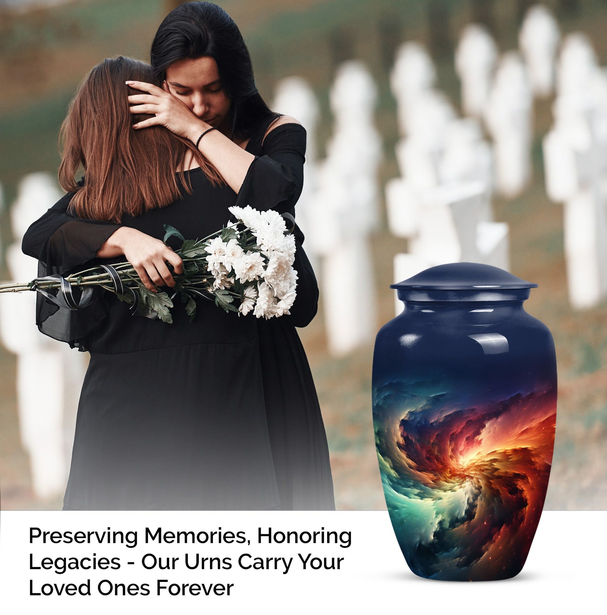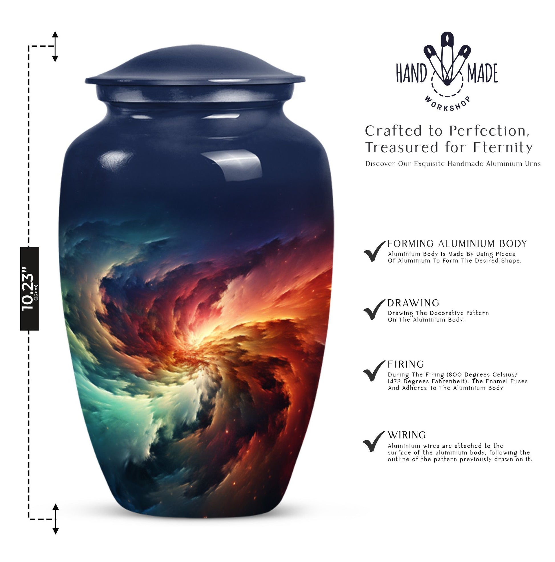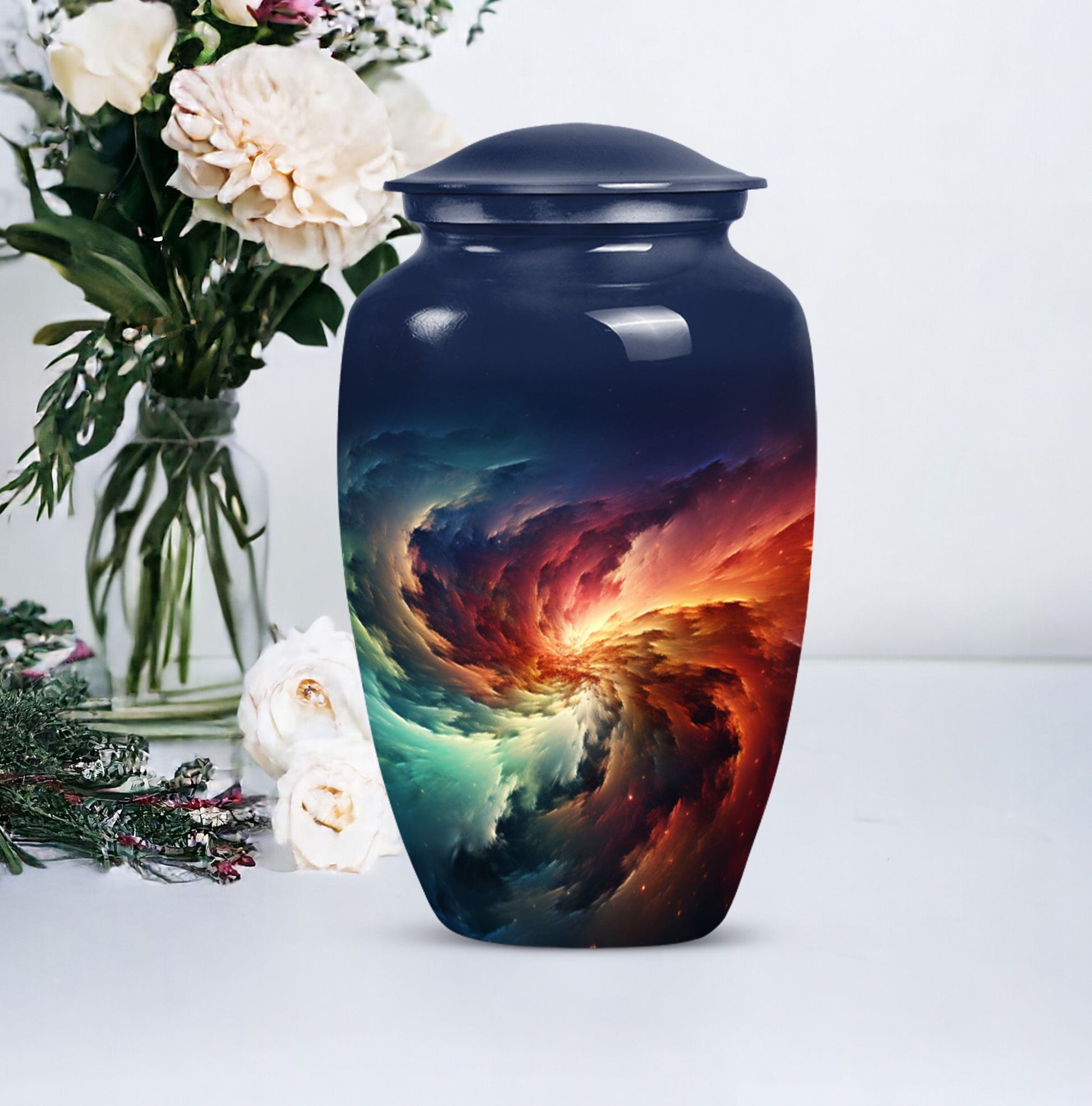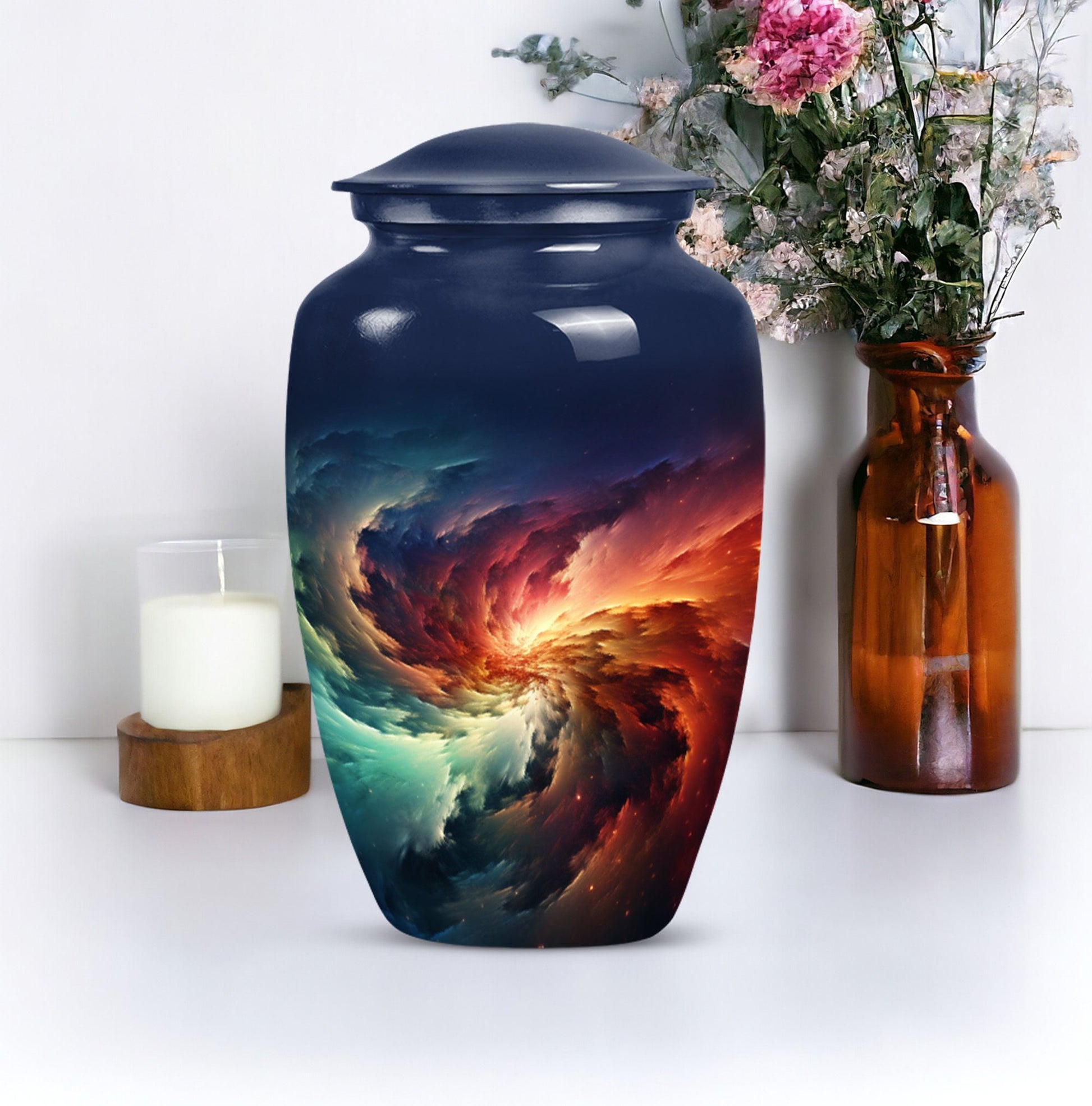 Relive the fond memories of your cherished ones with our 'Galaxy Urn,' a 10-inch funeral urn thoughtfully designed for precious memorials. This classic urn, featuring a mesmerizing 'Purple Meadow' theme, brings a comforting presence while complementing any decor. Our urn is a sizable vessel offering a capacity of 200 cubic inches, suitable for both men and women, distinguishing it from standard memorial urns. It weighs a secure 3.3 pounds and is made of resilient aluminium, promising lasting durability. The package provides a plush velvet pouch for the respectful containment of ashes. Personalize and pay your unique tribute by engraving names on it. This product positions itself as an exquisite part of the memorial ceremony supplies that add eternal value to your heartfelt commemoration. It stands as a beautifully shaped tribute to the unforgettable memories cherished. Please note, our 'Glaaxy Urn,' is not just an urn, it’s a respectful homage enfolded in an elegant and timeless design.