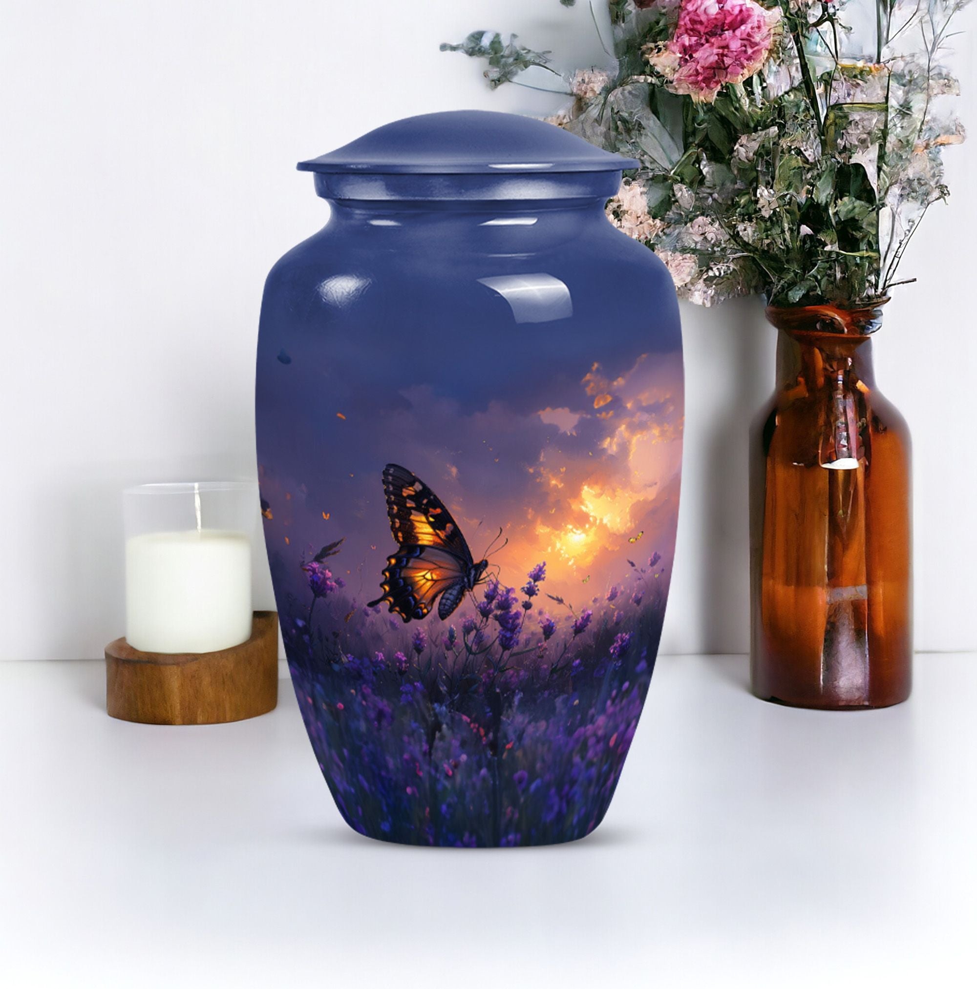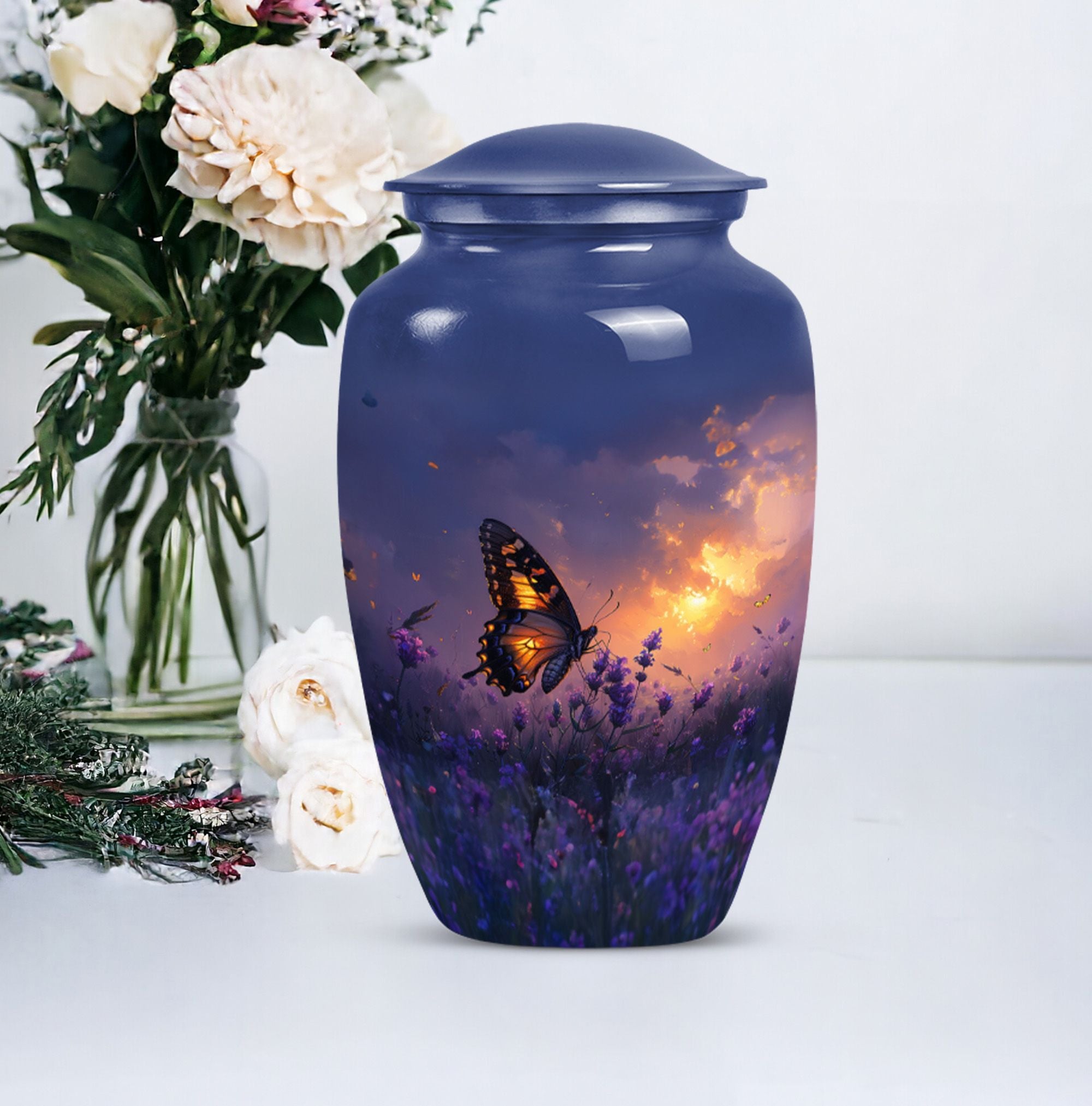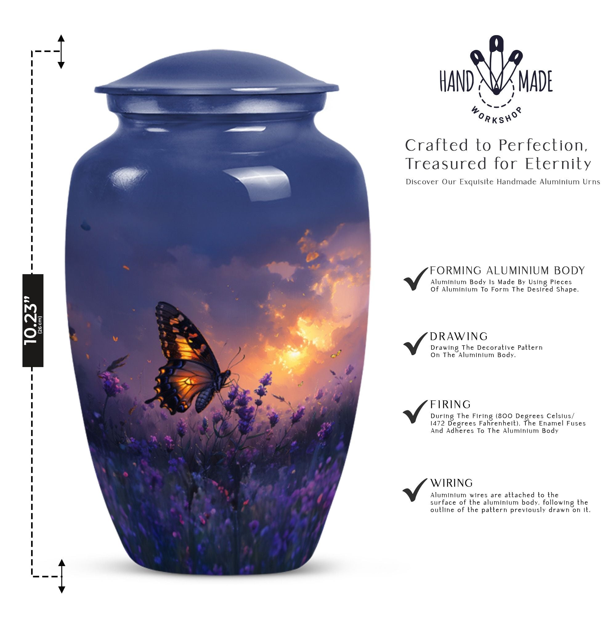 Experience serenity and reverence with our 'Purple Meadow Urn', an exquisite fusion of mystic lavenders' tranquility and nature's eternal beauty. Crafted from robust aluminium, this 10-inch large urn is your perfect choice for a respectful final tribute. It's characteristics of lightness with weight at 3.3 pounds, yet sturdiness mirror the virtues of the loved ones you wish to forever keep in your memory. With an admirable capacity of 200 cubic inches, this traditional 'Classic Urn' design provides a substantial space for adult ashes. Personalize your tribute urn with engraved names to honor your departed loved ones. As a bonus, we include a velvet pouch for containment of ashes to provide an extra layer of protection. In search of burial funeral urns for adult ashes women or human urn adult ash woman, your quest ends here. Our 'Purple Meadow Urn' is the aesthetically pleasing and respectful retreat your cherished ones deserve.
