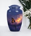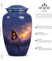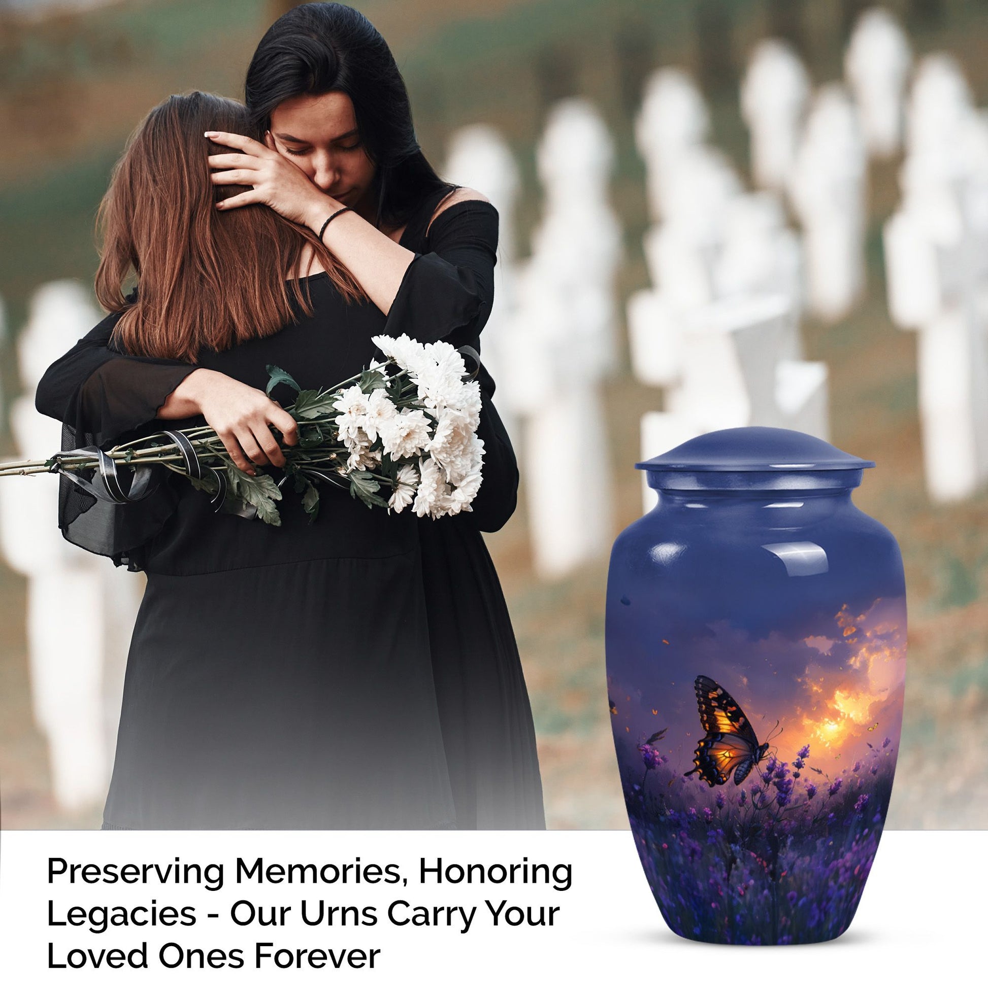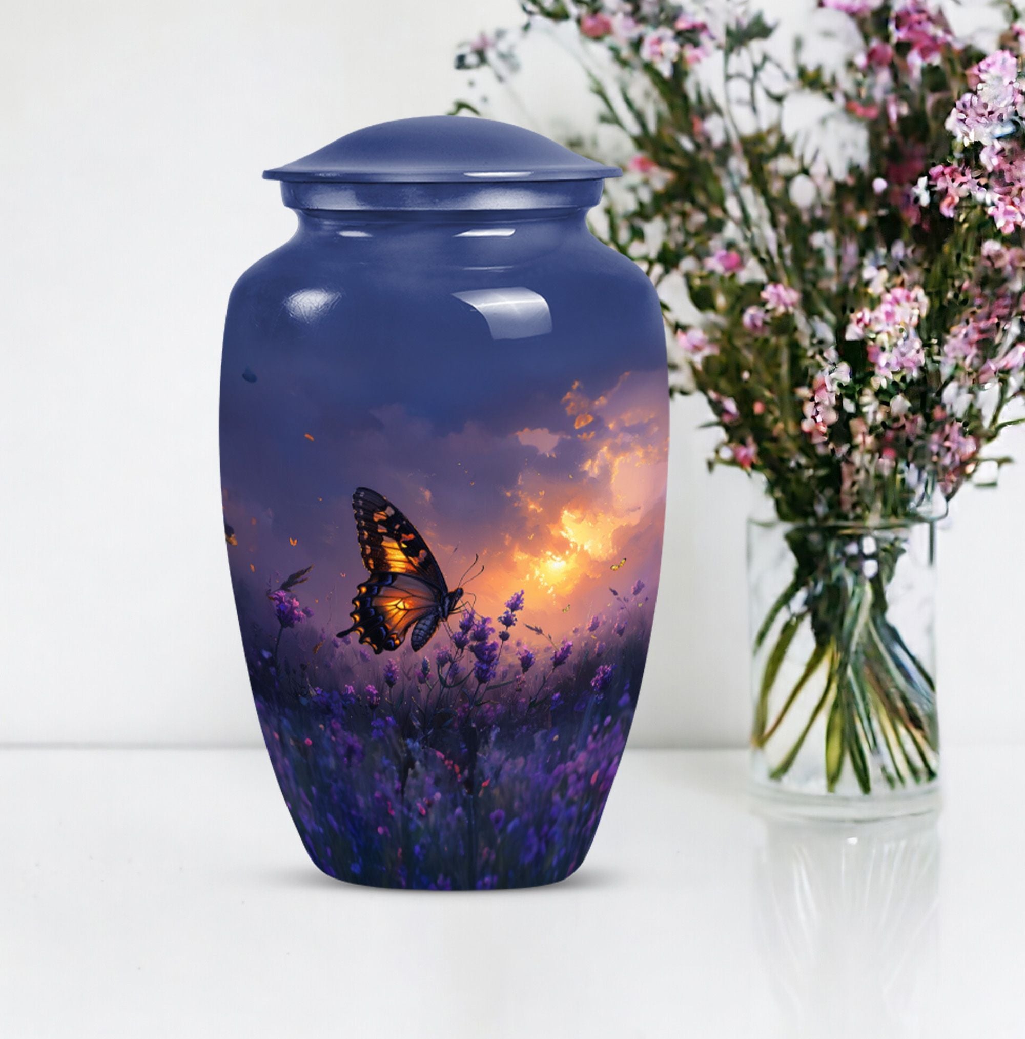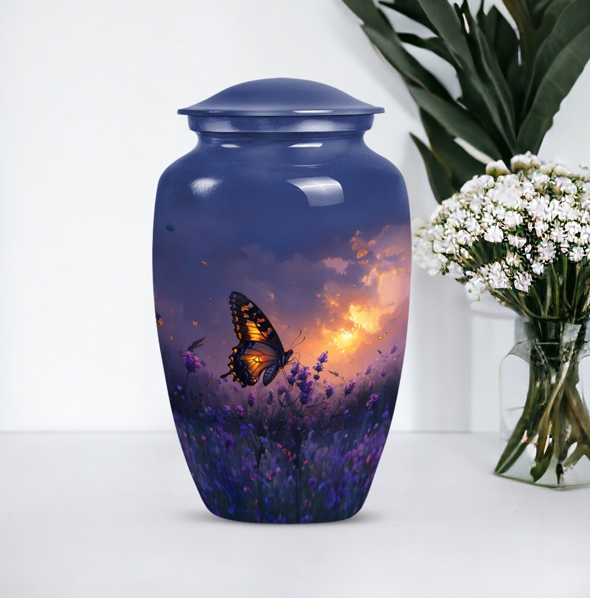 Experience serenity and reverence with our 'Purple Meadow Urn', an exquisite fusion of mystic lavenders' tranquility and nature's eternal beauty. Crafted from robust aluminium, this 10-inch large urn is your perfect choice for a respectful final tribute. It's characteristics of lightness with weight at 3.3 pounds, yet sturdiness mirror the virtues of the loved ones you wish to forever keep in your memory. With an admirable capacity of 200 cubic inches, this traditional 'Classic Urn' design provides a substantial space for adult ashes. Personalize your tribute urn with engraved names to honor your departed loved ones. As a bonus, we include a velvet pouch for containment of ashes to provide an extra layer of protection. In search of burial funeral urns for adult ashes women or human urn adult ash woman, your quest ends here. Our 'Purple Meadow Urn' is the aesthetically pleasing and respectful retreat your cherished ones deserve.