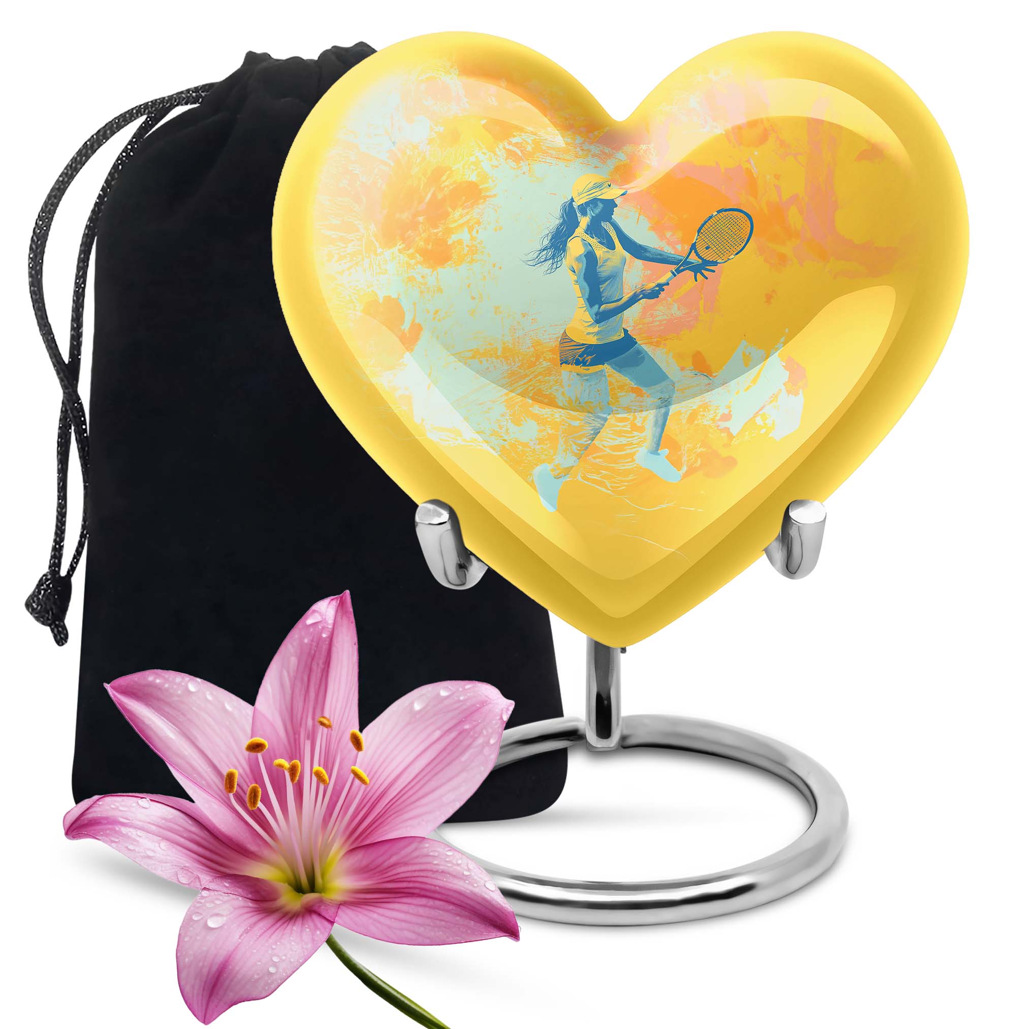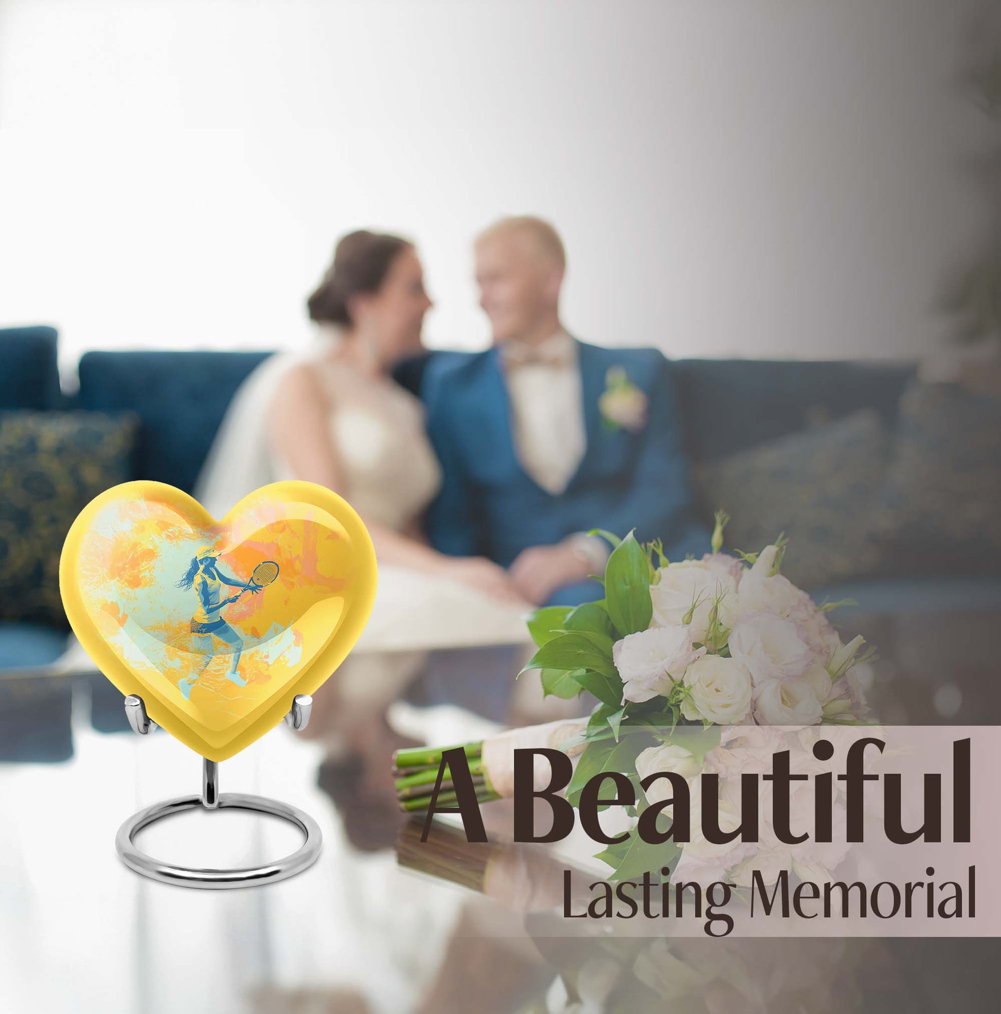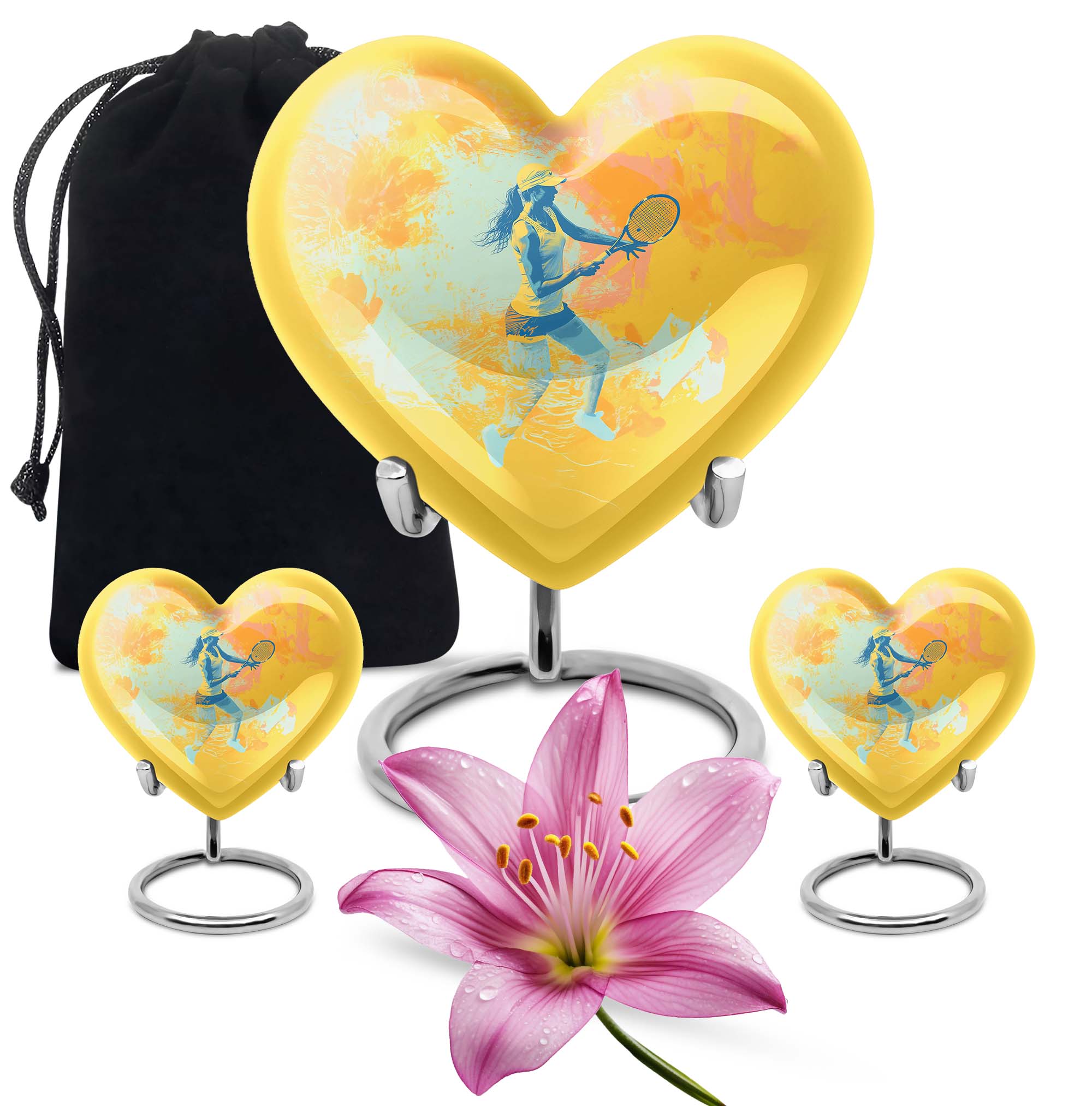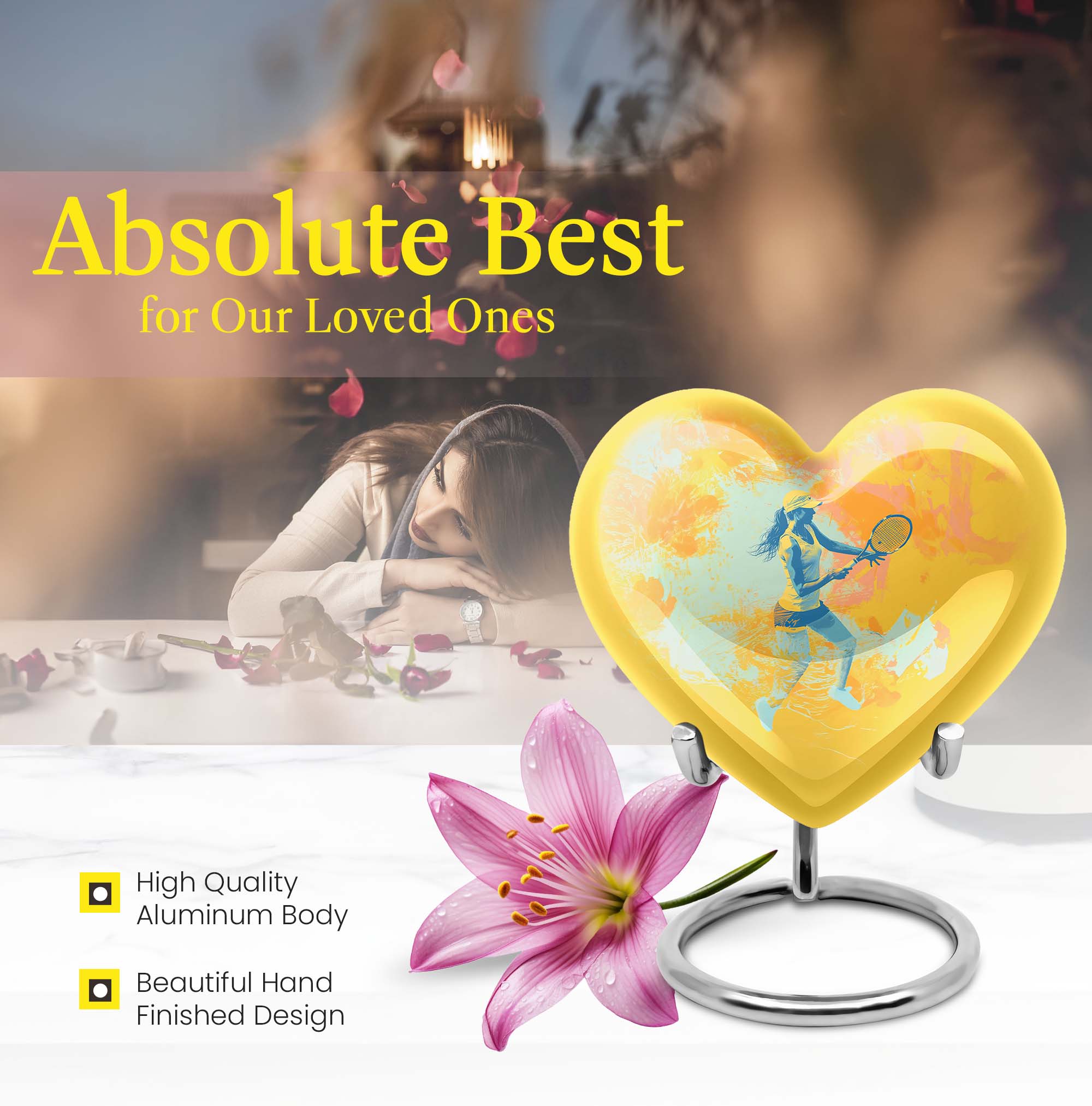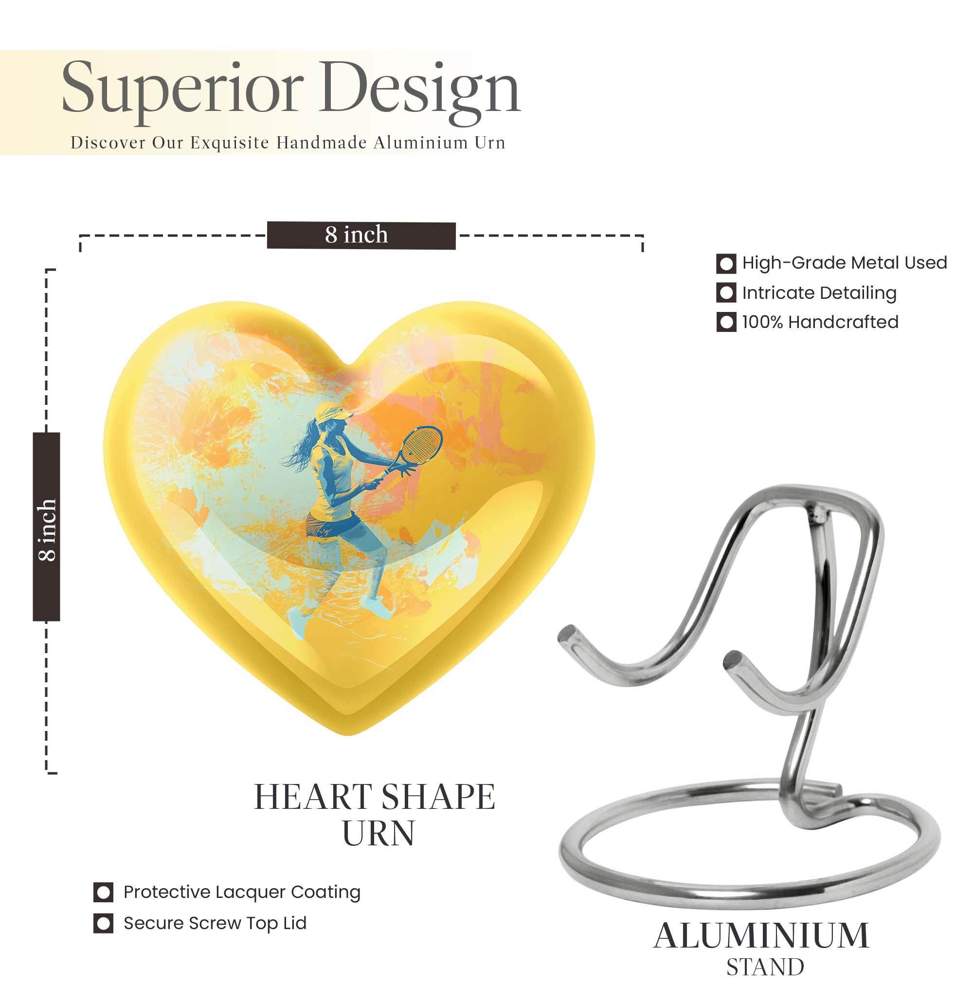 Honor and cherish your loved ones with this gorgeous 10 Inch heart tennis urn, perfectly handcrafted for the solemn matter of holding ashes. This stunning Purple Meadow-themed urn acts as a large-sized memorial, possessing the capacity to safely contain up to 200 cubic inches of ashes. Weighing a mere 3.3 pounds, this cremation urn for ashes is constructed from hearty and enduring Aluminium material to last generations. With every purchase, a plush velvet pouch is included, perfect for the secure containment of the sacred ashes within. Gracing the urn's design is an intricate and loving heart shape, symbolic of the limitless love shared with the departed. For added meaning, this timeless artifact offers the option for personal customization; immortalize their name through tasteful engraving. This item doesn't confine only to burial urns for adult female ashes; it can respectfully hold the cherished remains of any loved adult. It seamlessly blends traditional symbolism with a modern design, making it a perfect metal mandir for many homes. Incorporating the use of memorial urns into your remembrance ceremony adds a touch of elegance and reverence to the solemn occasion. This beautiful and solemn heart urn serves as a meaningful tribute while providing a serene resting place for precious ashes.