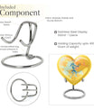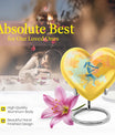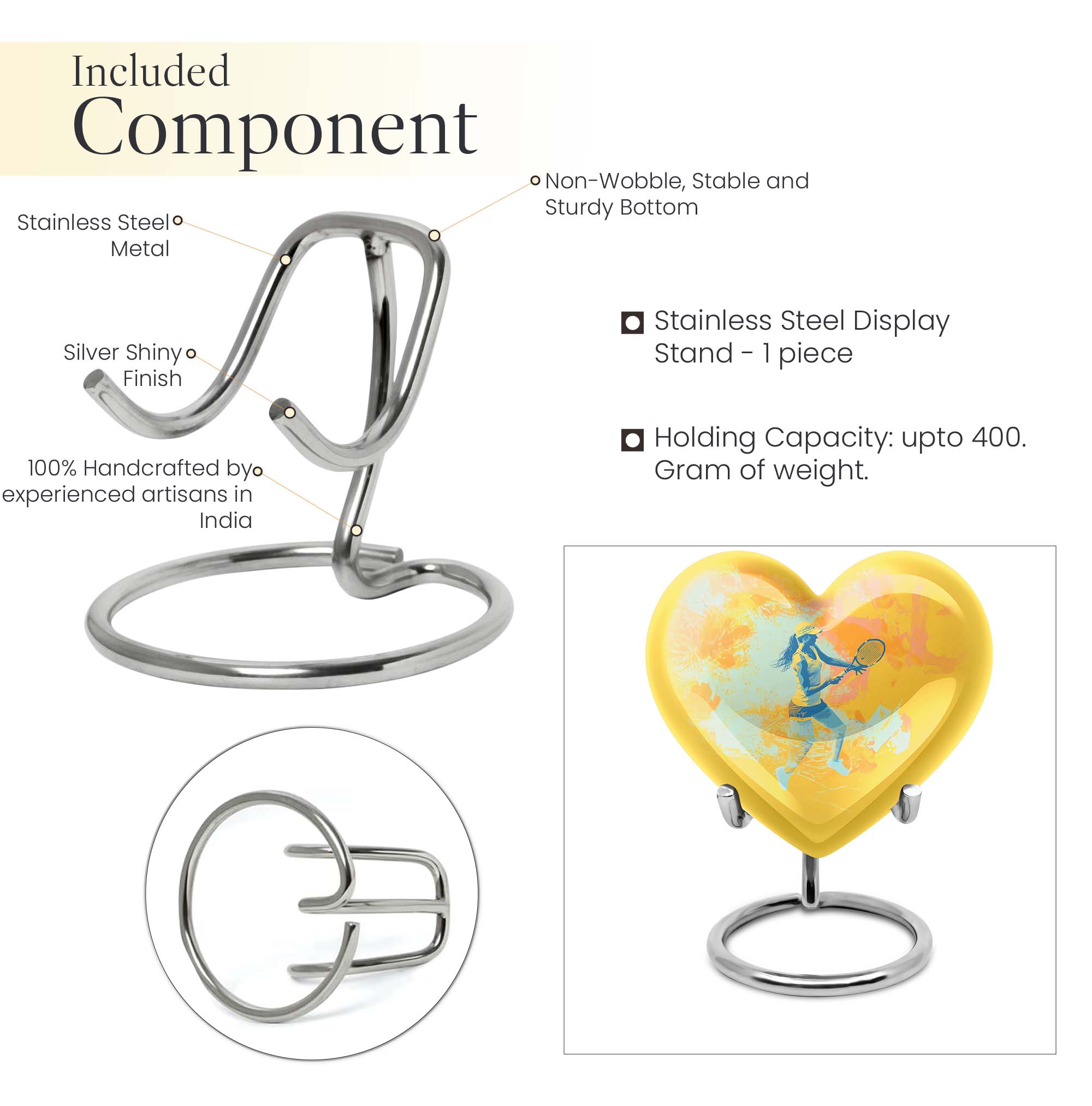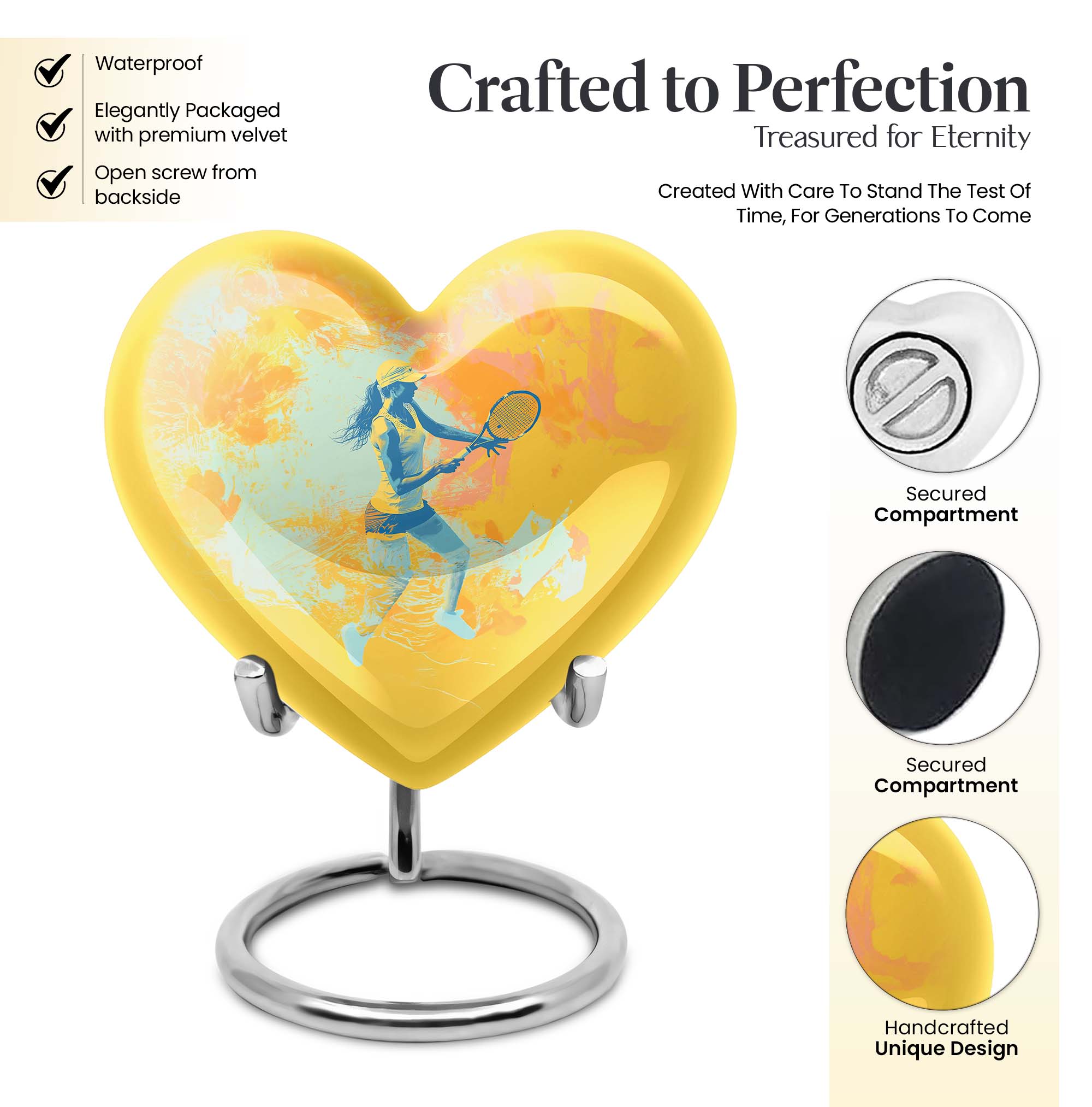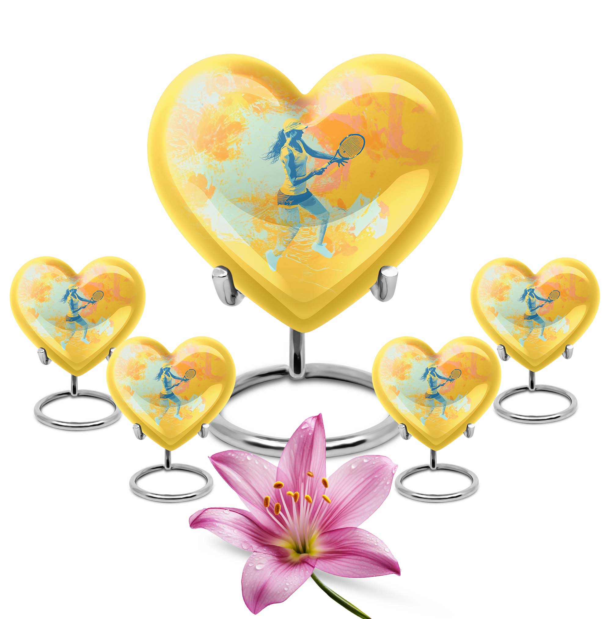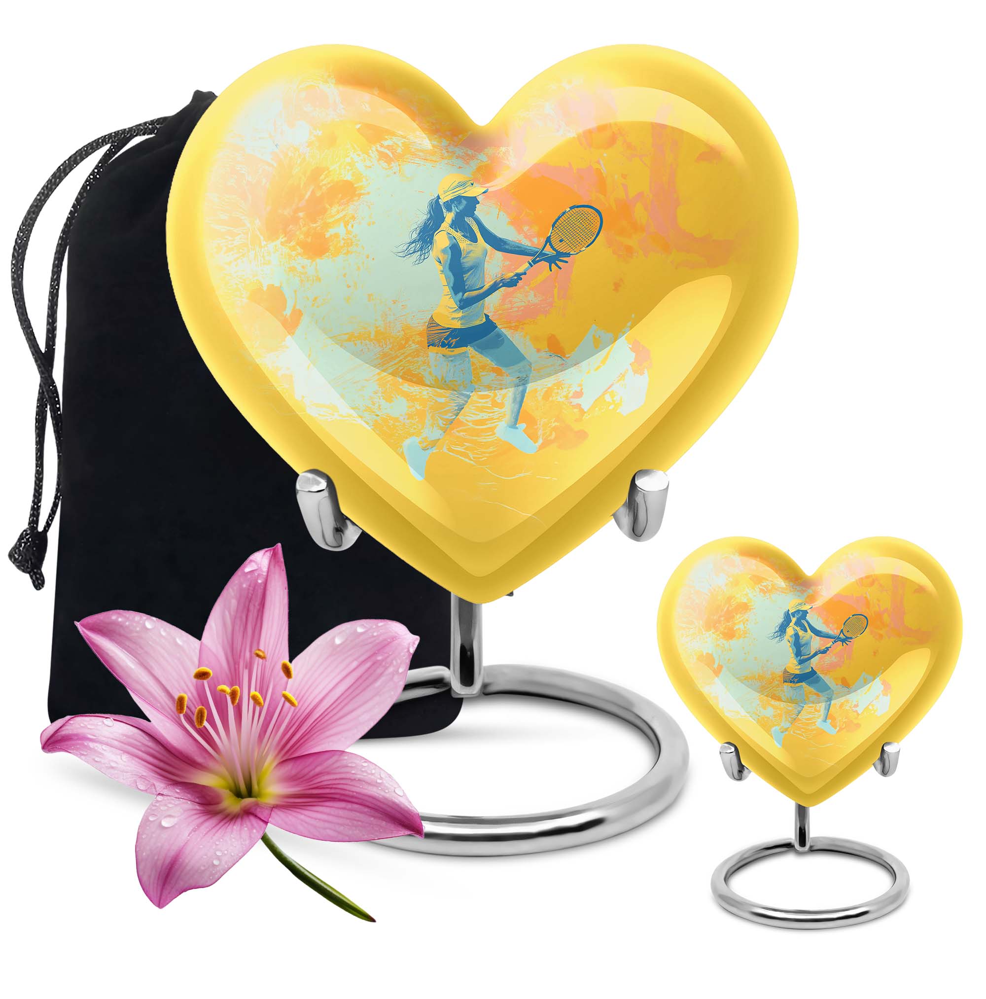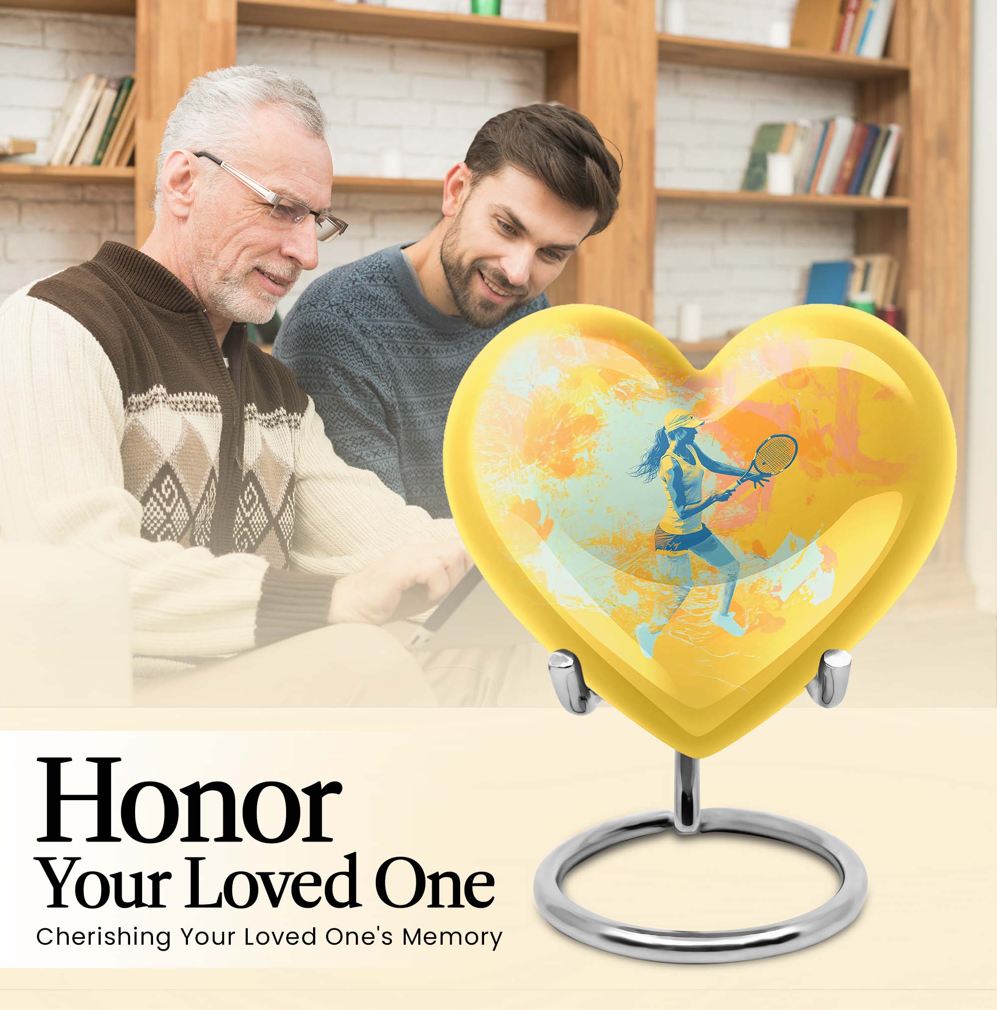 Honor and cherish your loved ones with this gorgeous 10 Inch heart tennis urn, perfectly handcrafted for the solemn matter of holding ashes. This stunning Purple Meadow-themed urn acts as a large-sized memorial, possessing the capacity to safely contain up to 200 cubic inches of ashes. Weighing a mere 3.3 pounds, this cremation urn for ashes is constructed from hearty and enduring Aluminium material to last generations. With every purchase, a plush velvet pouch is included, perfect for the secure containment of the sacred ashes within. Gracing the urn's design is an intricate and loving heart shape, symbolic of the limitless love shared with the departed. For added meaning, this timeless artifact offers the option for personal customization; immortalize their name through tasteful engraving. This item doesn't confine only to burial urns for adult female ashes; it can respectfully hold the cherished remains of any loved adult. It seamlessly blends traditional symbolism with a modern design, making it a perfect metal mandir for many homes. Incorporating the use of memorial urns into your remembrance ceremony adds a touch of elegance and reverence to the solemn occasion. This beautiful and solemn heart urn serves as a meaningful tribute while providing a serene resting place for precious ashes.