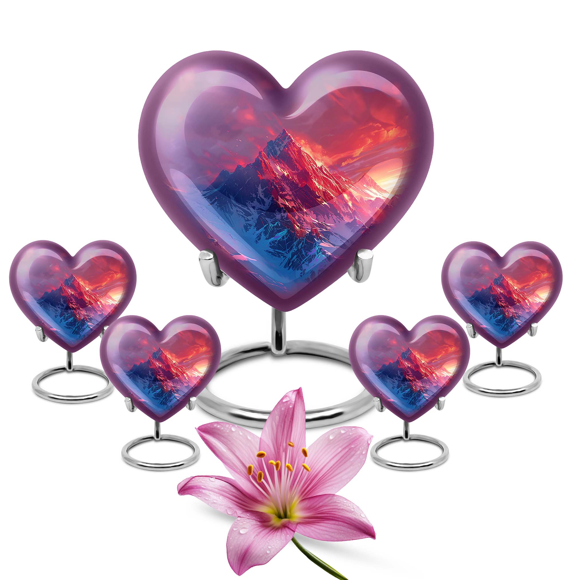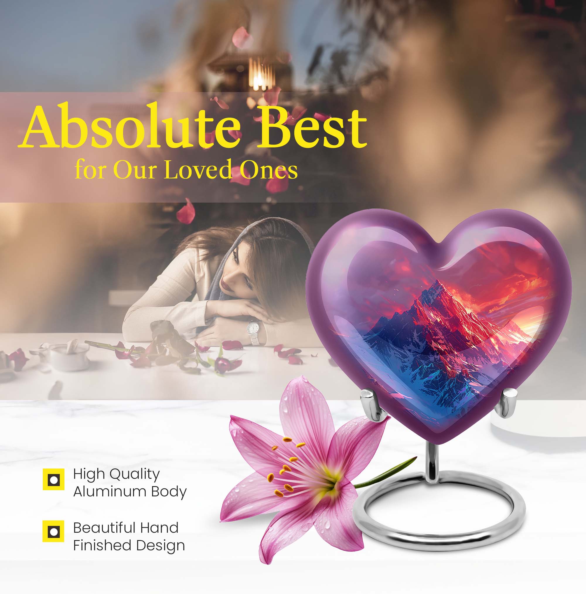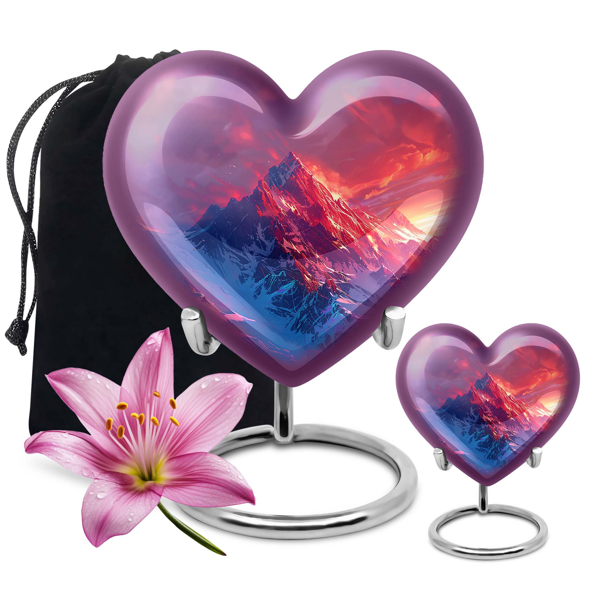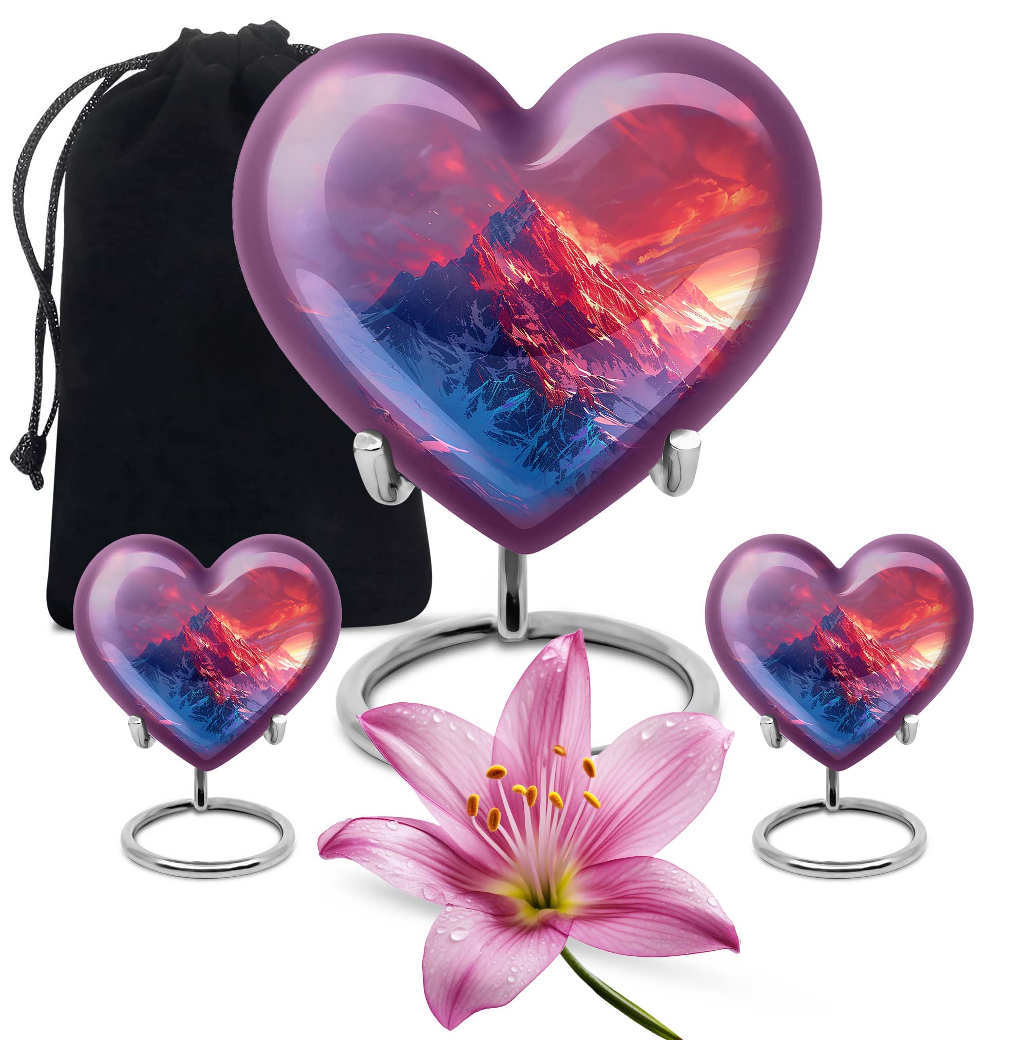 Experience the tranquillity of a purple meadow with the MOUNTAINS Urn, a distinct cremation urn for ashes specifically designed for adult females. This heart-shaped urn, standing a stately 10 inches tall, integrates artistic vision with a comforting sense of connection for your loved ones. Crafted from the most durable aluminium, its beautiful theme is sure to capture the essence of your loved one. The MOUNTAINS Urn boasts a sturdy weight of 3.3 pounds and a generous capacity of 200 cubic inches, providing ample space for your loved one's ashes. Each urn comes complete with a velvet pouch, which aids in the serene containment and preservation of ashes. Adding to its uniqueness, you also have the option to personalize this urn with engraved names, making each urn a bespoke piece of memorial art. This large urn, created with profound respect and admiration for lives beautifully lived, is perfect for remembering, celebrating, and honouring those who have departed.