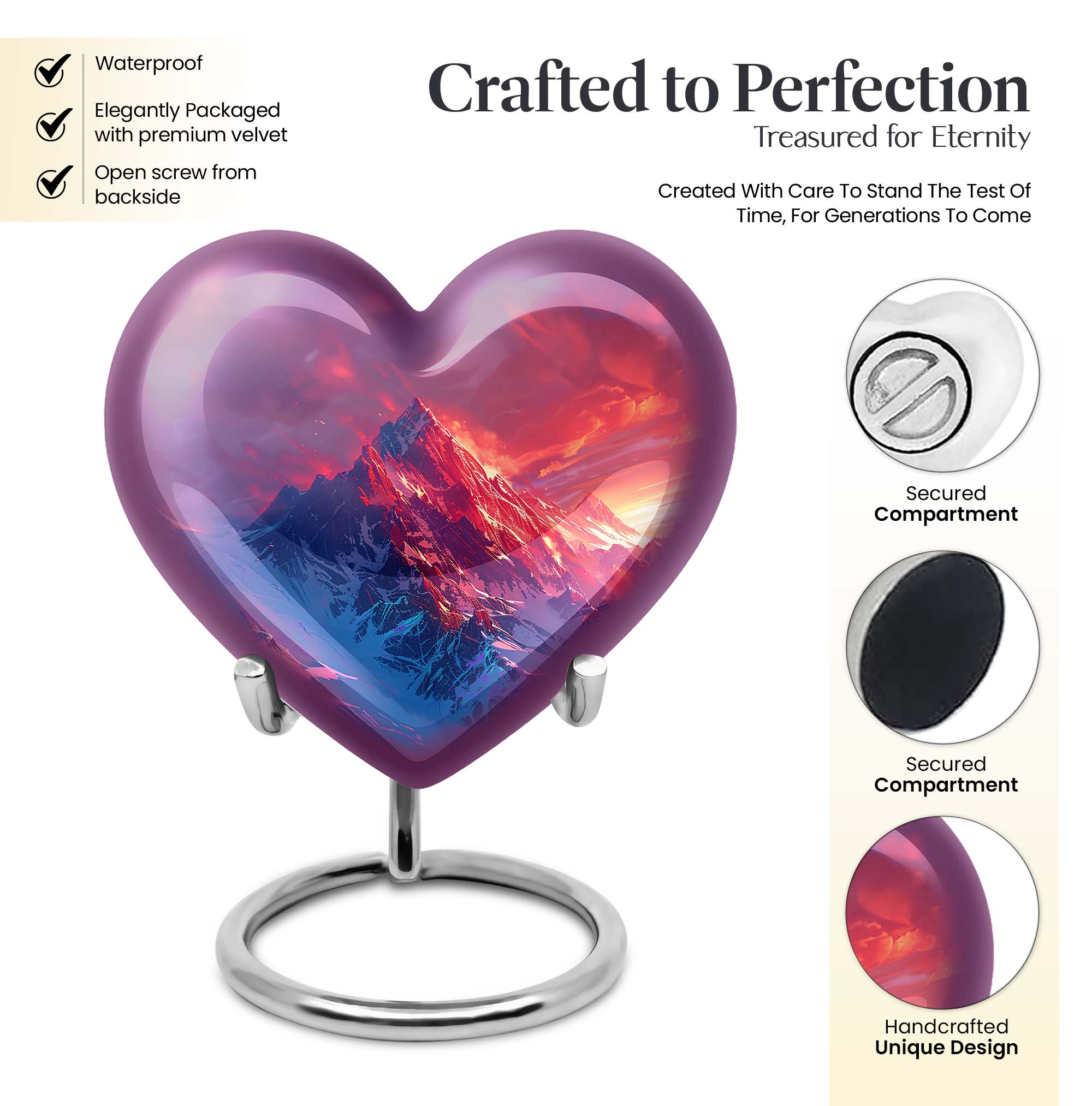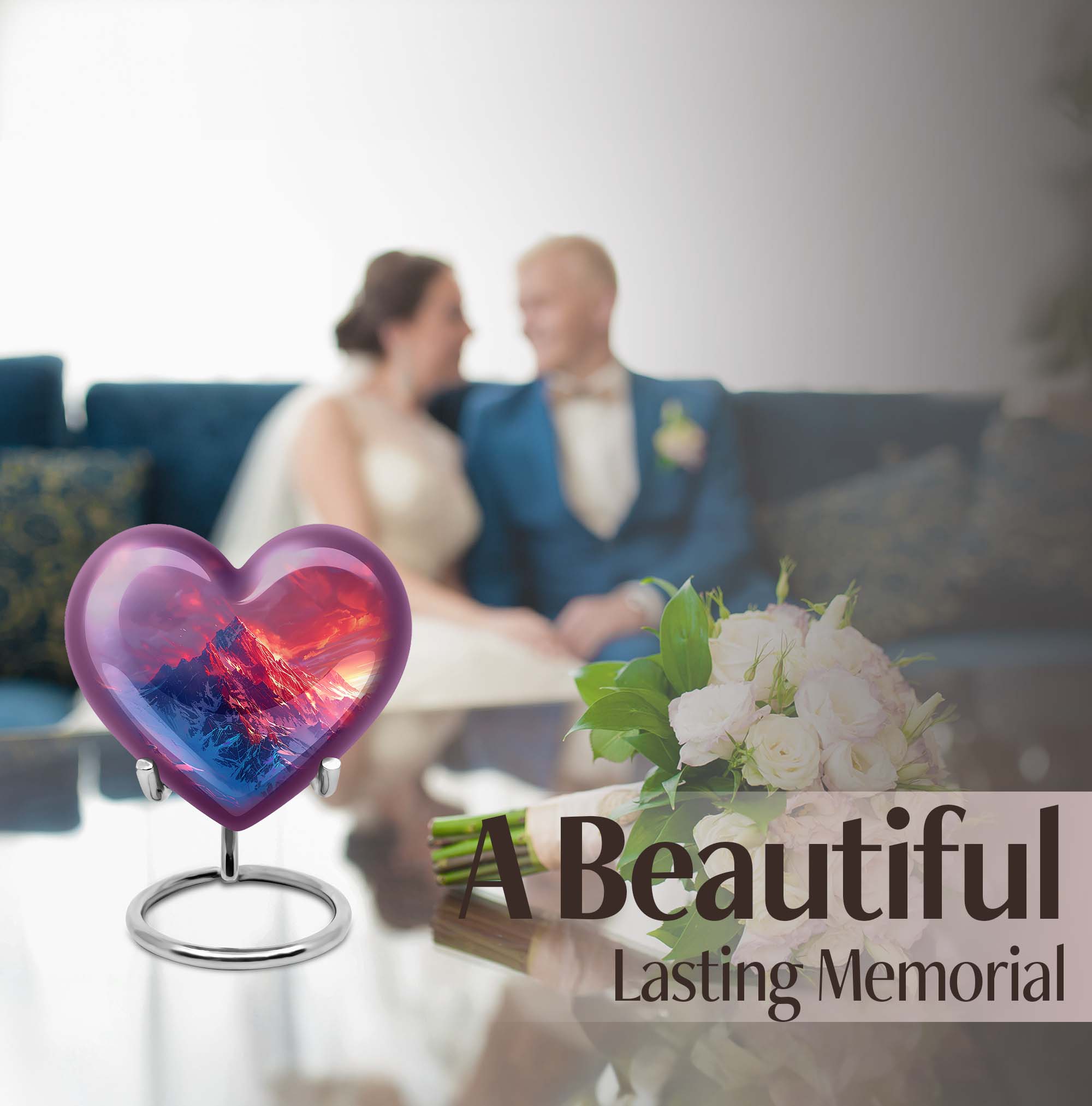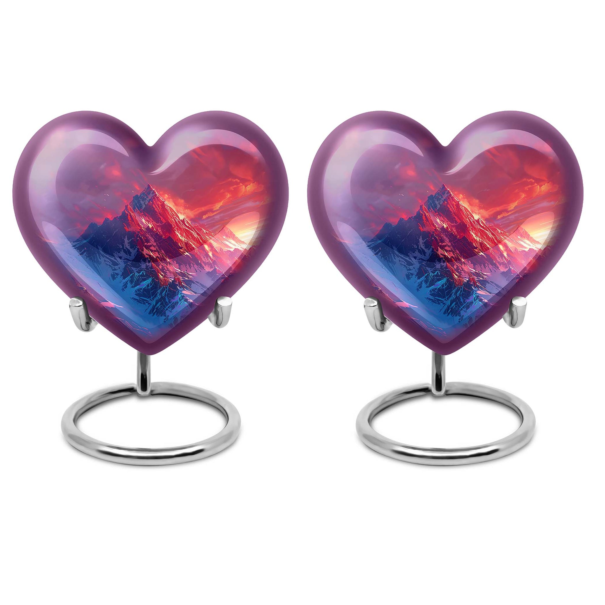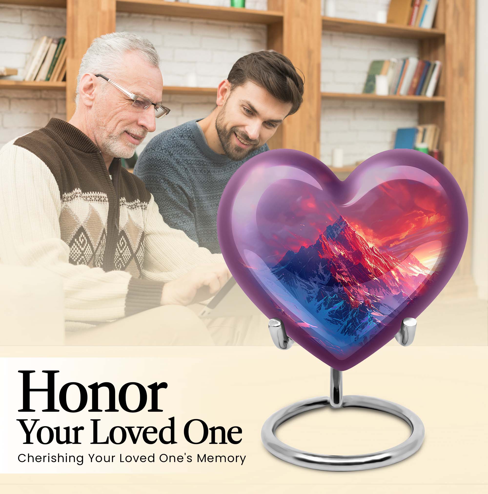 Experience the tranquillity of a purple meadow with the MOUNTAINS Urn, a distinct cremation urn for ashes specifically designed for adult females. This heart-shaped urn, standing a stately 10 inches tall, integrates artistic vision with a comforting sense of connection for your loved ones. Crafted from the most durable aluminium, its beautiful theme is sure to capture the essence of your loved one. The MOUNTAINS Urn boasts a sturdy weight of 3.3 pounds and a generous capacity of 200 cubic inches, providing ample space for your loved one's ashes. Each urn comes complete with a velvet pouch, which aids in the serene containment and preservation of ashes. Adding to its uniqueness, you also have the option to personalize this urn with engraved names, making each urn a bespoke piece of memorial art. This large urn, created with profound respect and admiration for lives beautifully lived, is perfect for remembering, celebrating, and honouring those who have departed.