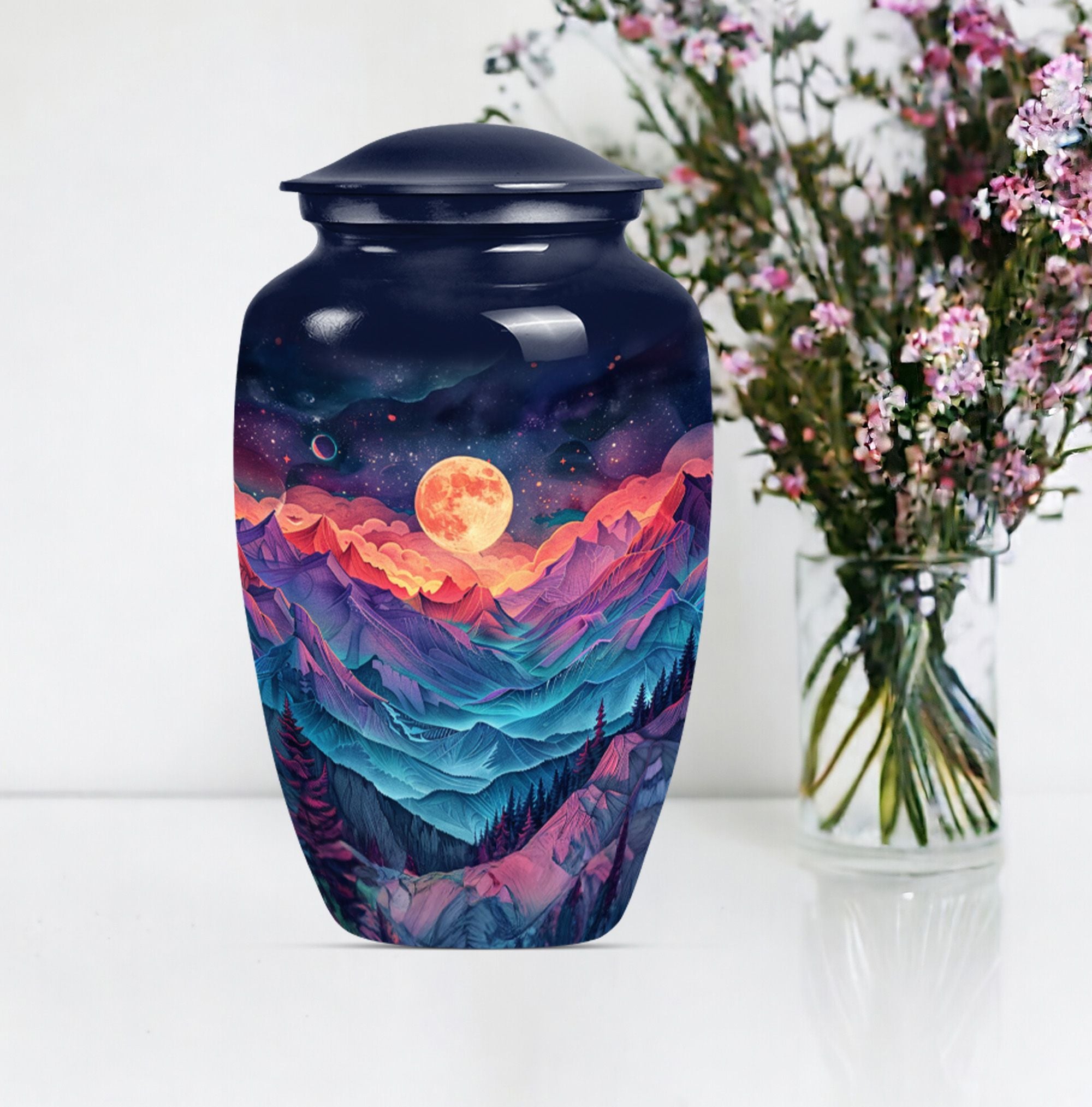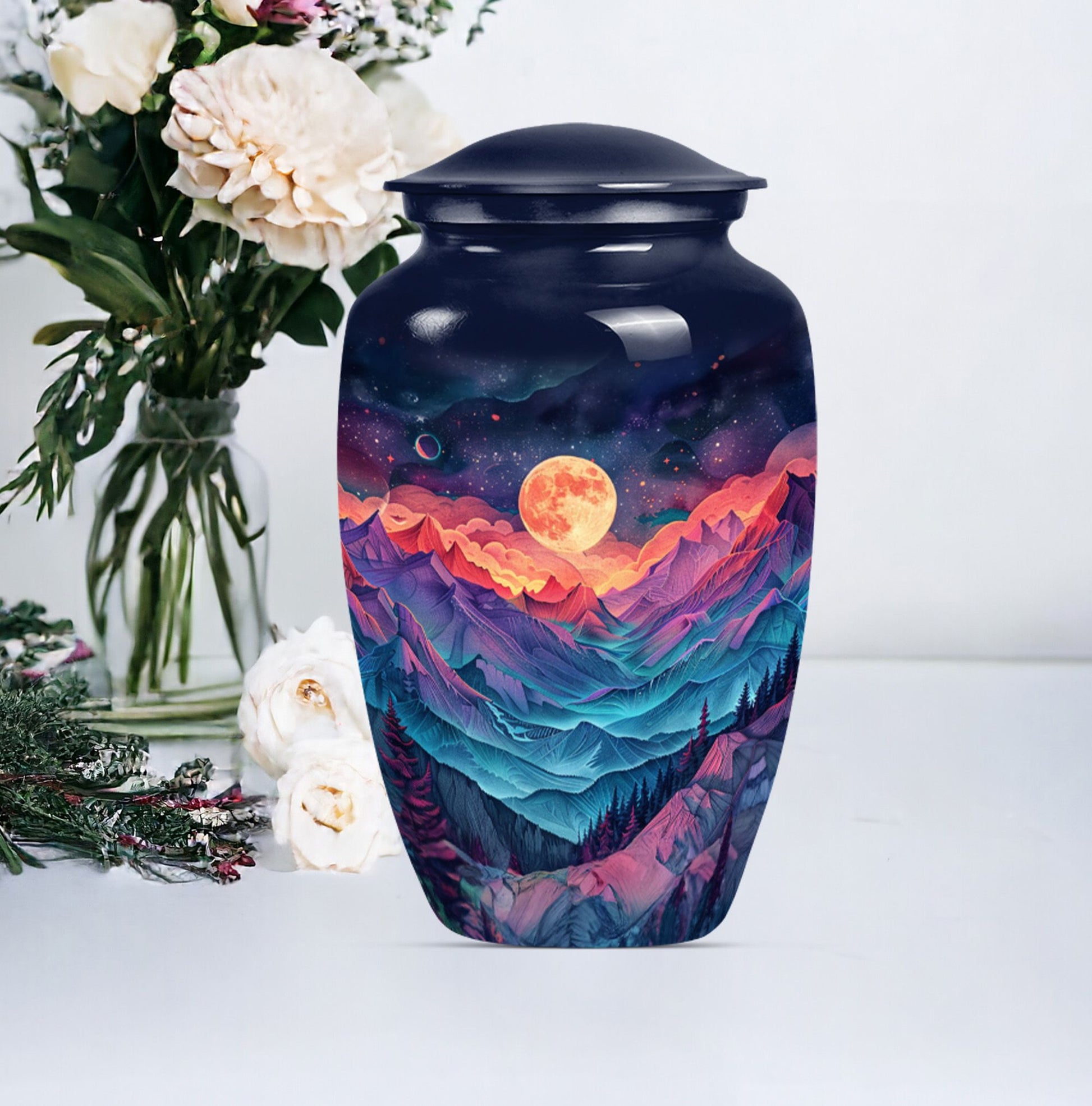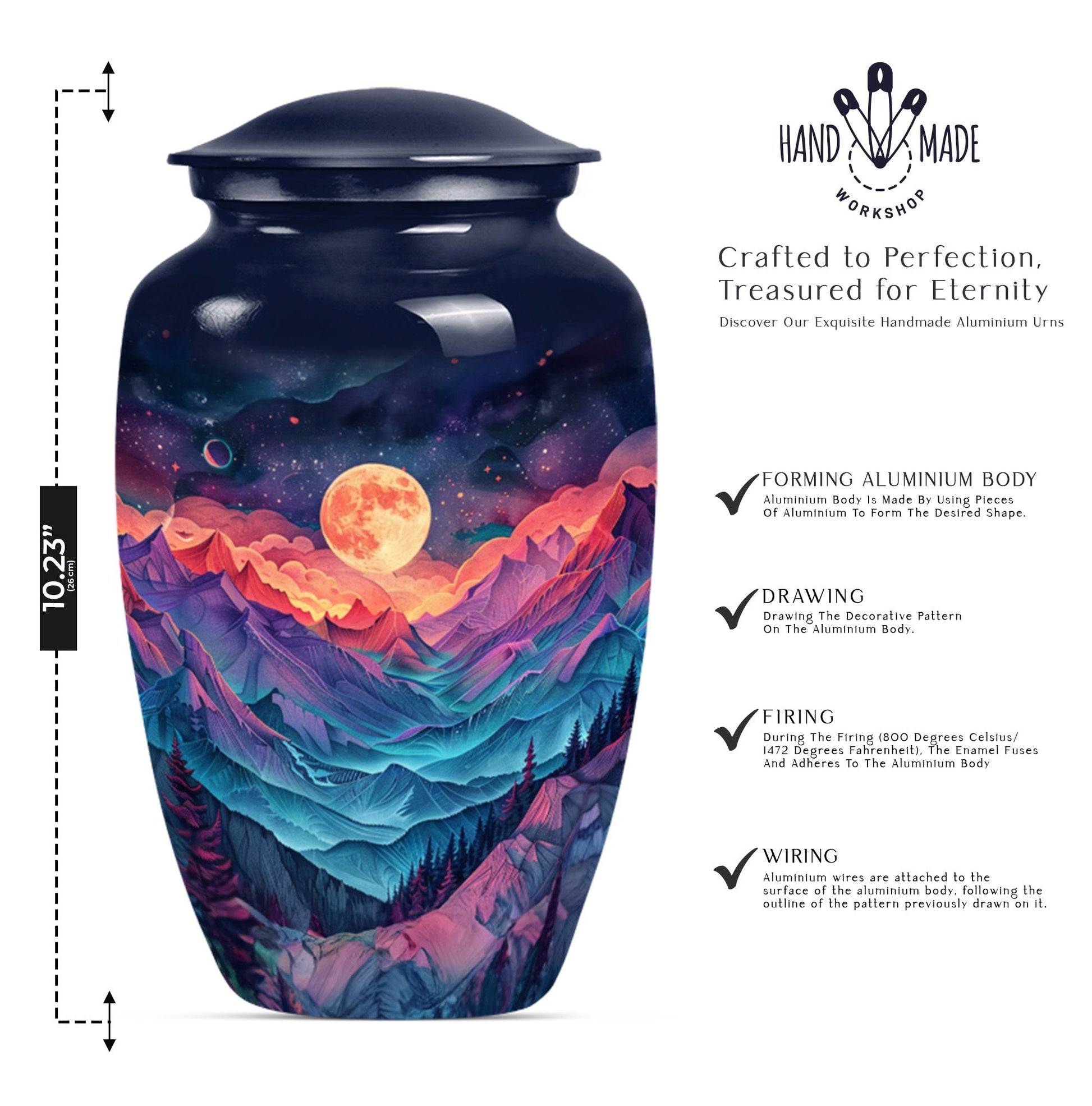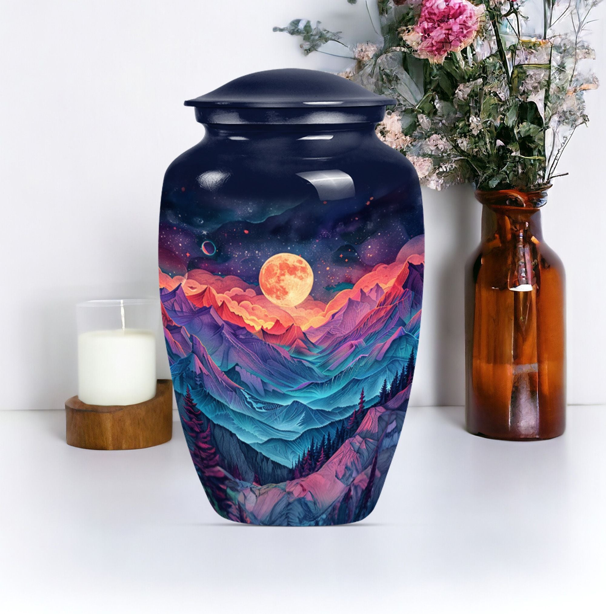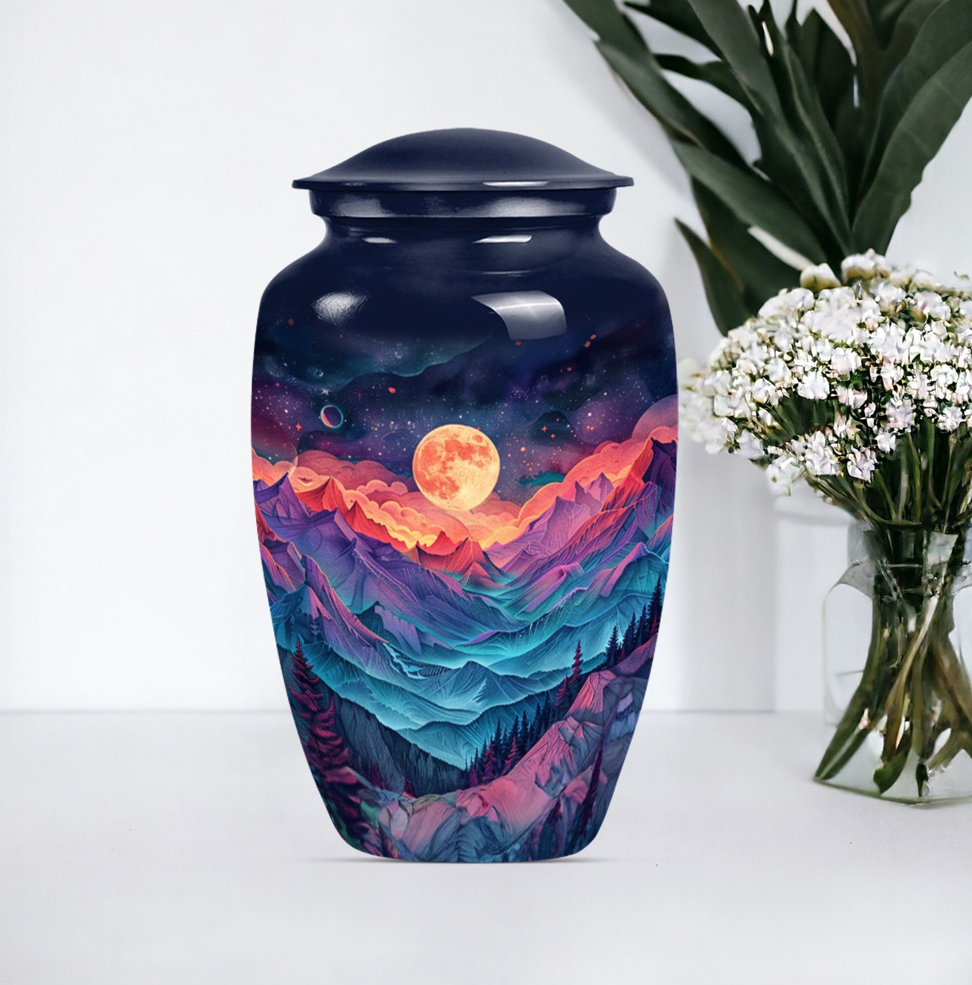 Introduce a reverential and peaceful solution to commemorate your precious ones with our MOUNTAINS Urn. Exquisitely conceived for seniors and adults, this burial large urn exhibits a timeless 'Classic Urn' theme that combines dignified presence and serene aesthetic, adorned with a magnificent 'Purple Meadow' decoration. Crafted thoughtfully from resilient Aluminium, this precious receptacle measures a stately 10 inches in height, and weights a sturdy 3.3 pounds. Providing ample volume of 200 cubic inches, this cremation urn can respectfully house the remains of your cherished. As an added measure of convenience, a plush velvet pouch is provided for containment of ashes, ensuring ease of preservation and handling. Indulge in the option of personalization and carry forward the legacy of your departed via engraved names, thus adding a heartfelt touch to their eternal memory. Our large urn is not only a memorial urn for ashes but also an embodiment of love and respect for the dearly departed.