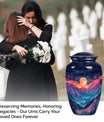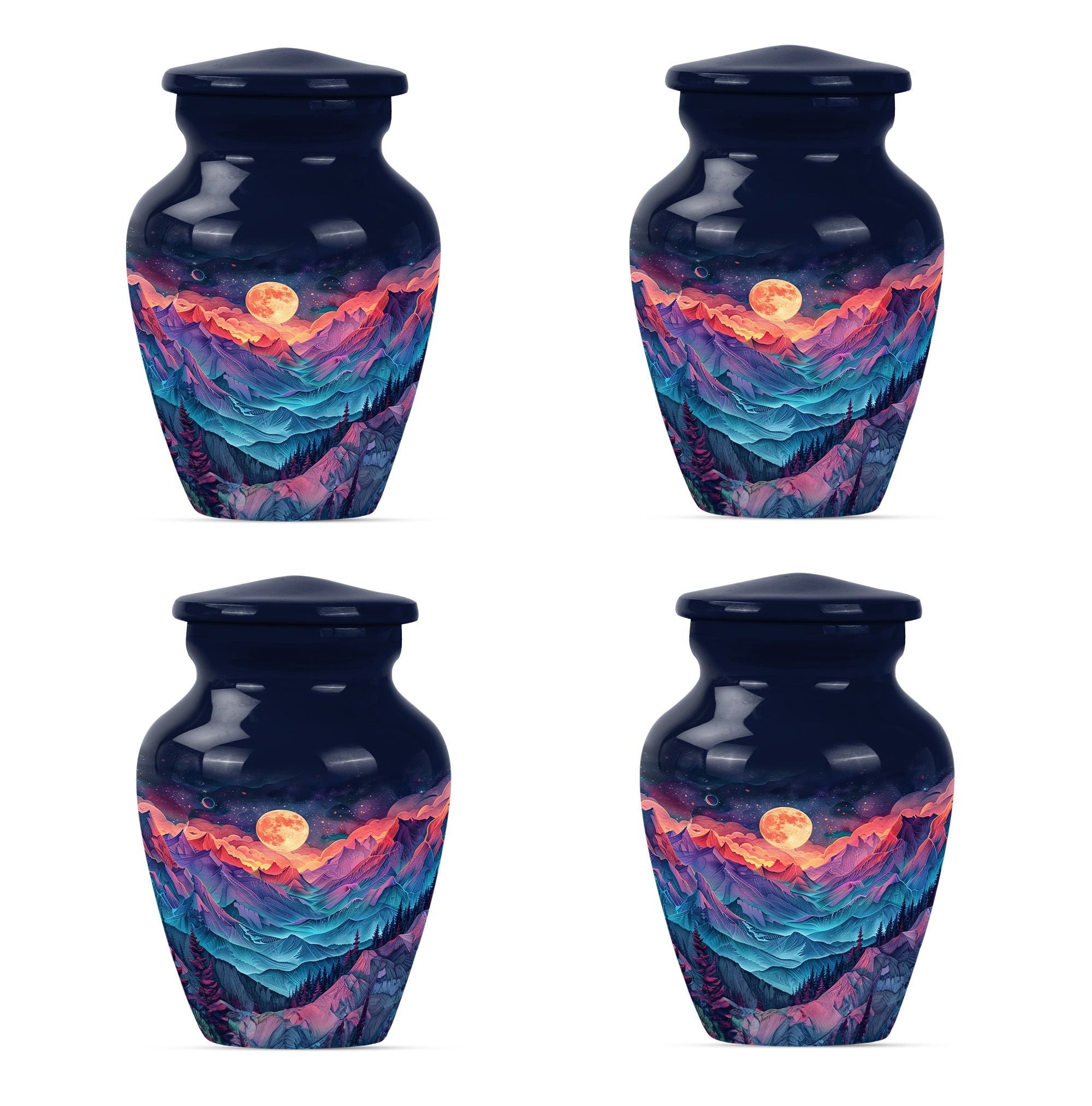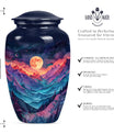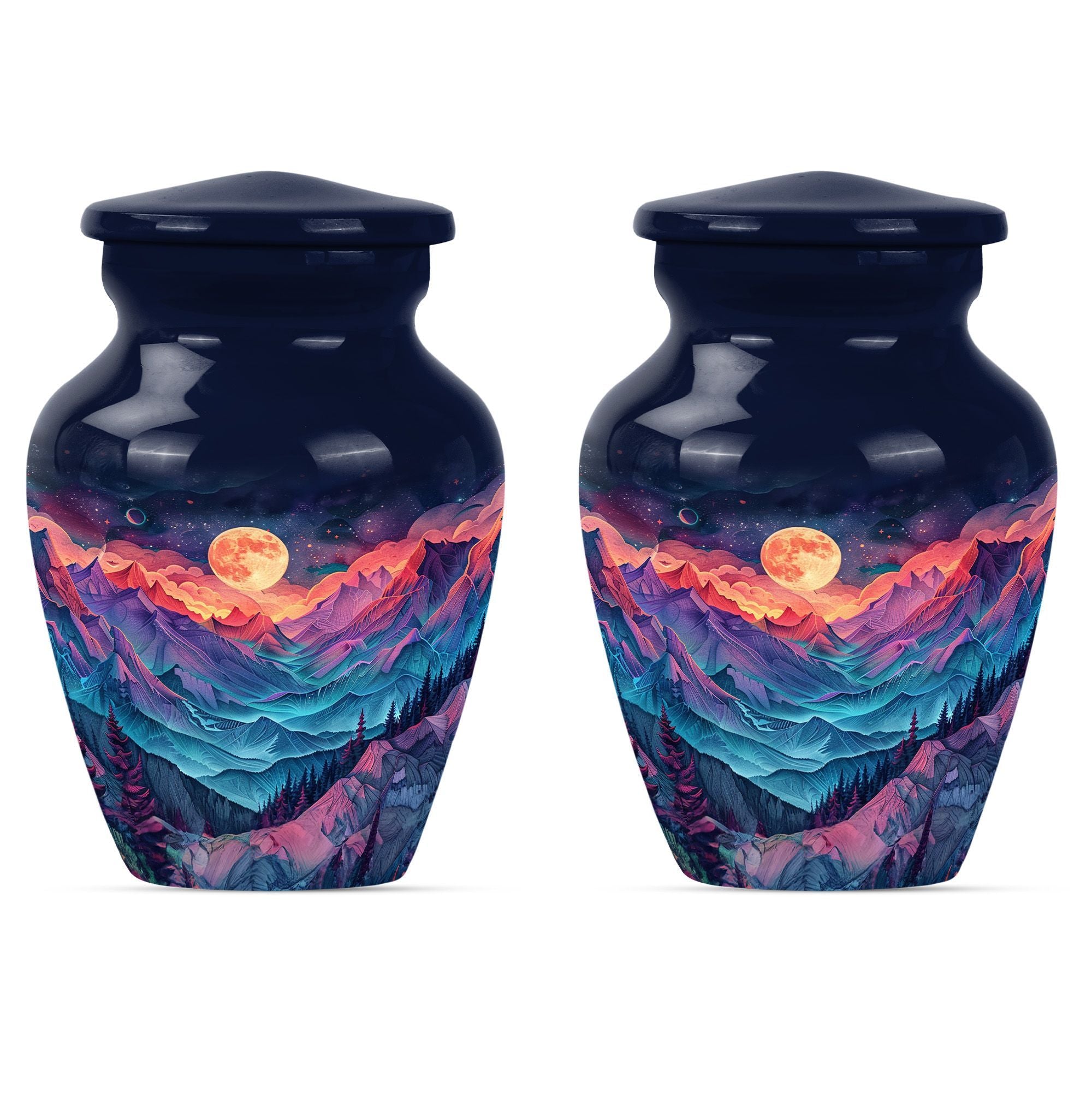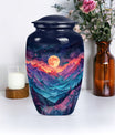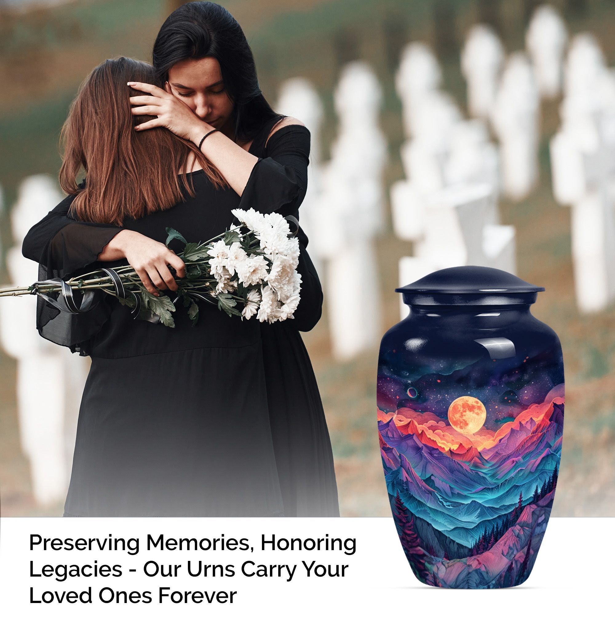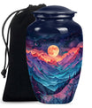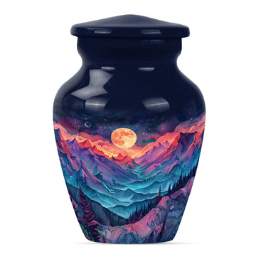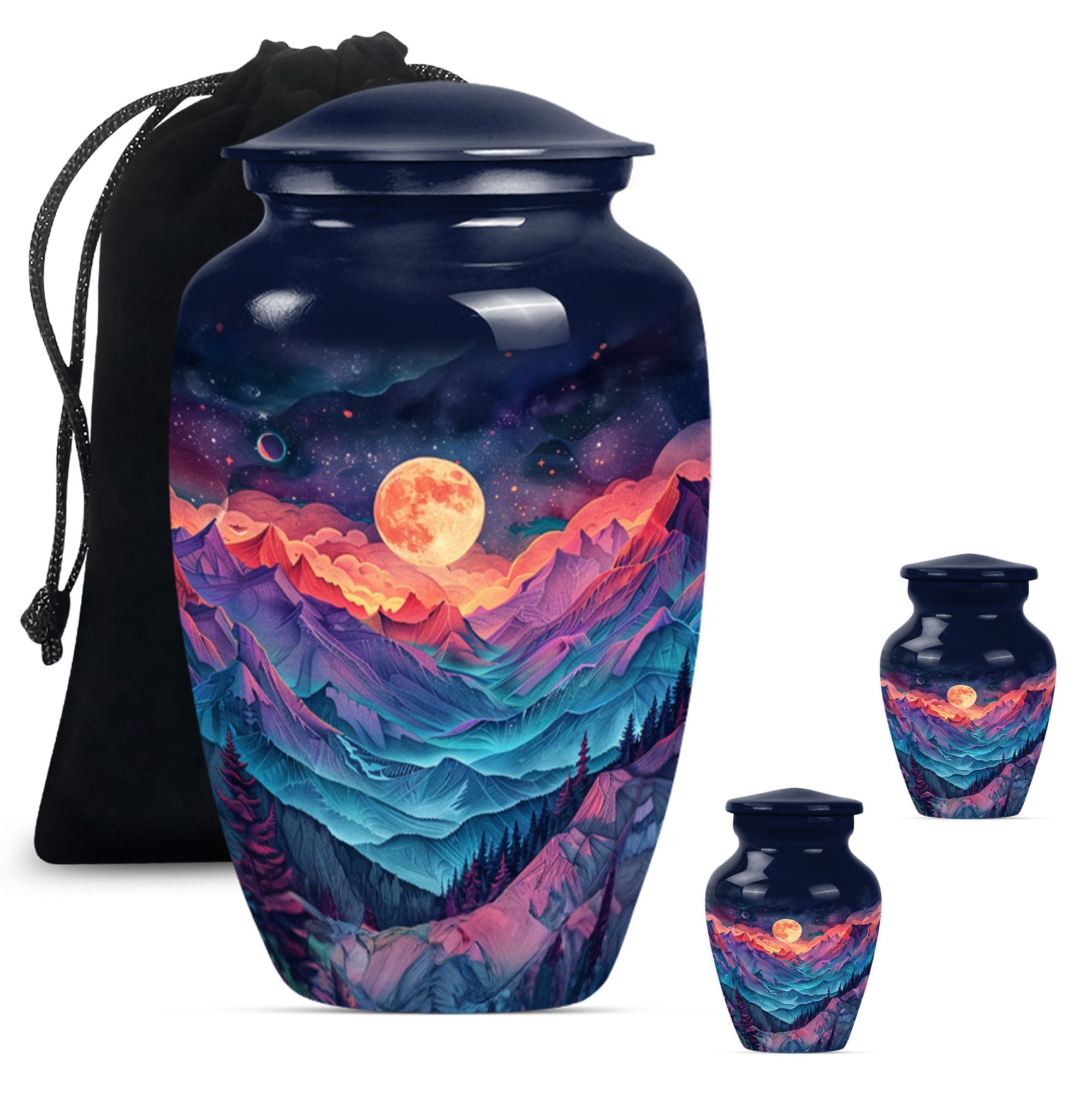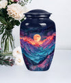 Introduce a reverential and peaceful solution to commemorate your precious ones with our MOUNTAINS Urn. Exquisitely conceived for seniors and adults, this burial large urn exhibits a timeless 'Classic Urn' theme that combines dignified presence and serene aesthetic, adorned with a magnificent 'Purple Meadow' decoration. Crafted thoughtfully from resilient Aluminium, this precious receptacle measures a stately 10 inches in height, and weights a sturdy 3.3 pounds. Providing ample volume of 200 cubic inches, this cremation urn can respectfully house the remains of your cherished. As an added measure of convenience, a plush velvet pouch is provided for containment of ashes, ensuring ease of preservation and handling. Indulge in the option of personalization and carry forward the legacy of your departed via engraved names, thus adding a heartfelt touch to their eternal memory. Our large urn is not only a memorial urn for ashes but also an embodiment of love and respect for the dearly departed.