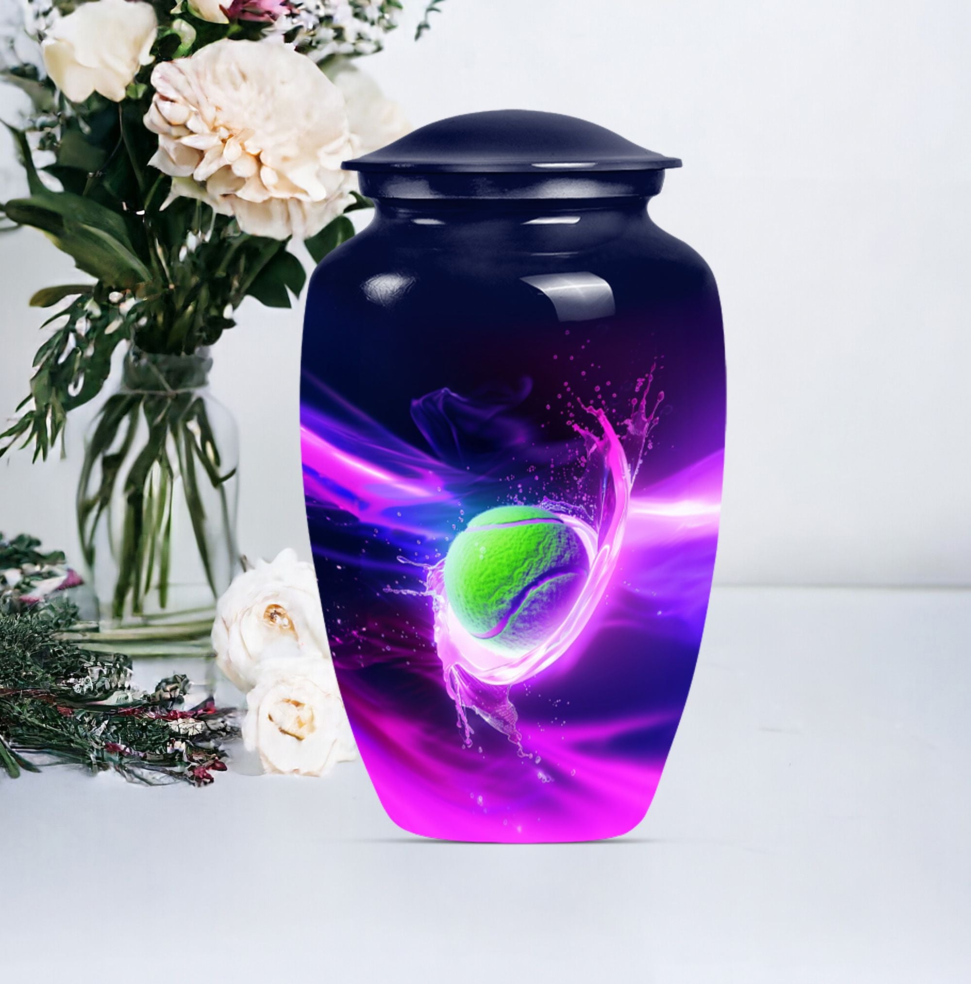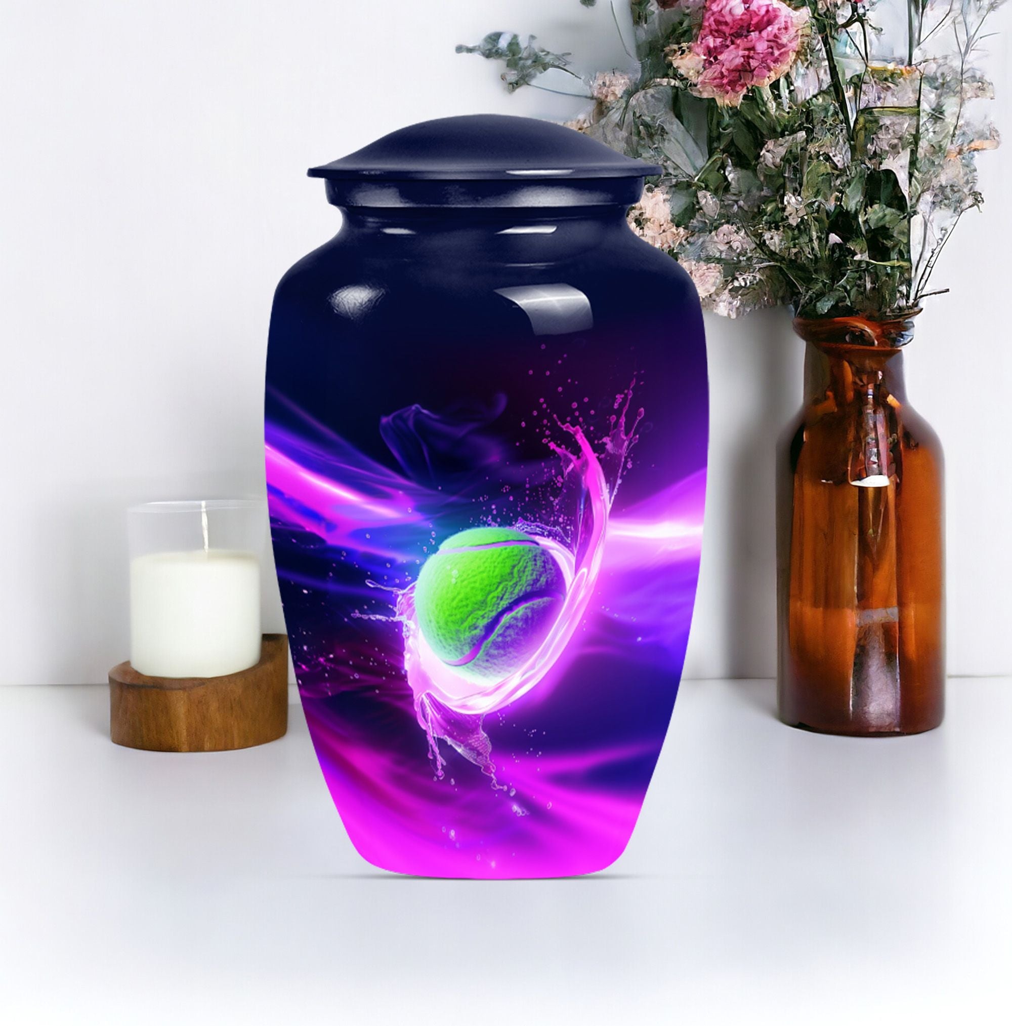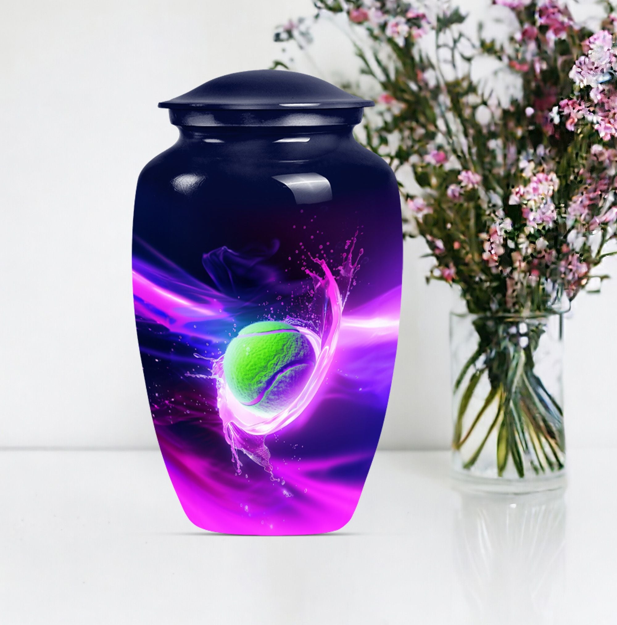 Our Purple Meadow, Large Tennis Urn brings a unique layer of respect to memorial ceremonies. This burial funeral urn for adult ashes has a dignified and sober theme that transcends time perfectly. Made from premium-grade Aluminium, it is durable and meticulously crafted to hold up to 200 cubic inches of ashes comfortably. Standing tall at 10 inches height and weighing just 3.3 pounds, its impressive size makes it a fitting tribute memory of your loved ones. The package also comes with a velvet pouch for containment of ashes, presenting the warming touch of tenderness to the proceedings. You can also make it that much personal with our offer to personalize each urn with engraved names. Embrace a tribute that speaks volumes of your love, choose our Purple Meadow, Classic Tennis Urn, for a memorable and fitting closure. Stand out keywords that are coherent with this product include 'Cremation large urn for ashes', 'ash adult ashes women', 'earn cremation', 'metal urns for burial in ground'.
