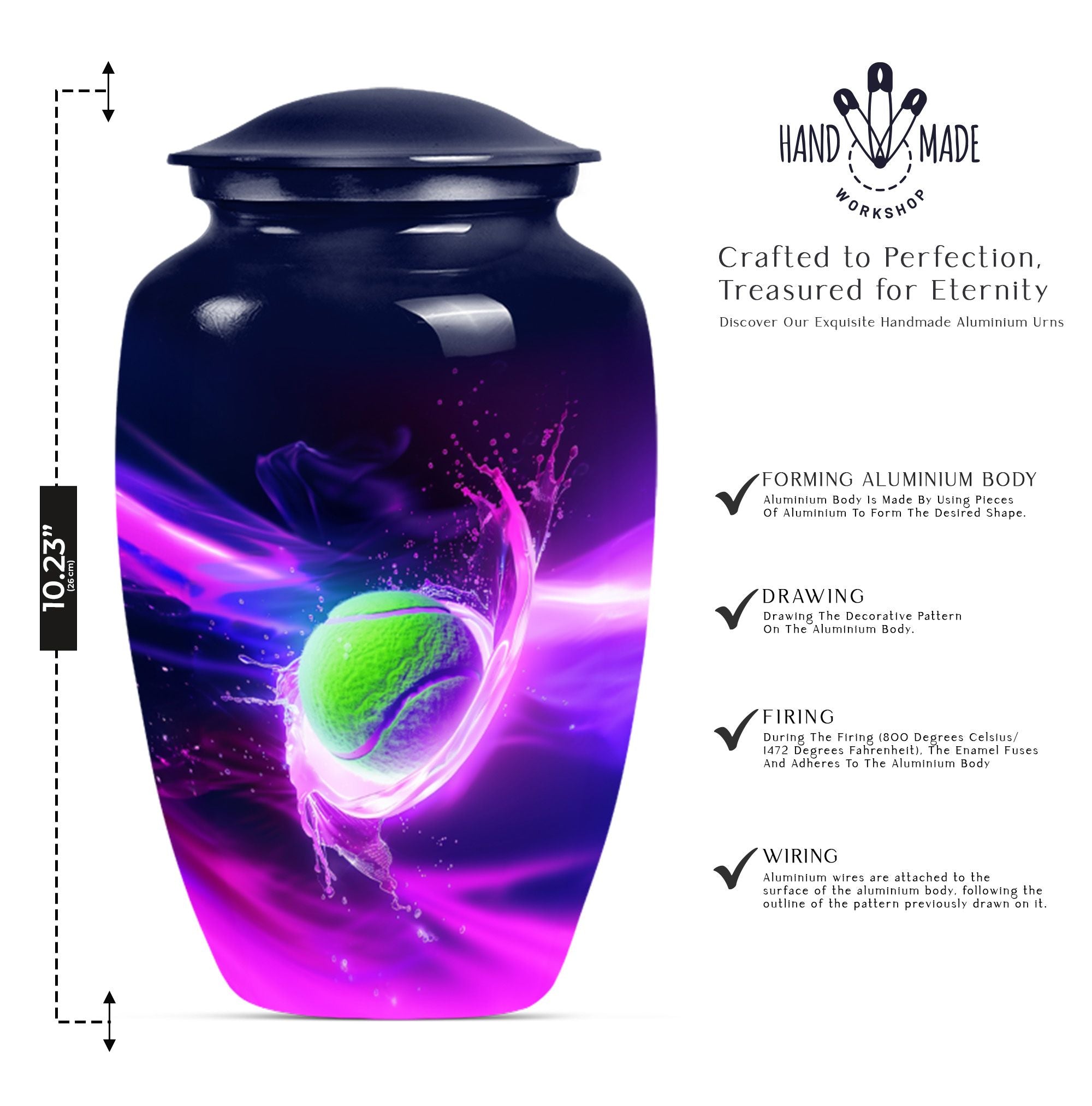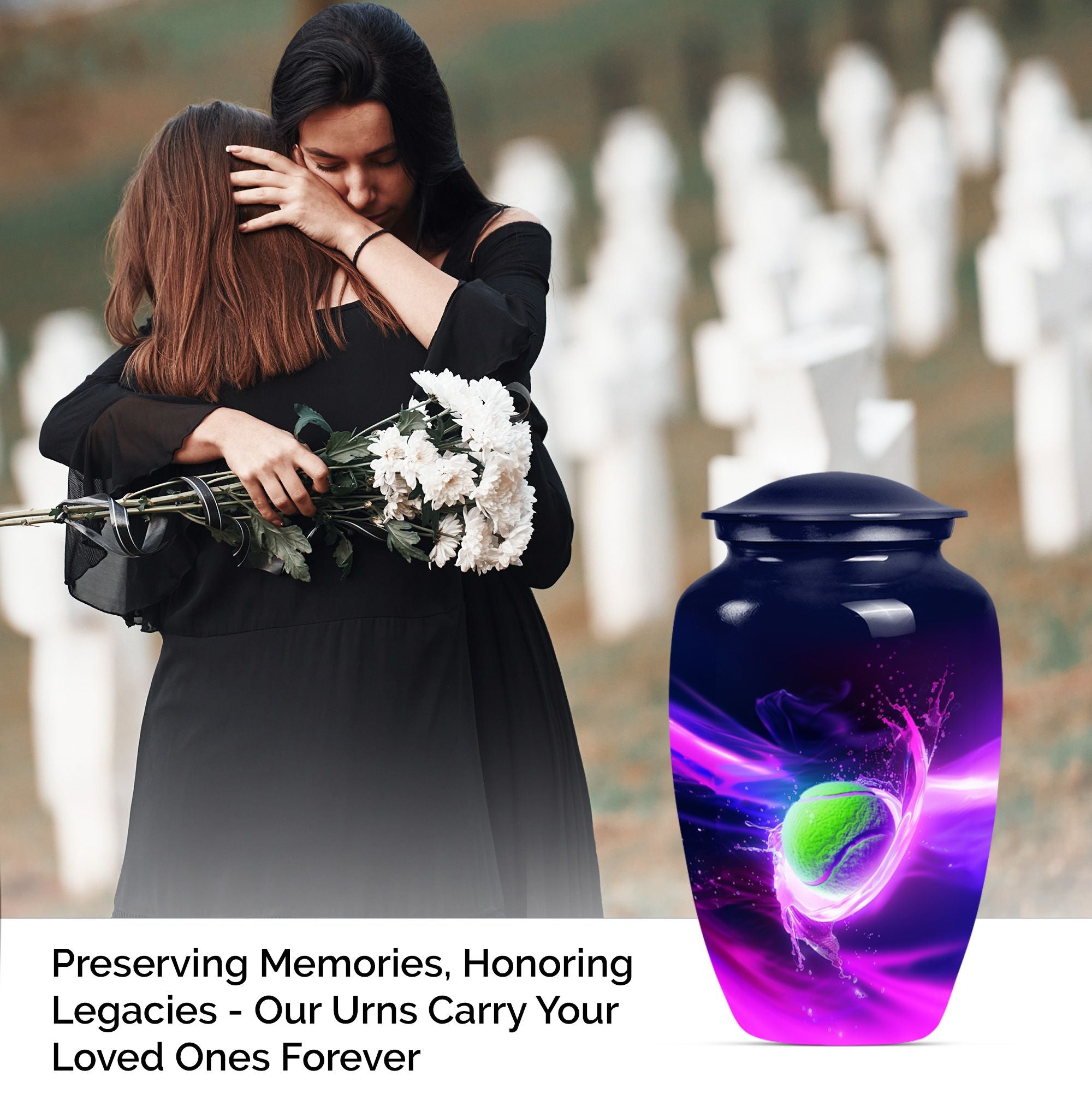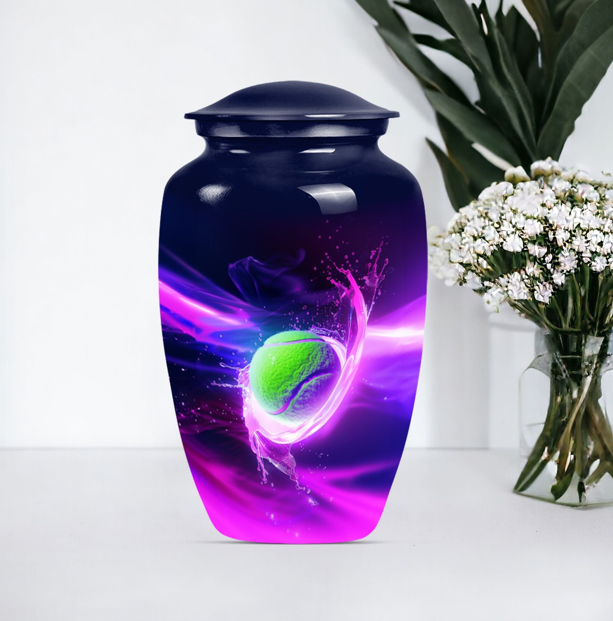 Our Purple Meadow, Large Tennis Urn brings a unique layer of respect to memorial ceremonies. This burial funeral urn for adult ashes has a dignified and sober theme that transcends time perfectly. Made from premium-grade Aluminium, it is durable and meticulously crafted to hold up to 200 cubic inches of ashes comfortably. Standing tall at 10 inches height and weighing just 3.3 pounds, its impressive size makes it a fitting tribute memory of your loved ones. The package also comes with a velvet pouch for containment of ashes, presenting the warming touch of tenderness to the proceedings. You can also make it that much personal with our offer to personalize each urn with engraved names. Embrace a tribute that speaks volumes of your love, choose our Purple Meadow, Classic Tennis Urn, for a memorable and fitting closure. Stand out keywords that are coherent with this product include 'Cremation large urn for ashes', 'ash adult ashes women', 'earn cremation', 'metal urns for burial in ground'.