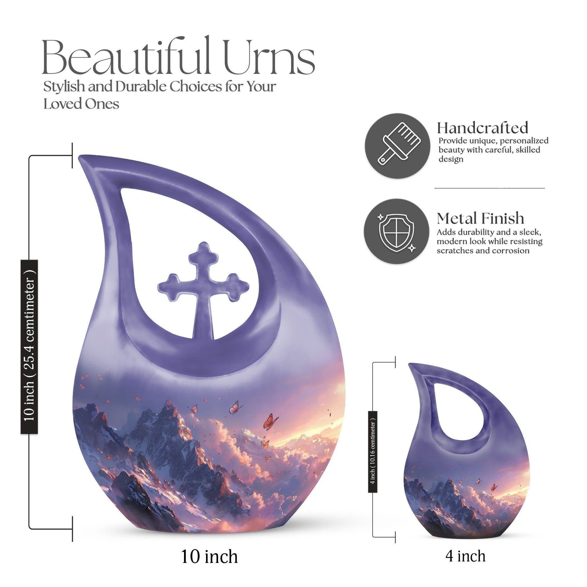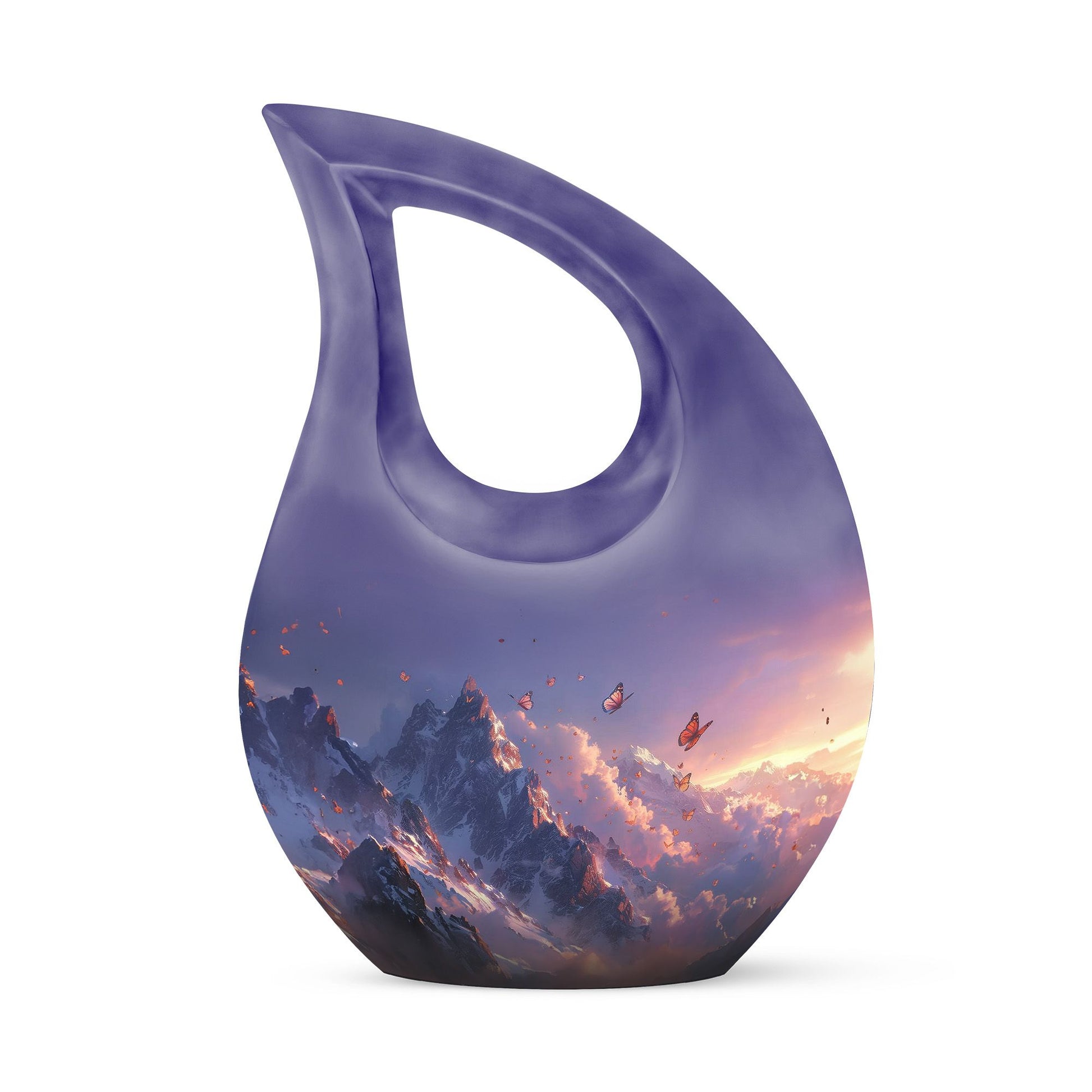 The Purple Urn with Mountain Motif – Butterfly Small Cremation Ashes Urn offers a heartfelt tribute to a life filled with strength, grace, and serenity. Inspired by the beauty of nature and the symbolism of transformation, this cremation urn for adults captures both peace and resilience in its design. Ideal as a cremation urn mom or for any loved one, it provides a dignified way to preserve precious memories.
